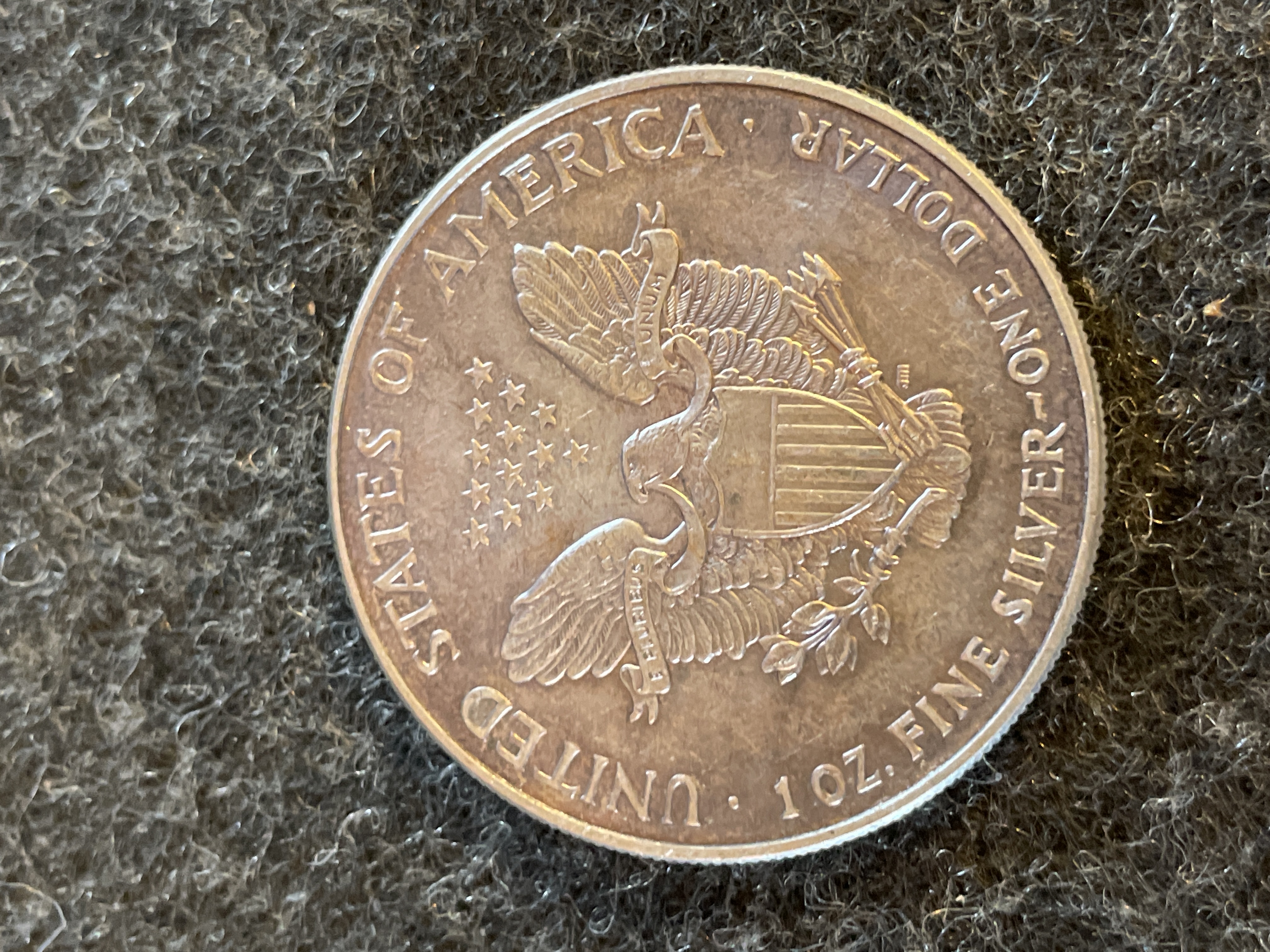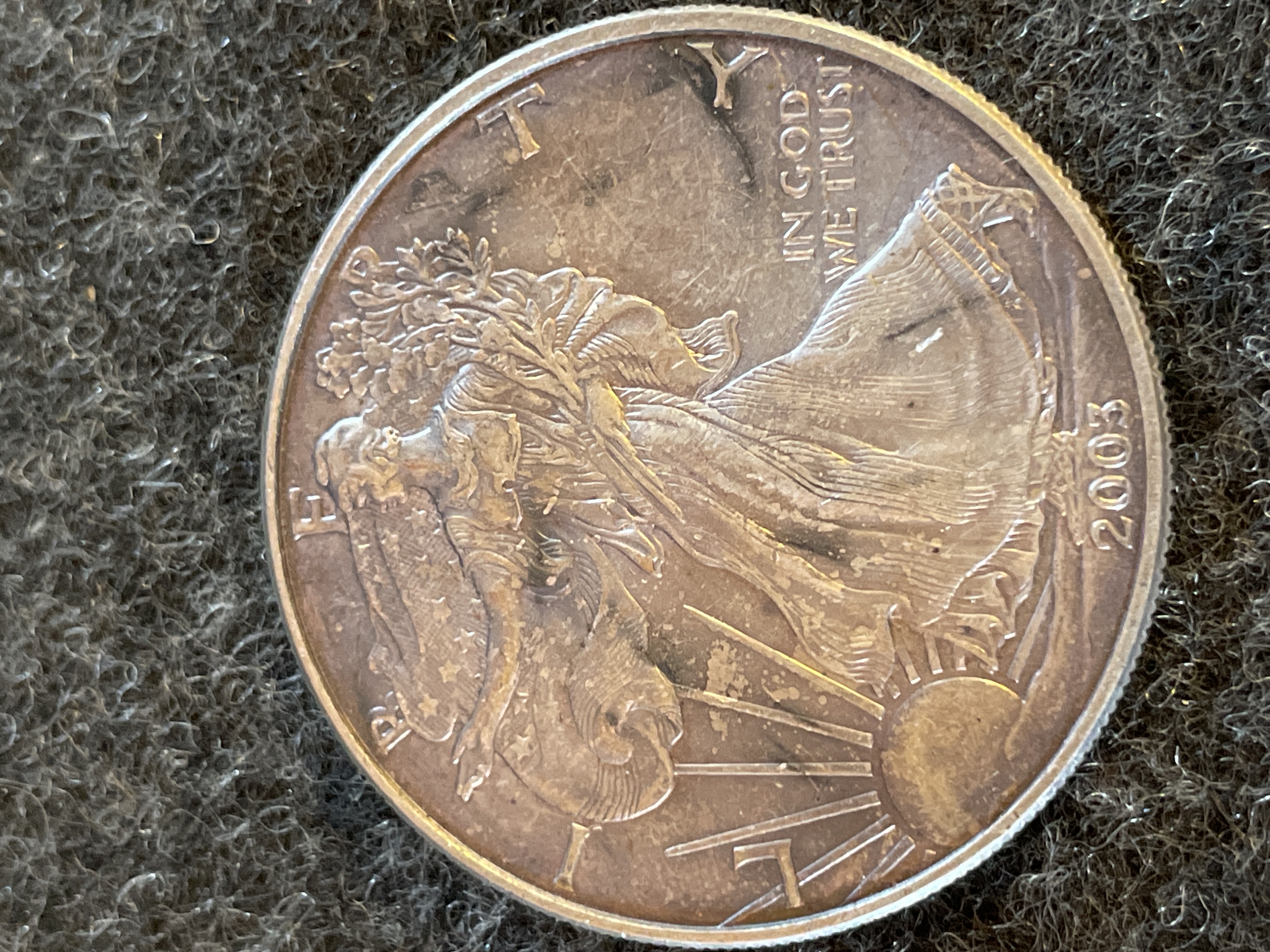 A 2003 American Silver Eagle bullion coin containing 1 oz of fine silver featuring the Walking Liberty design and heraldic eagle.