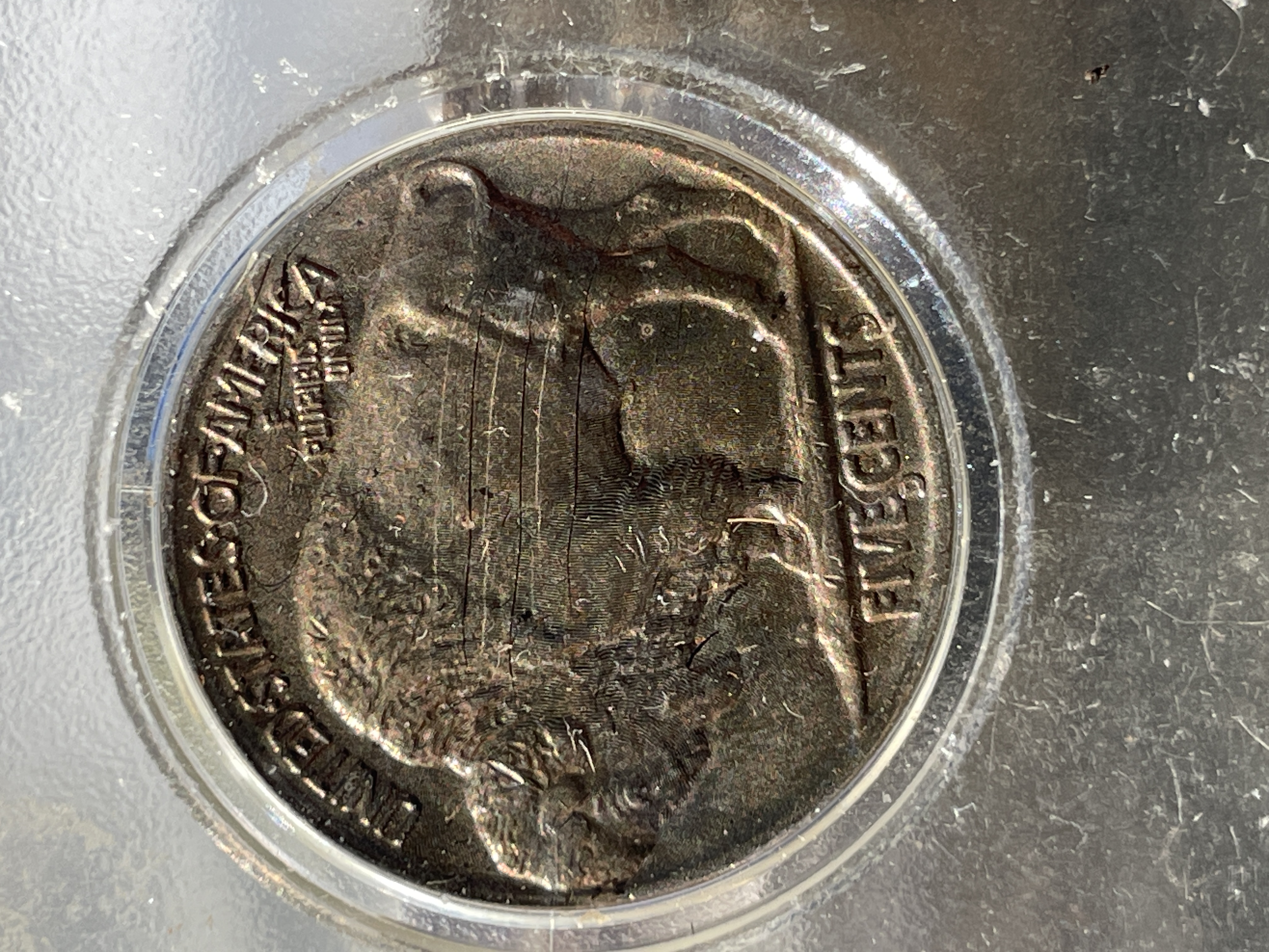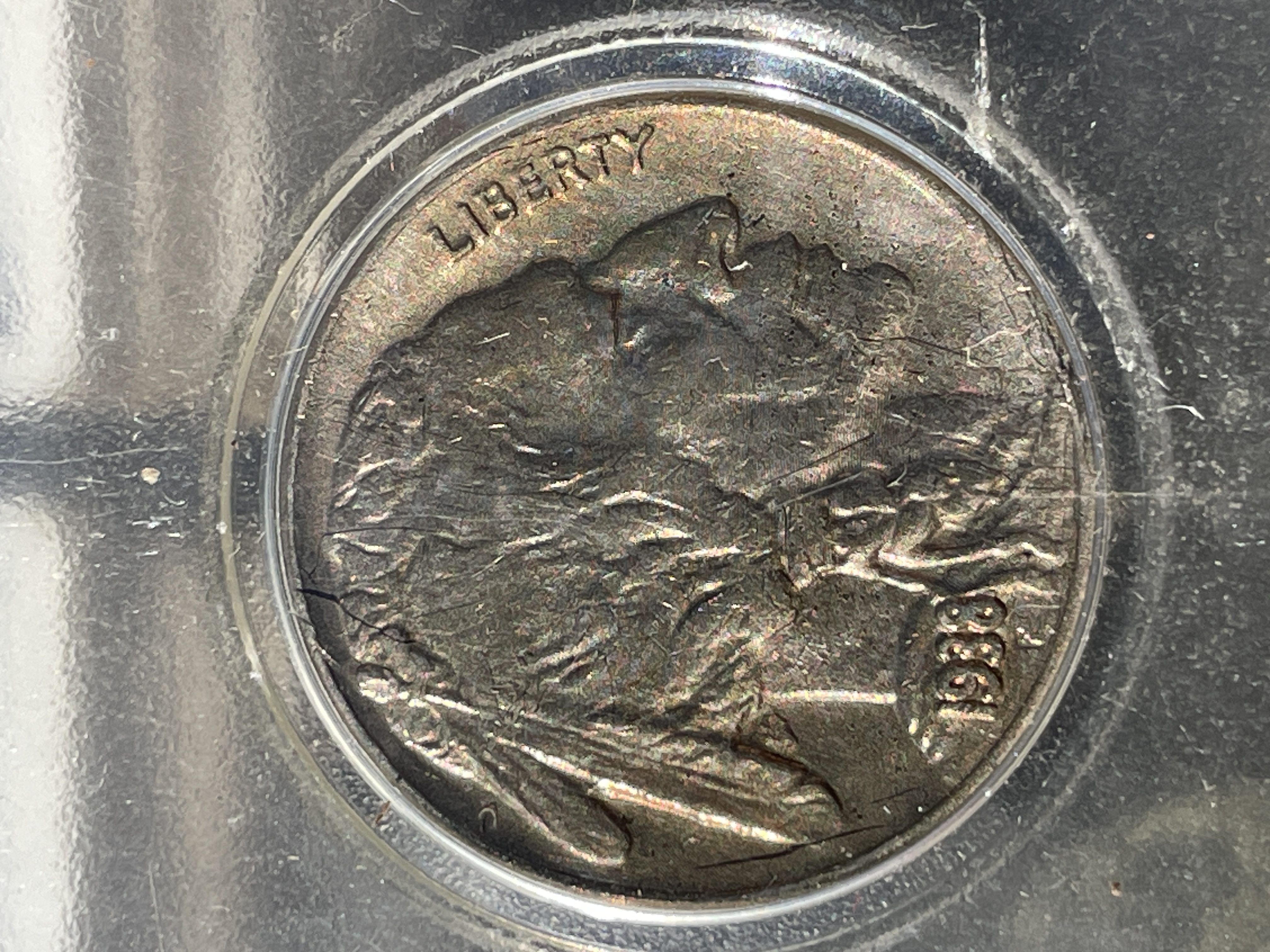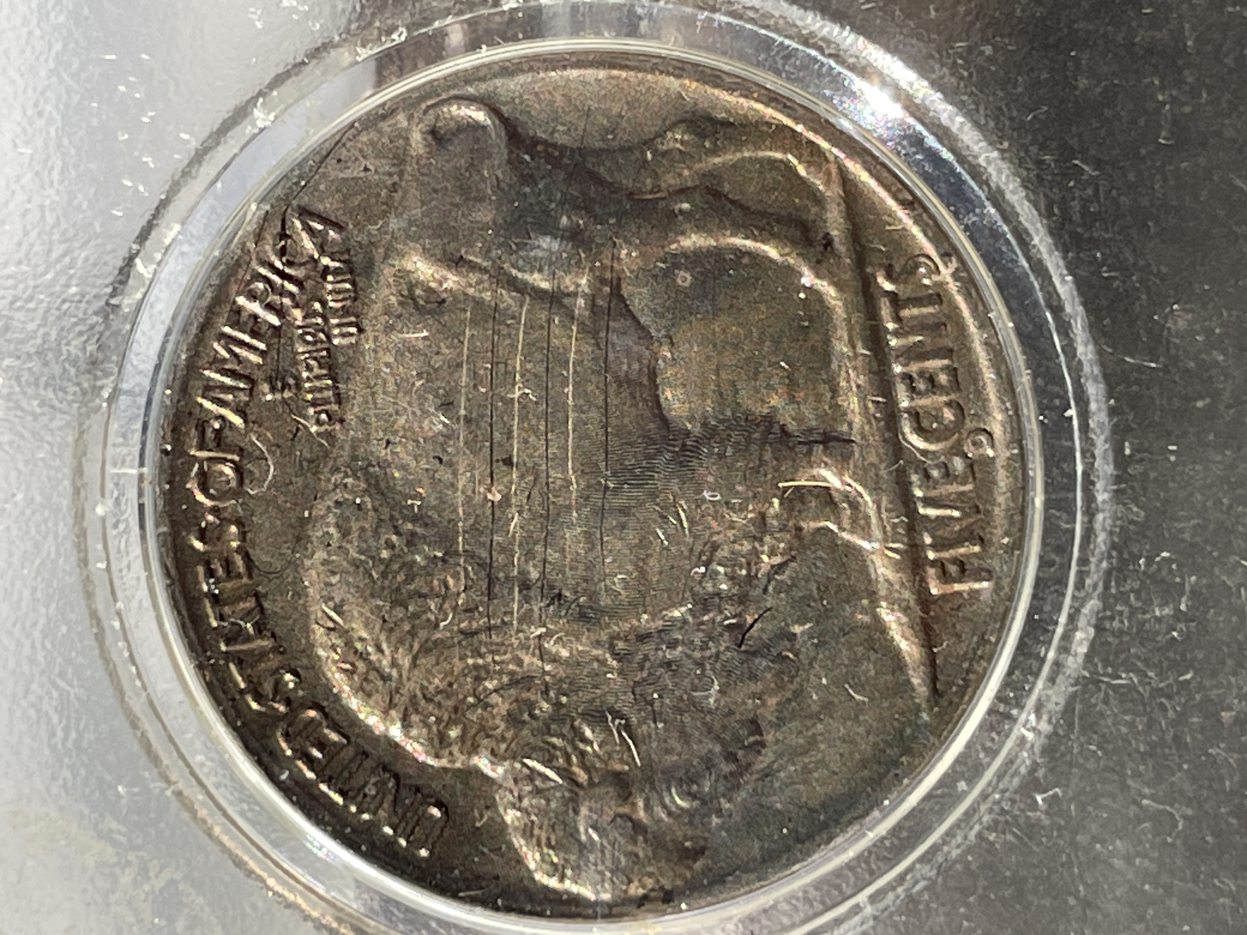 A silver-toned 1936 Buffalo nickel featuring iridescent hues and standard inscriptions on the obverse and reverse.