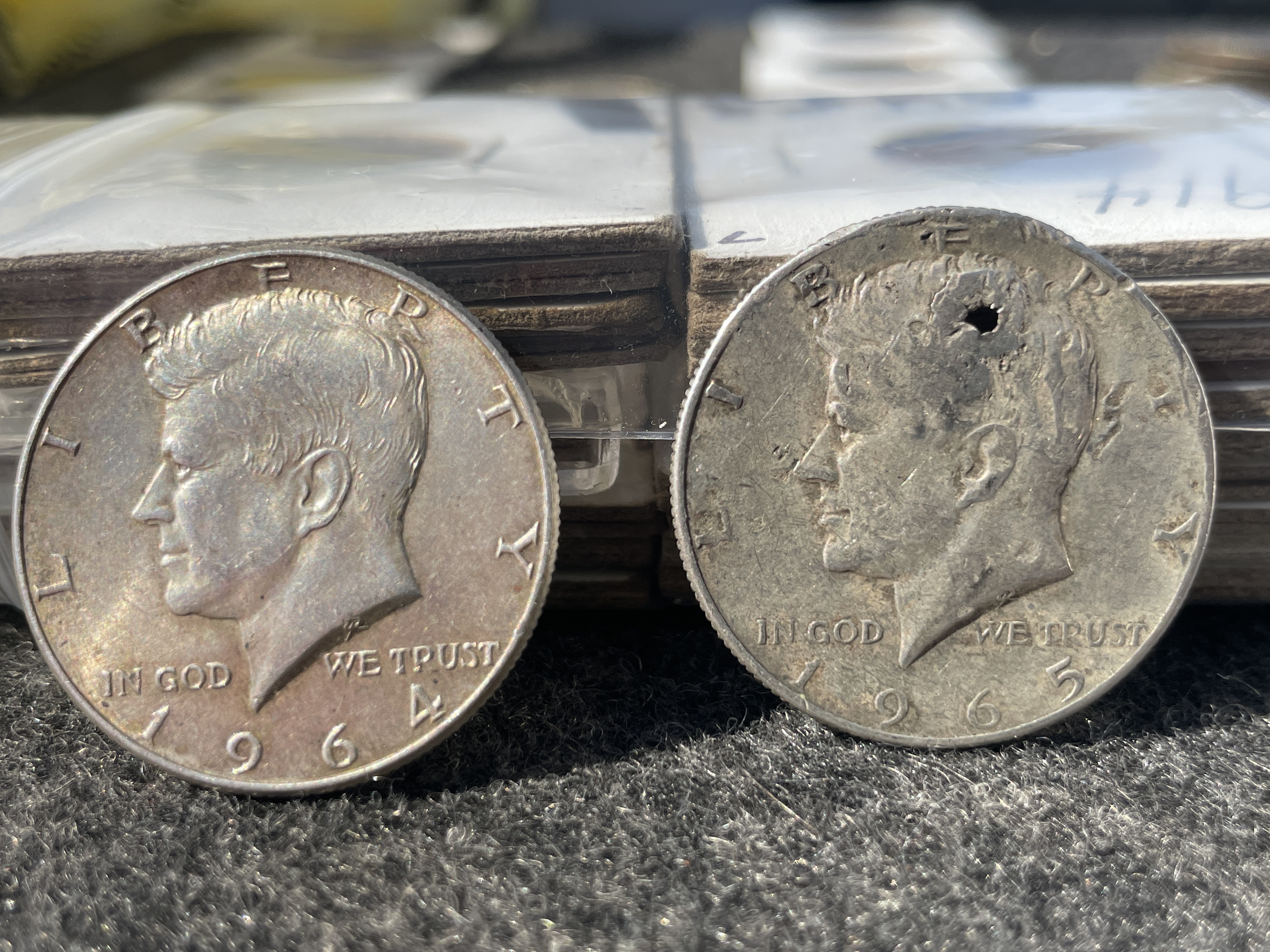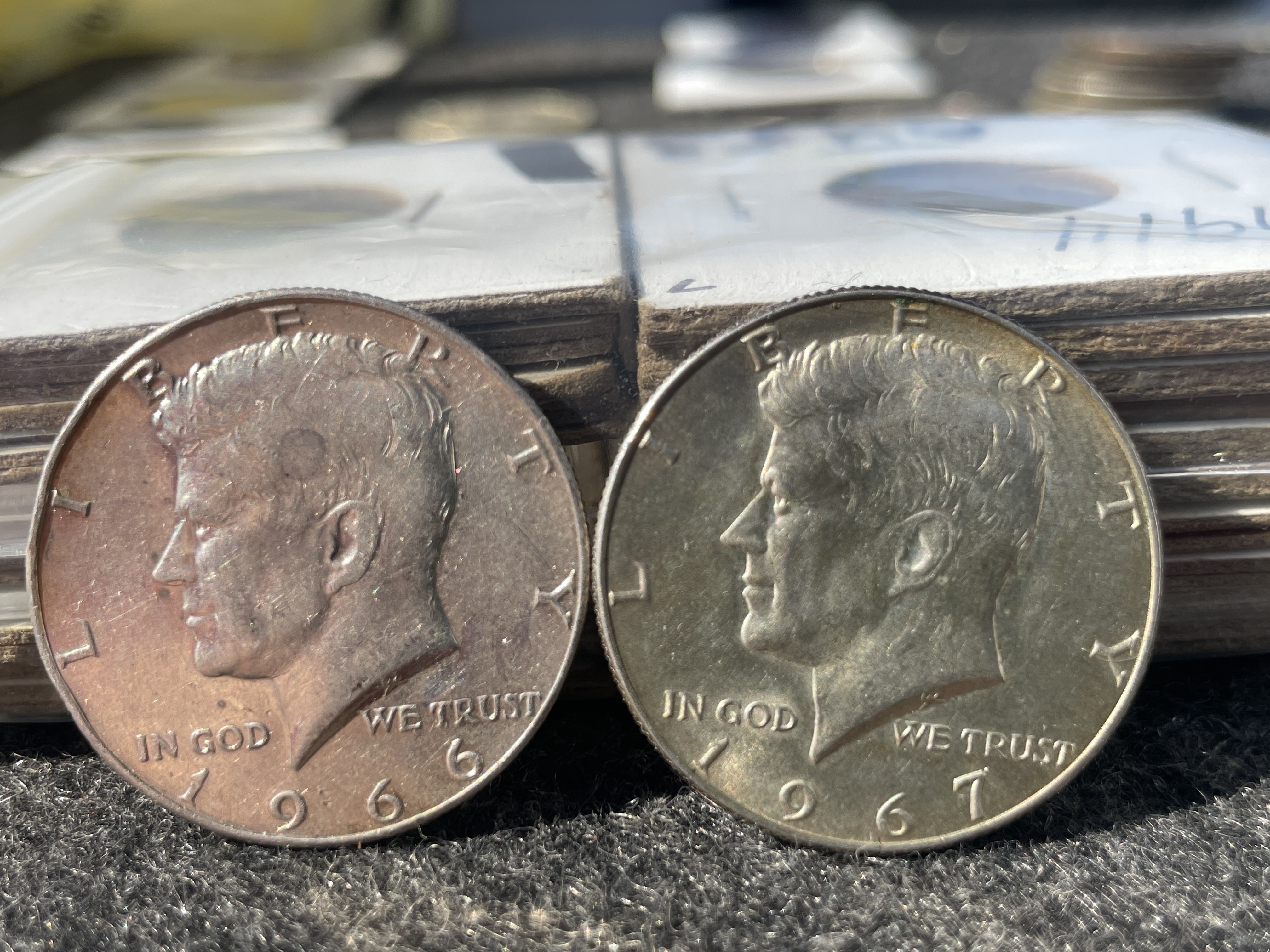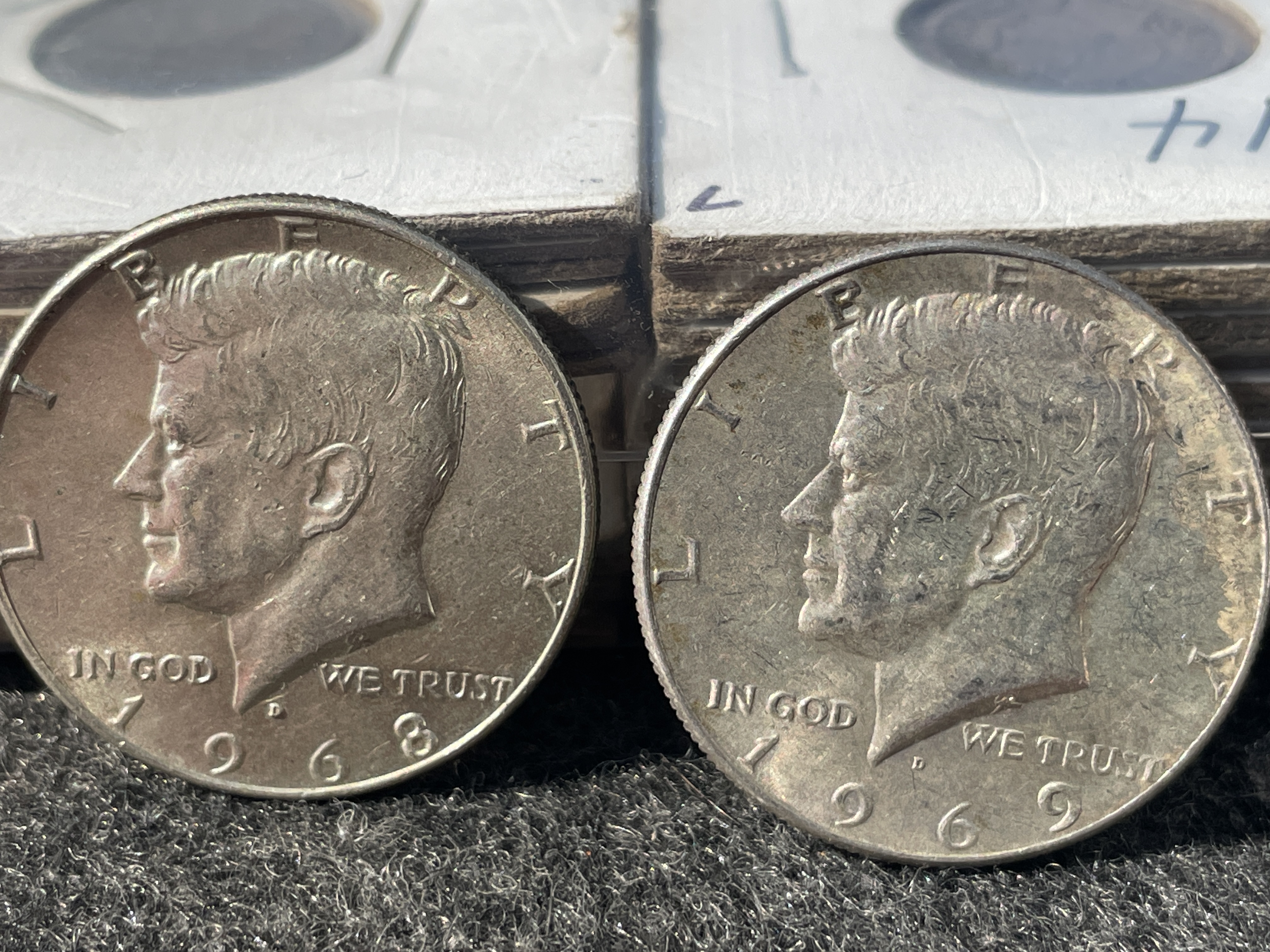 A collection of silver and silver-clad United States Kennedy Half Dollar coins dated from 1964 to 1969.