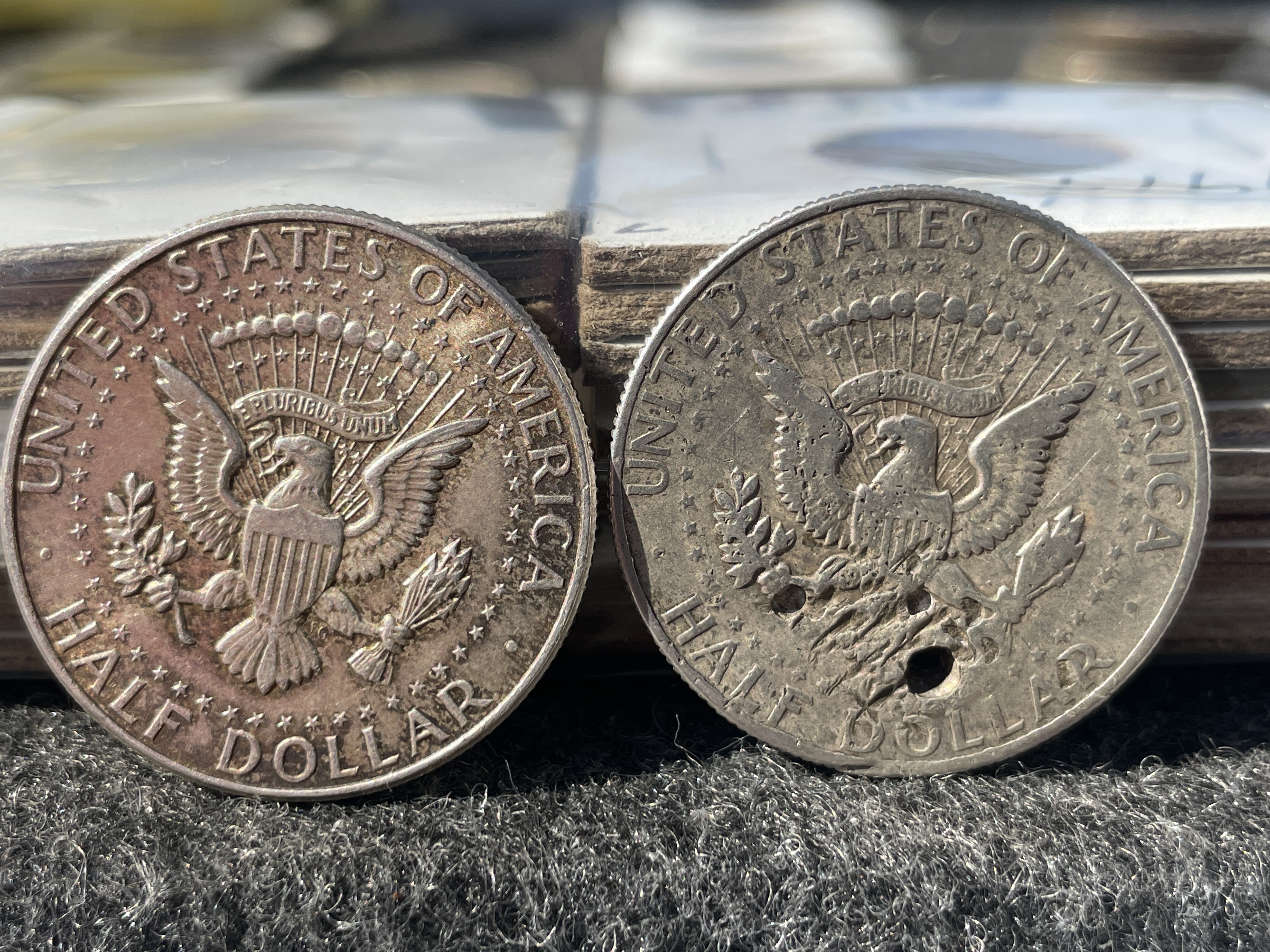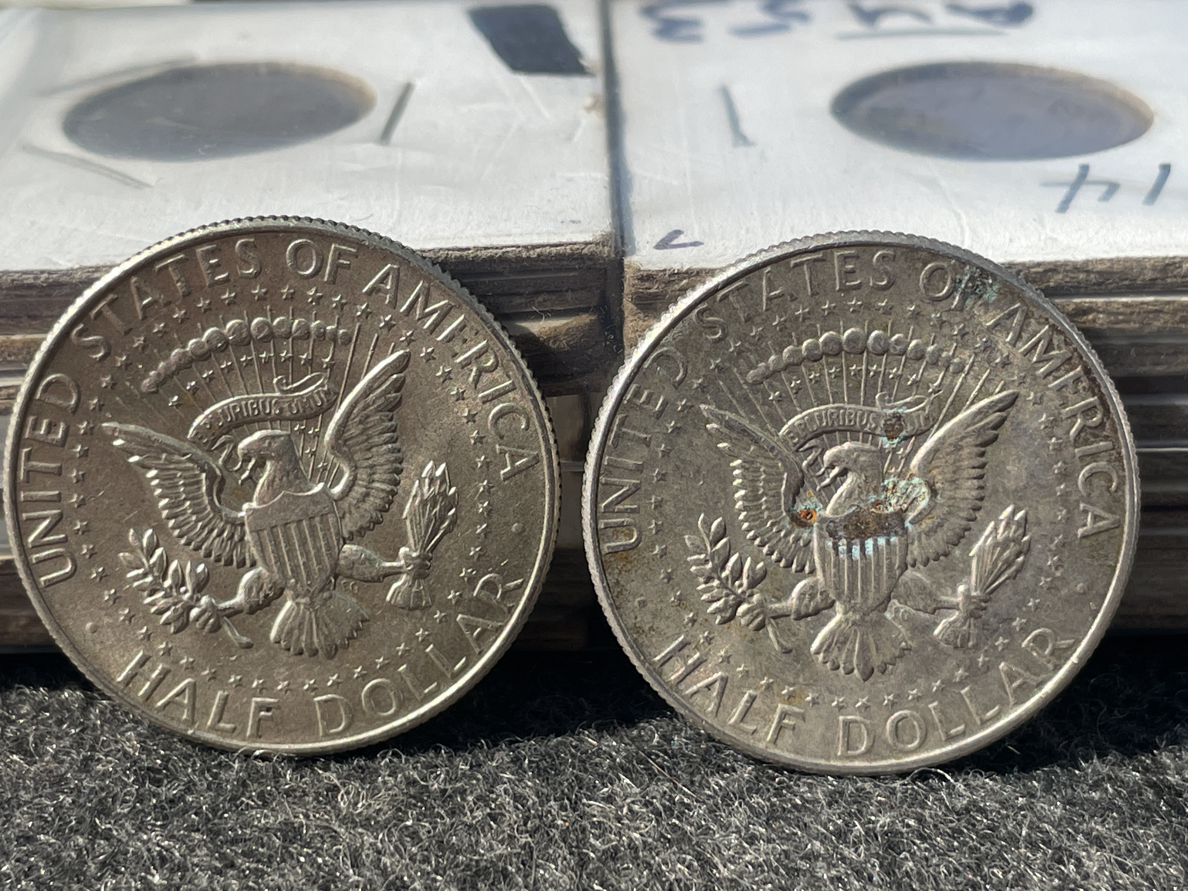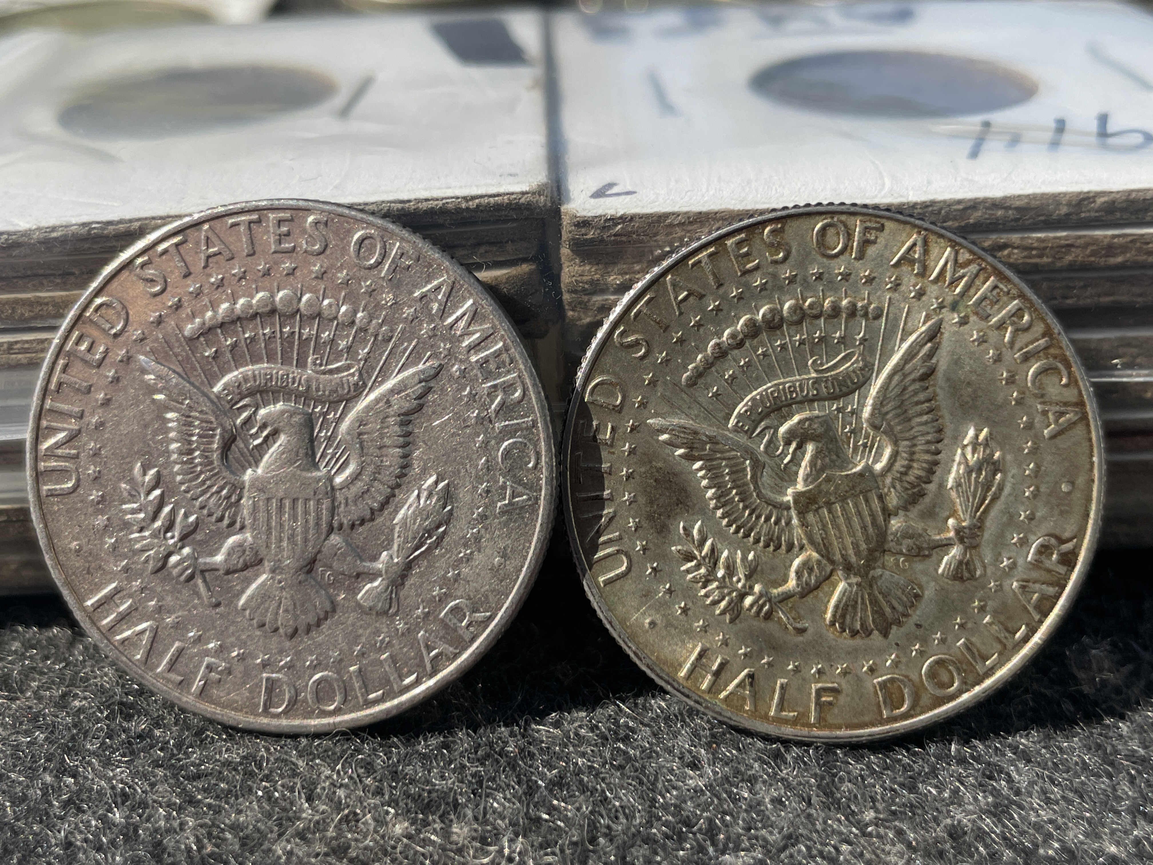 A collection of silver and silver-clad United States Kennedy Half Dollar coins dated from 1964 to 1969.
