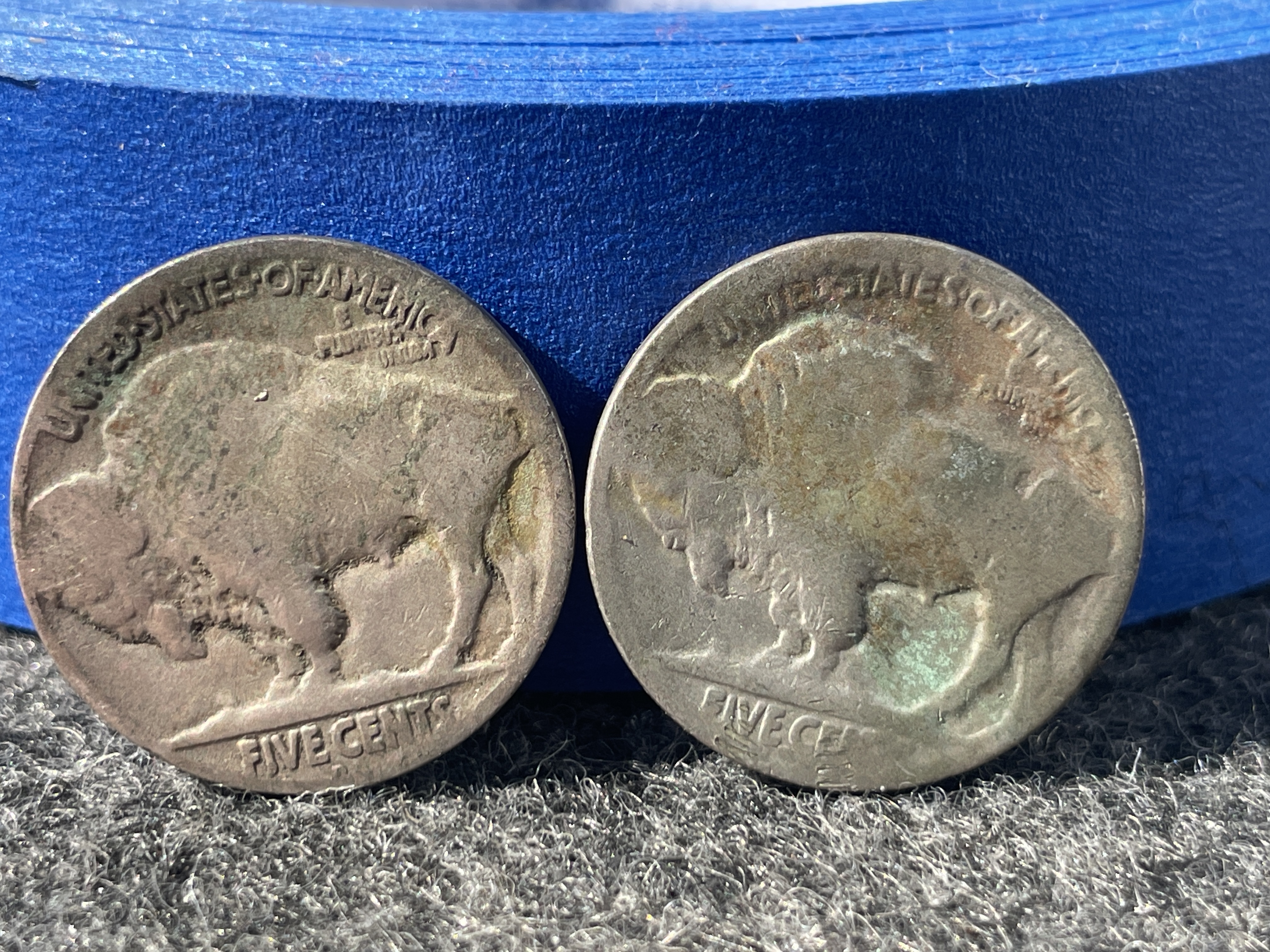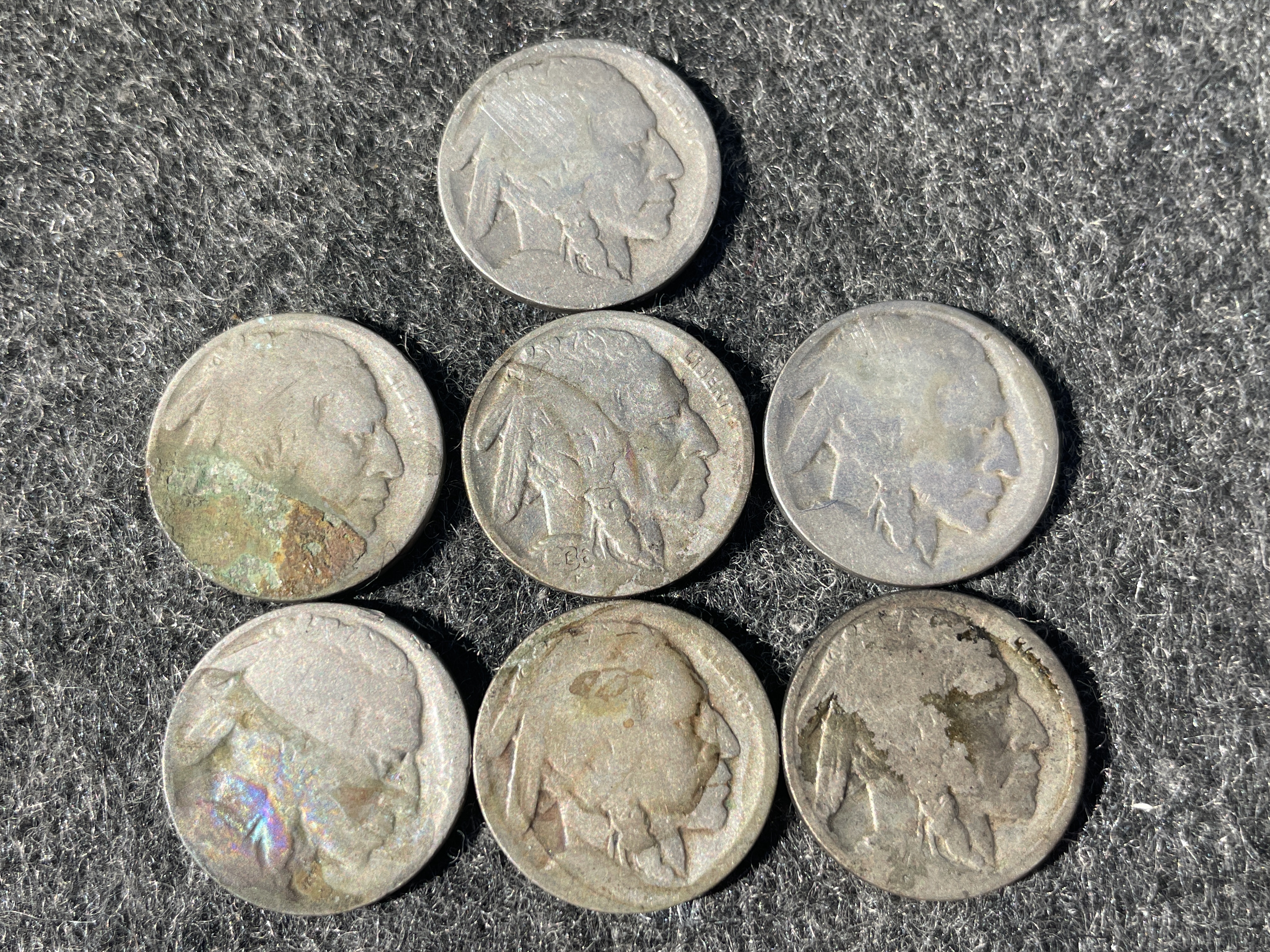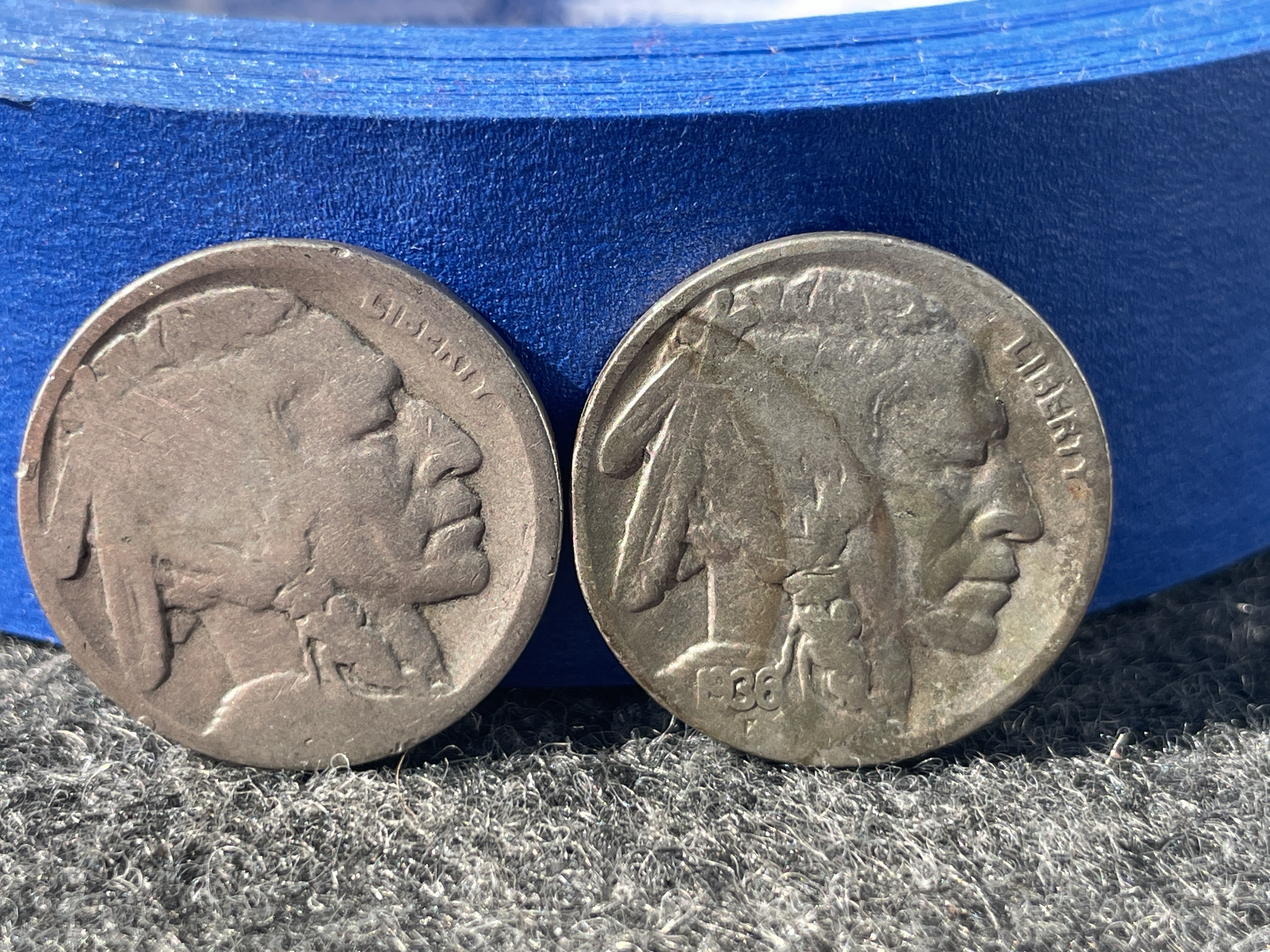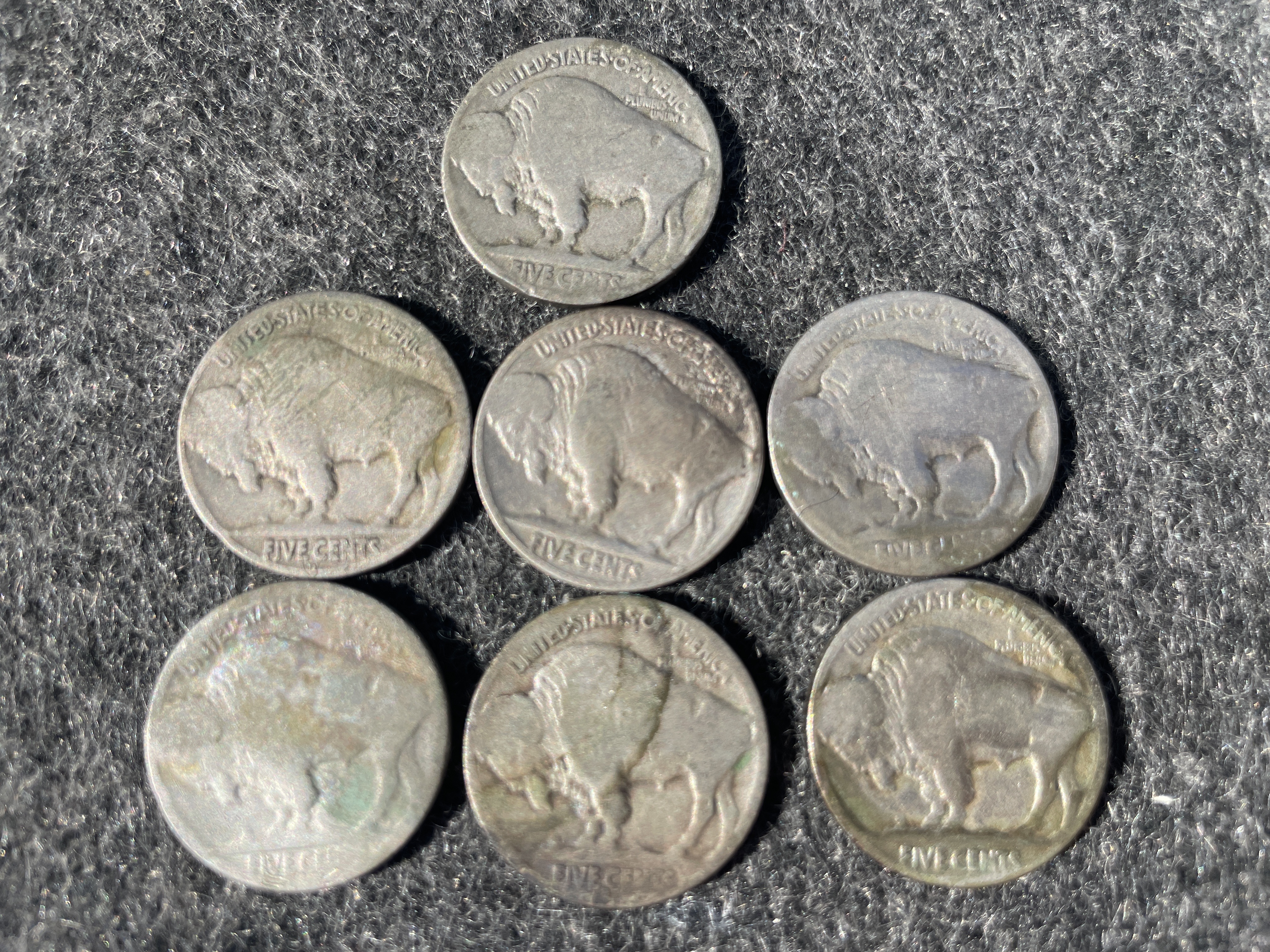 A collection of circulated silver-colored Buffalo nickels featuring various dates including 1936 and showing significant wear and patina.