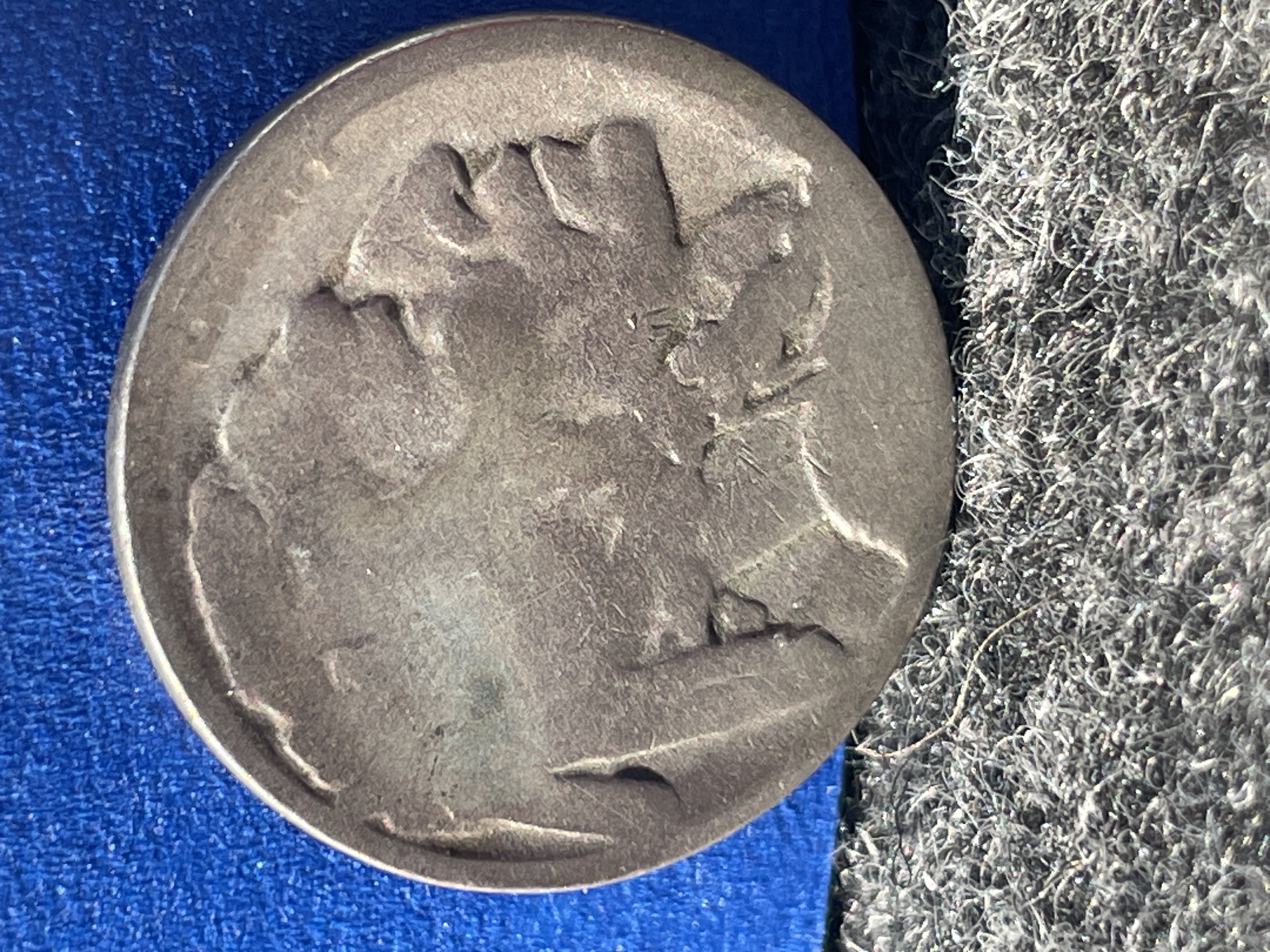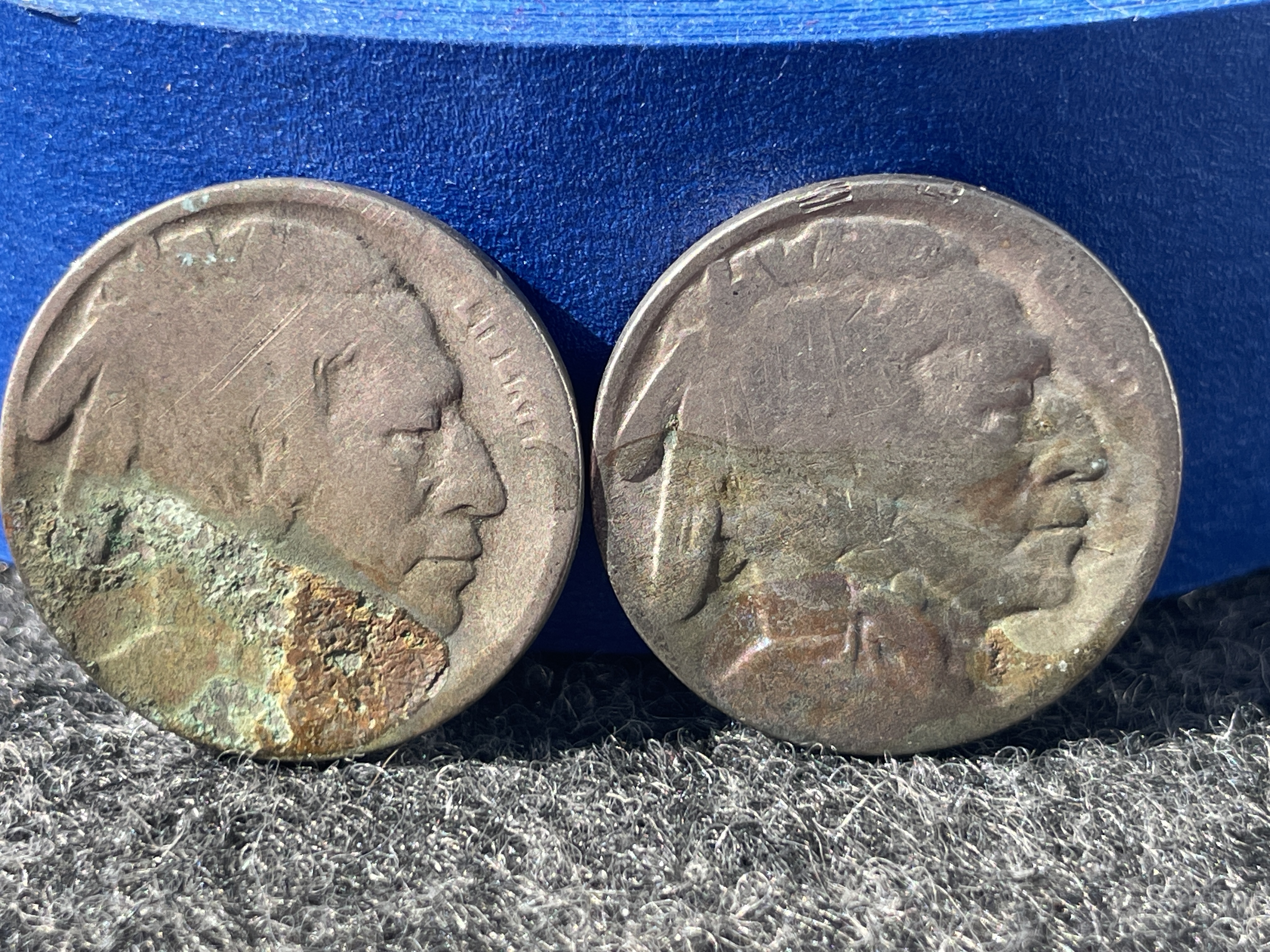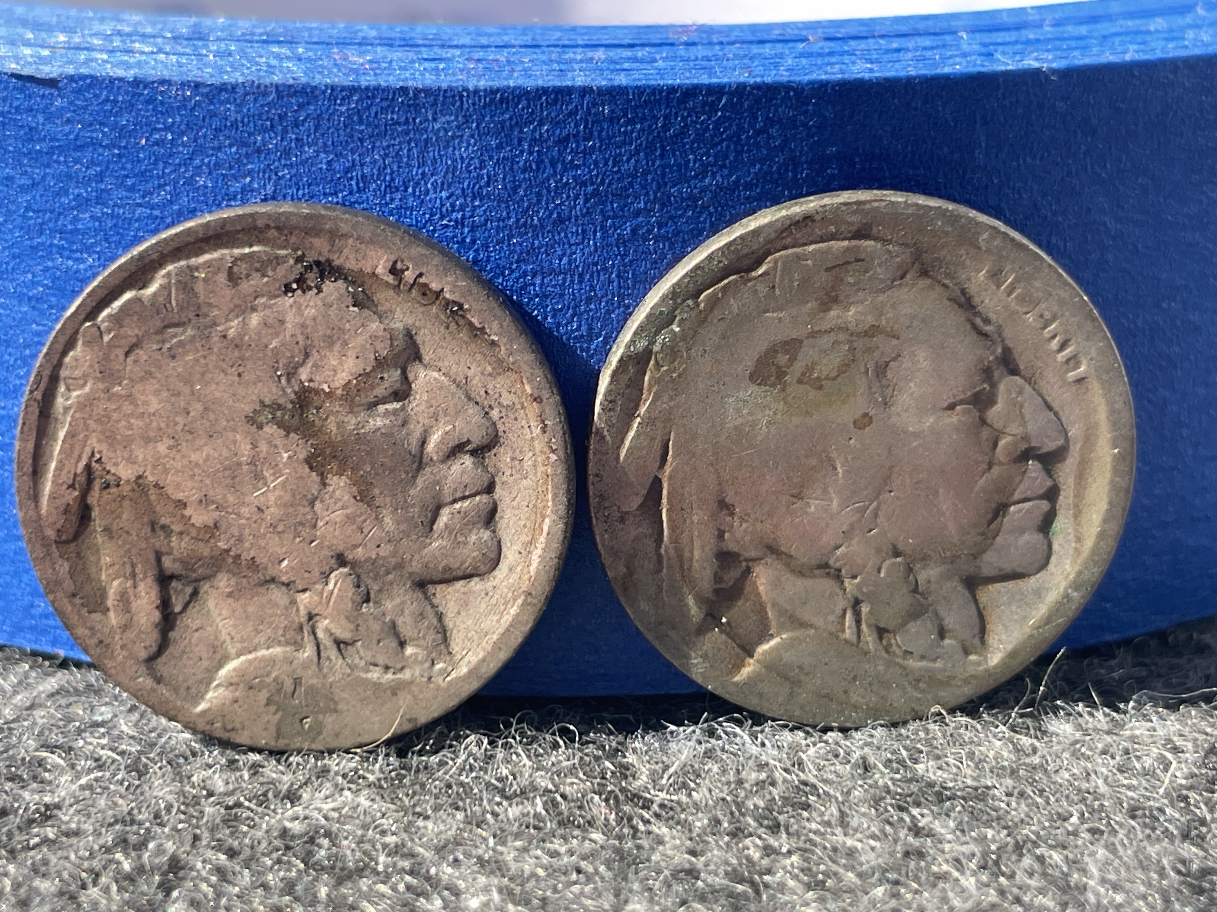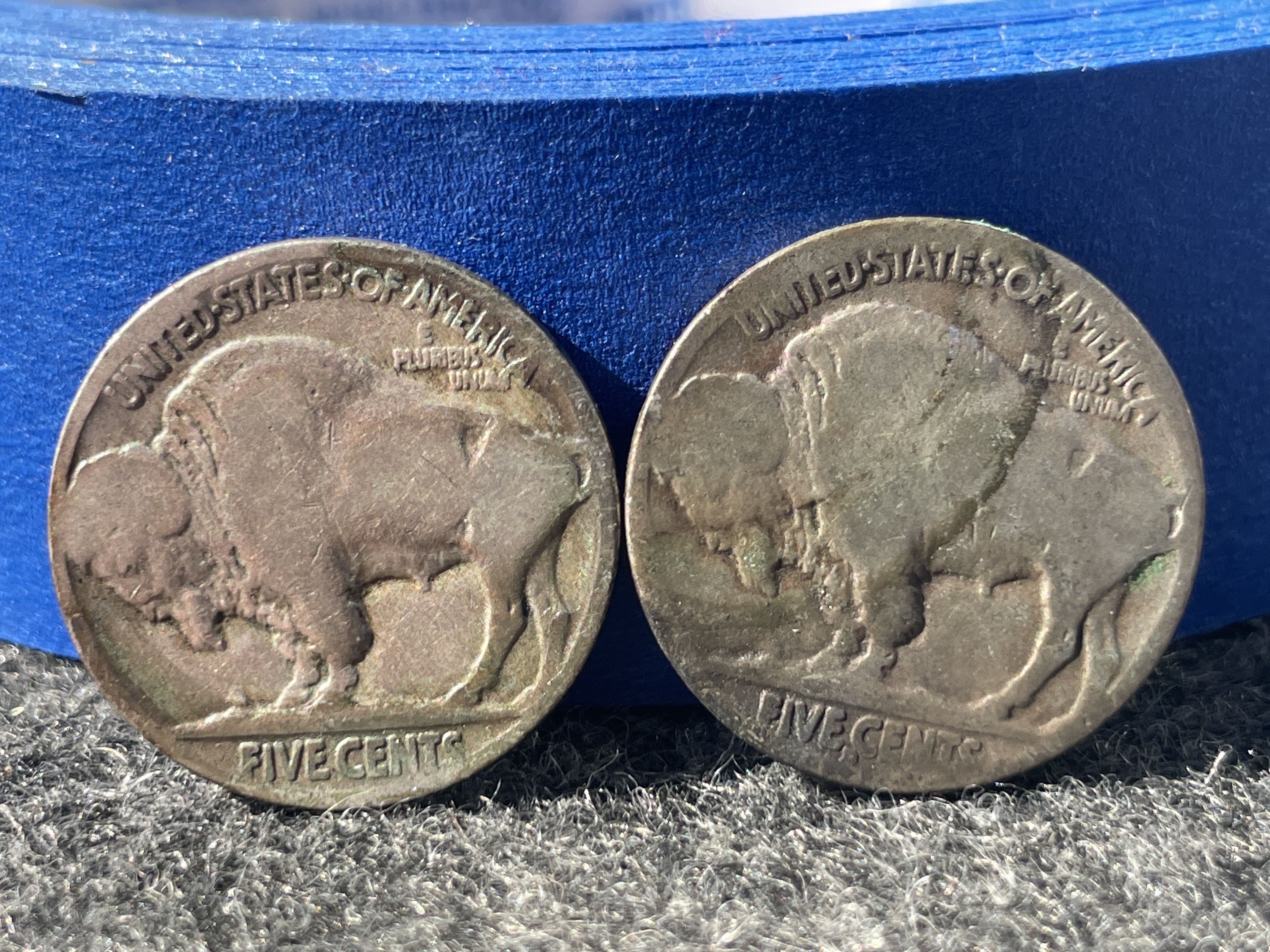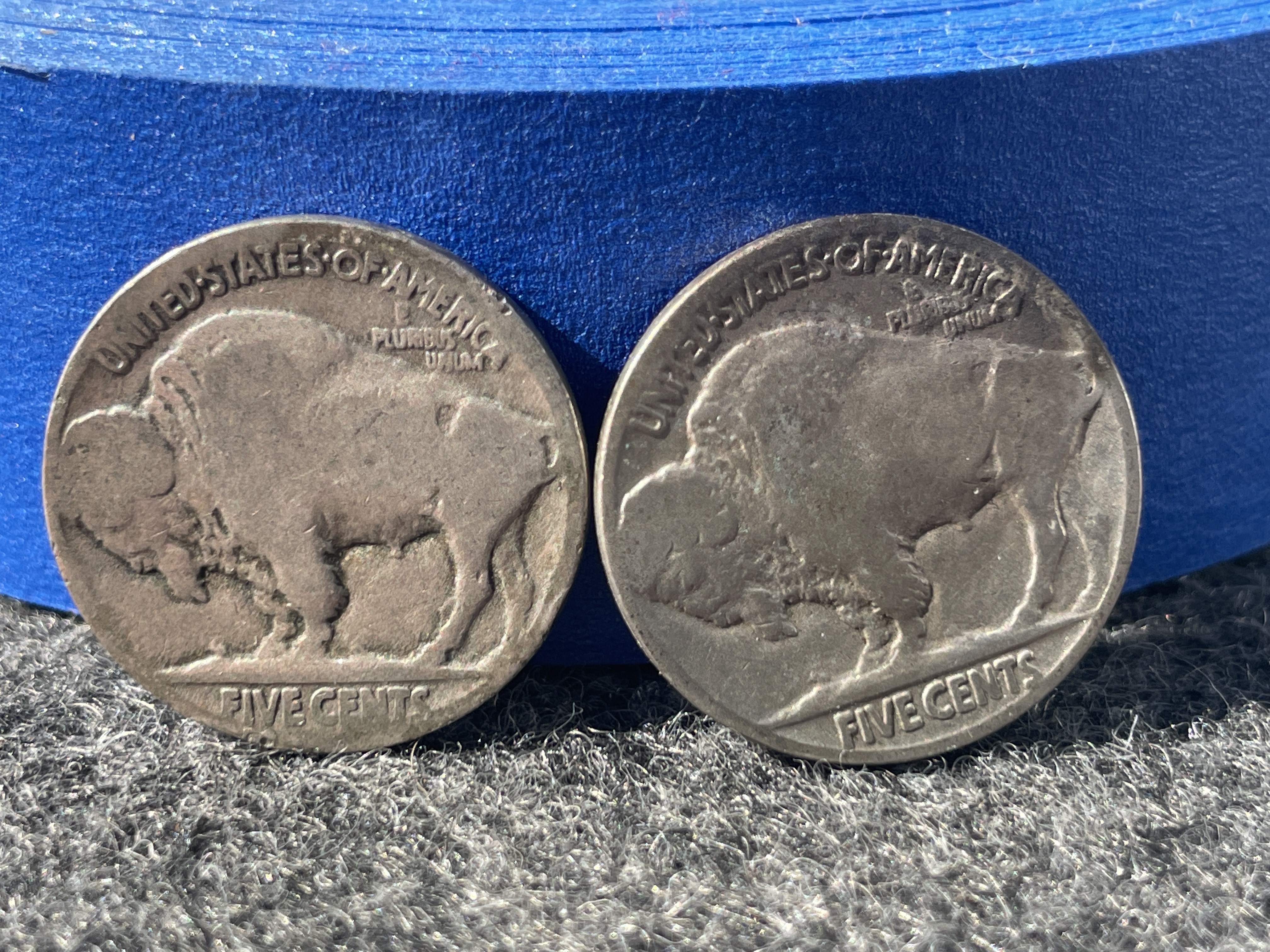 A collection of circulated silver-colored Buffalo nickels featuring various dates including 1936 and showing significant wear and patina.