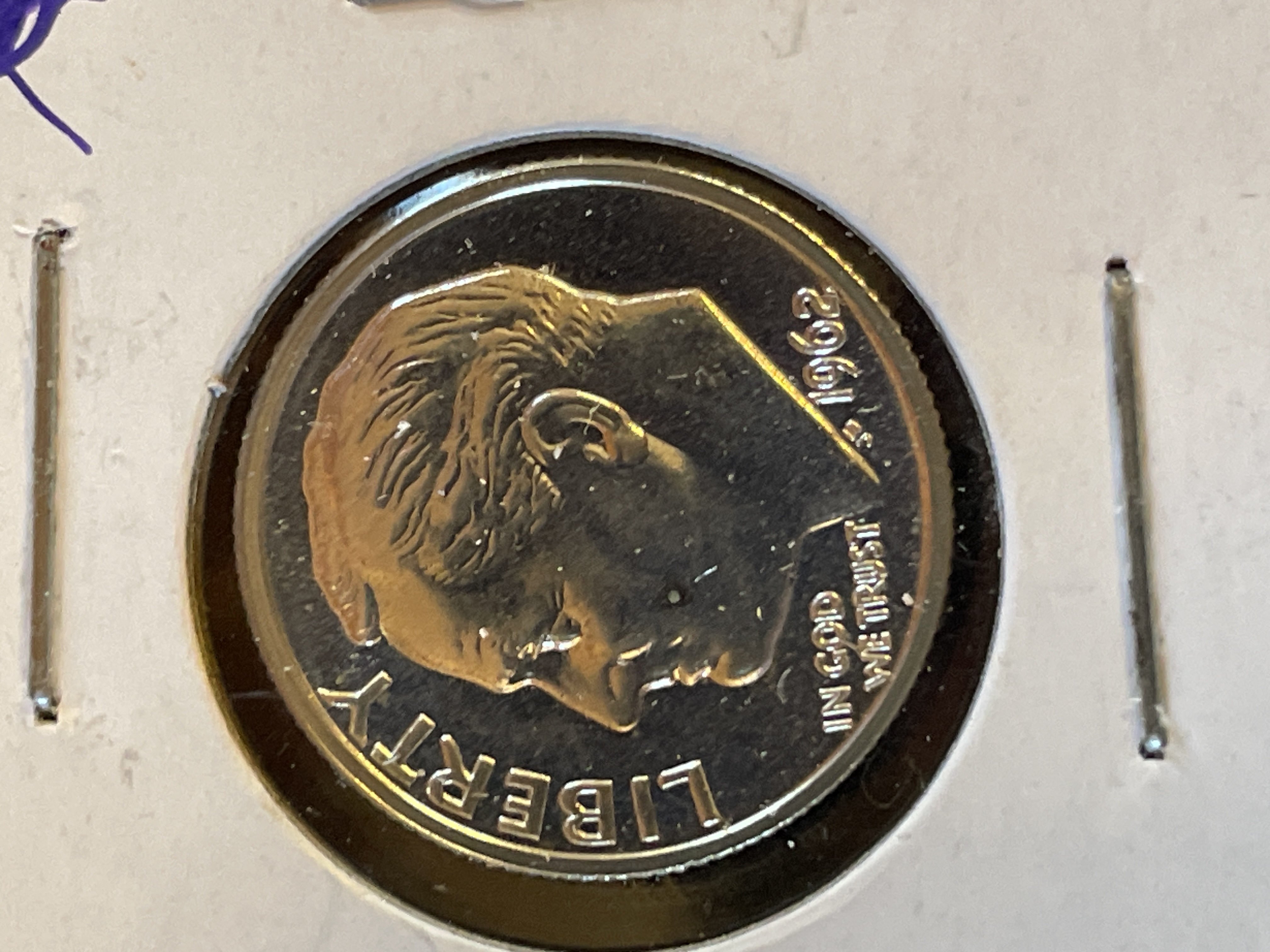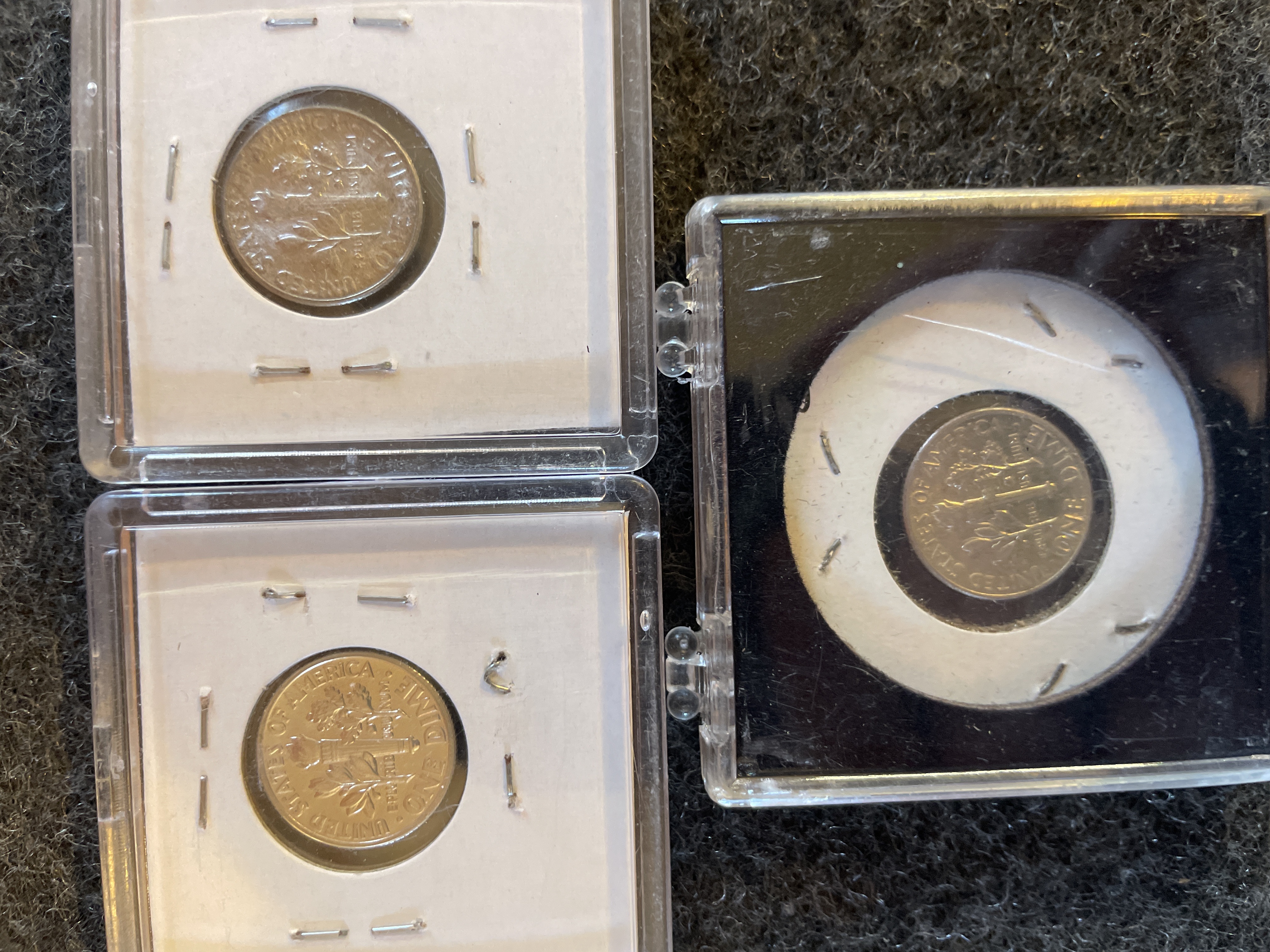 A trio of silver Roosevelt dimes including a 1947 issue, a 1962 issue, and a 1958 (P) uncirculated issue, each housed in a protective case with handwritten labels.