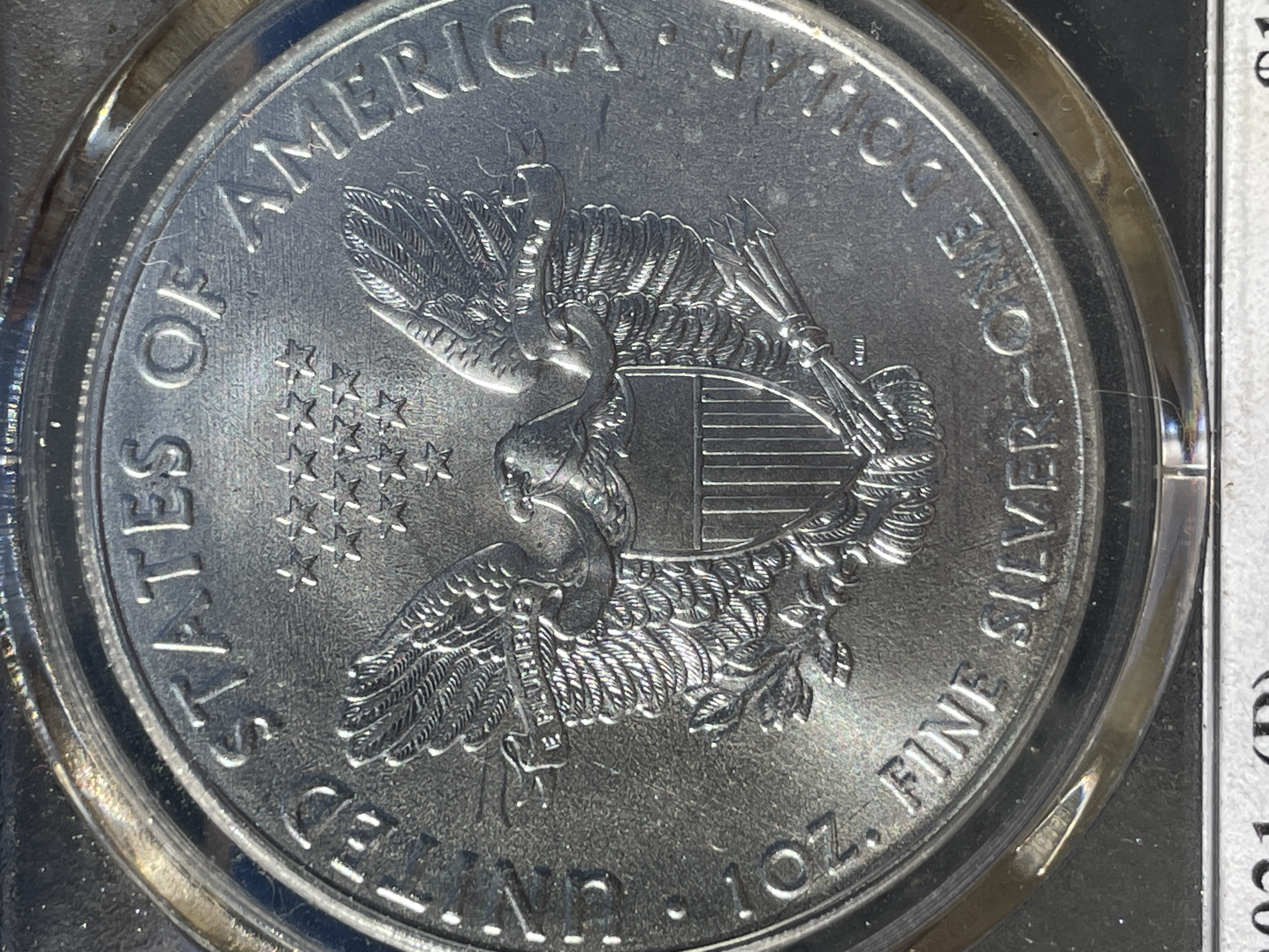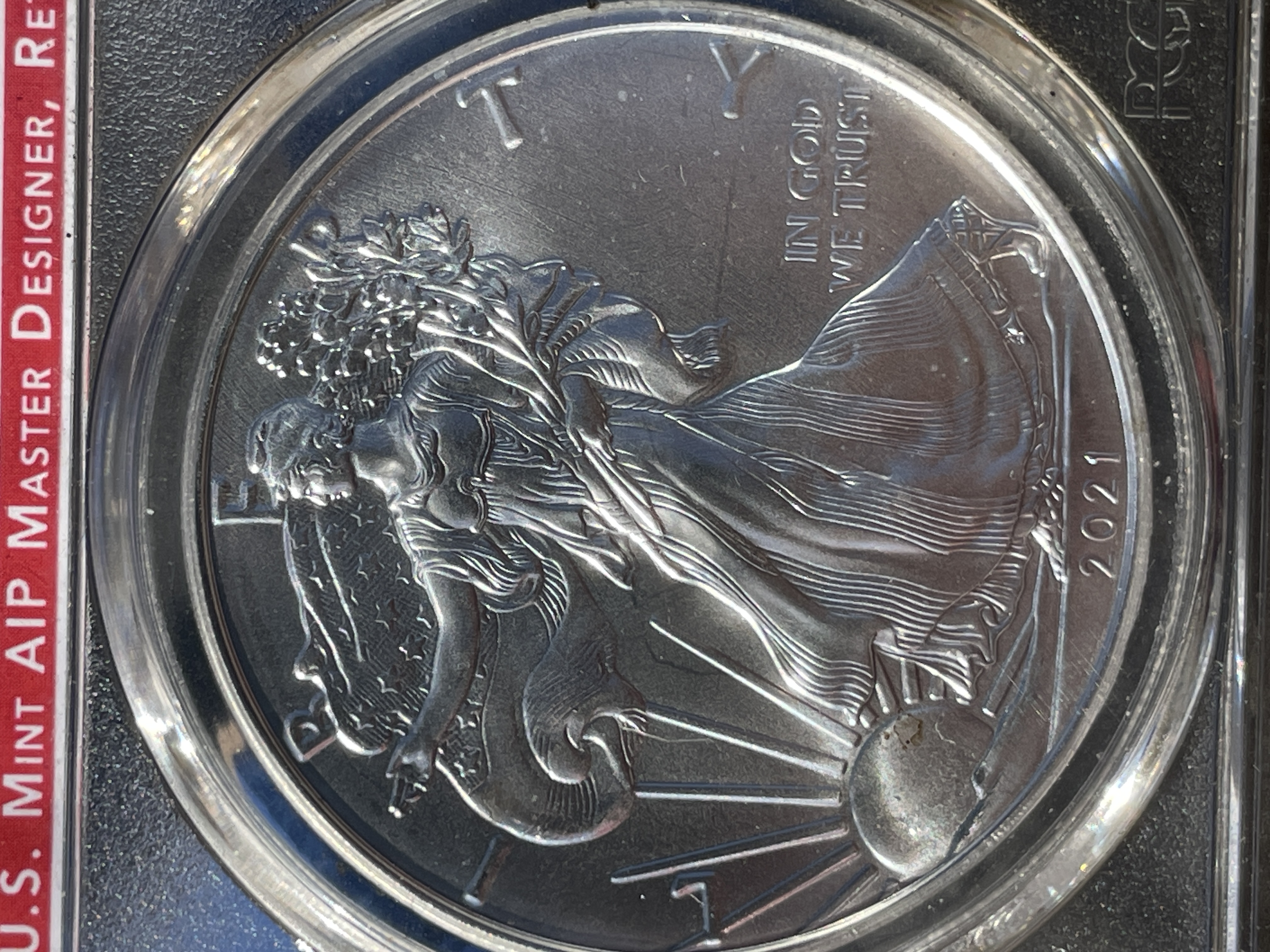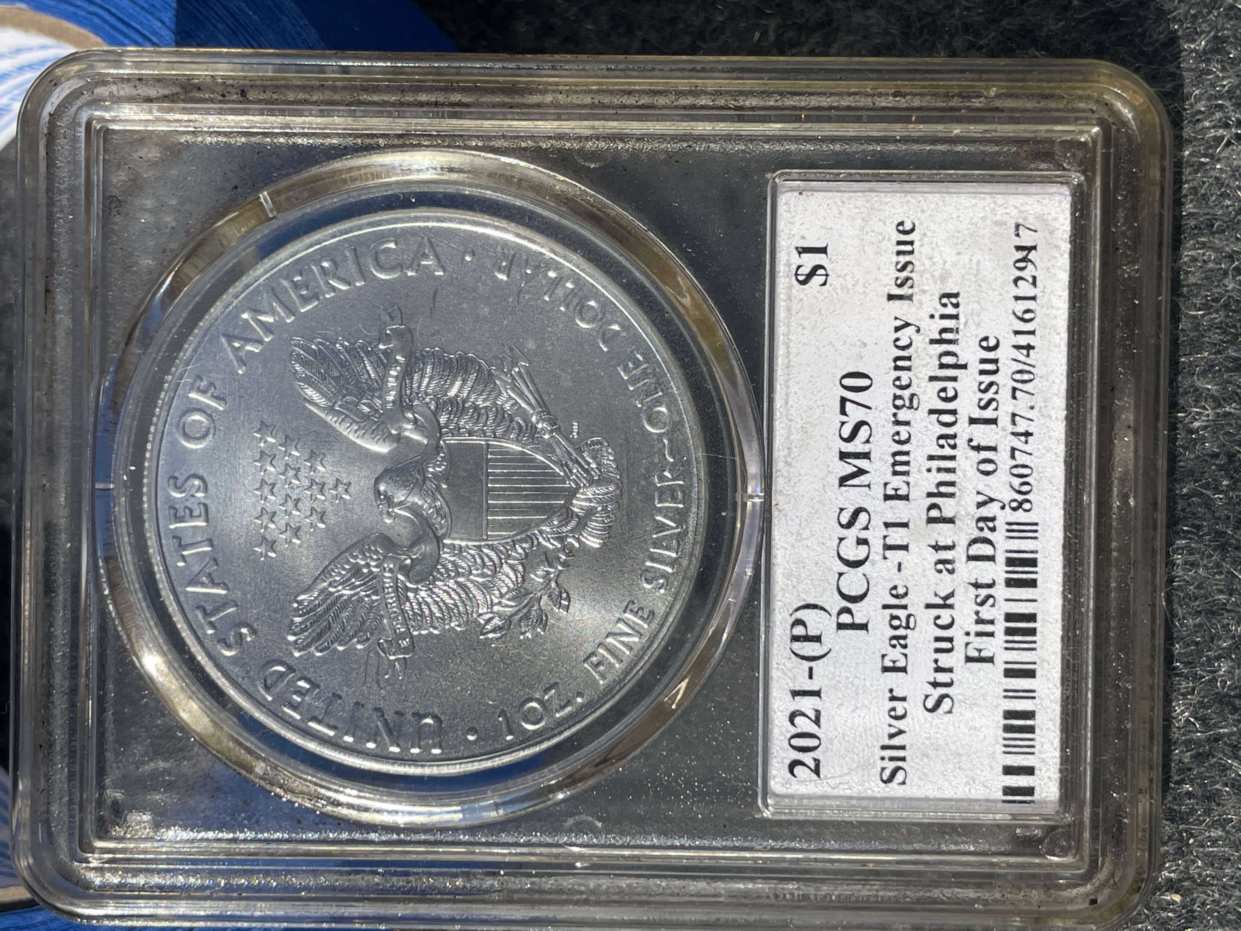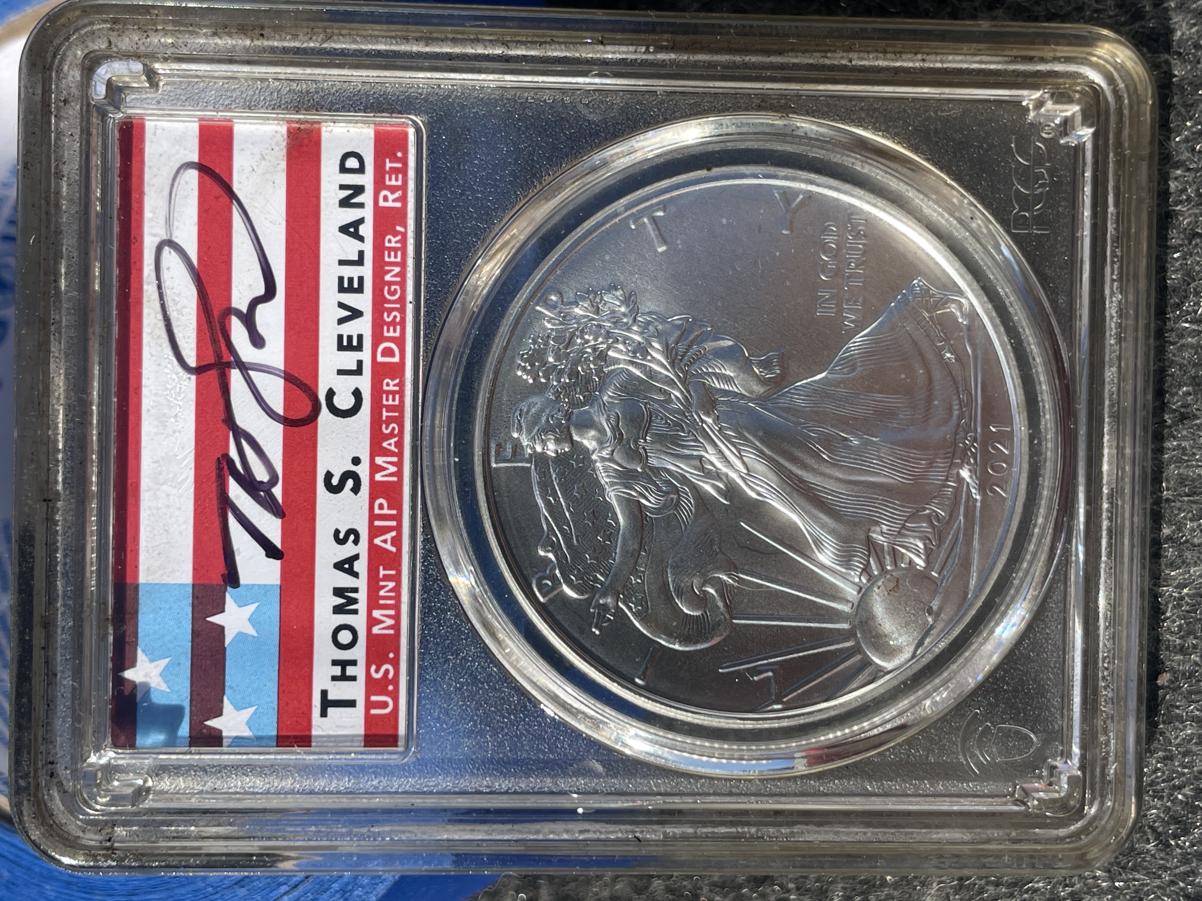 A 2021-(P) PCGS MS70 Silver Eagle Type 1 Emergency Issue coin struck at Philadelphia on the first day of issue featuring a hand-signed label by Thomas S. Cleveland.