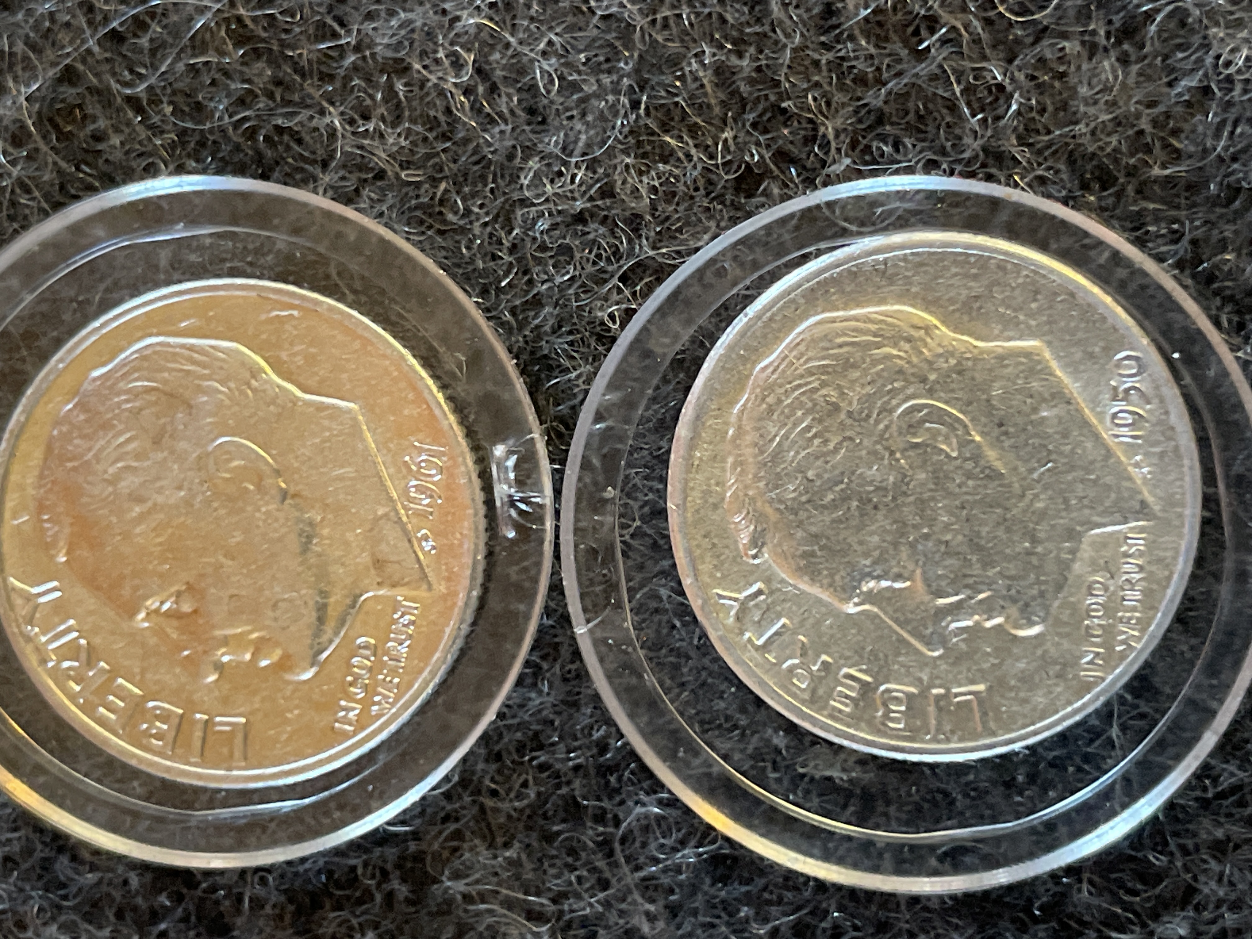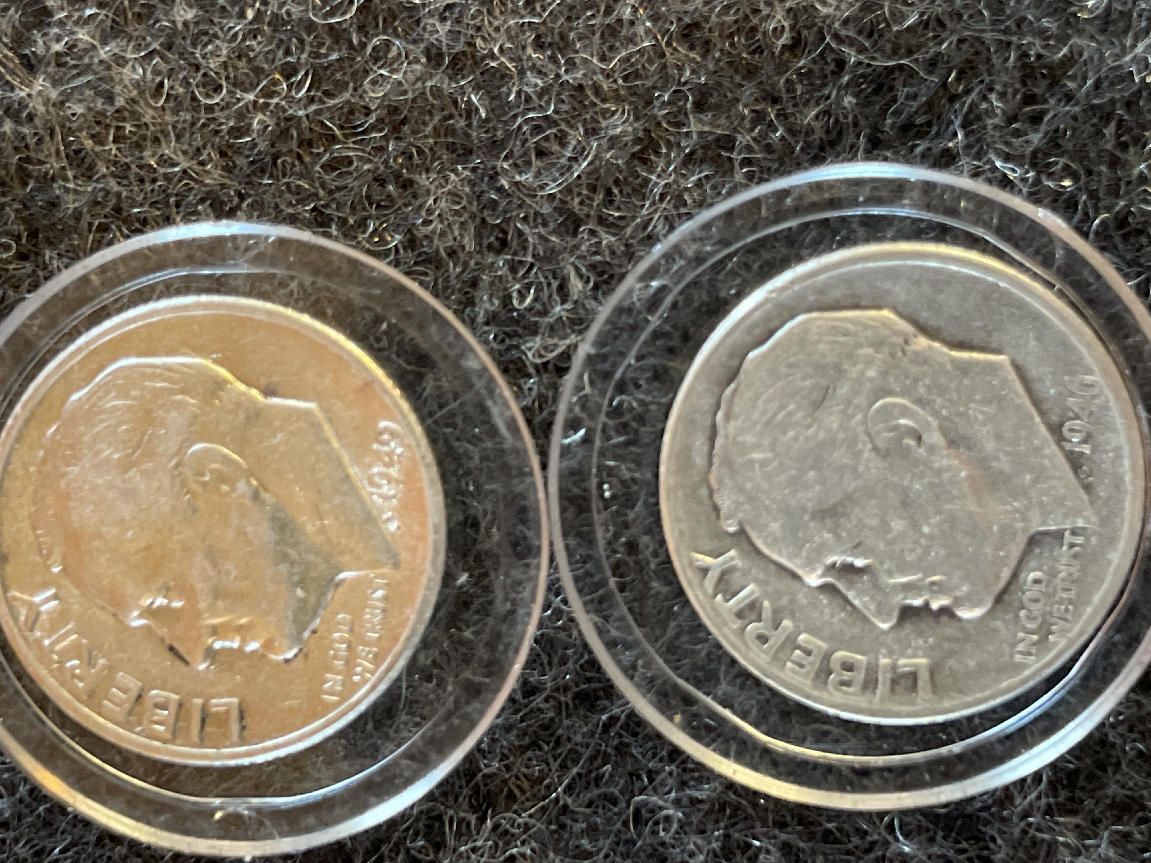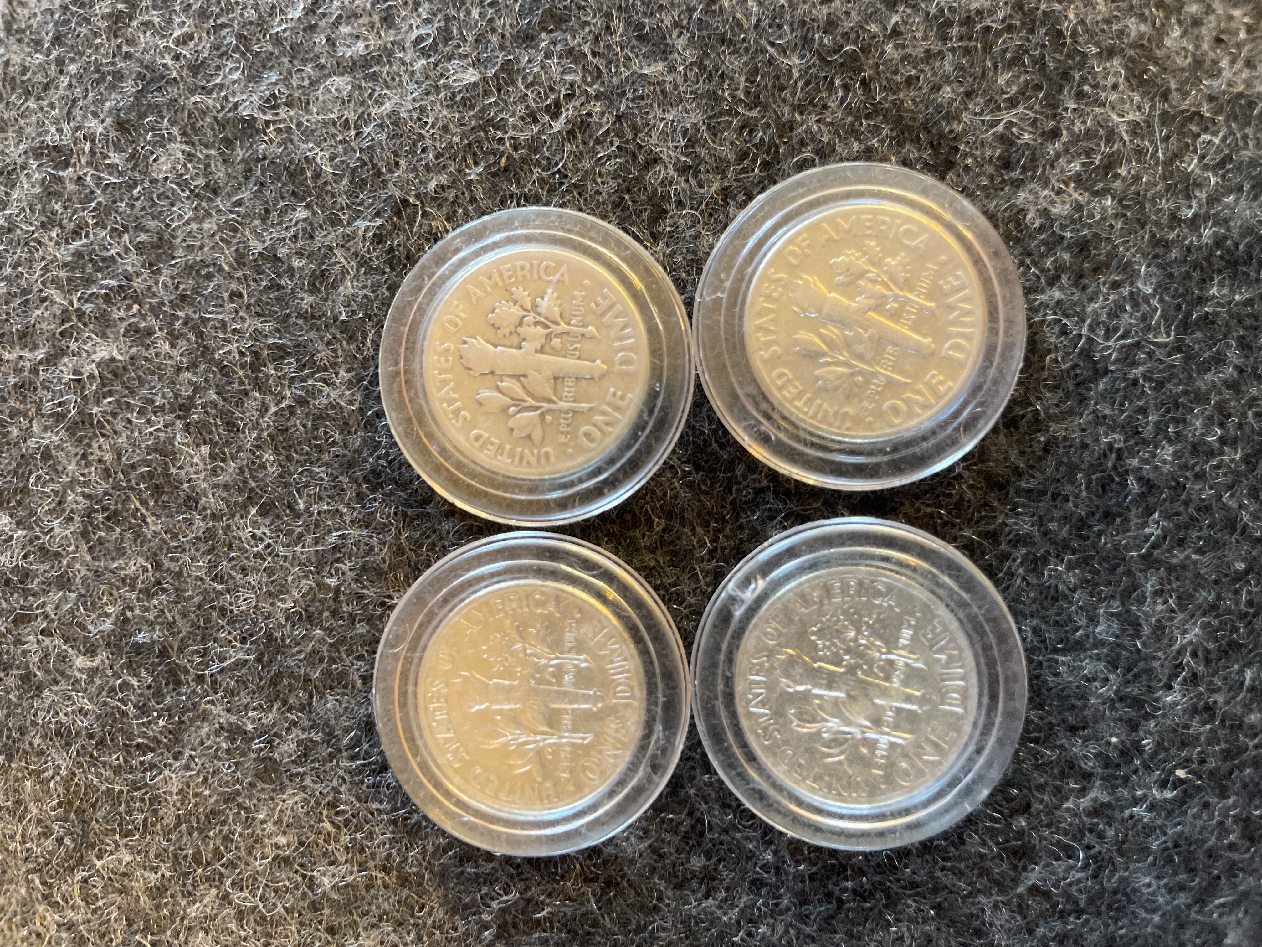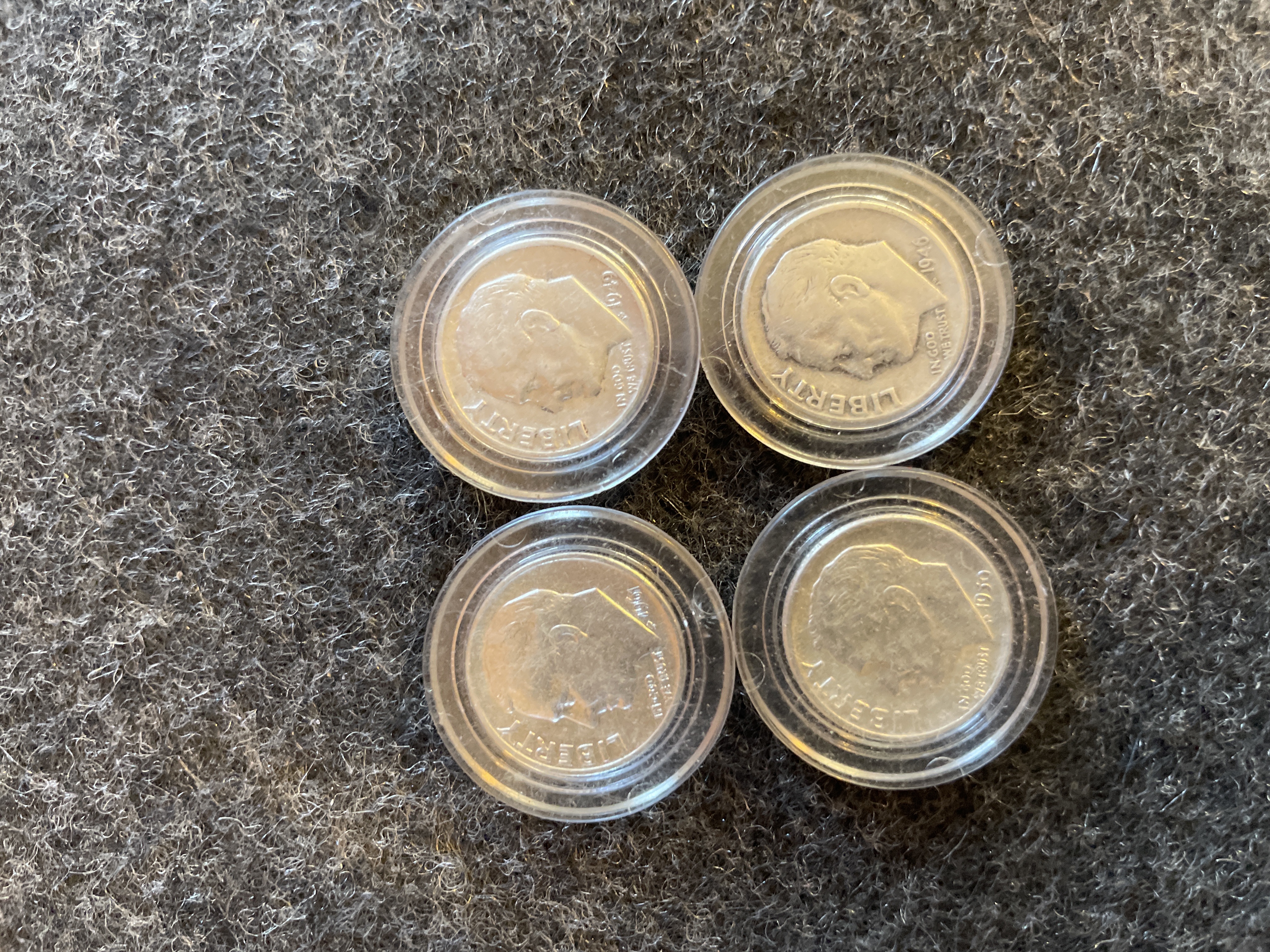 Several silver Roosevelt dimes dated 1946, 1949, 1950, and 1961 housed in individual protective plastic capsules.