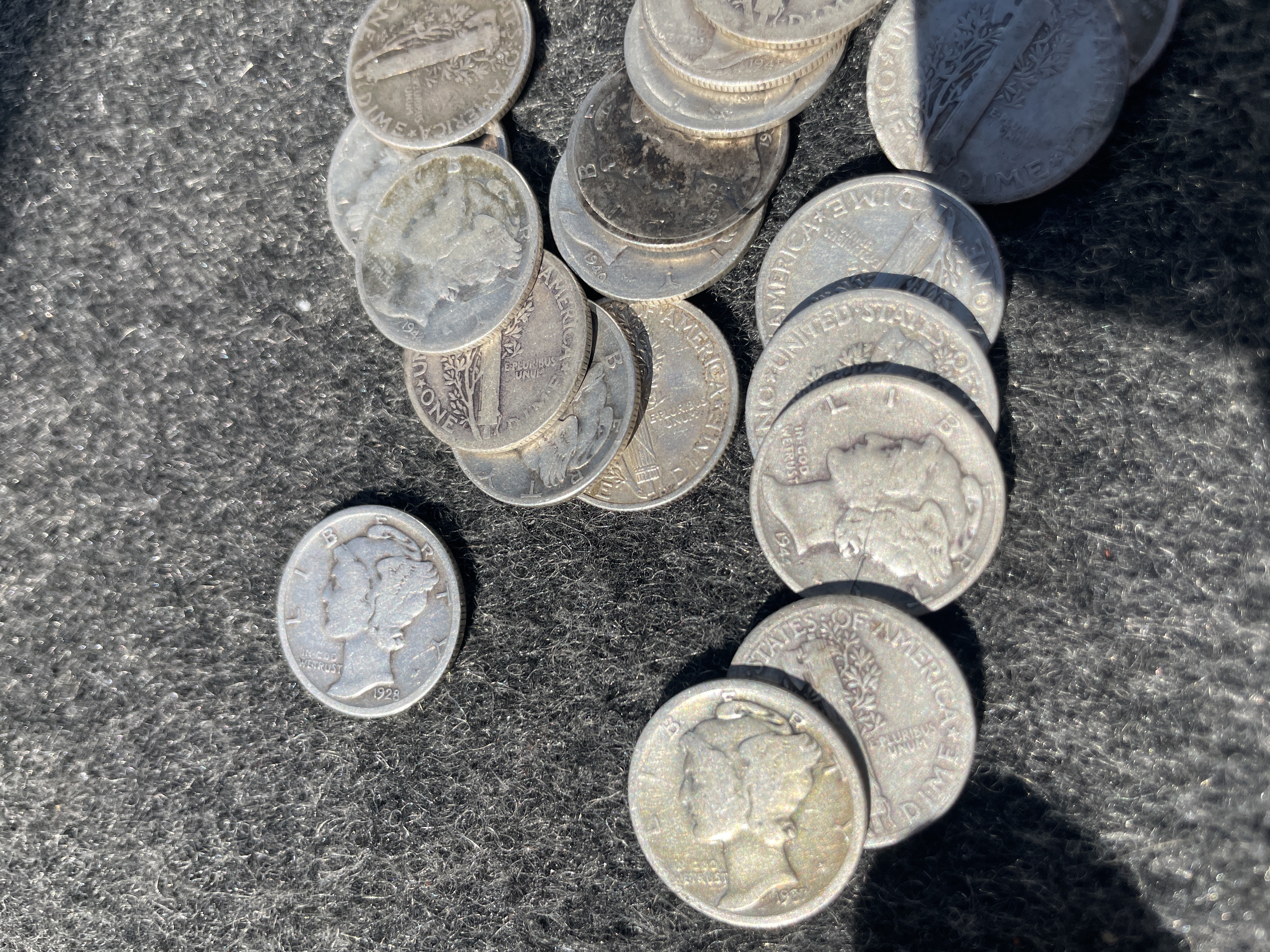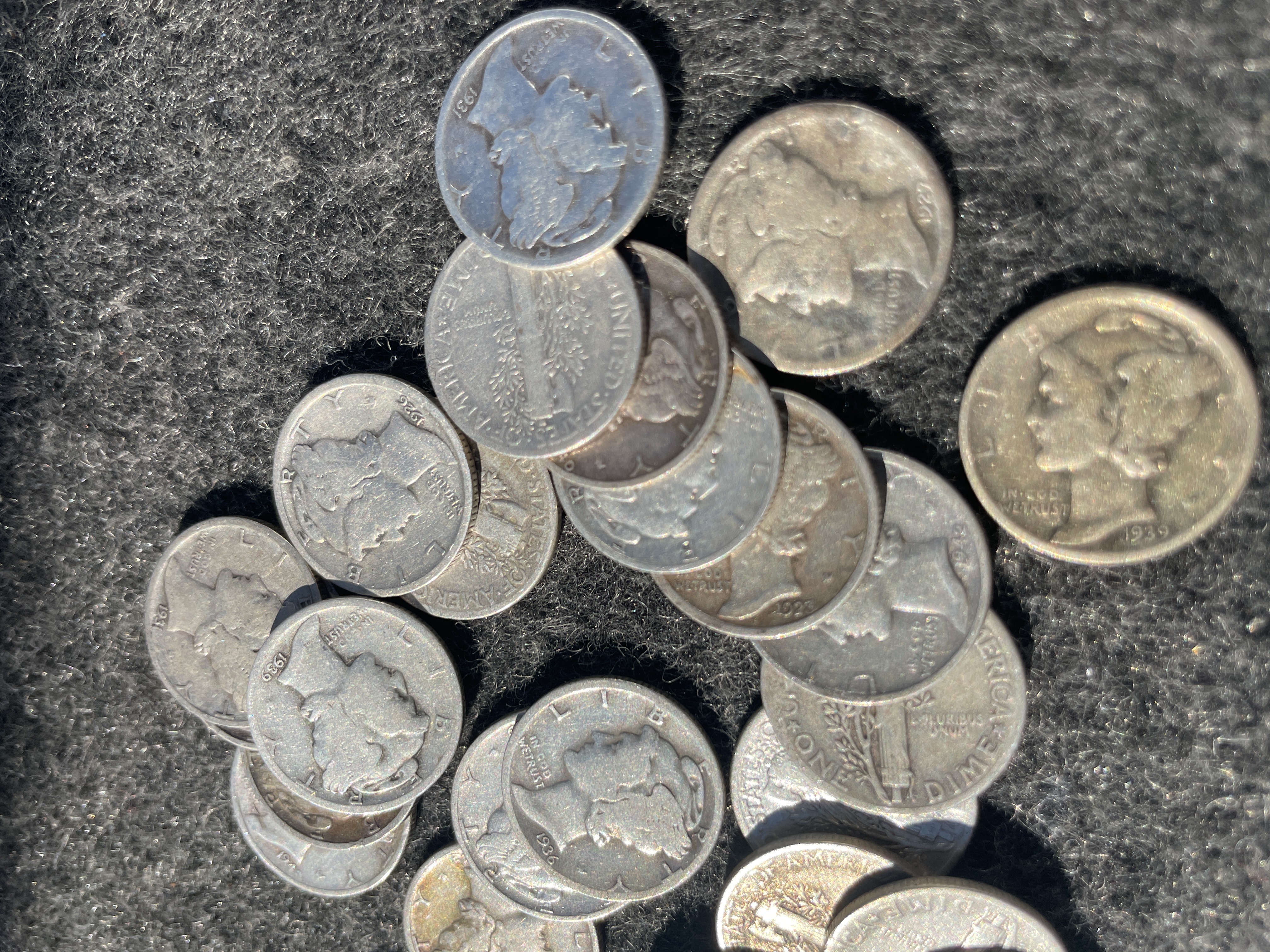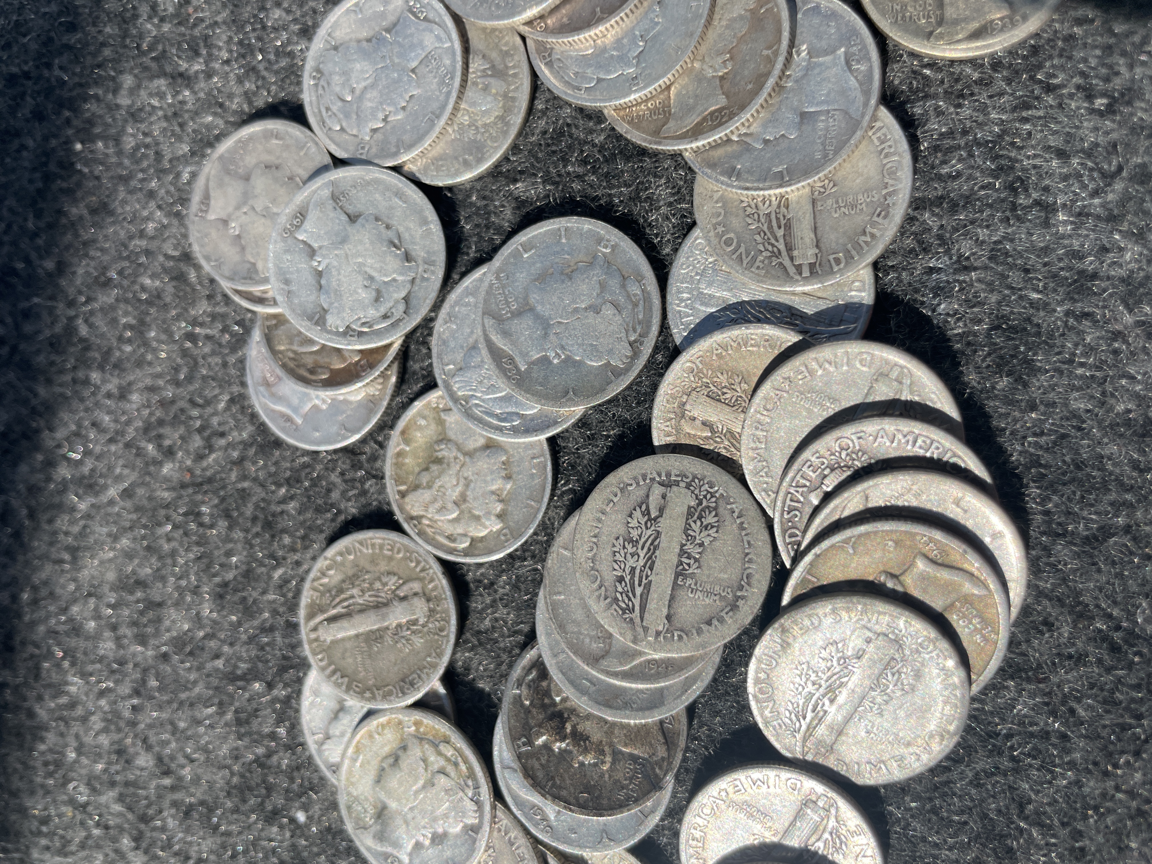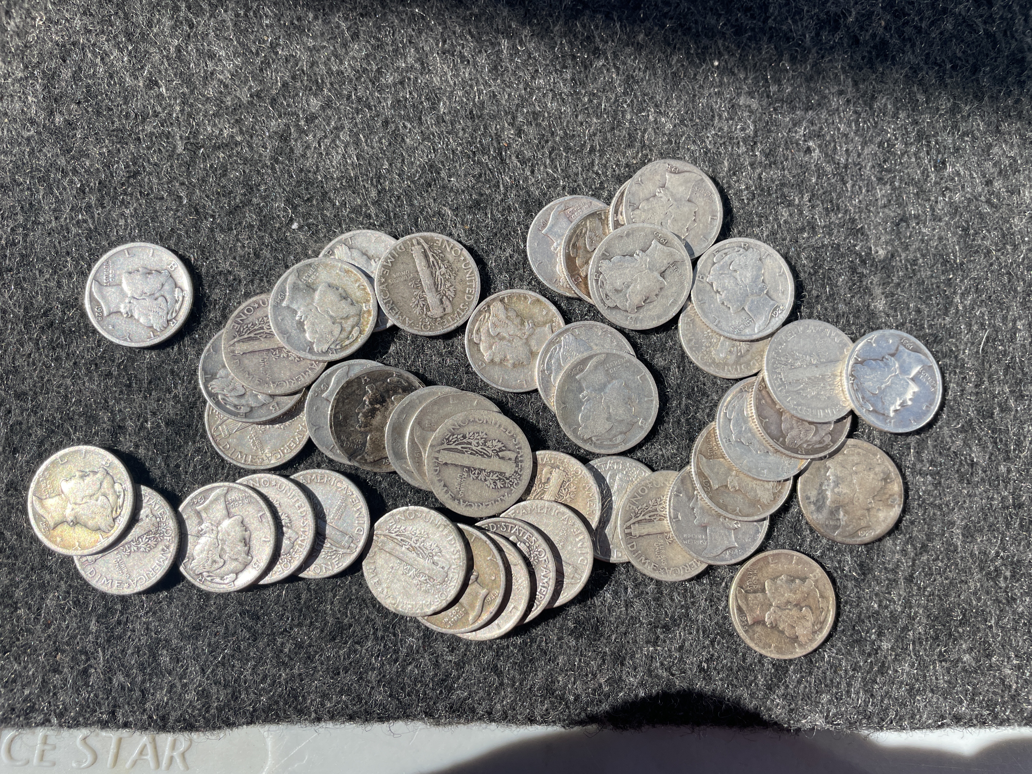 A collection of 43 90% silver United States Mercury dimes featuring various dates.
