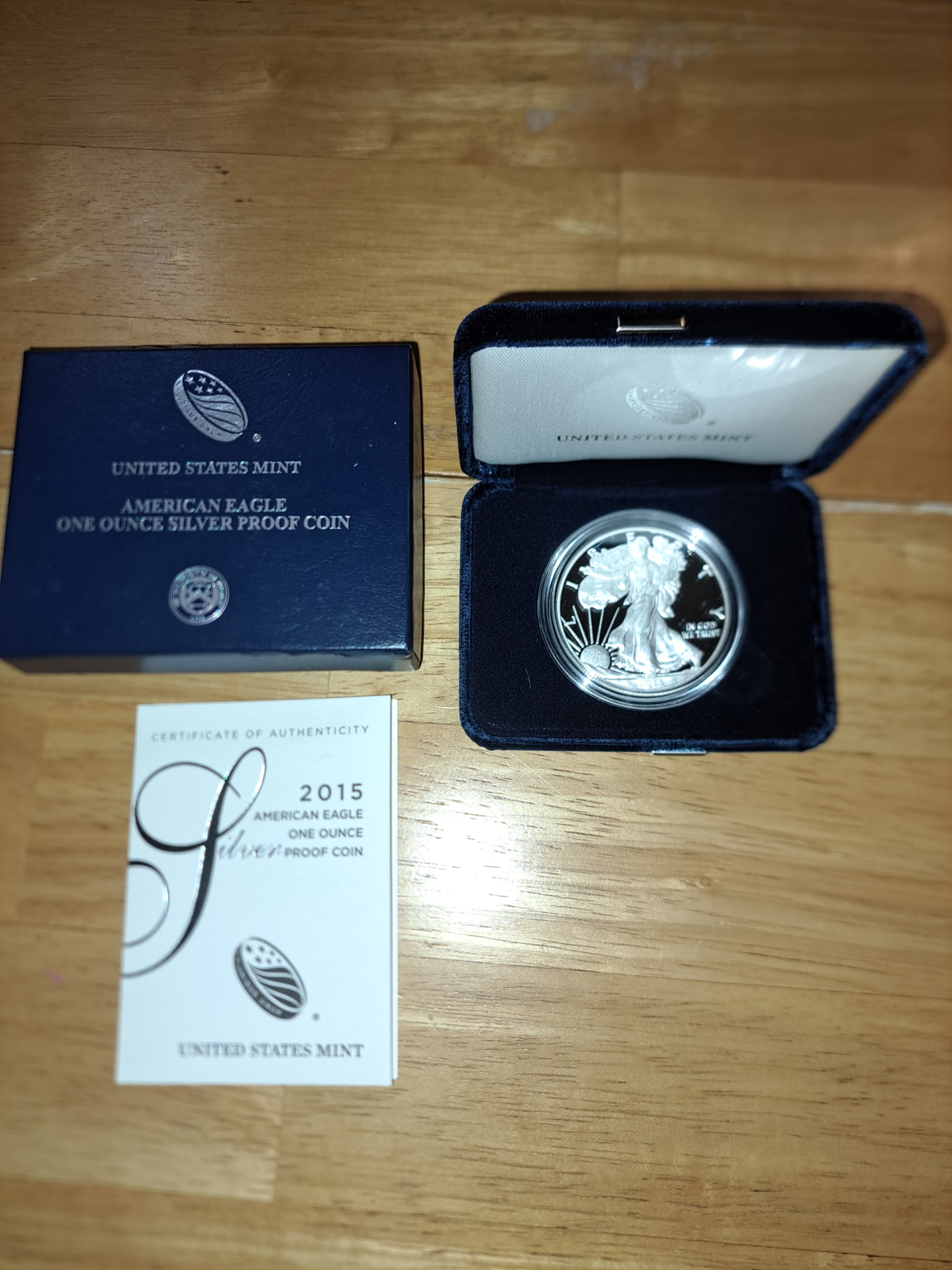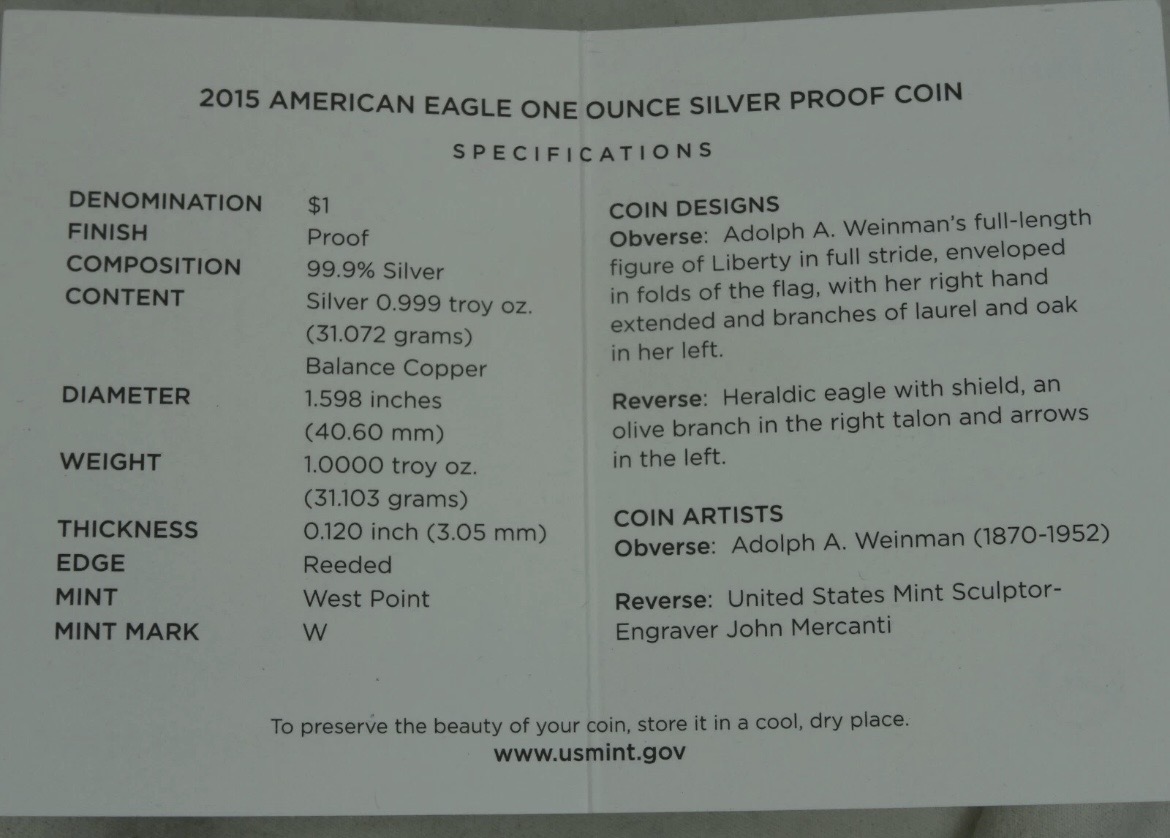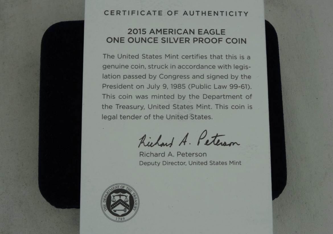 2015-W Proof American Silver Eagle Dollar $1 Box & COA US Mint Bullion