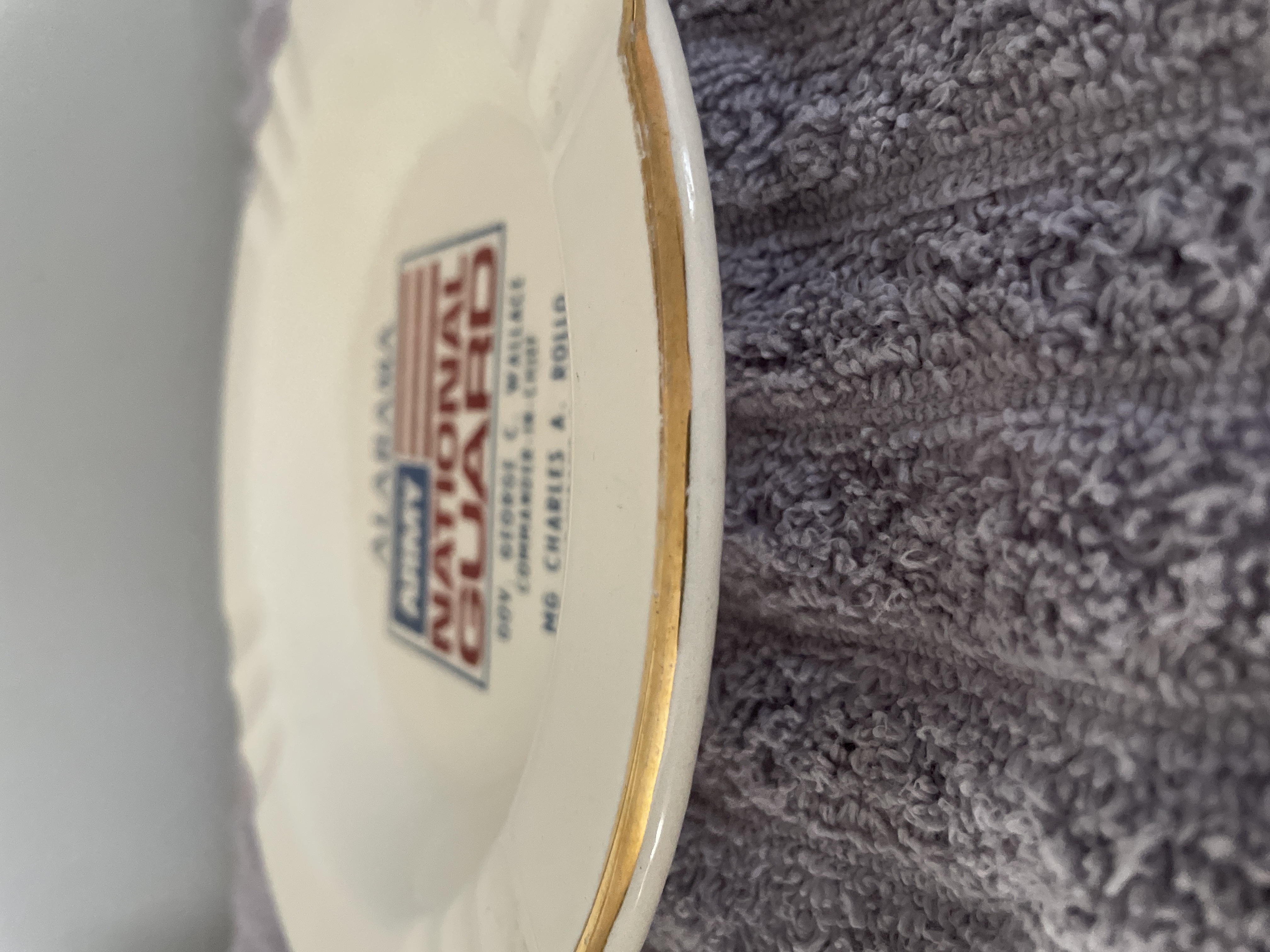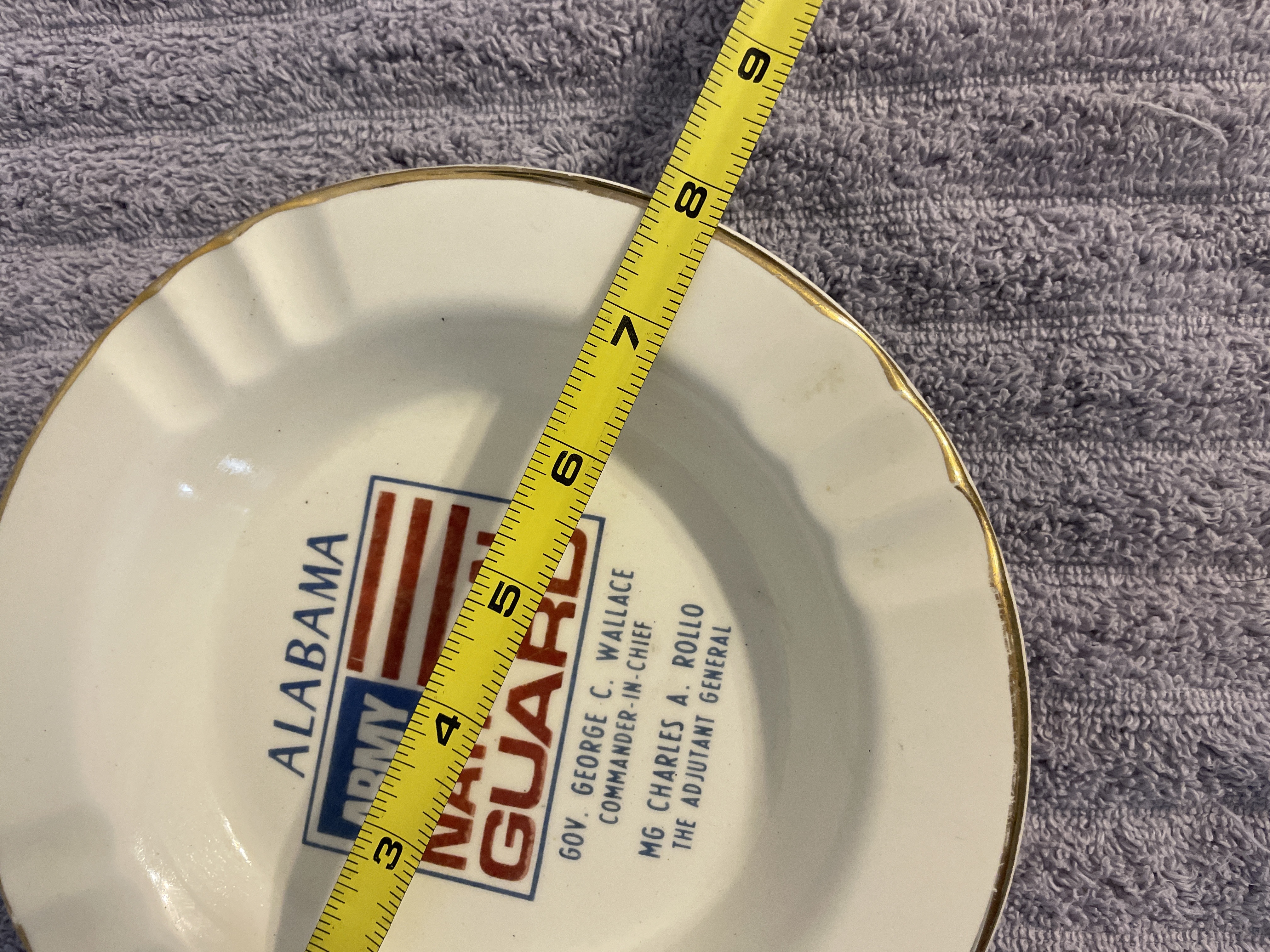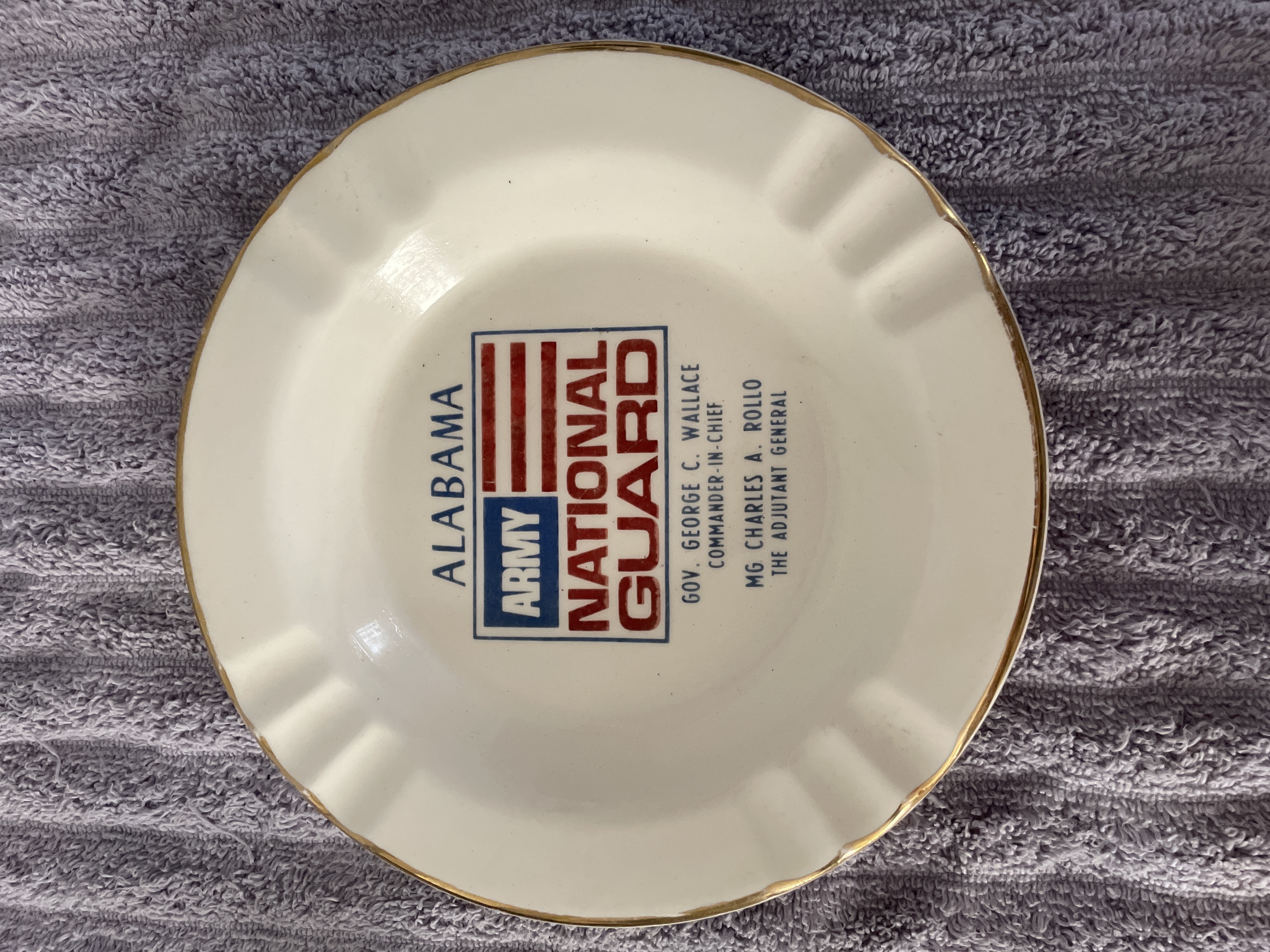 A white ceramic ashtray with gold-toned trim featuring the Alabama Army National Guard insignia and naming Governor George C. Wallace as Commander-In-Chief, measuring approximately 7.5 inches in diameter.