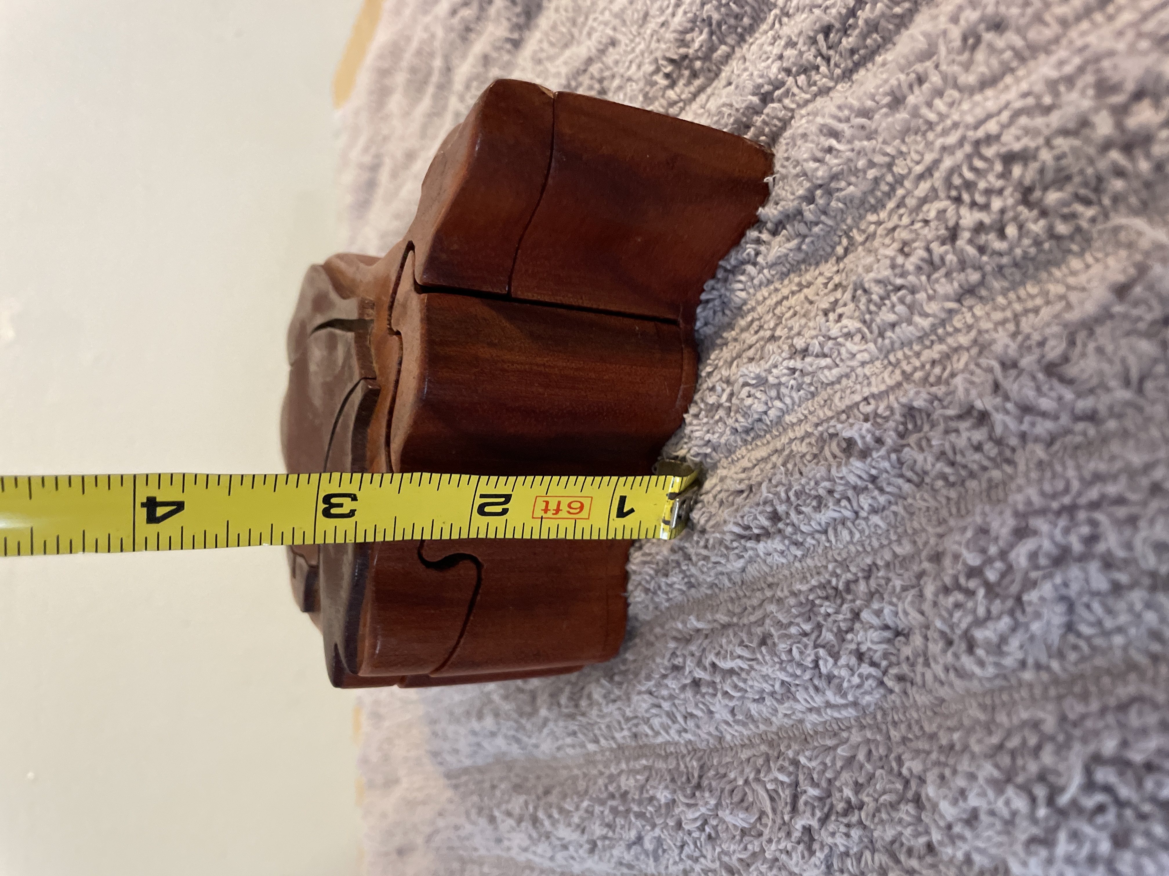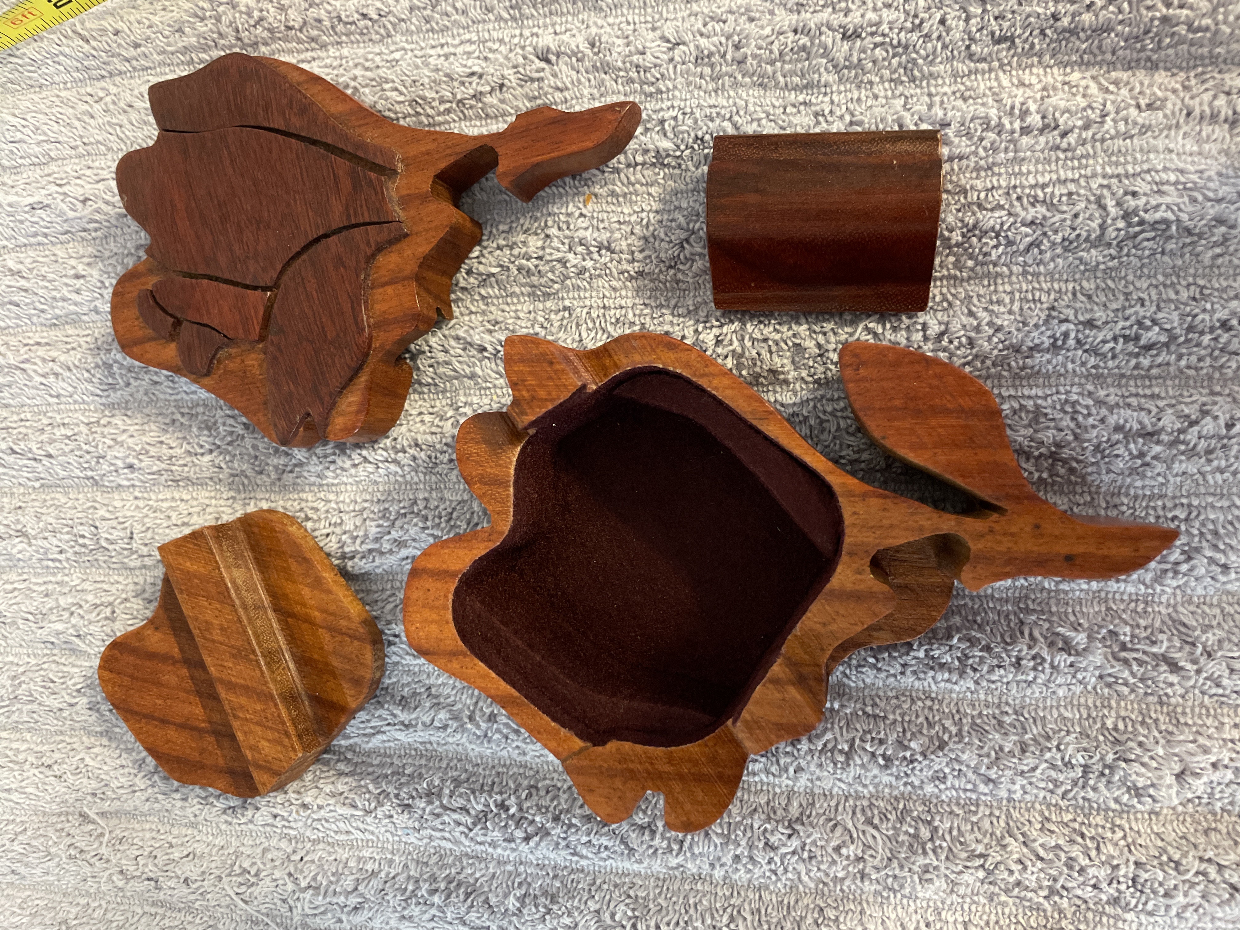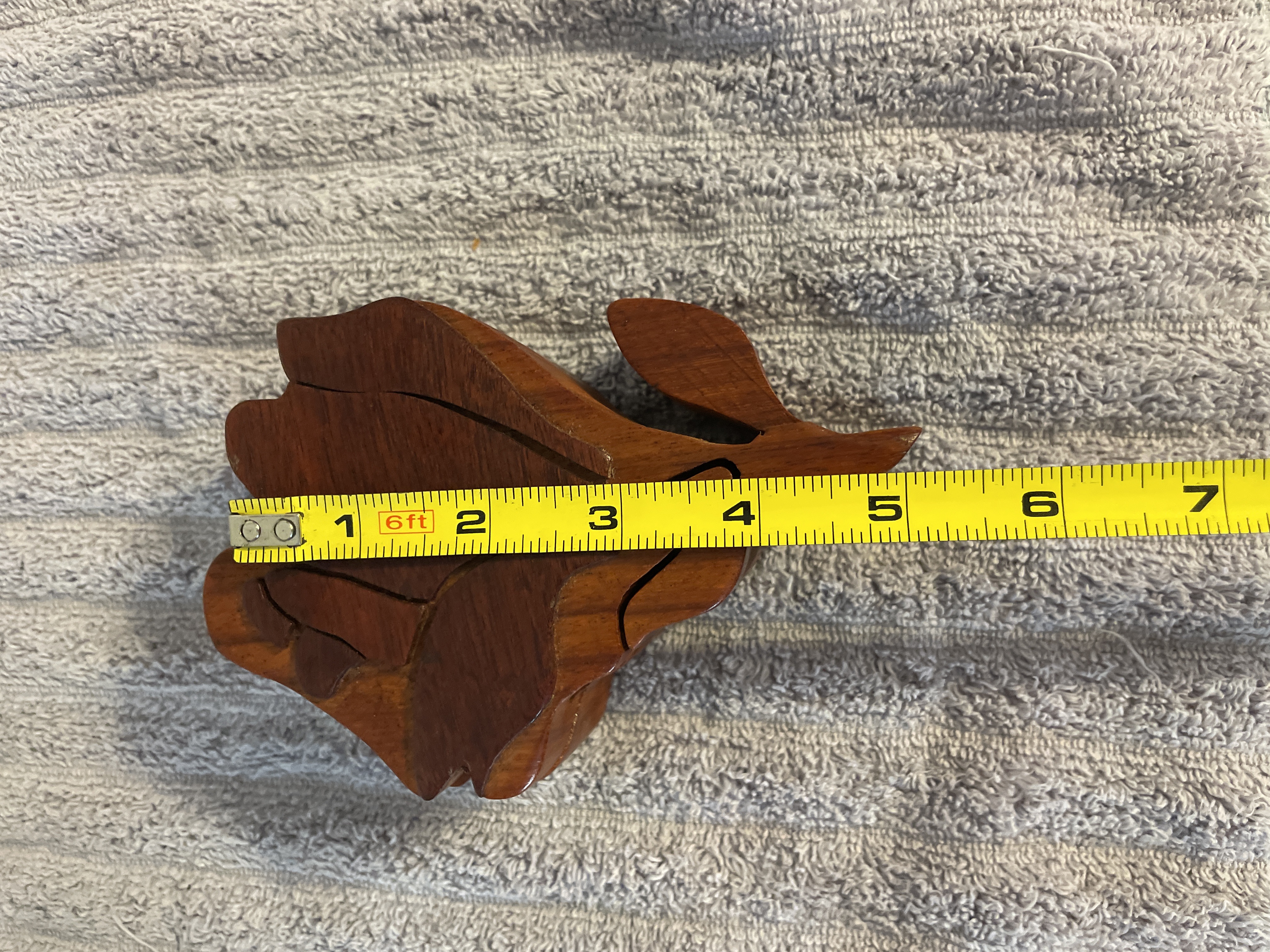 A rose-shaped wooden puzzle box featuring a reddish-brown finish, interlocking pieces, and a felt-lined interior, measuring approximately 5.5 inches in length and 2 inches in height.
