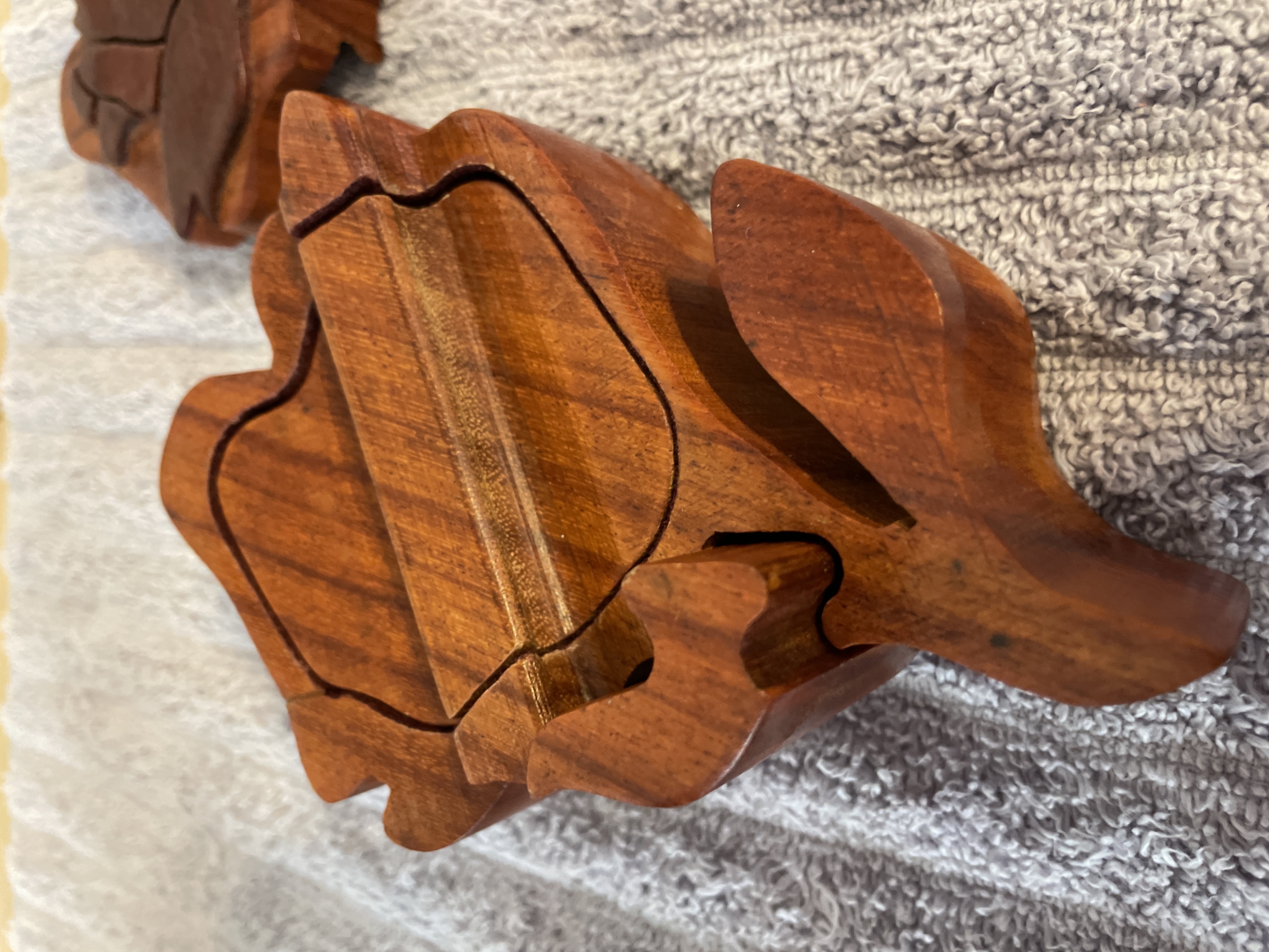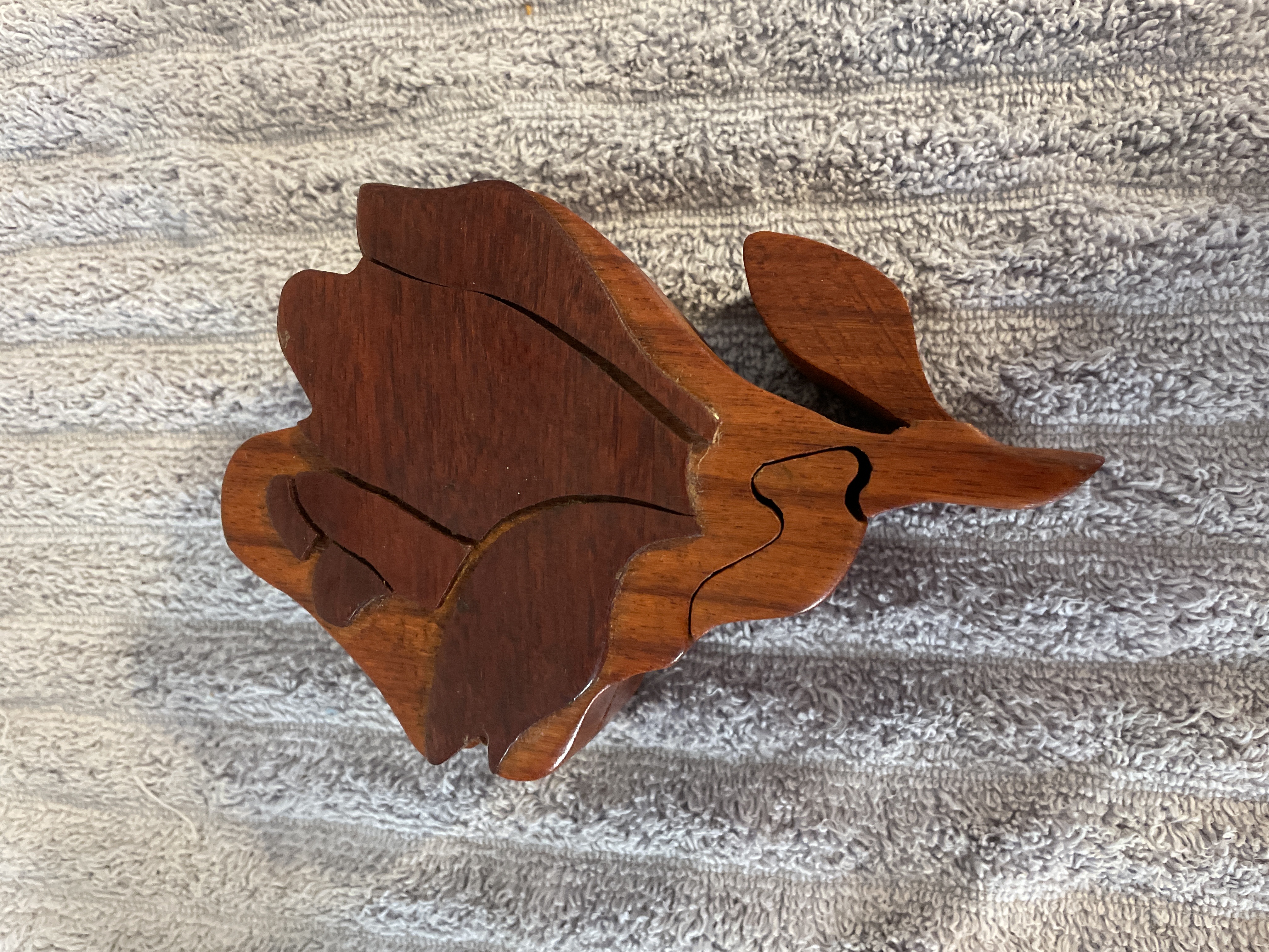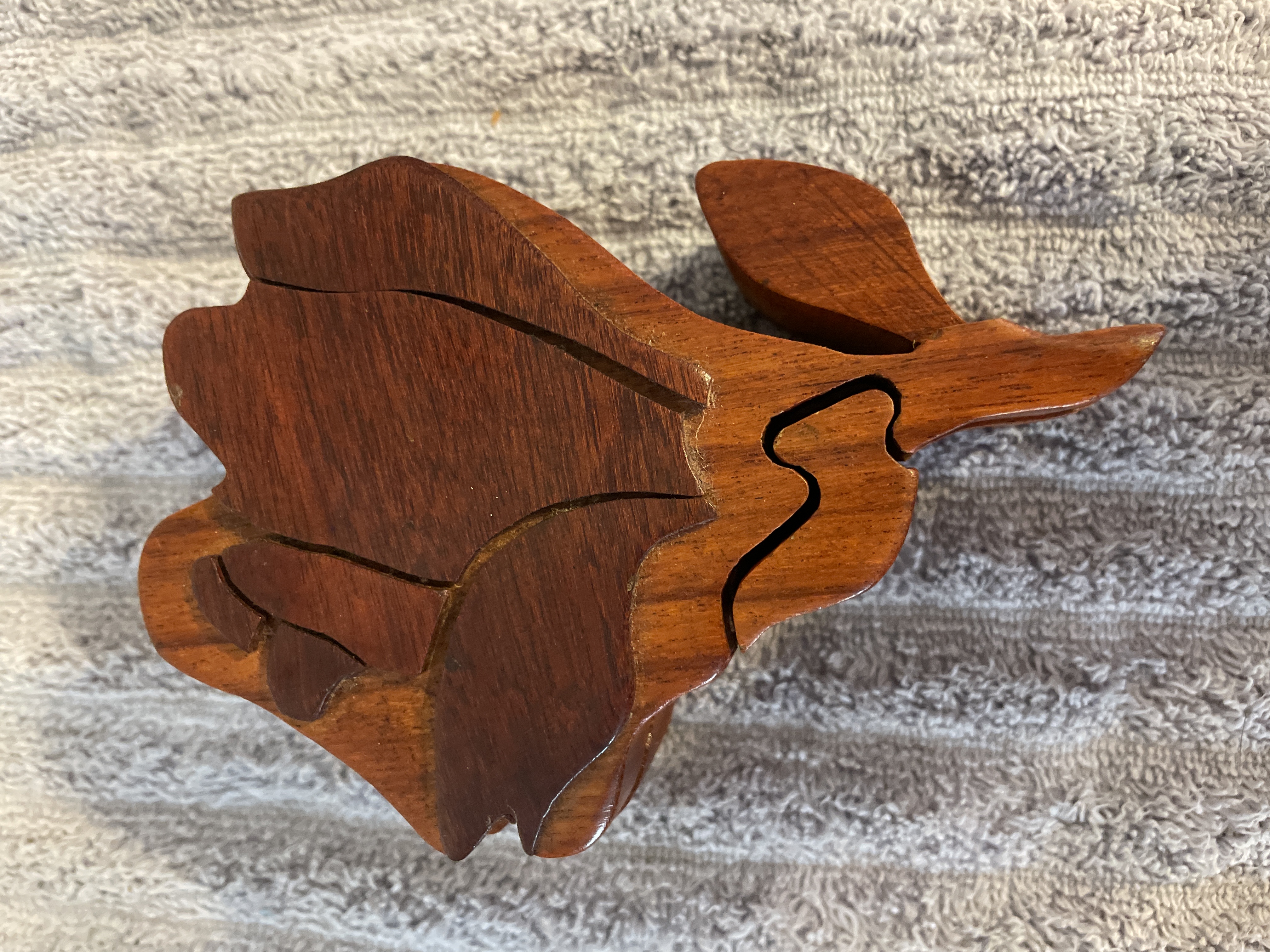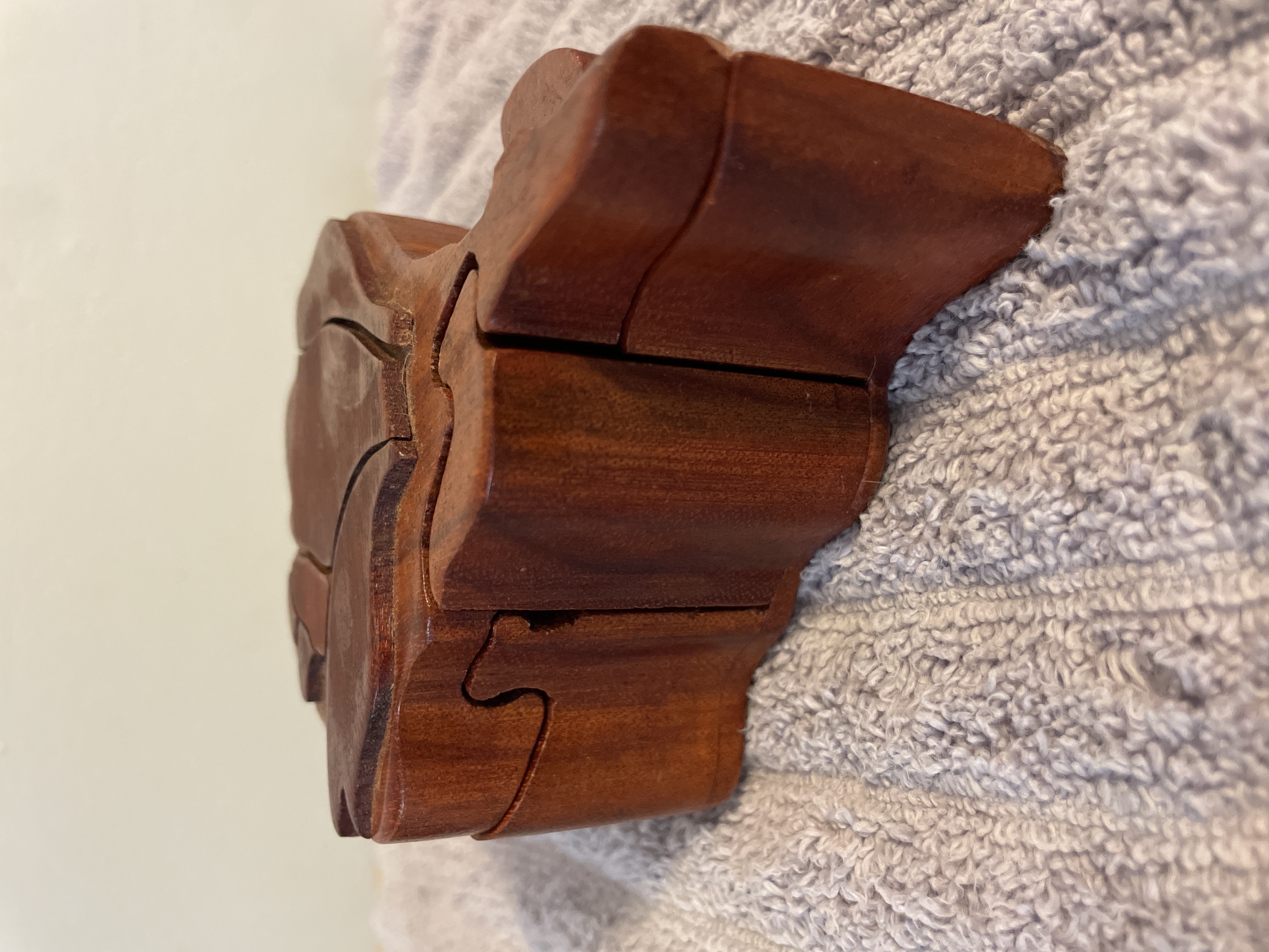 A rose-shaped wooden puzzle box featuring a reddish-brown finish, interlocking pieces, and a felt-lined interior, measuring approximately 5.5 inches in length and 2 inches in height.