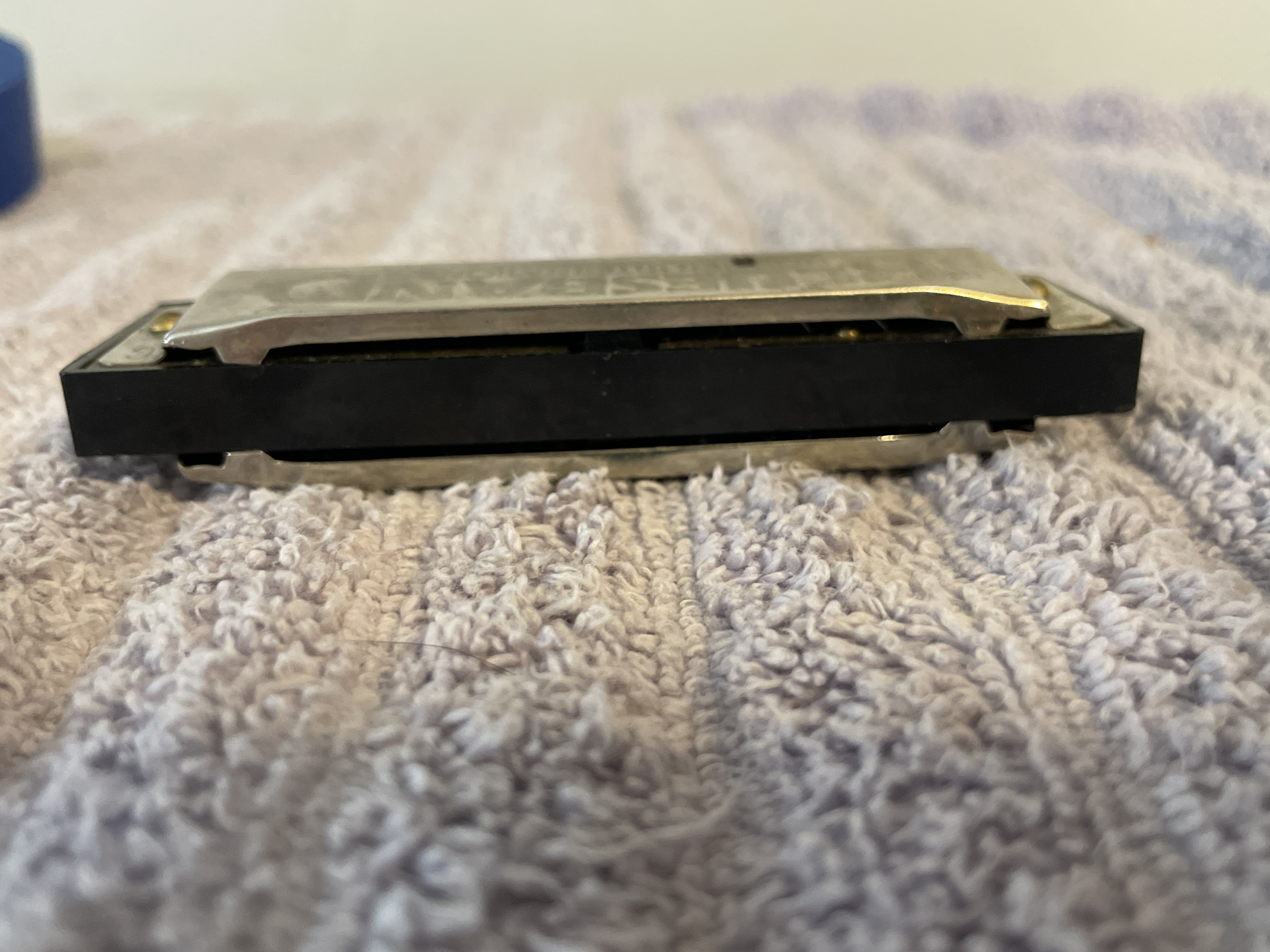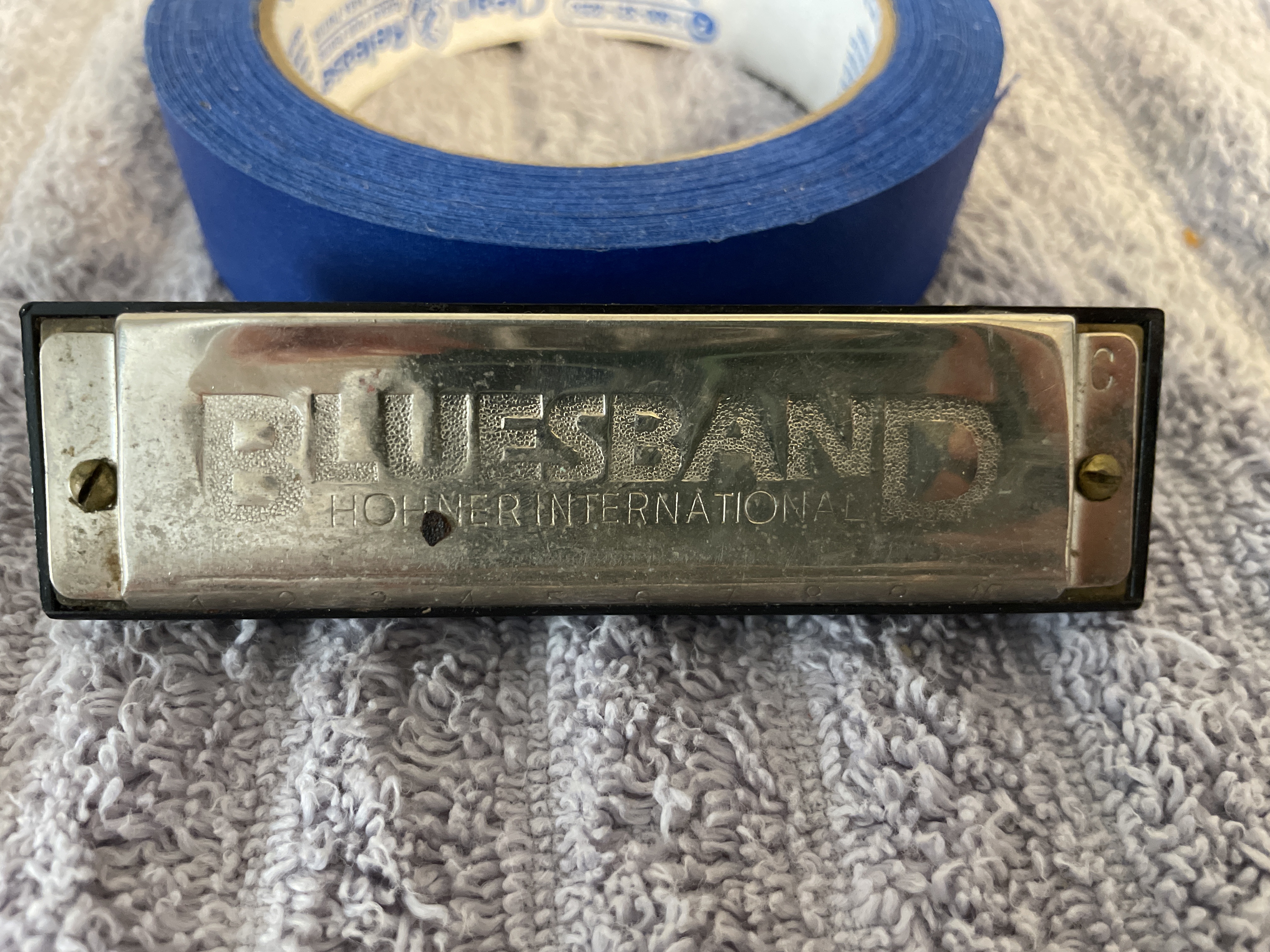 A Hohner International Bluesband harmonica in the key of C featuring silver-toned metal cover plates and a black plastic comb, marked Made in China.
