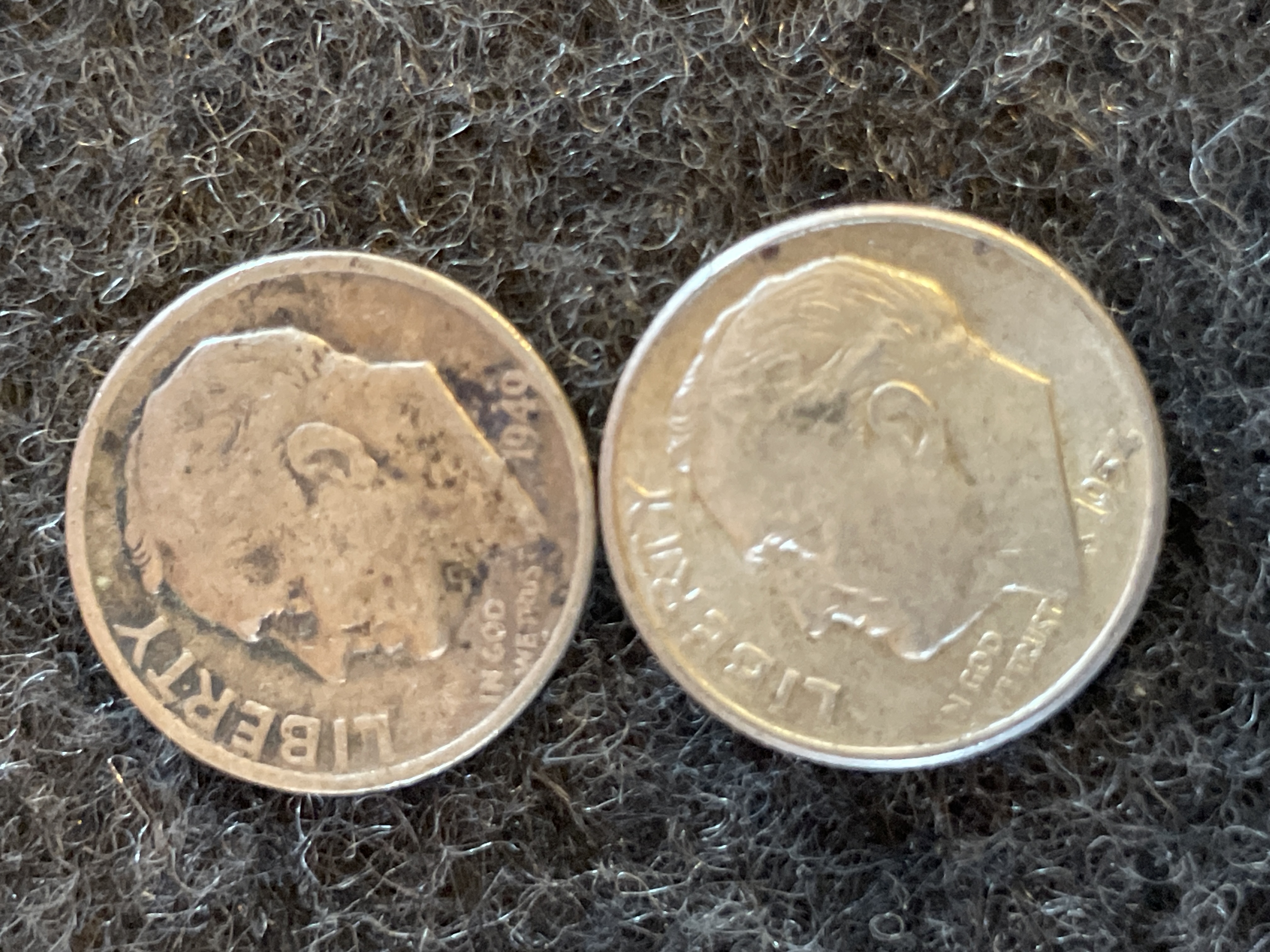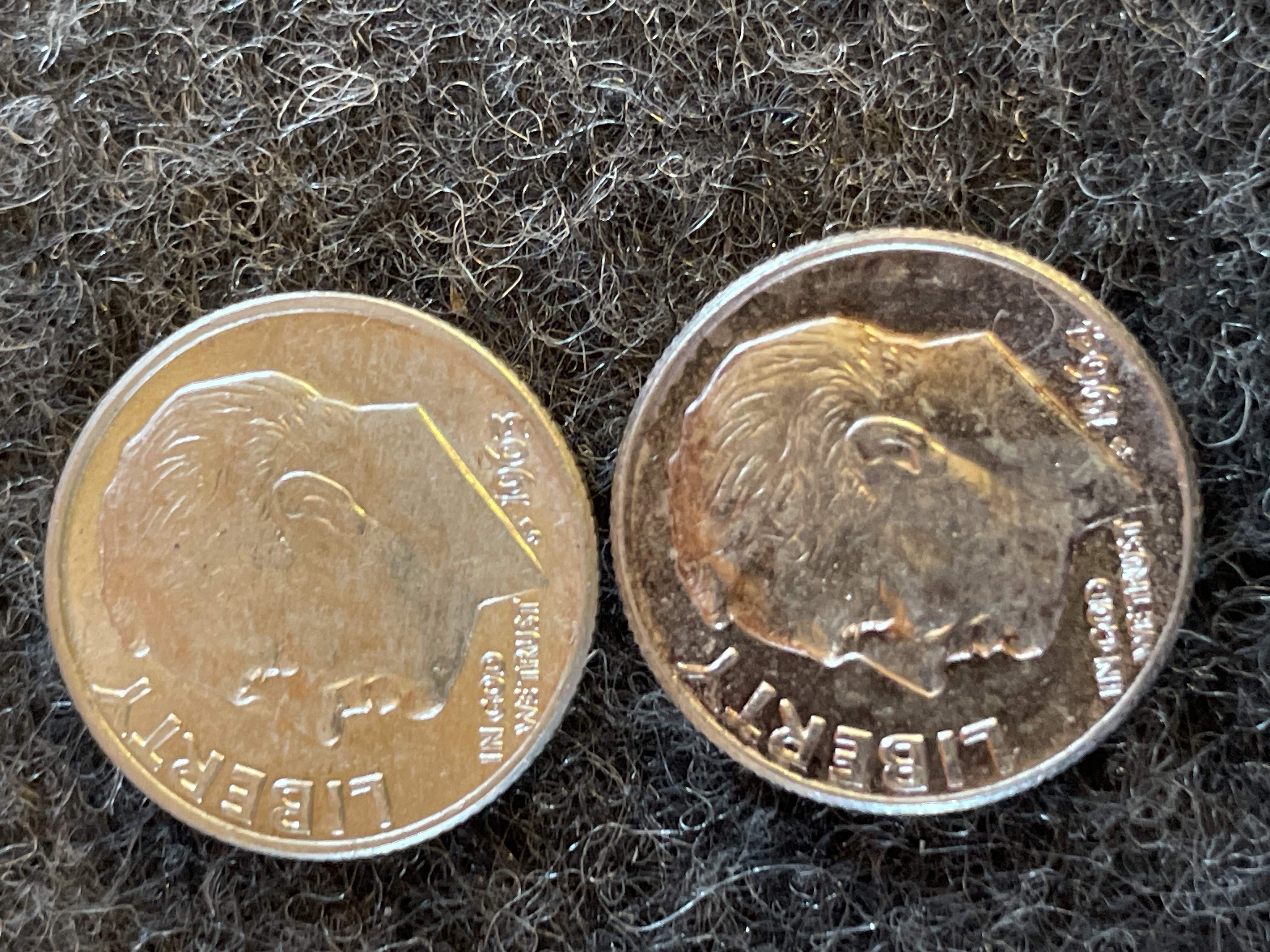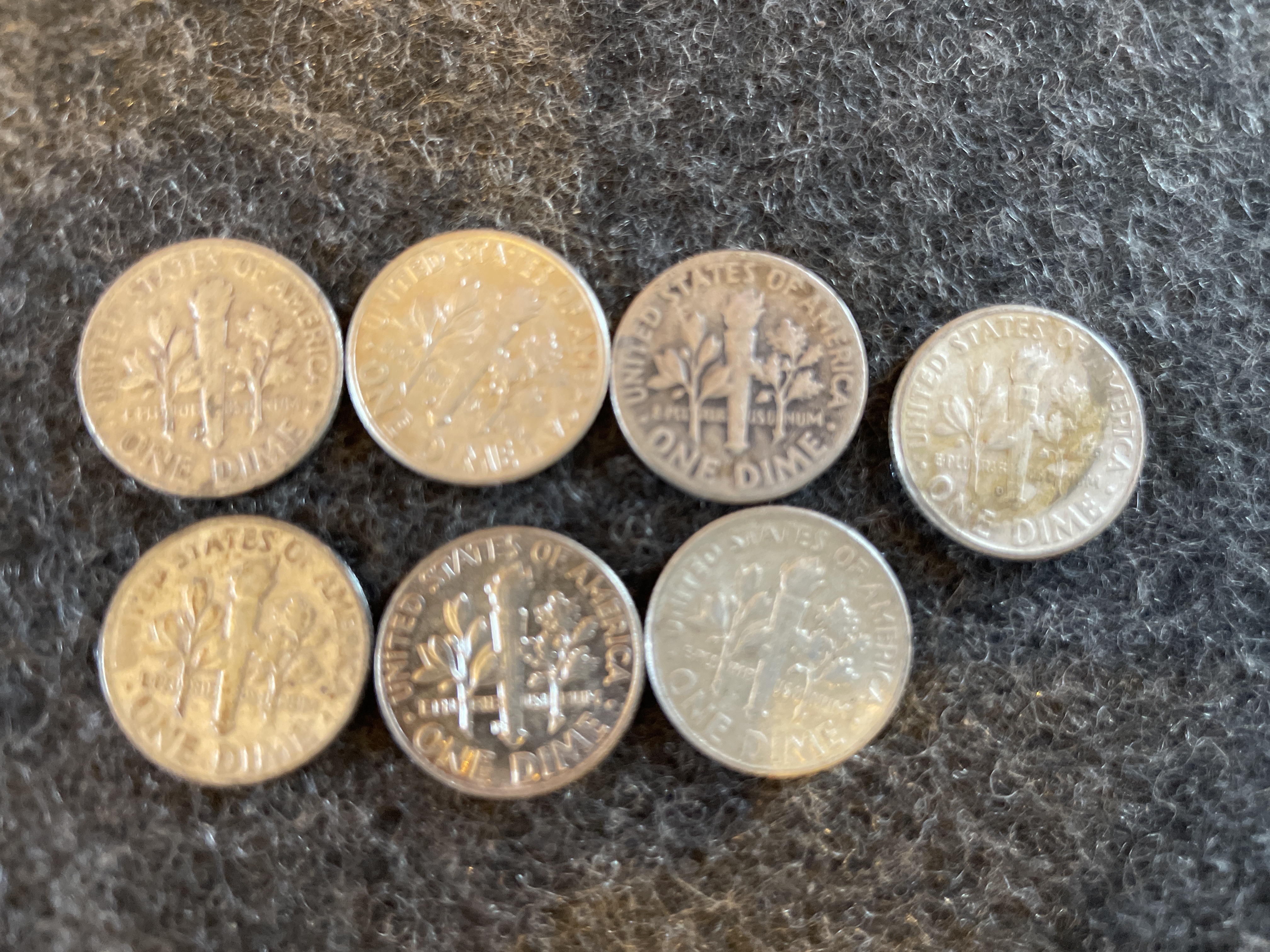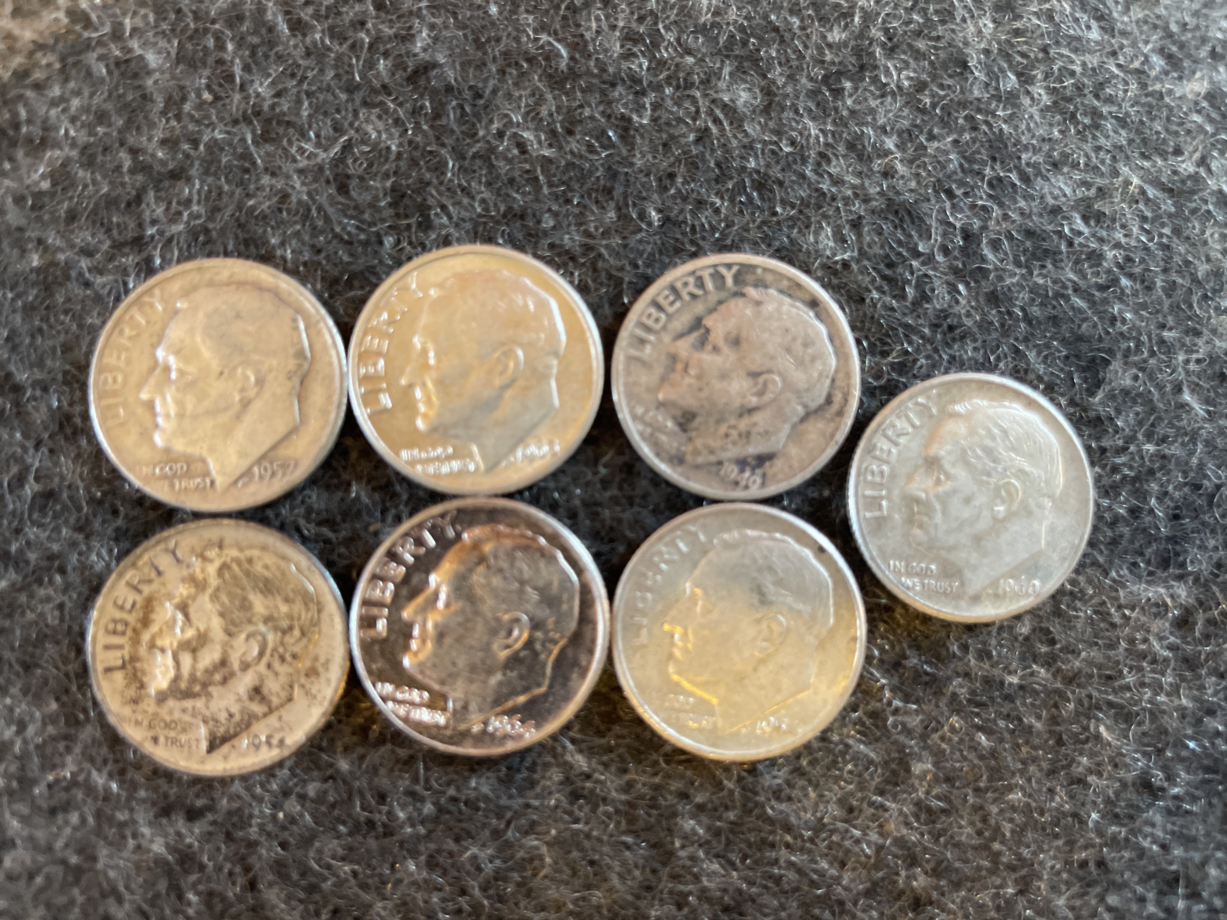 A collection of silver United States Roosevelt dimes featuring inscriptions of Liberty and In God We Trust with dates ranging from 1949 to 1964.