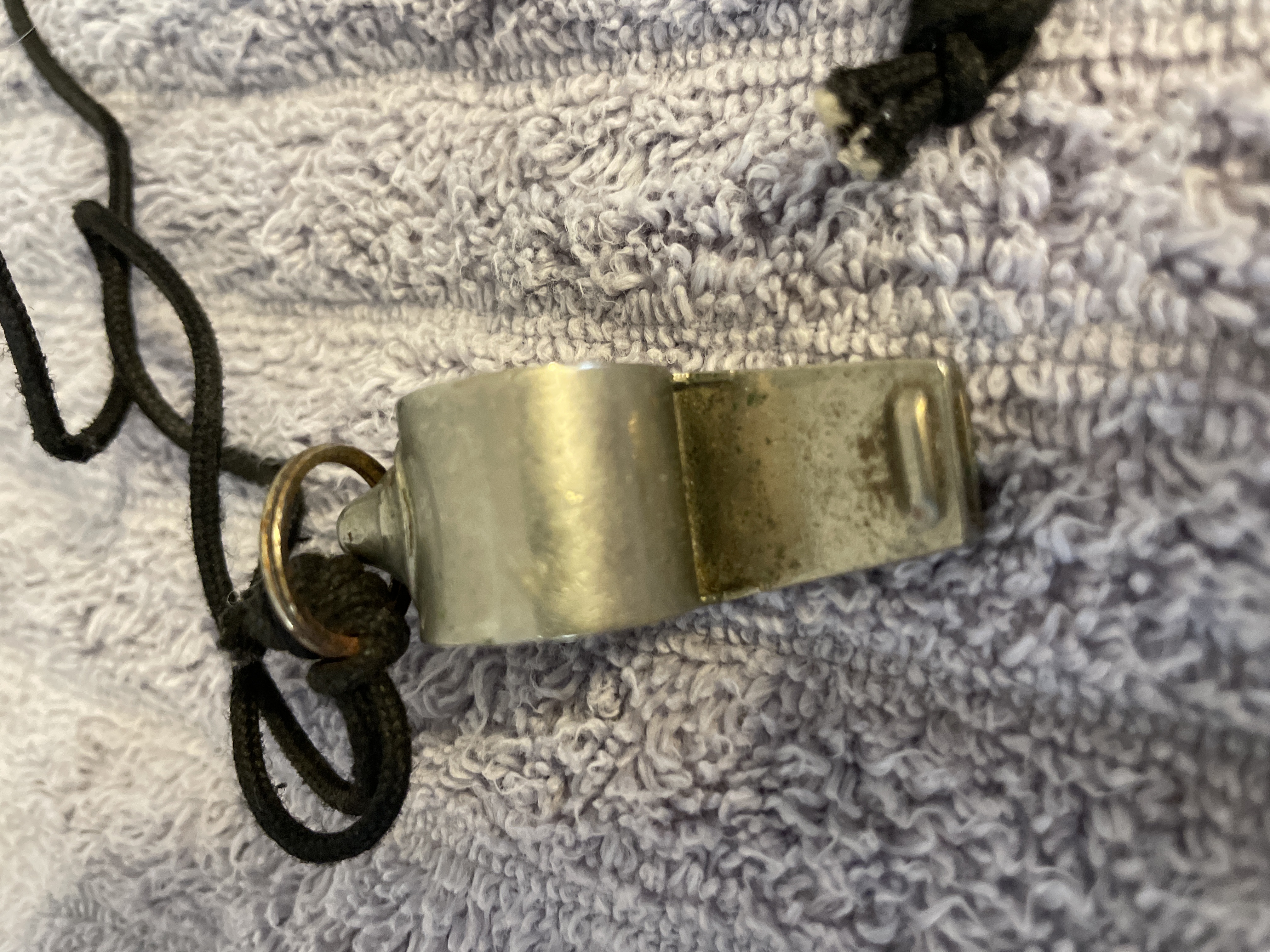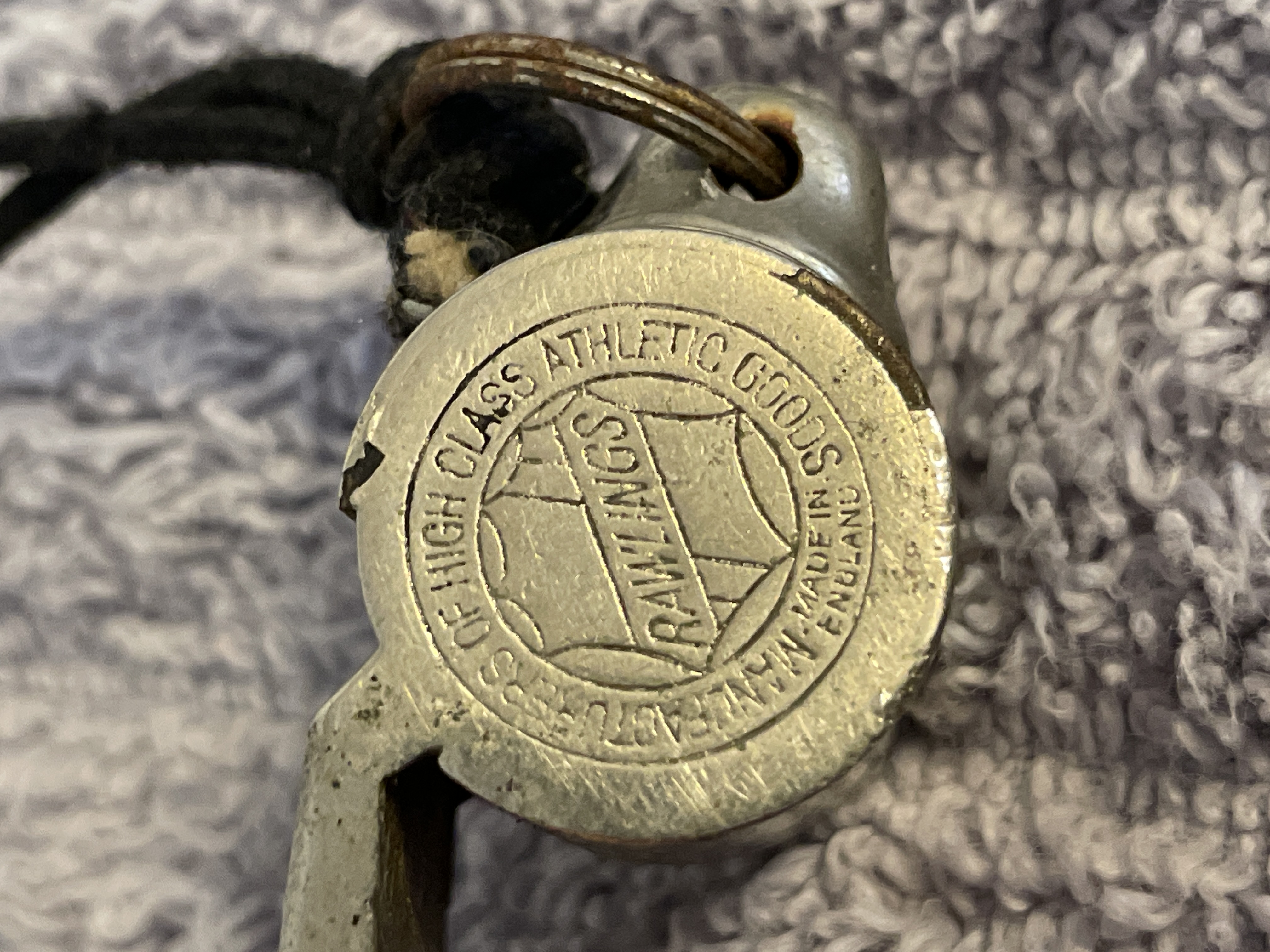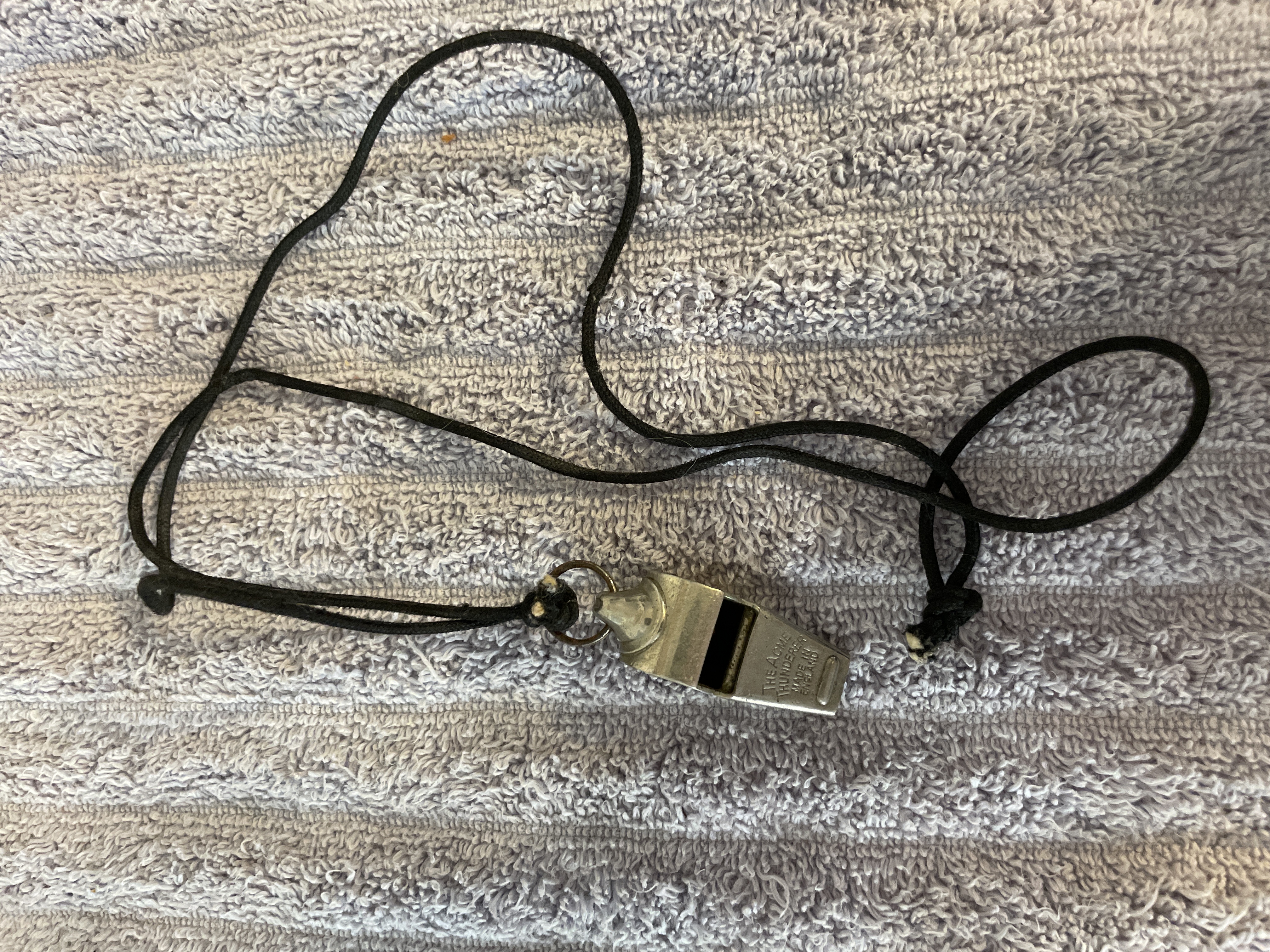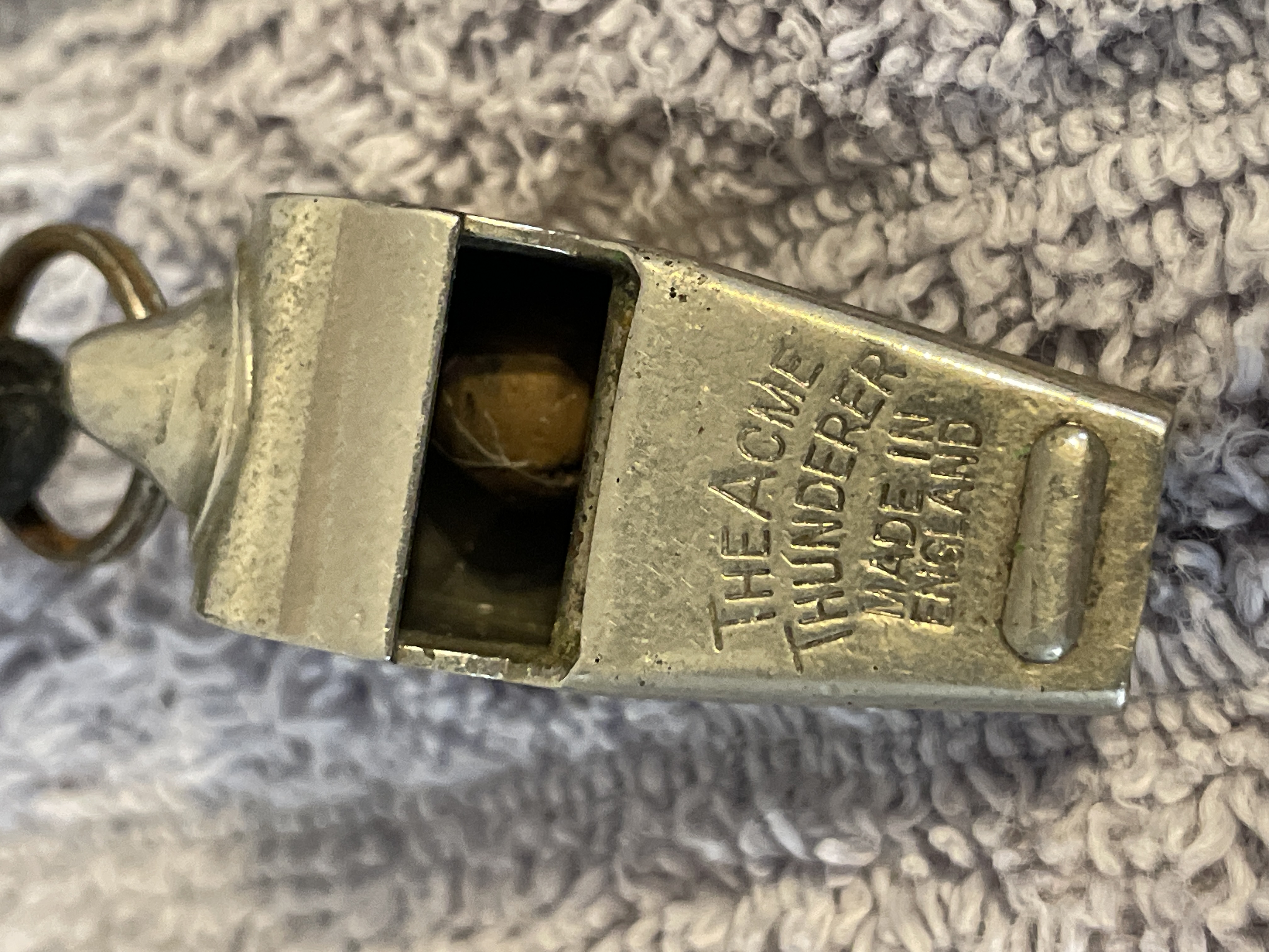 A silver-colored metal whistle featuring inscriptions for The Acme Thunderer and Rawlings on a black cord lanyard.