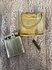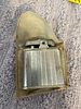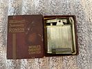 A silver-colored Ronson Whirlwind cigarette lighter featuring an engine-turned pattern, accompanied by its original maroon box, a fabric pouch, and a cleaning brush.