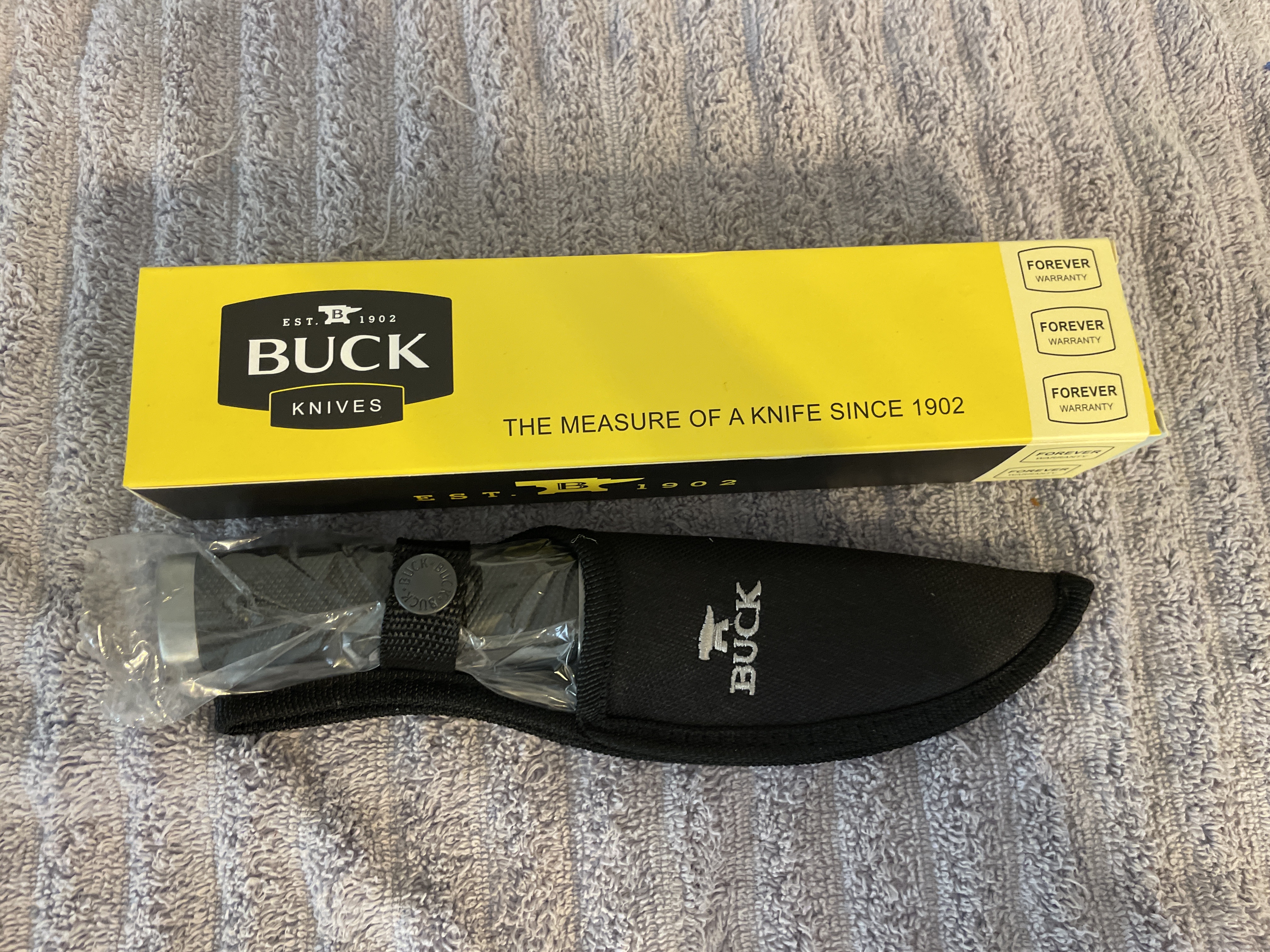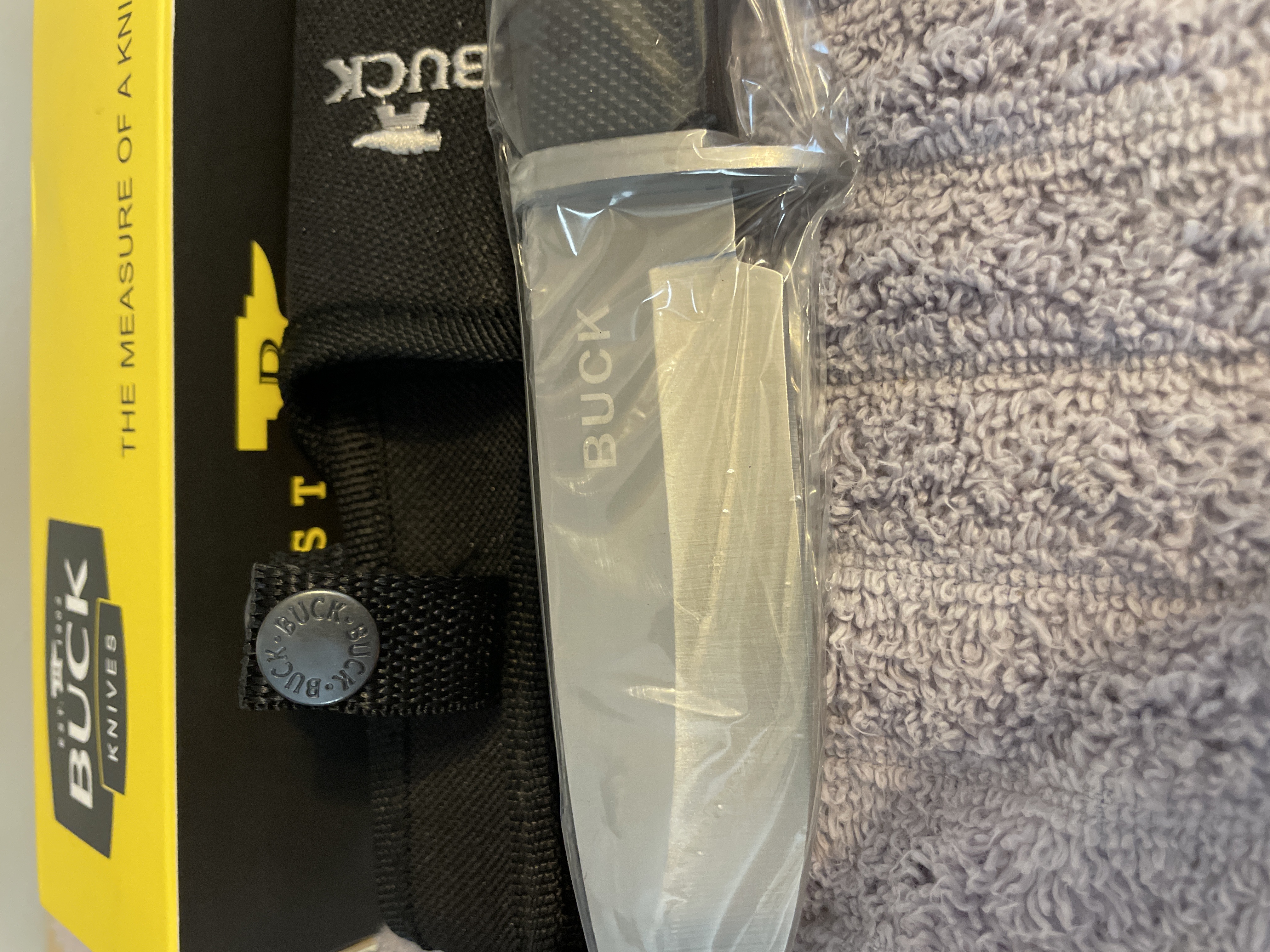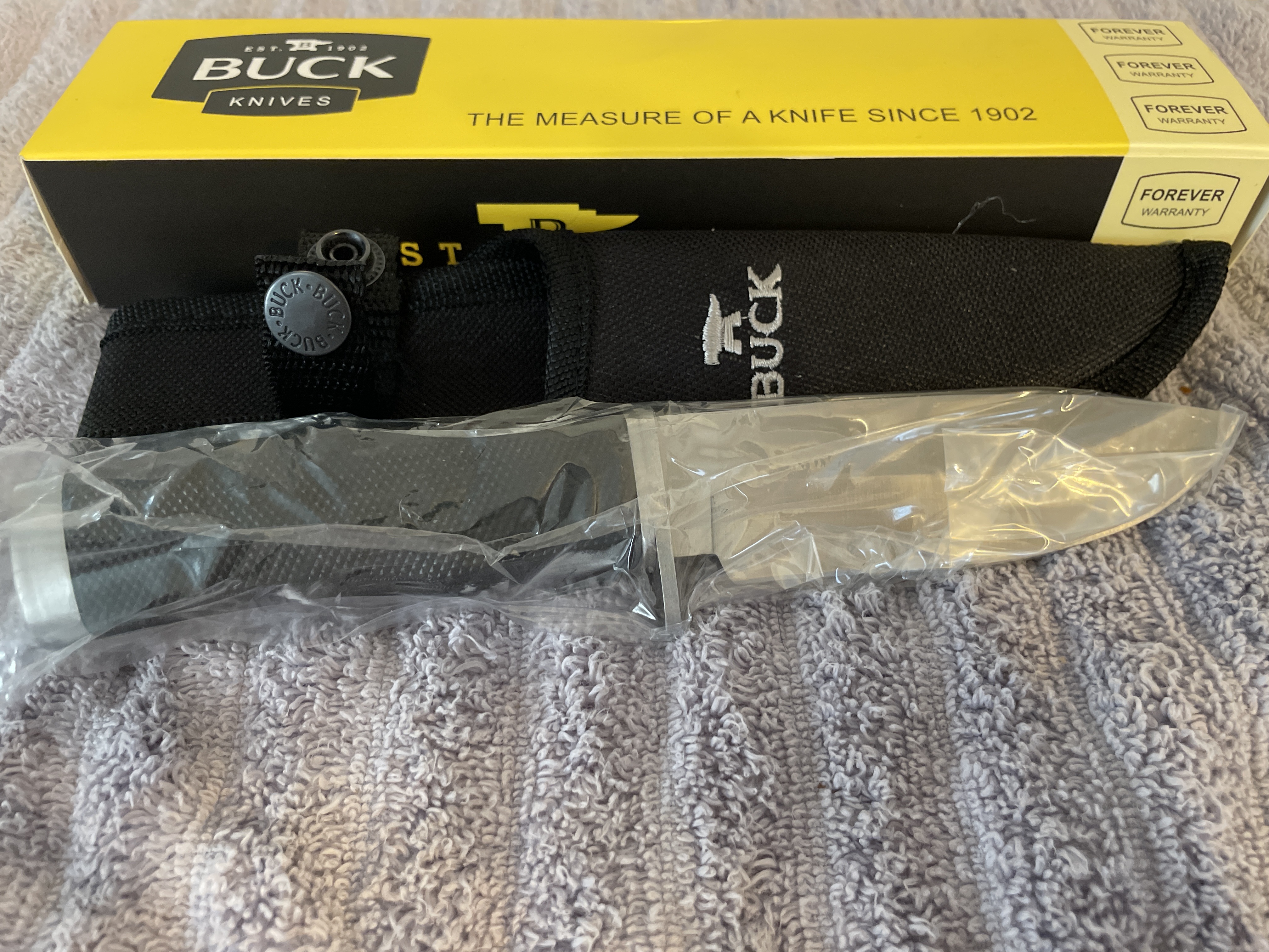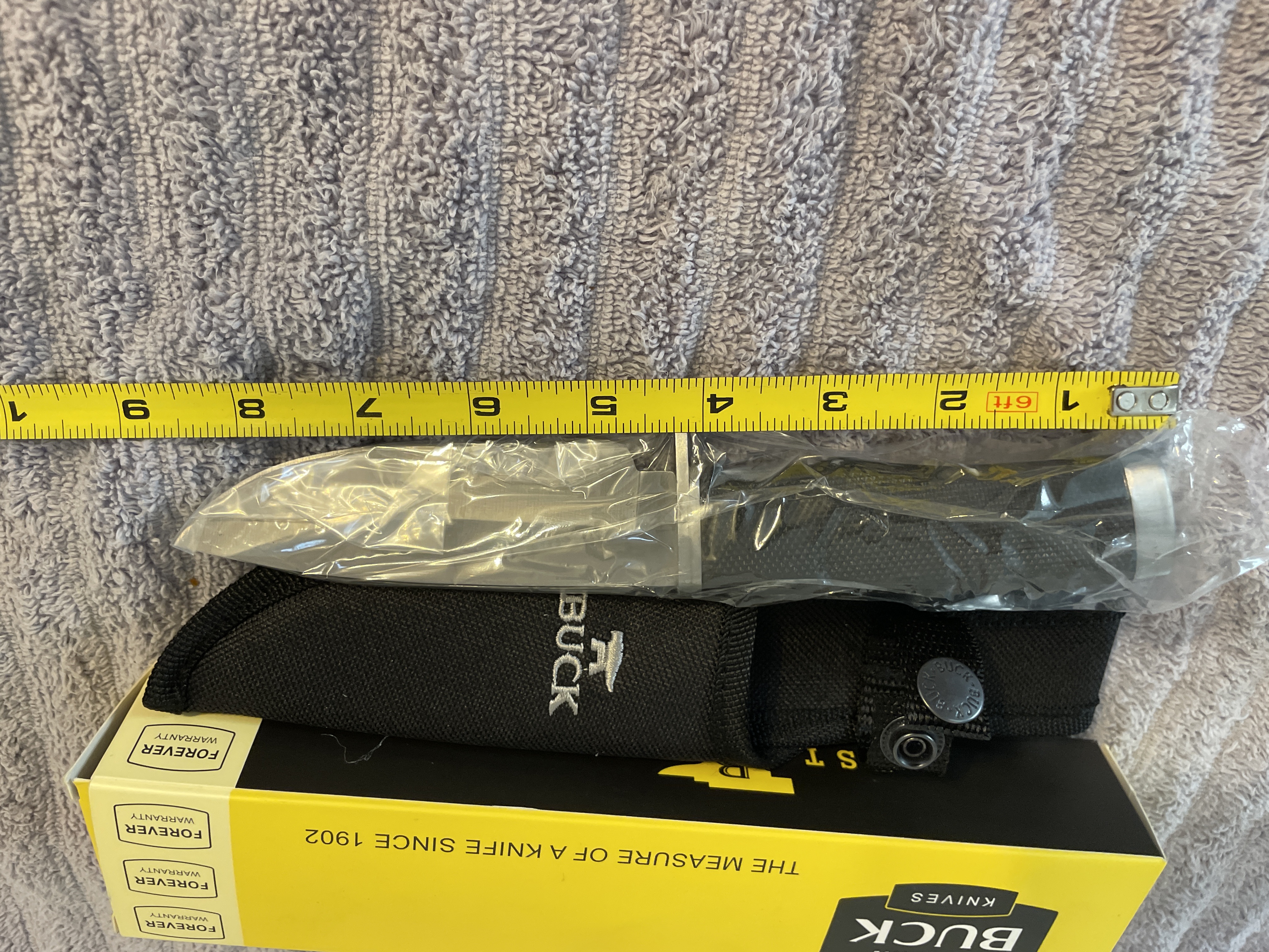 A silver and black Buck fixed-blade hunting knife in plastic wrap, measuring approximately 8.5 inches long, accompanied by a black fabric sheath and original box.