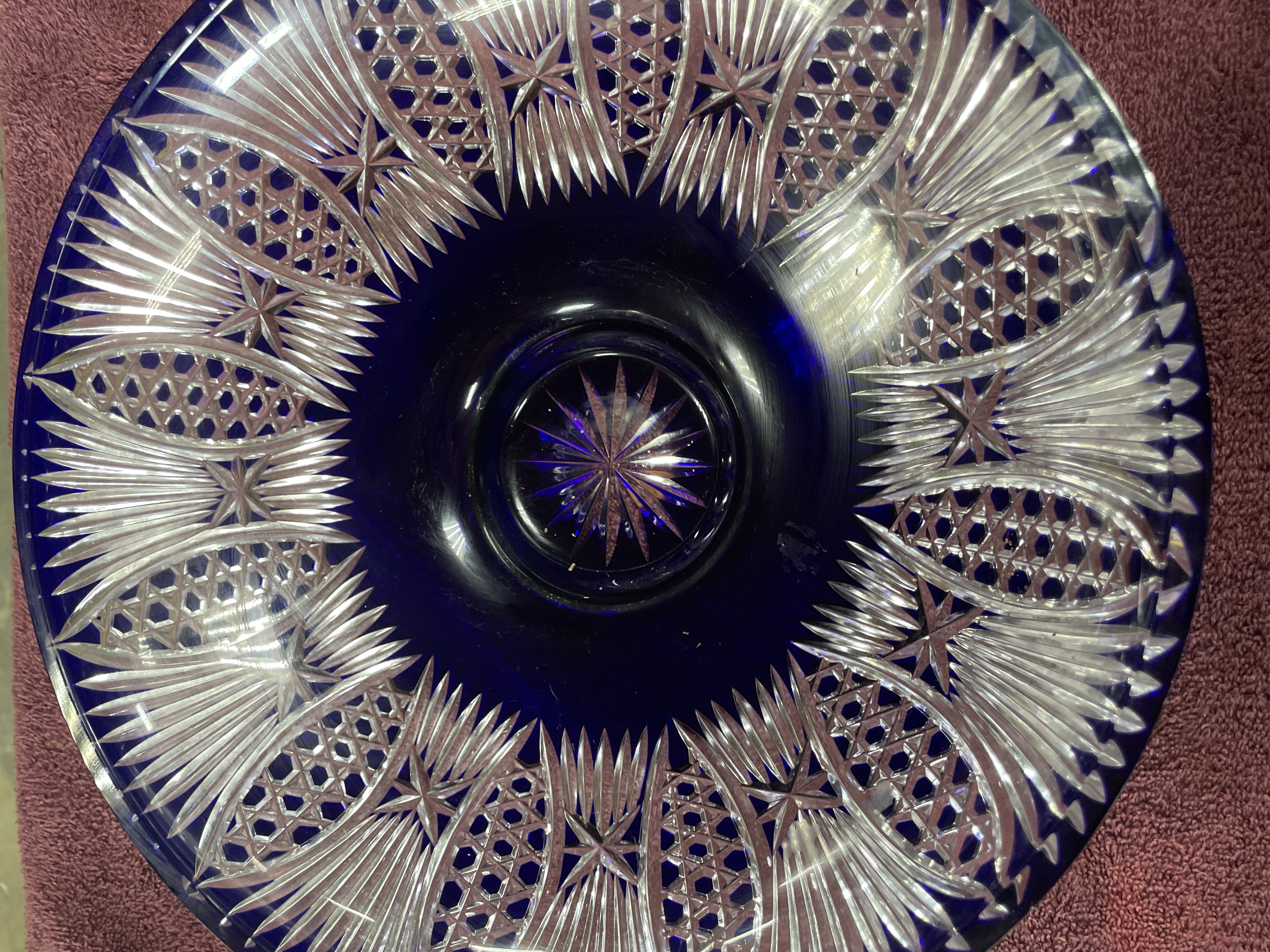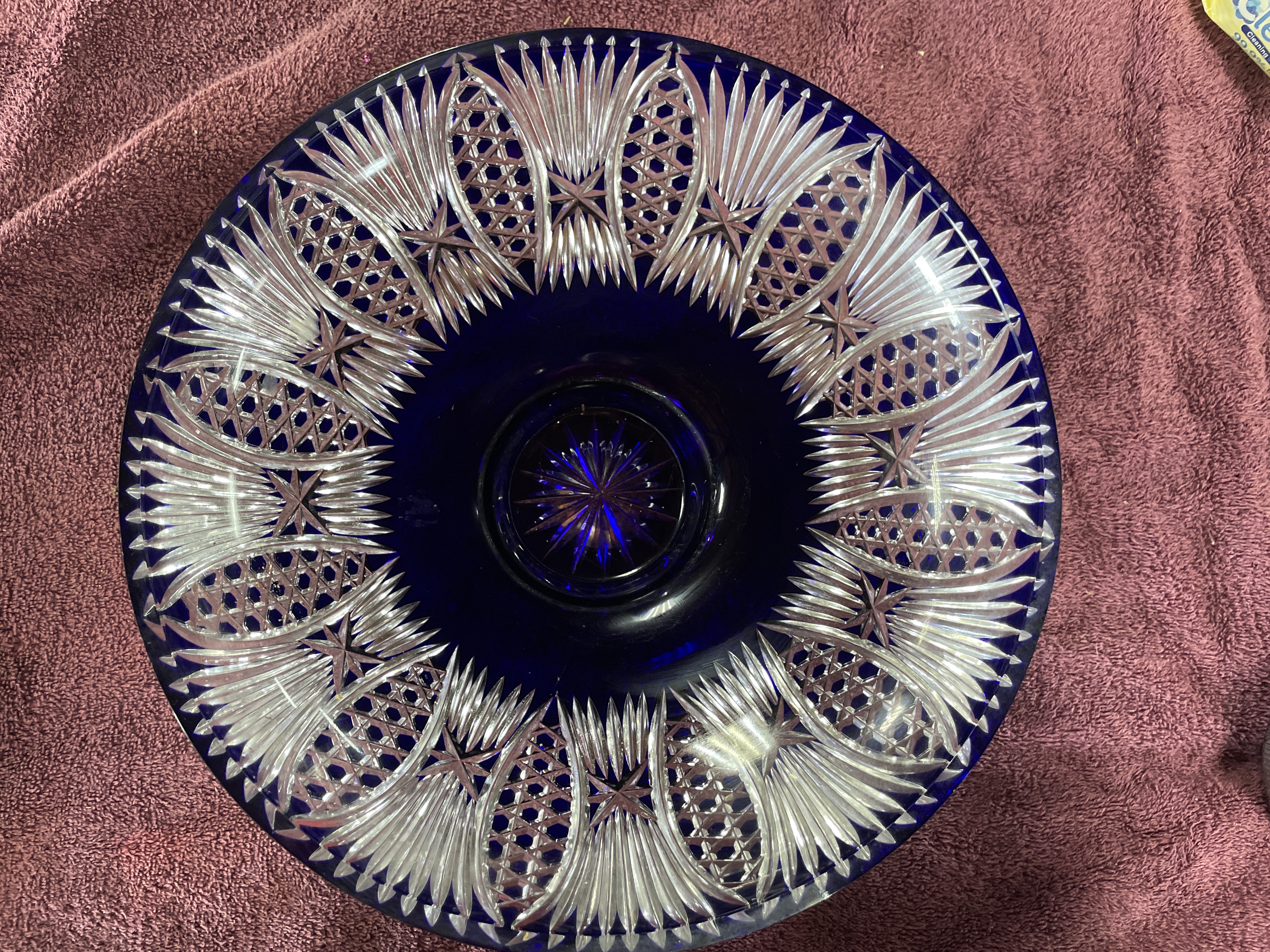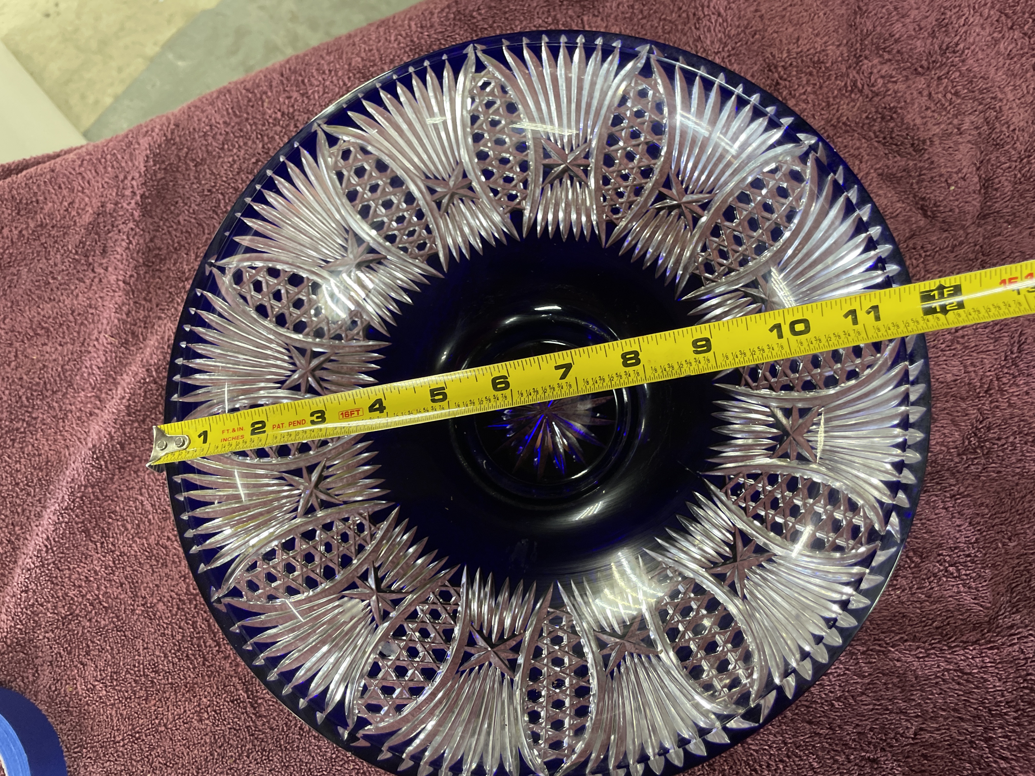 A large cobalt blue and clear cut-glass footed centerpiece bowl featuring intricate starburst and fan patterns, measuring approximately 12 inches in diameter and 4.5 inches in height.