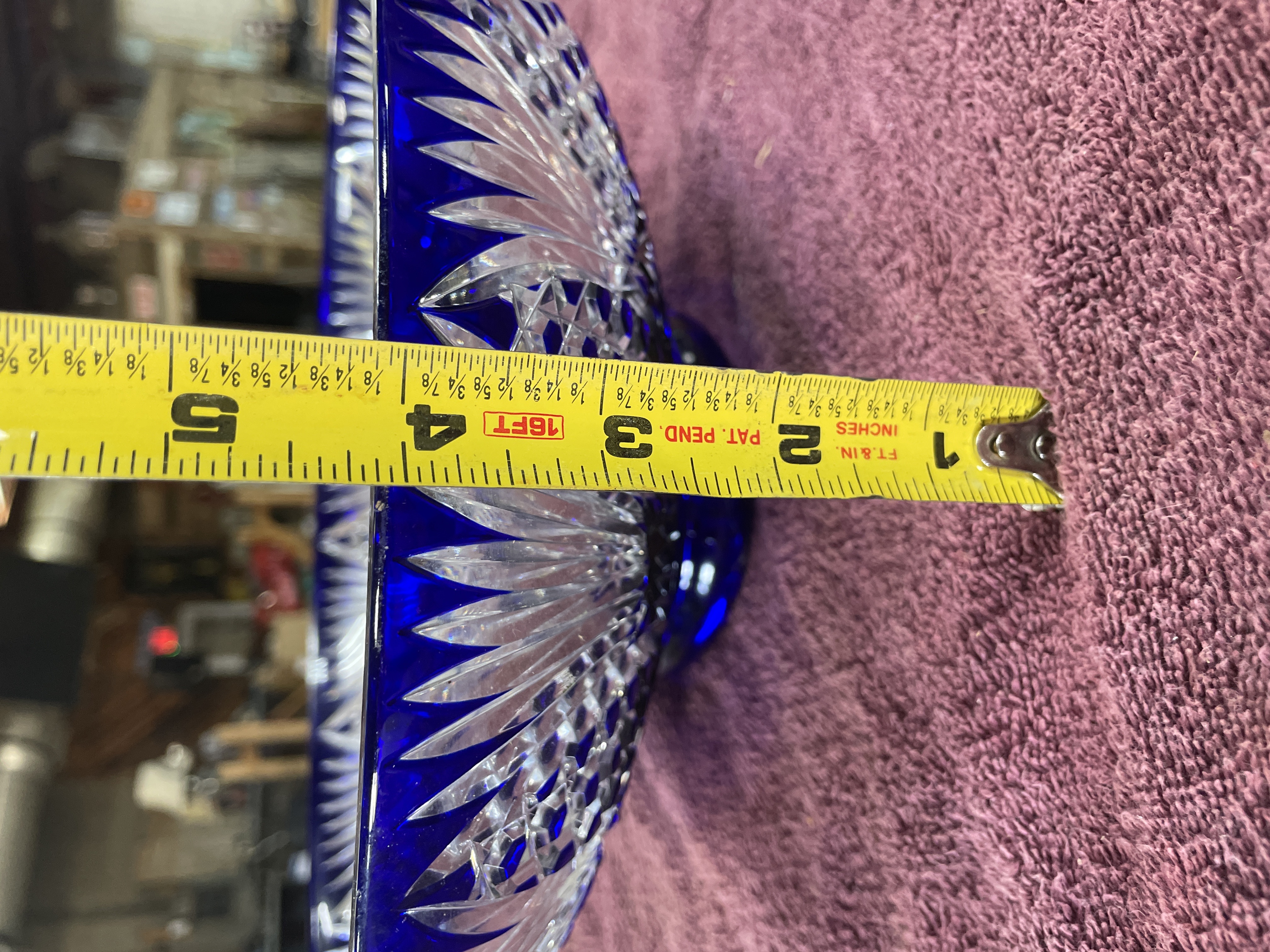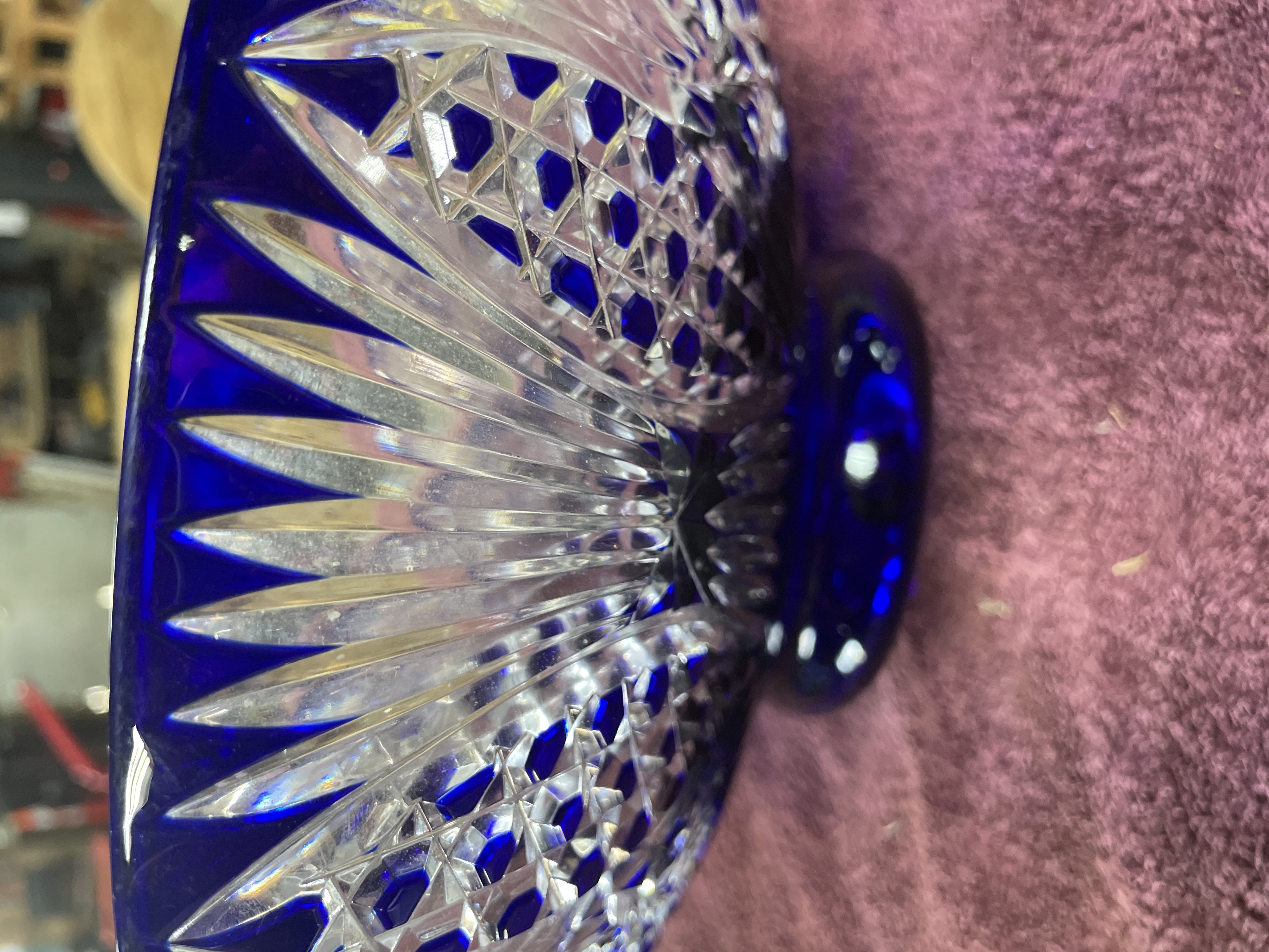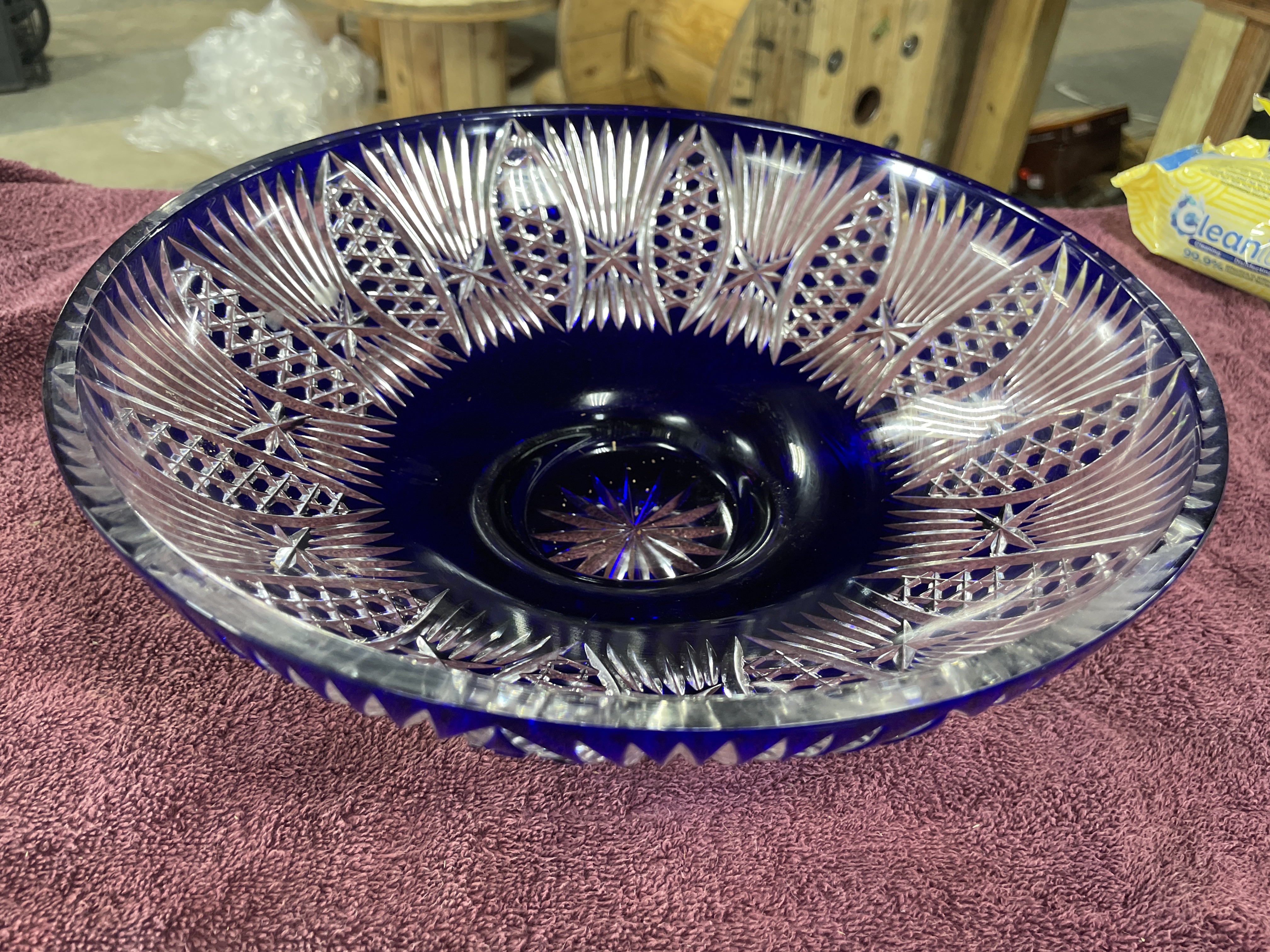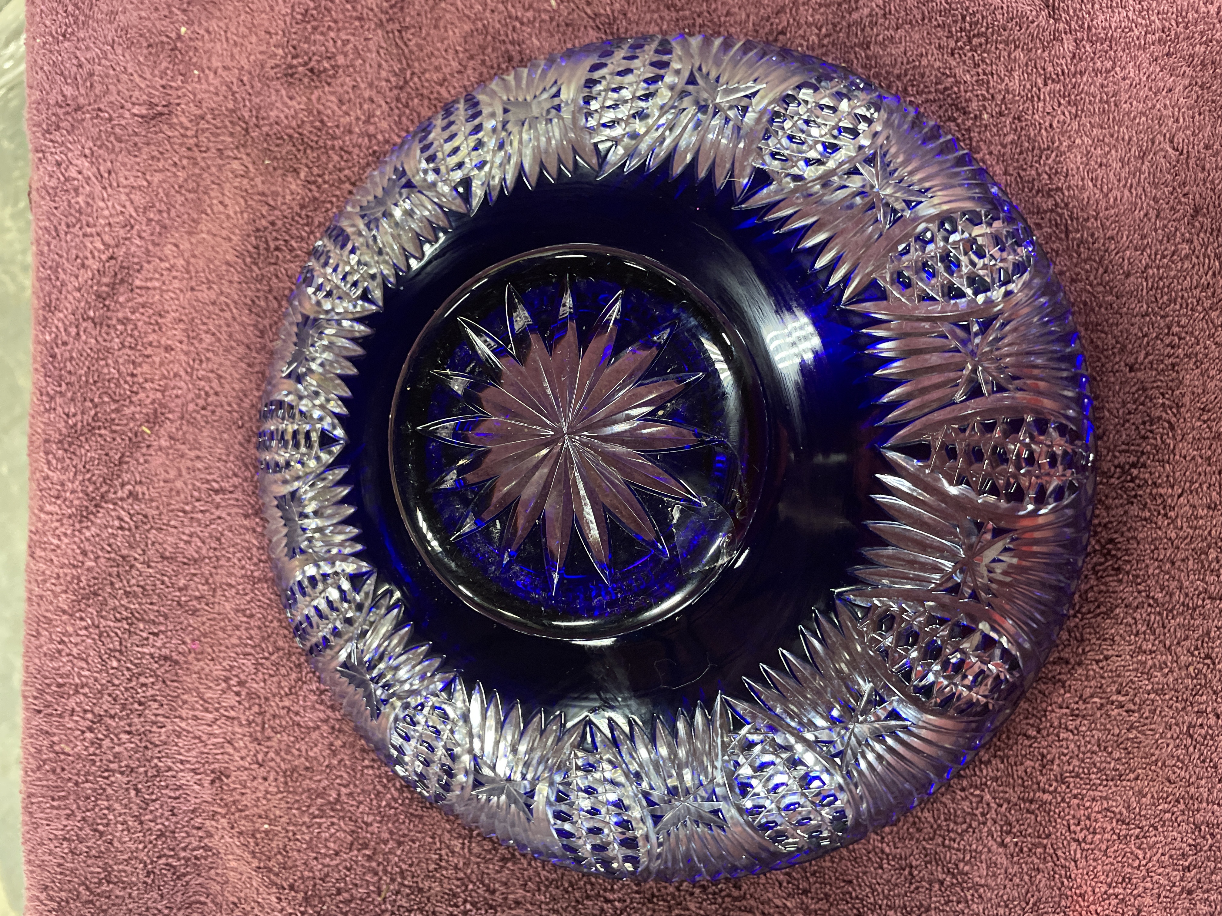 A large cobalt blue and clear cut-glass footed centerpiece bowl featuring intricate starburst and fan patterns, measuring approximately 12 inches in diameter and 4.5 inches in height.