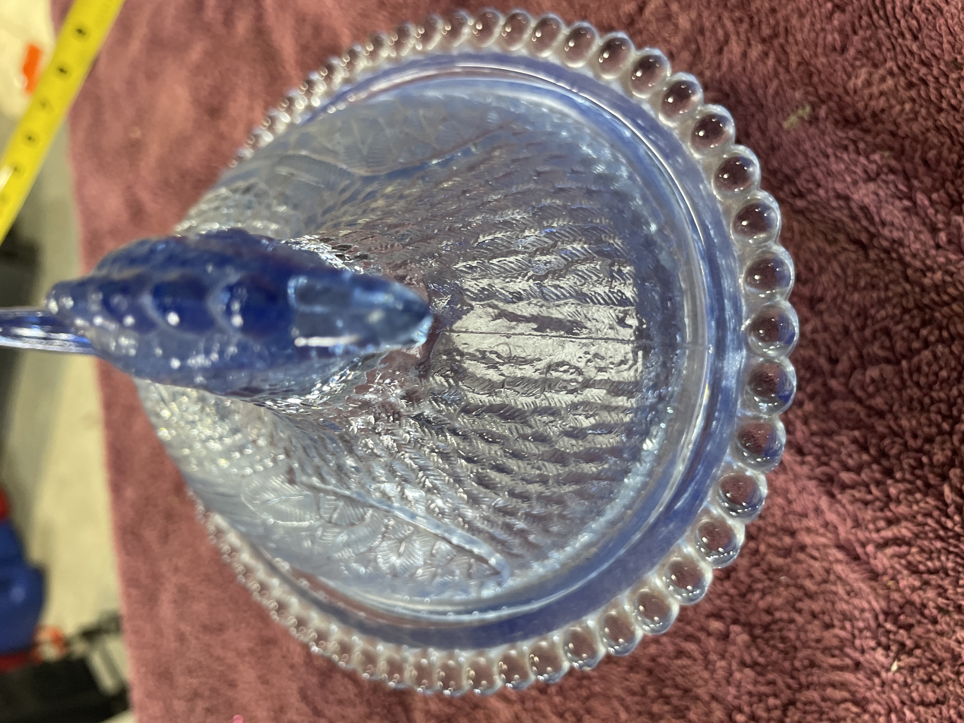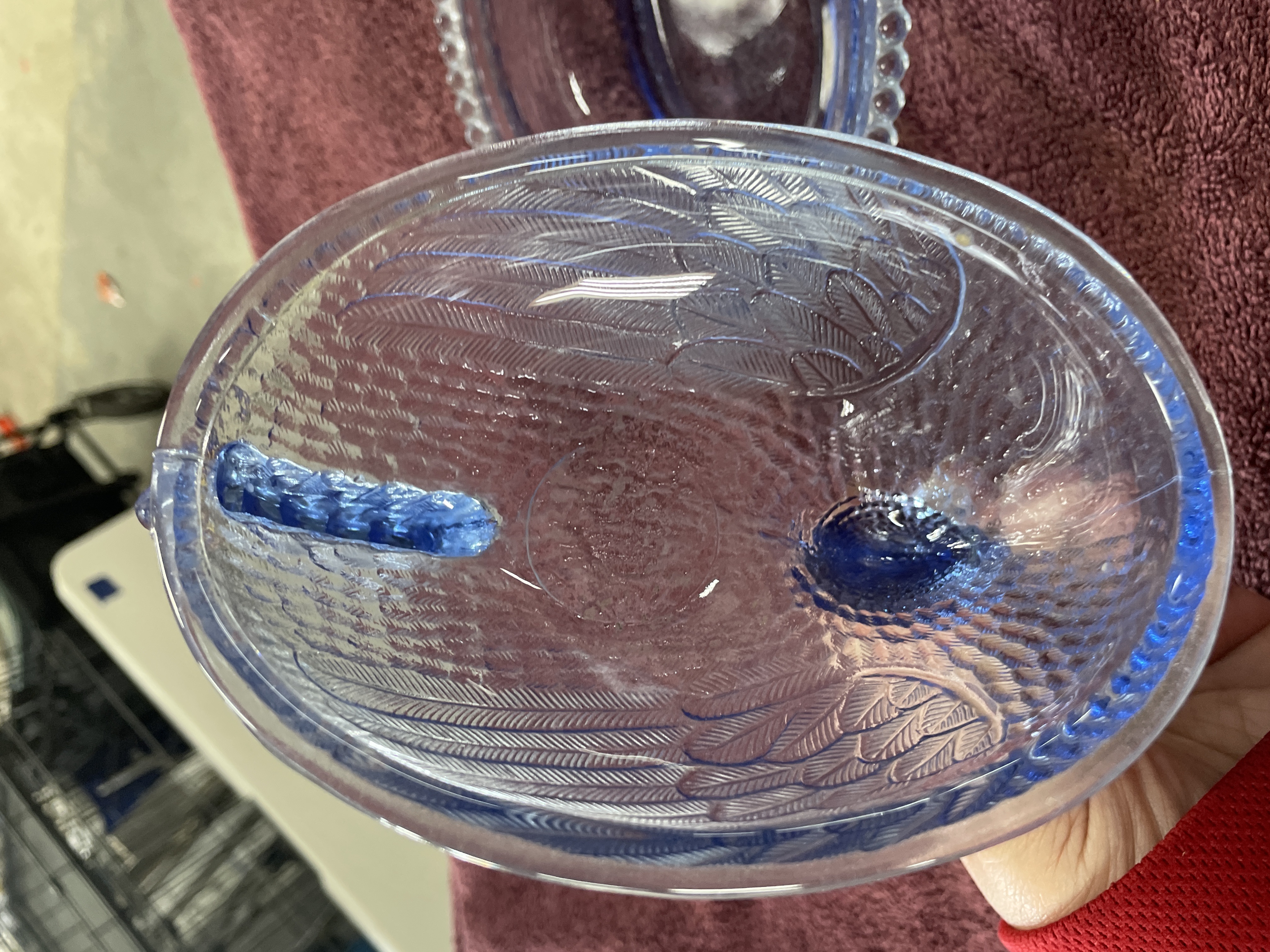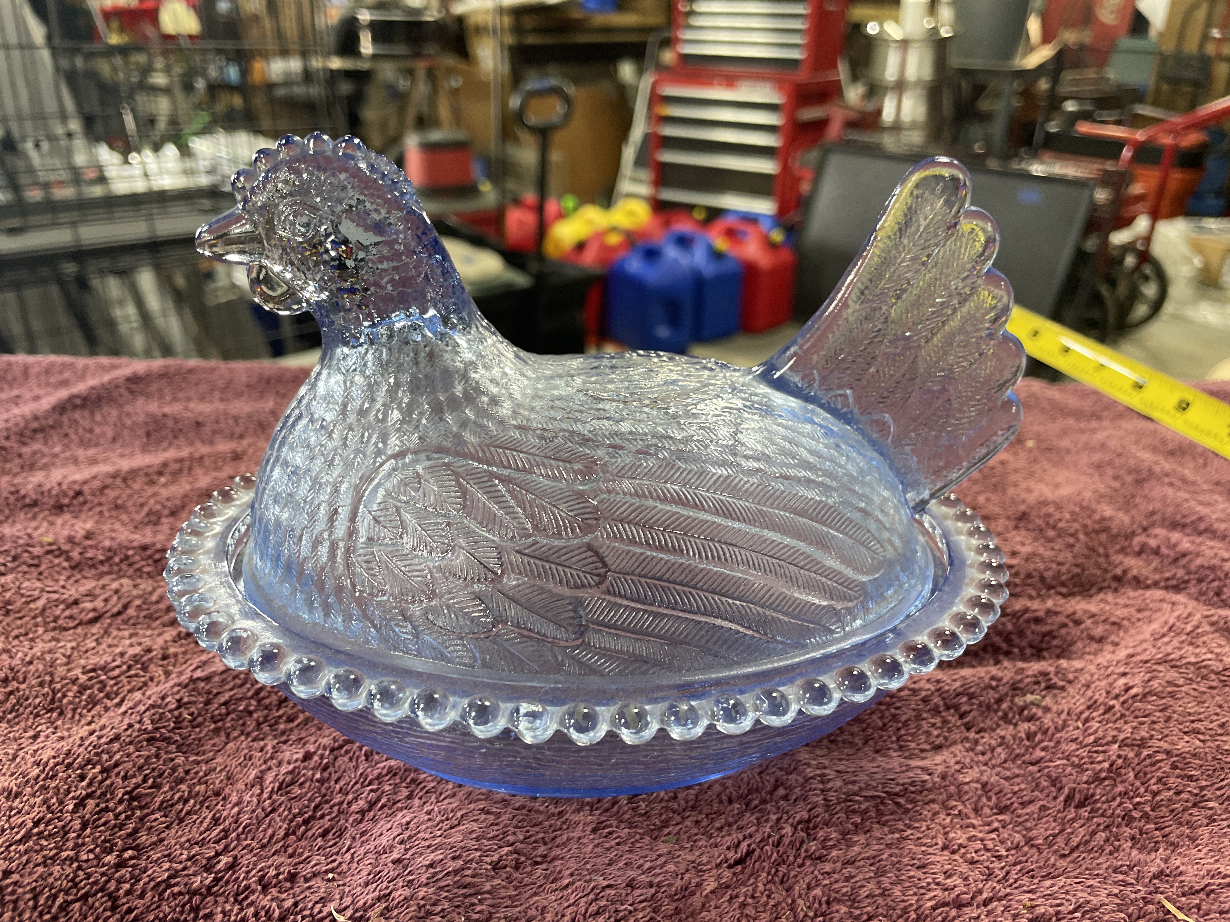 A two-piece light blue pressed glass hen on a nest covered dish featuring an IG maker mark for Imperial Glass on the lid underside and measuring approximately 7 inches in length.
