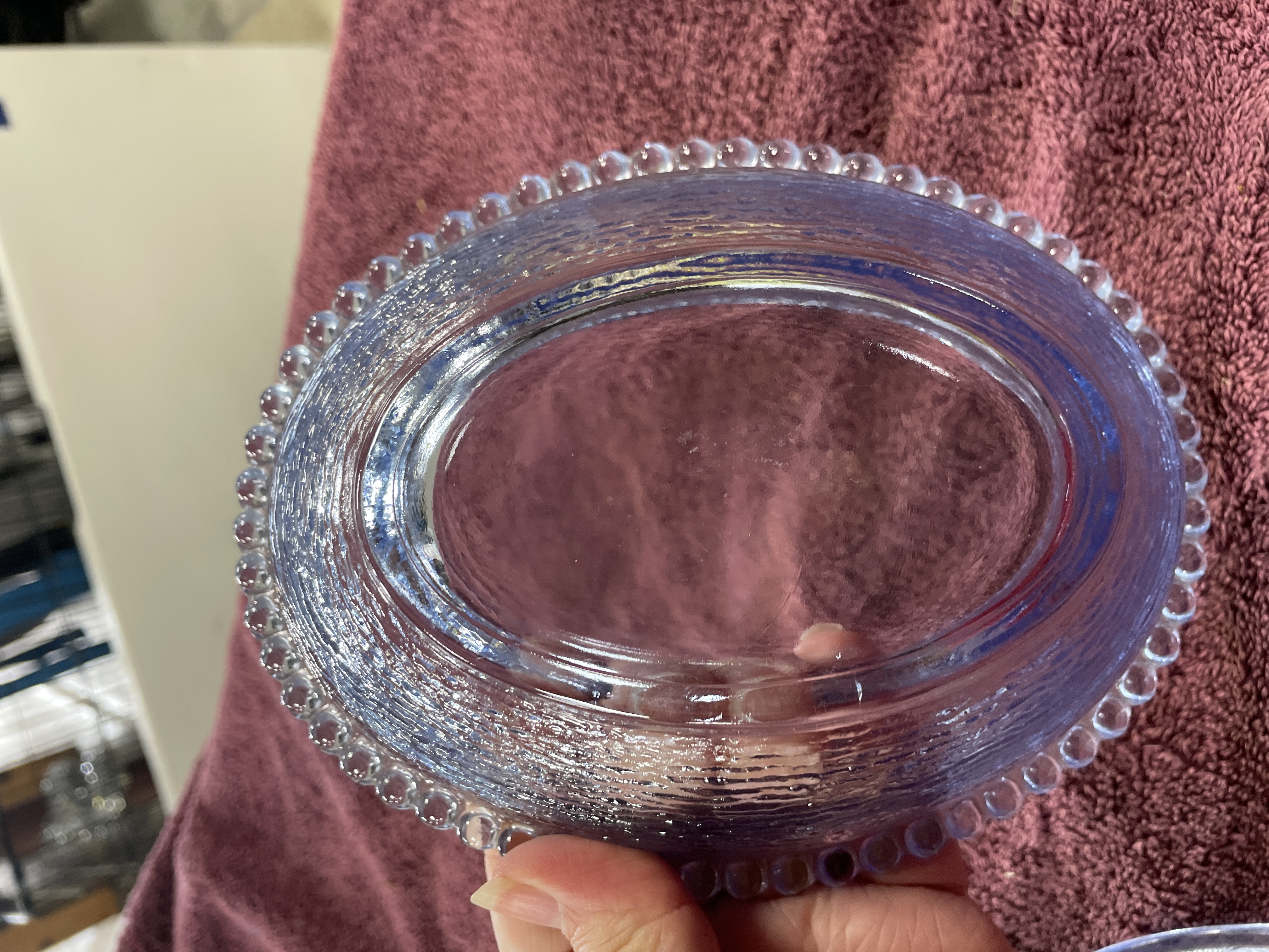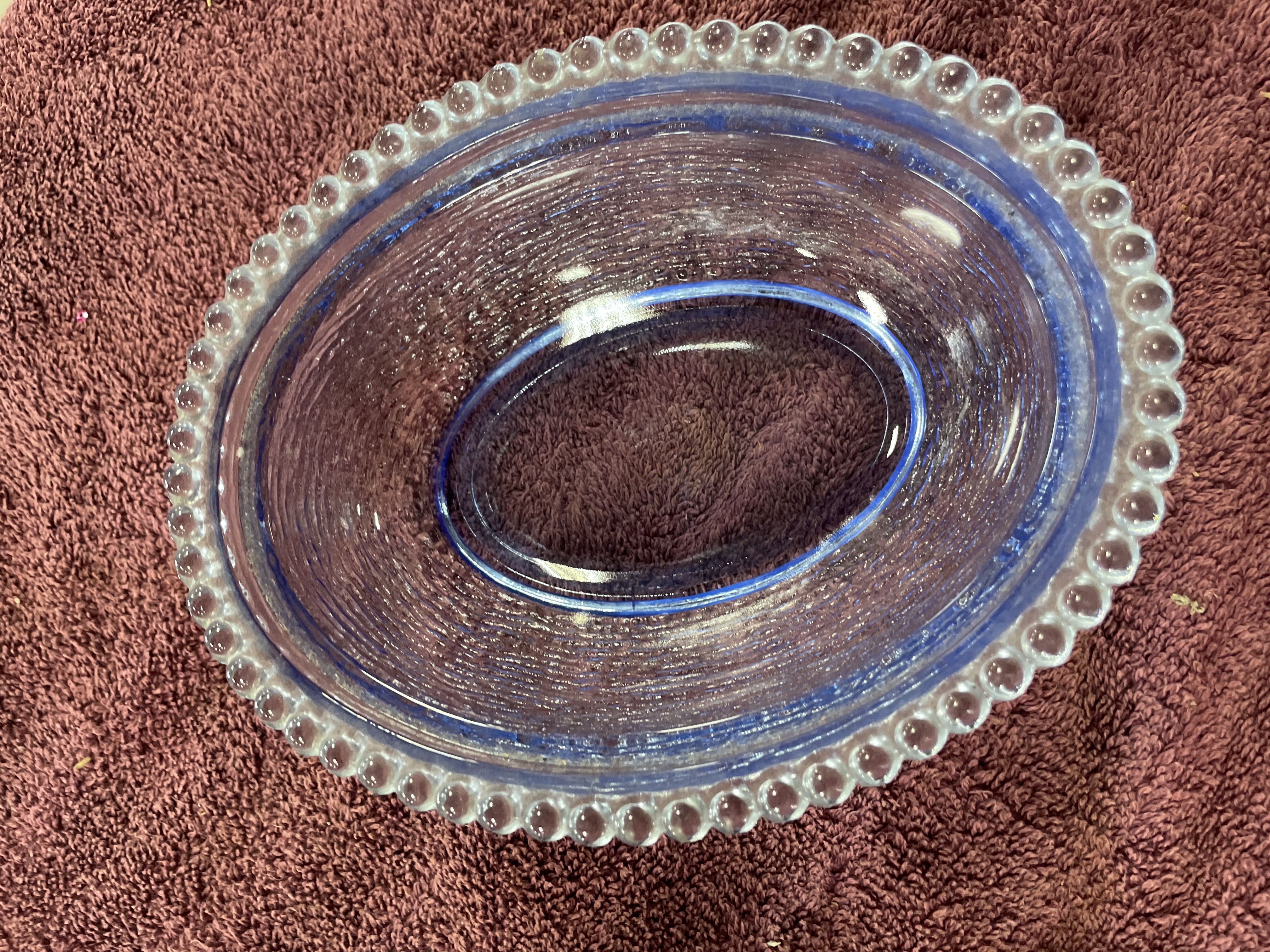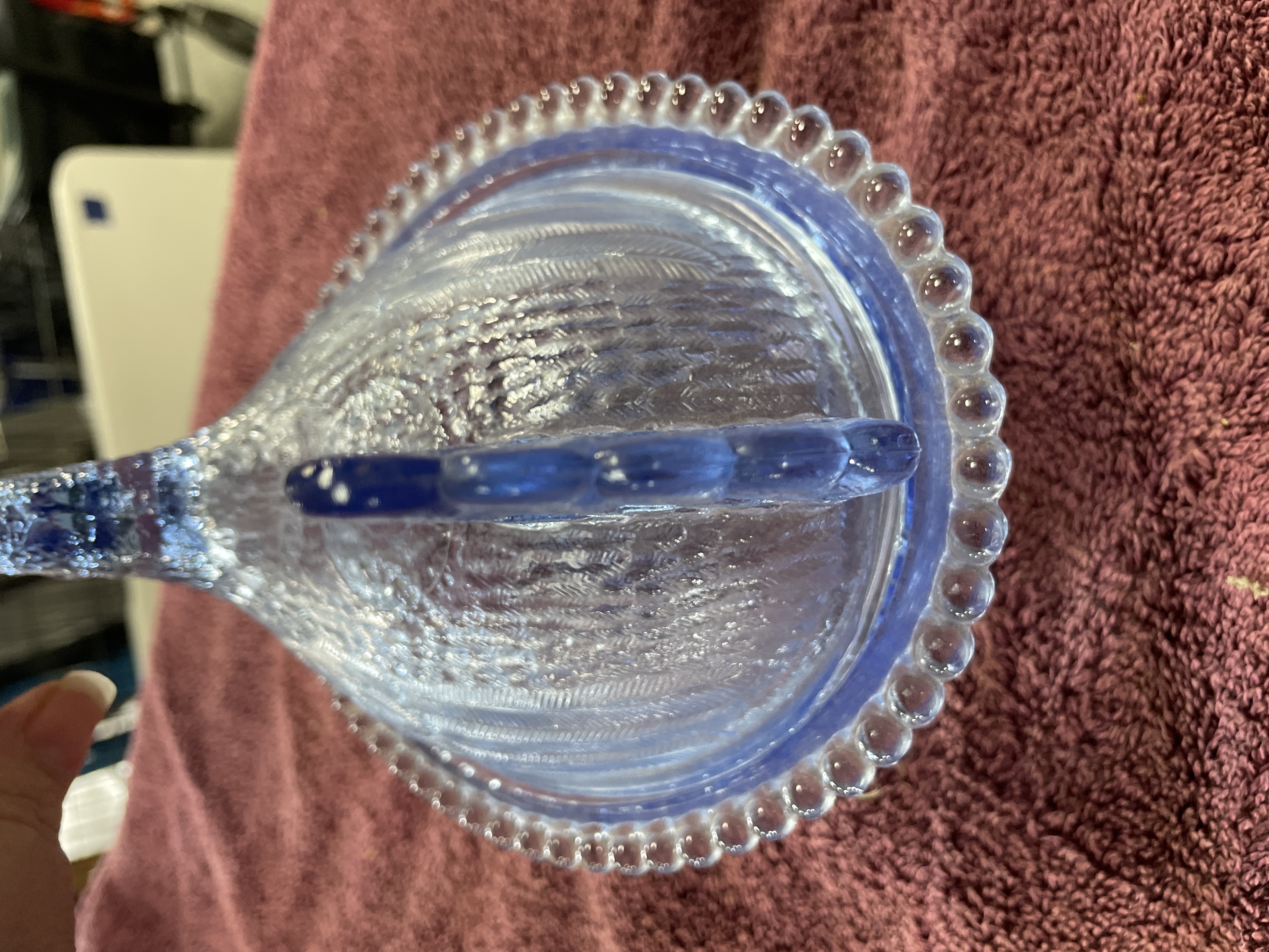 A two-piece light blue pressed glass hen on a nest covered dish featuring an IG maker mark for Imperial Glass on the lid underside and measuring approximately 7 inches in length.