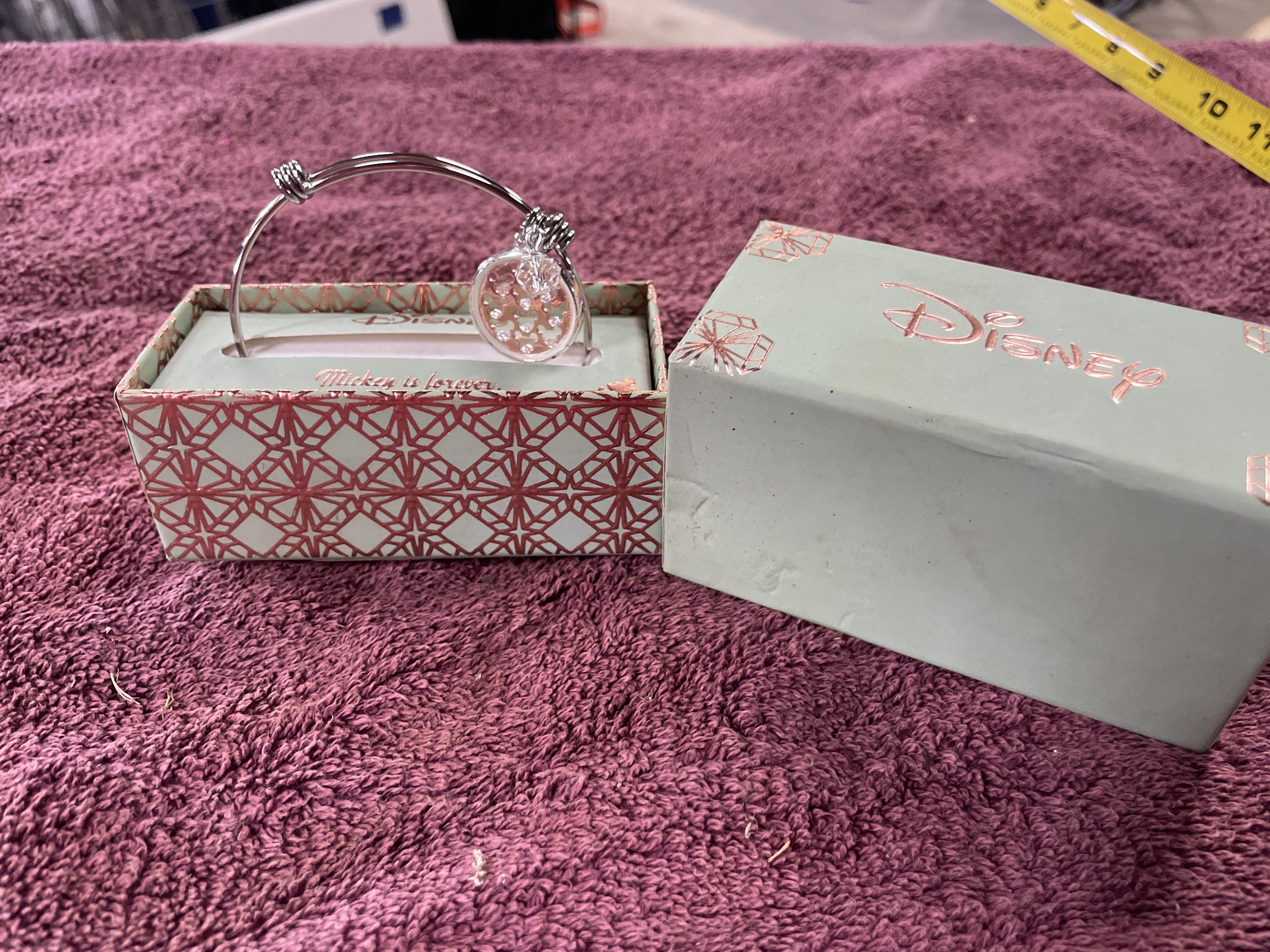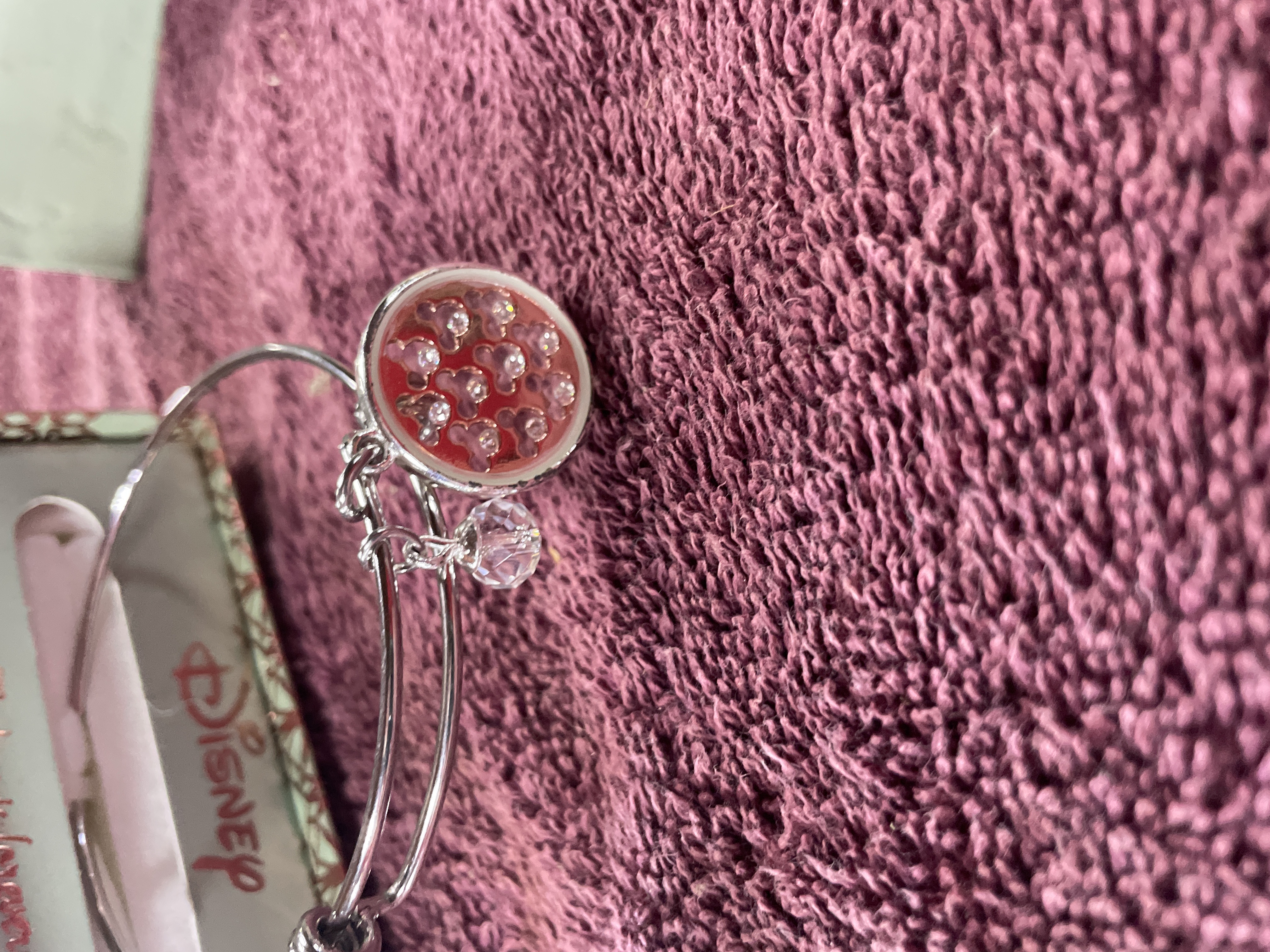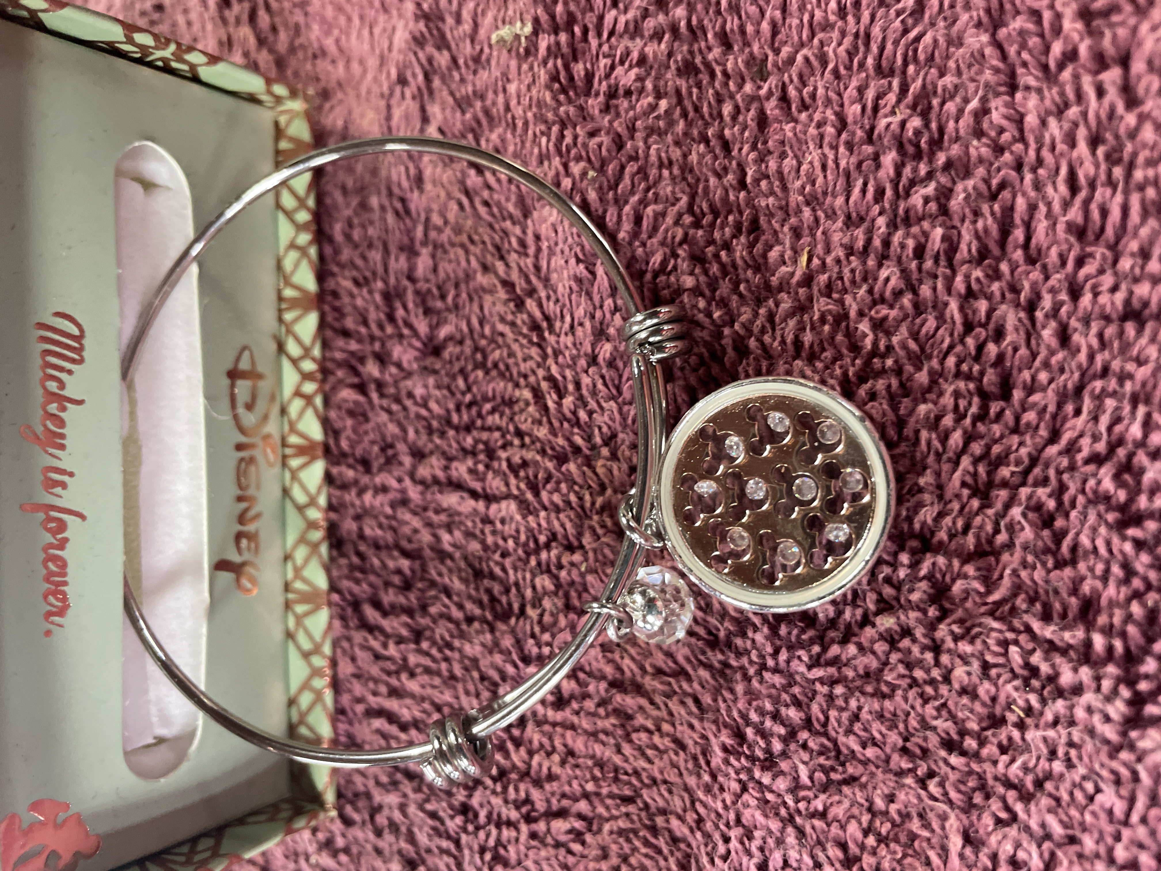 A silver-toned adjustable bangle bracelet featuring a rose-gold-toned circular charm with crystal-accented Mickey Mouse silhouettes and a faceted crystal drop, accompanied by its original Disney branded box.
