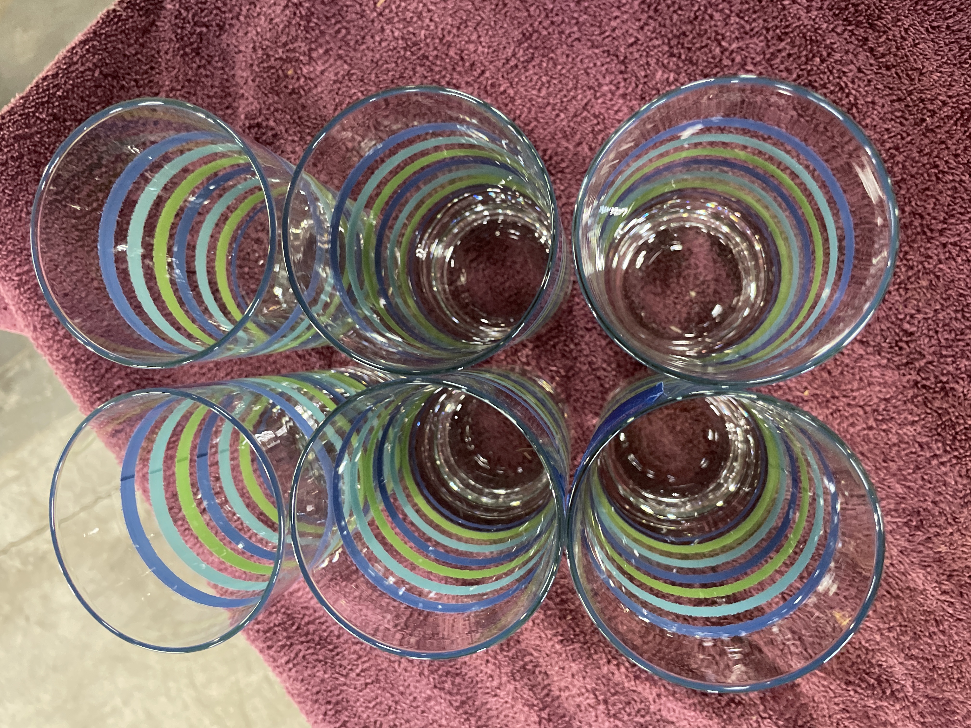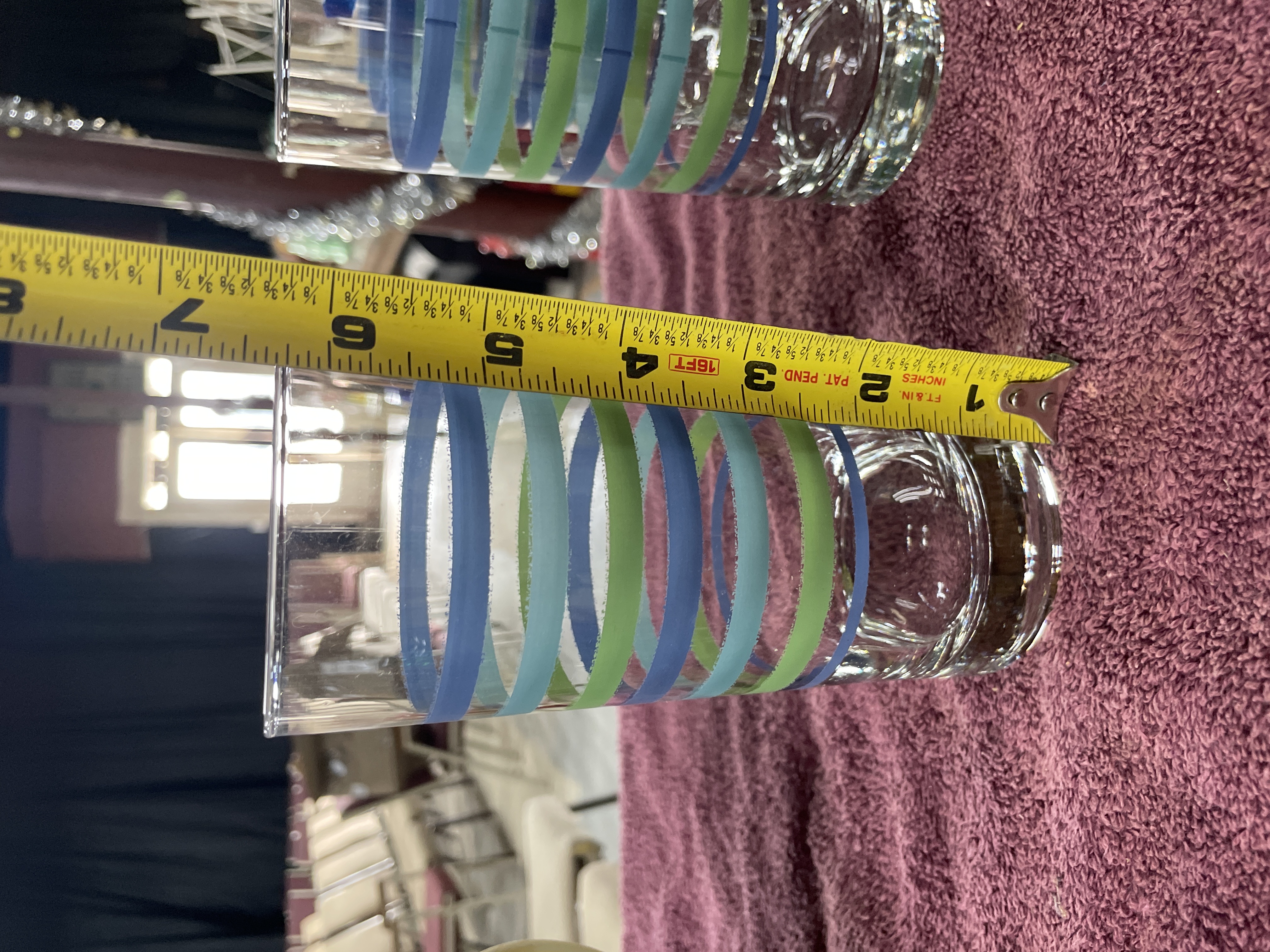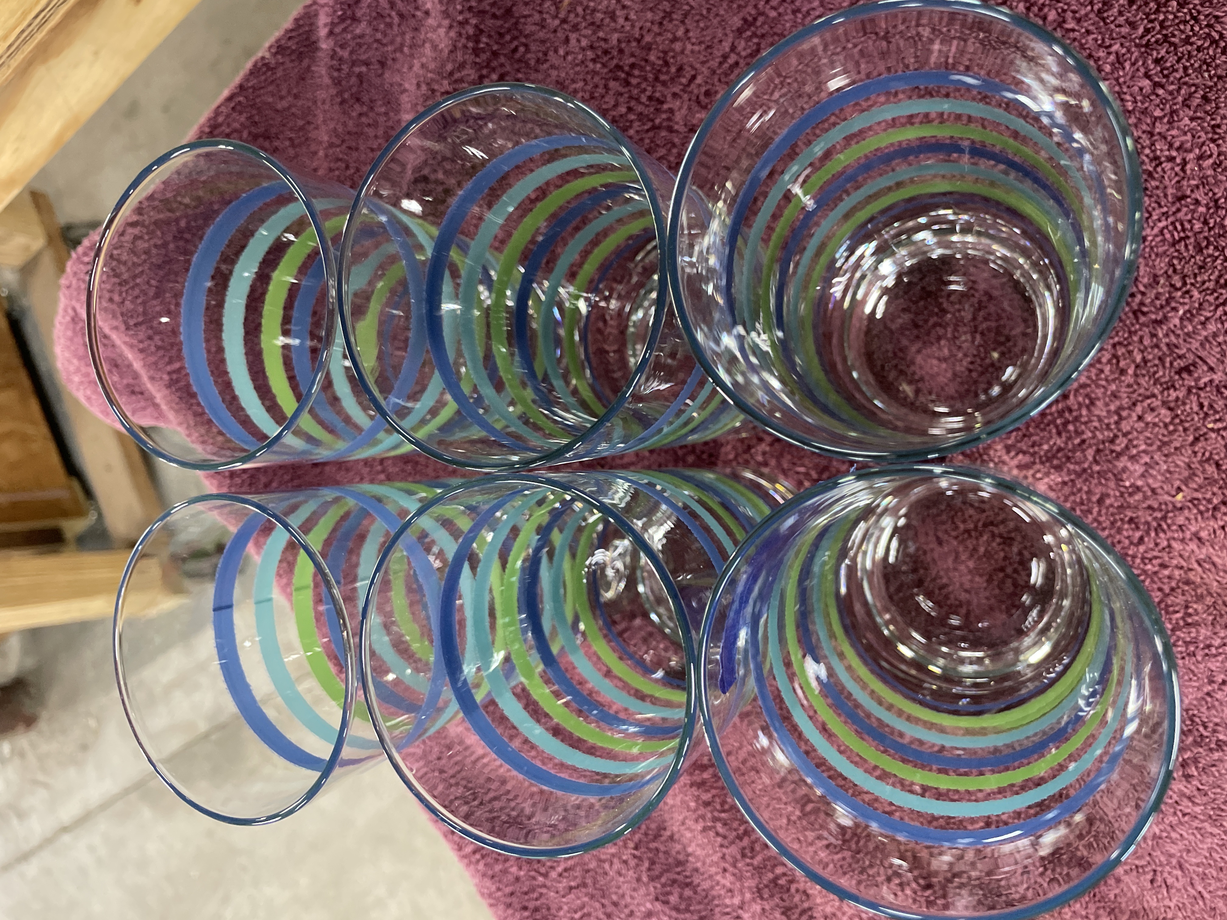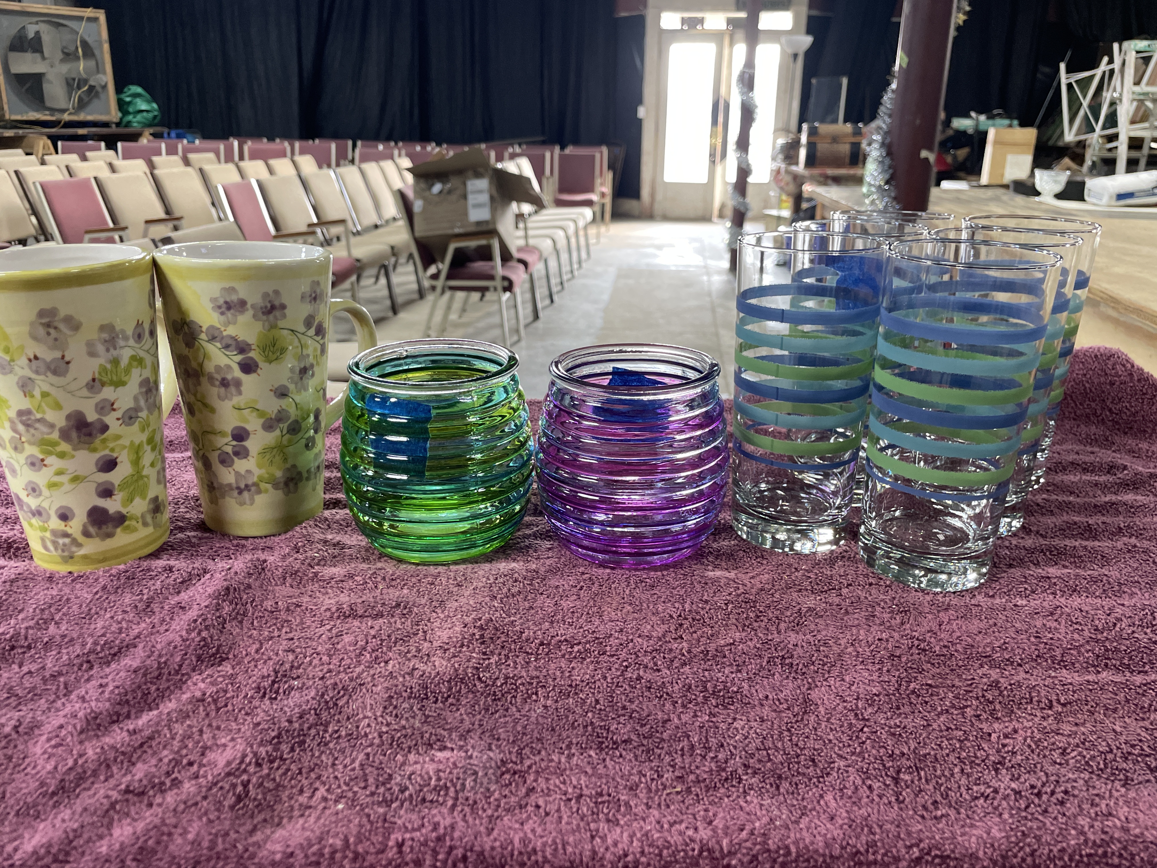 A collection of glassware and ceramic items including several striped drinking glasses measuring 6 inches tall, two floral patterned mugs measuring 5.5 inches tall, and two beehive-style glass jars measuring 4 inches tall.