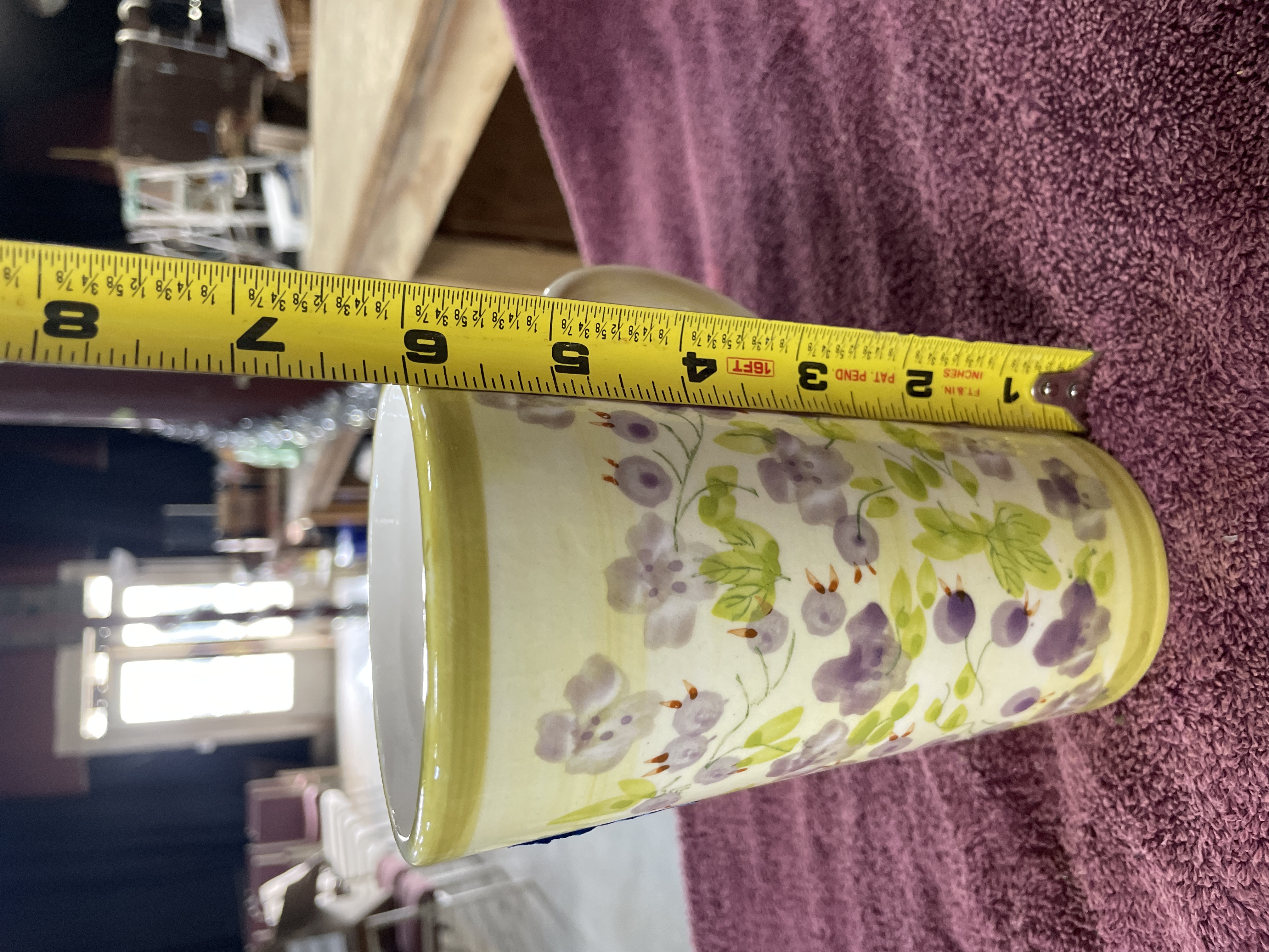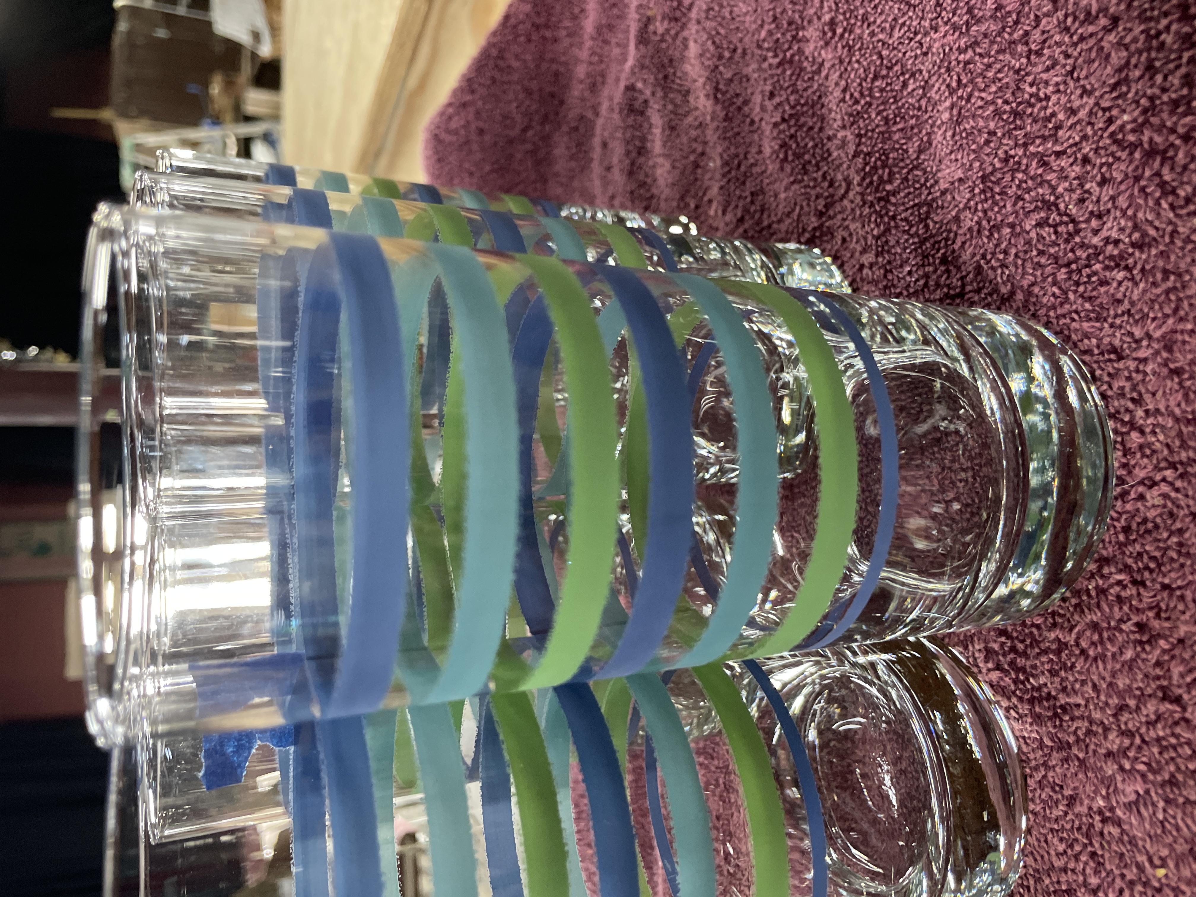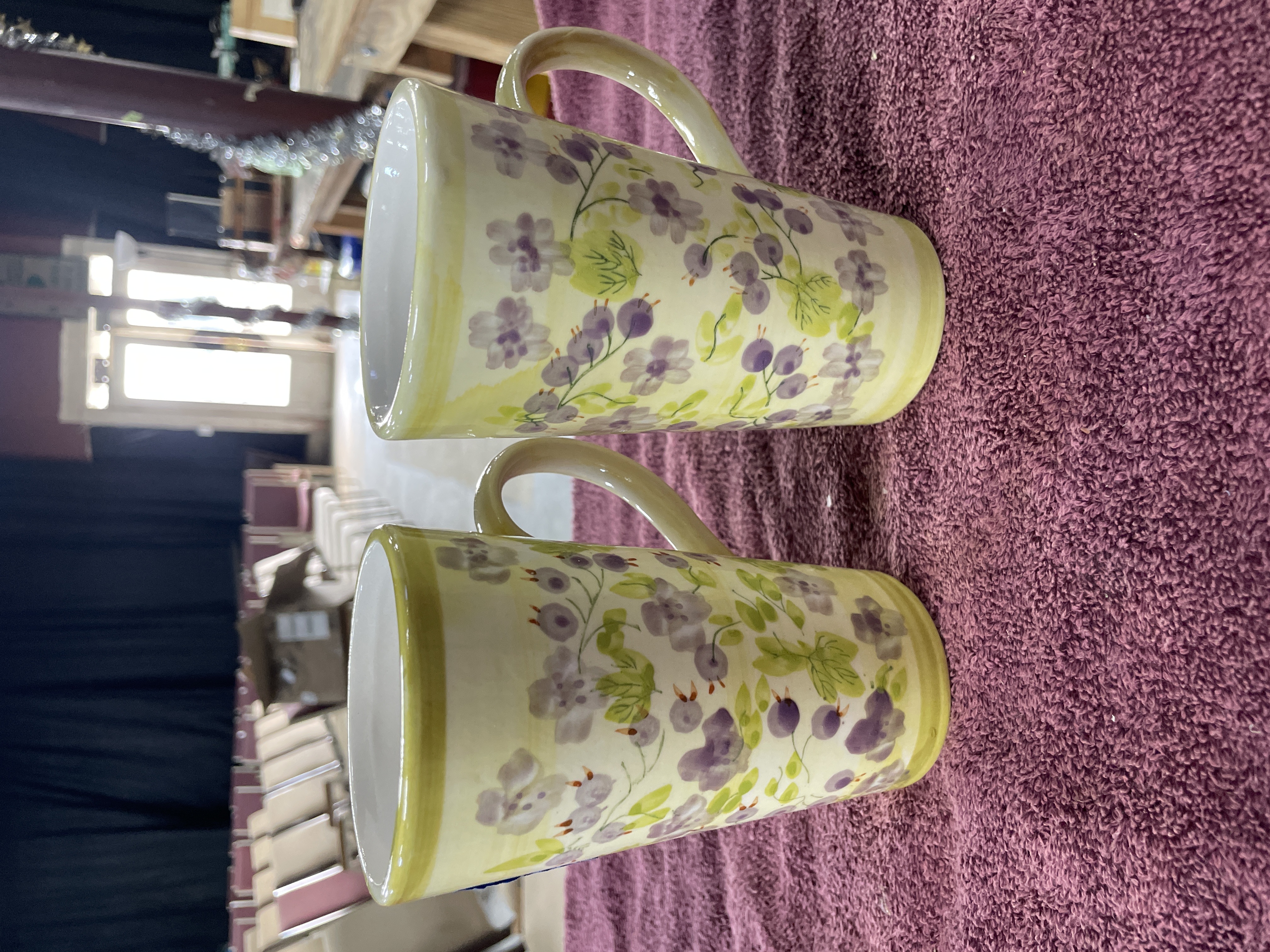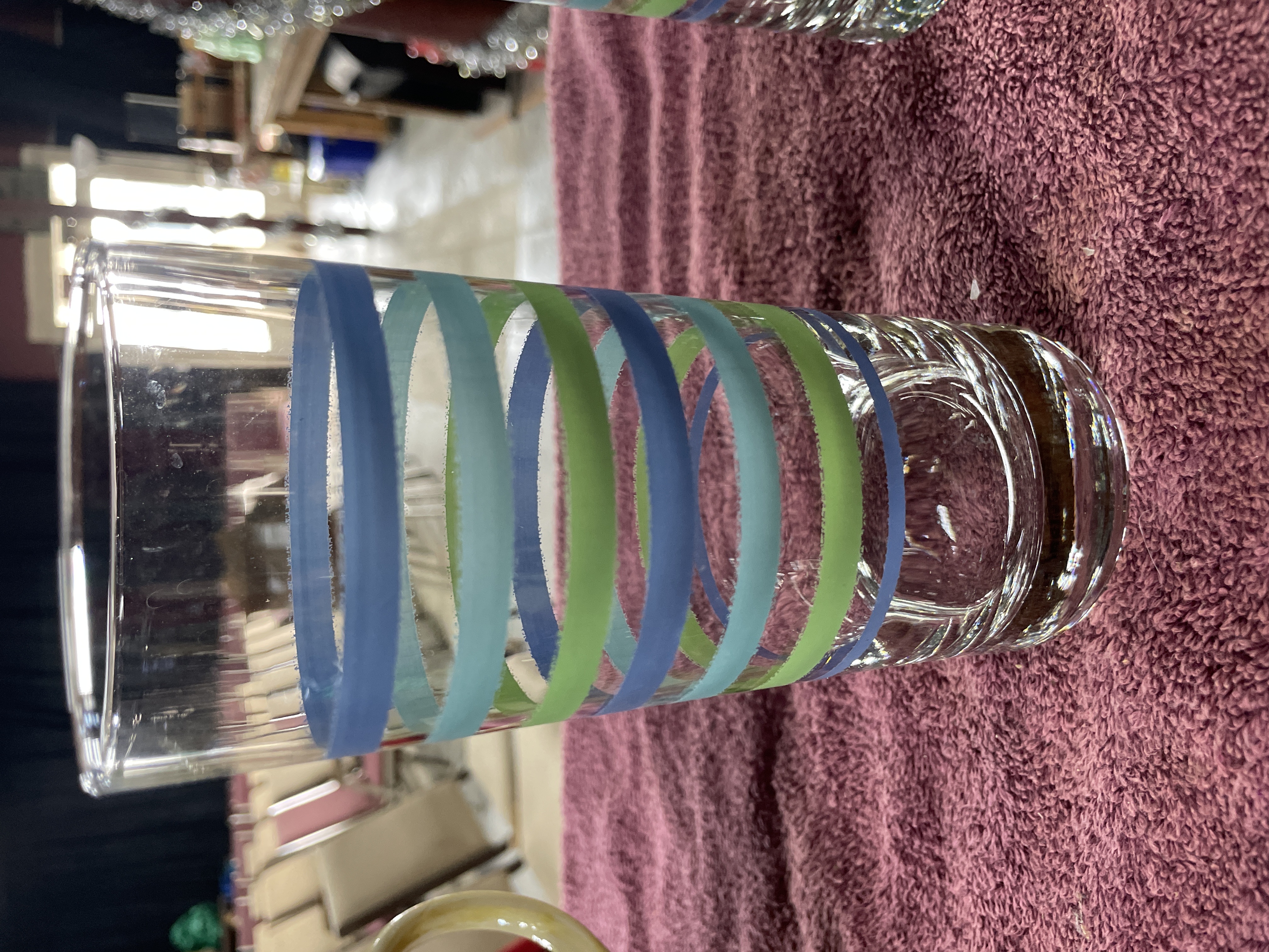 A collection of glassware and ceramic items including several striped drinking glasses measuring 6 inches tall, two floral patterned mugs measuring 5.5 inches tall, and two beehive-style glass jars measuring 4 inches tall.