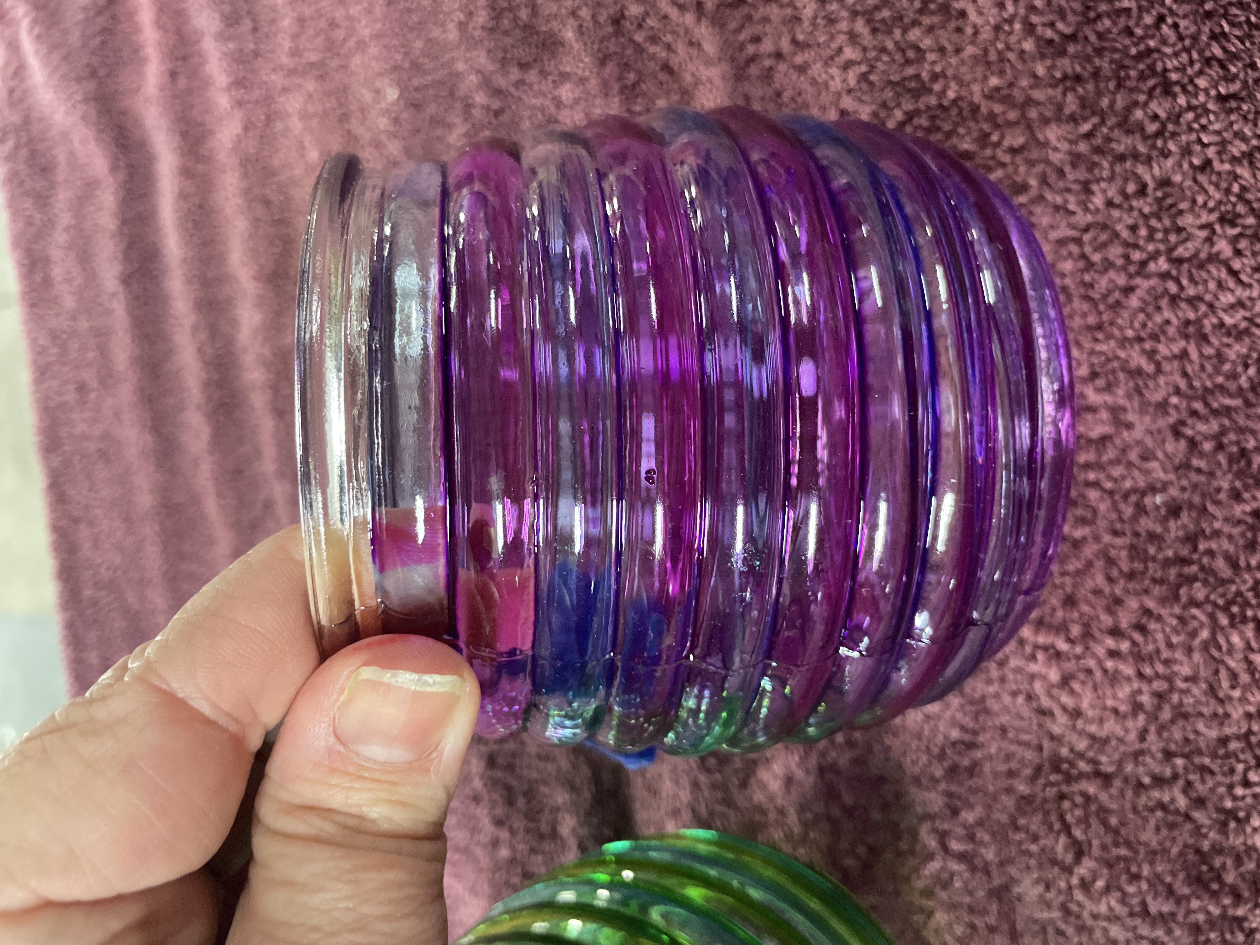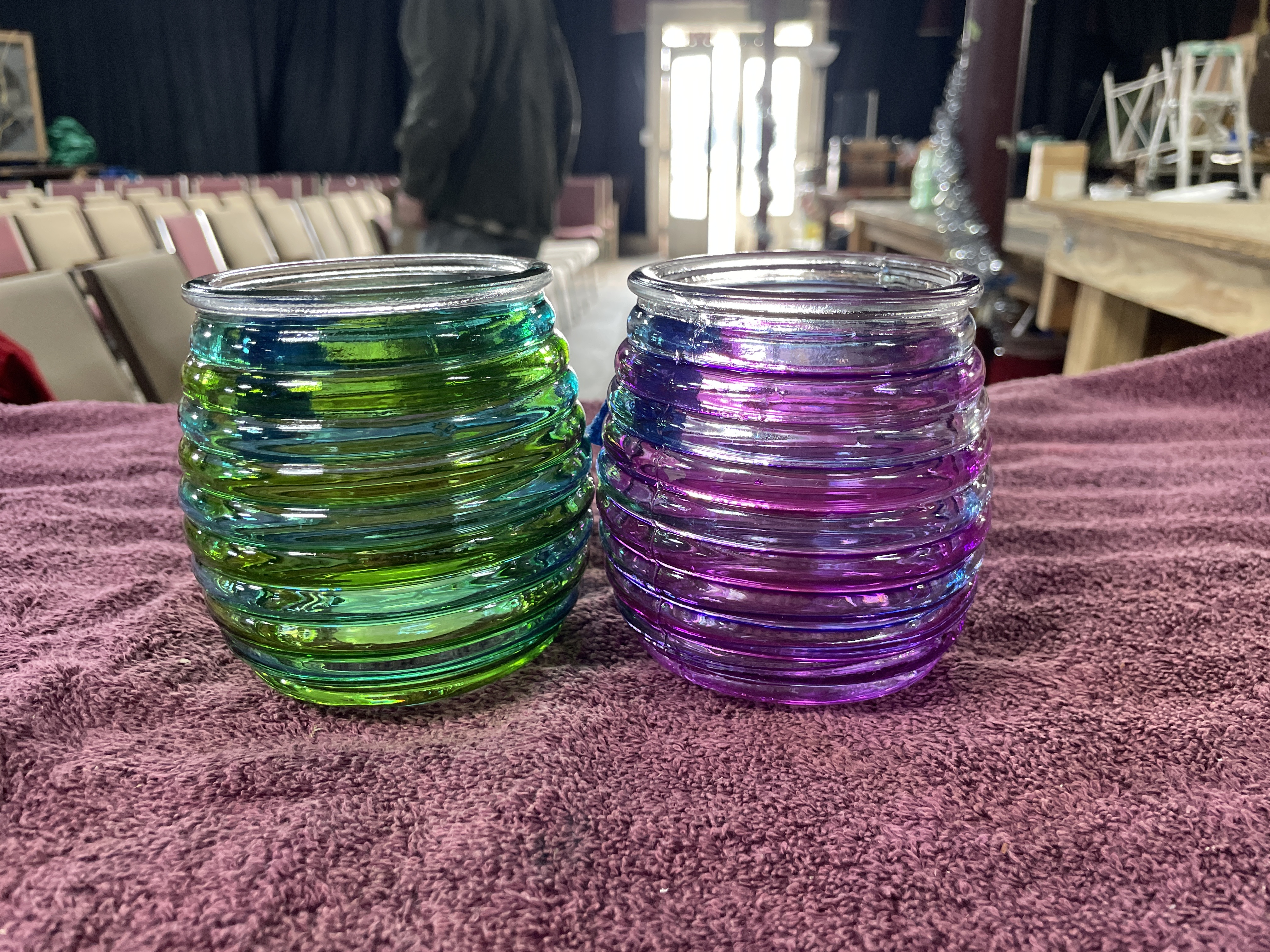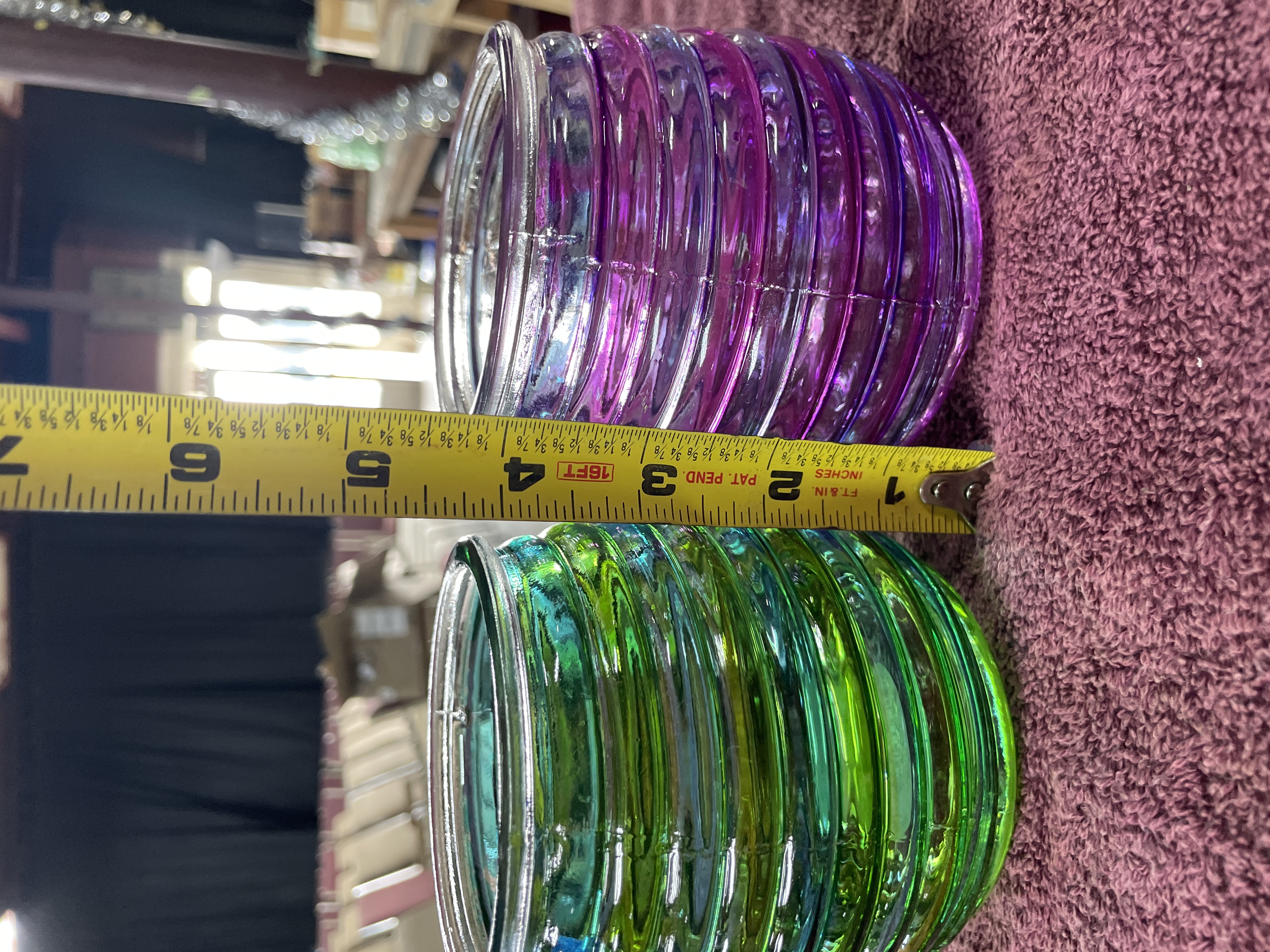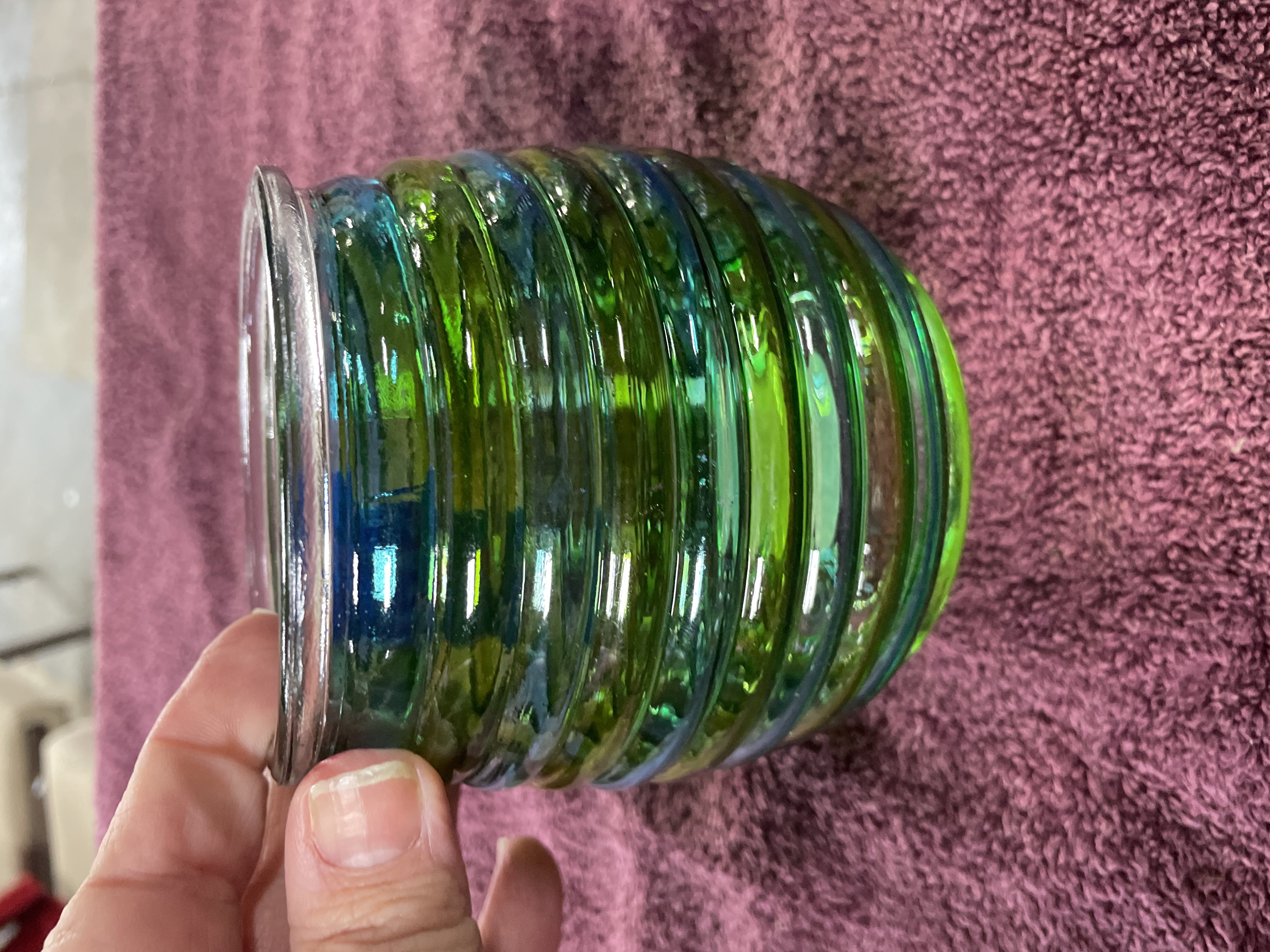A collection of glassware and ceramic items including several striped drinking glasses measuring 6 inches tall, two floral patterned mugs measuring 5.5 inches tall, and two beehive-style glass jars measuring 4 inches tall.