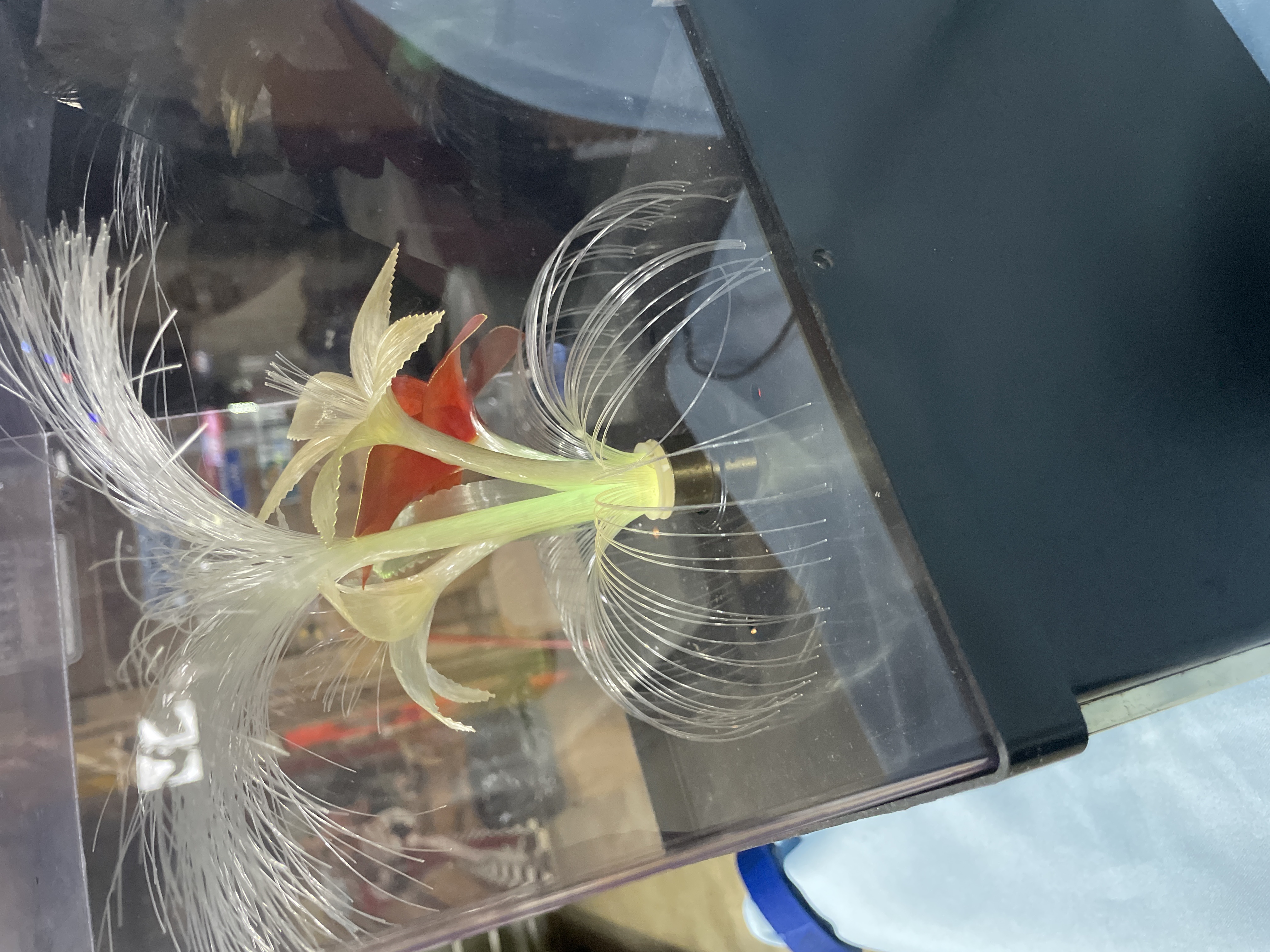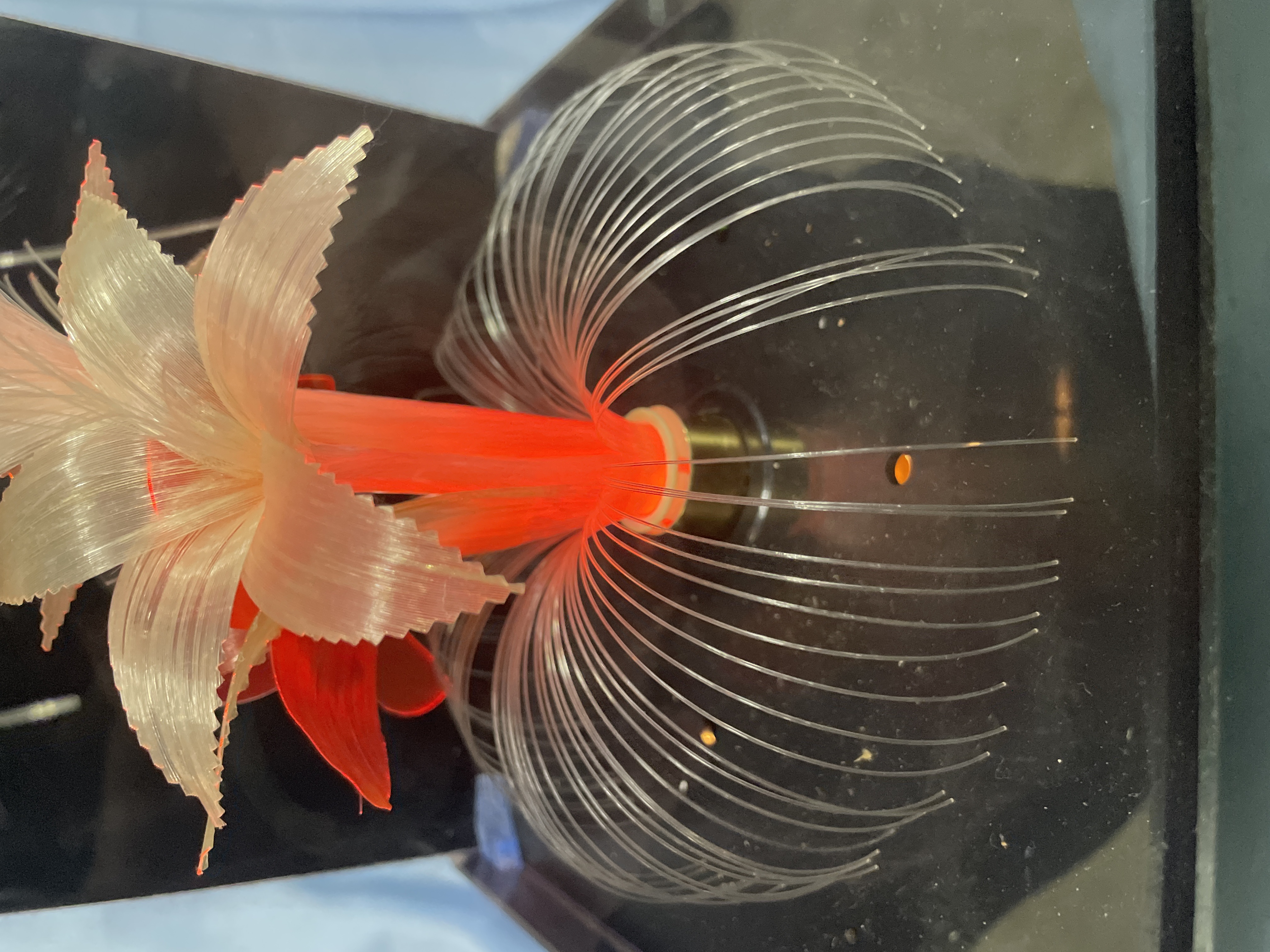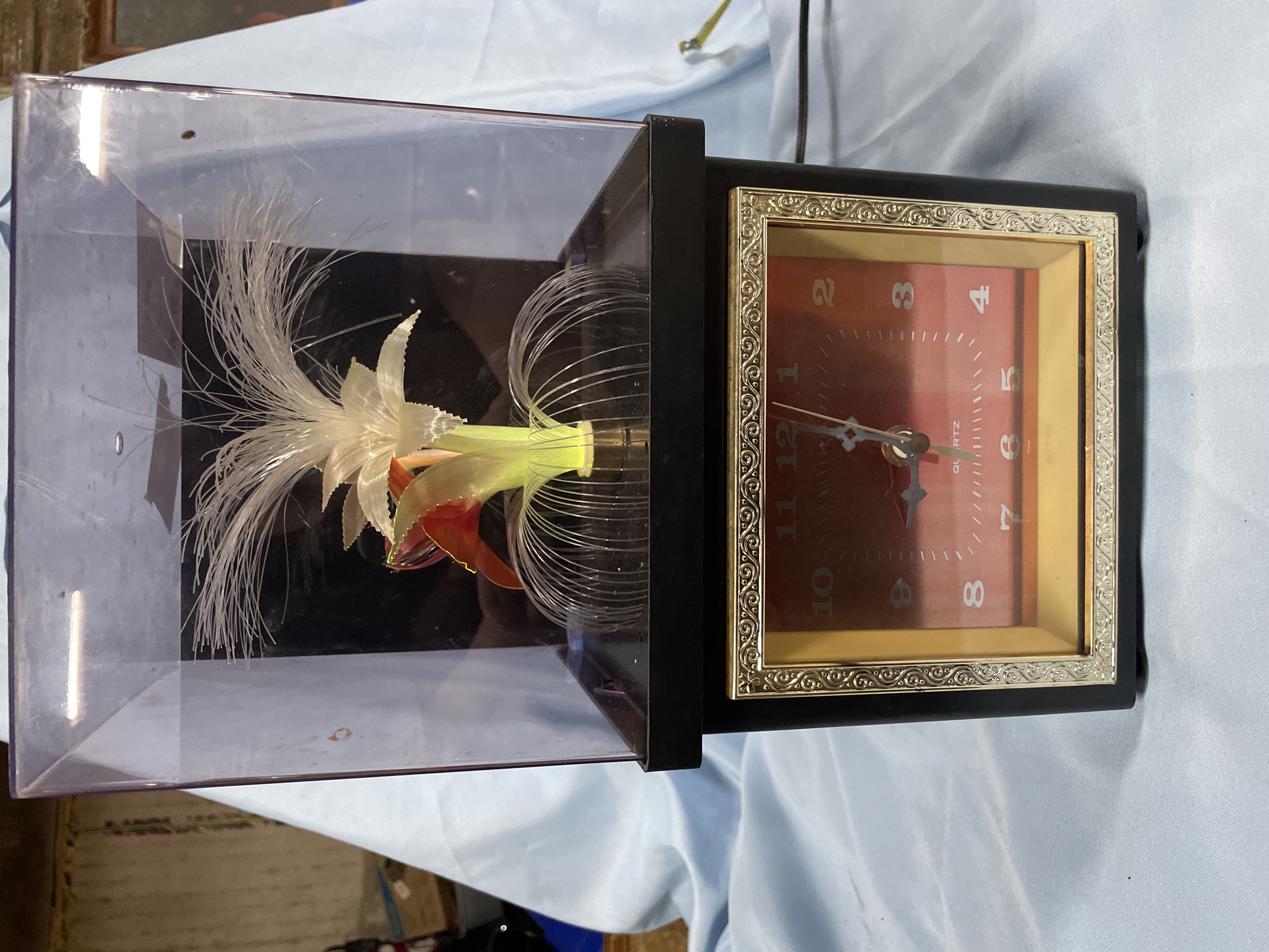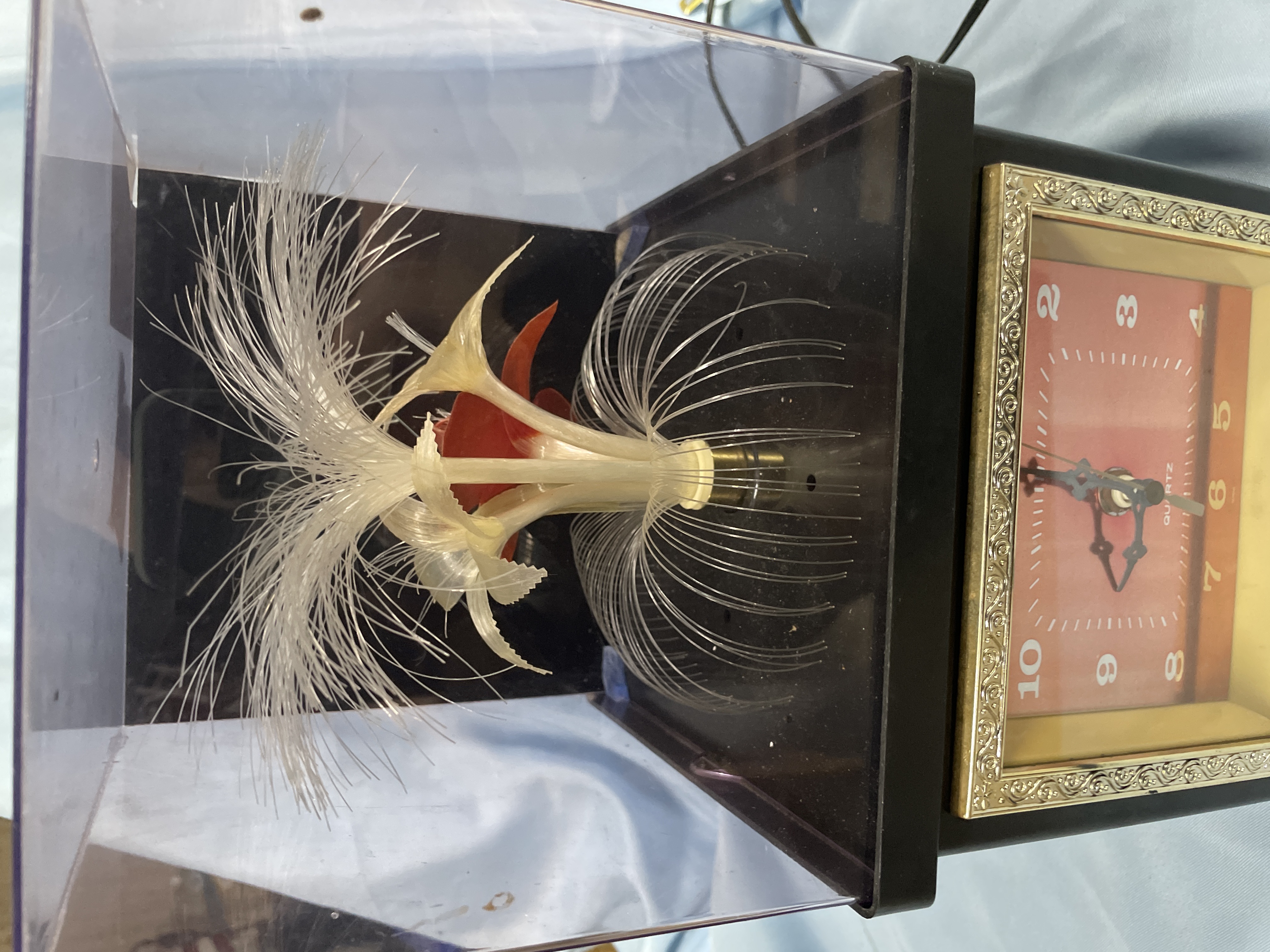 A vintage combination unit featuring a fiber-optic floral arrangement in a clear display case alongside a red-faced quartz clock with a gold-toned frame.