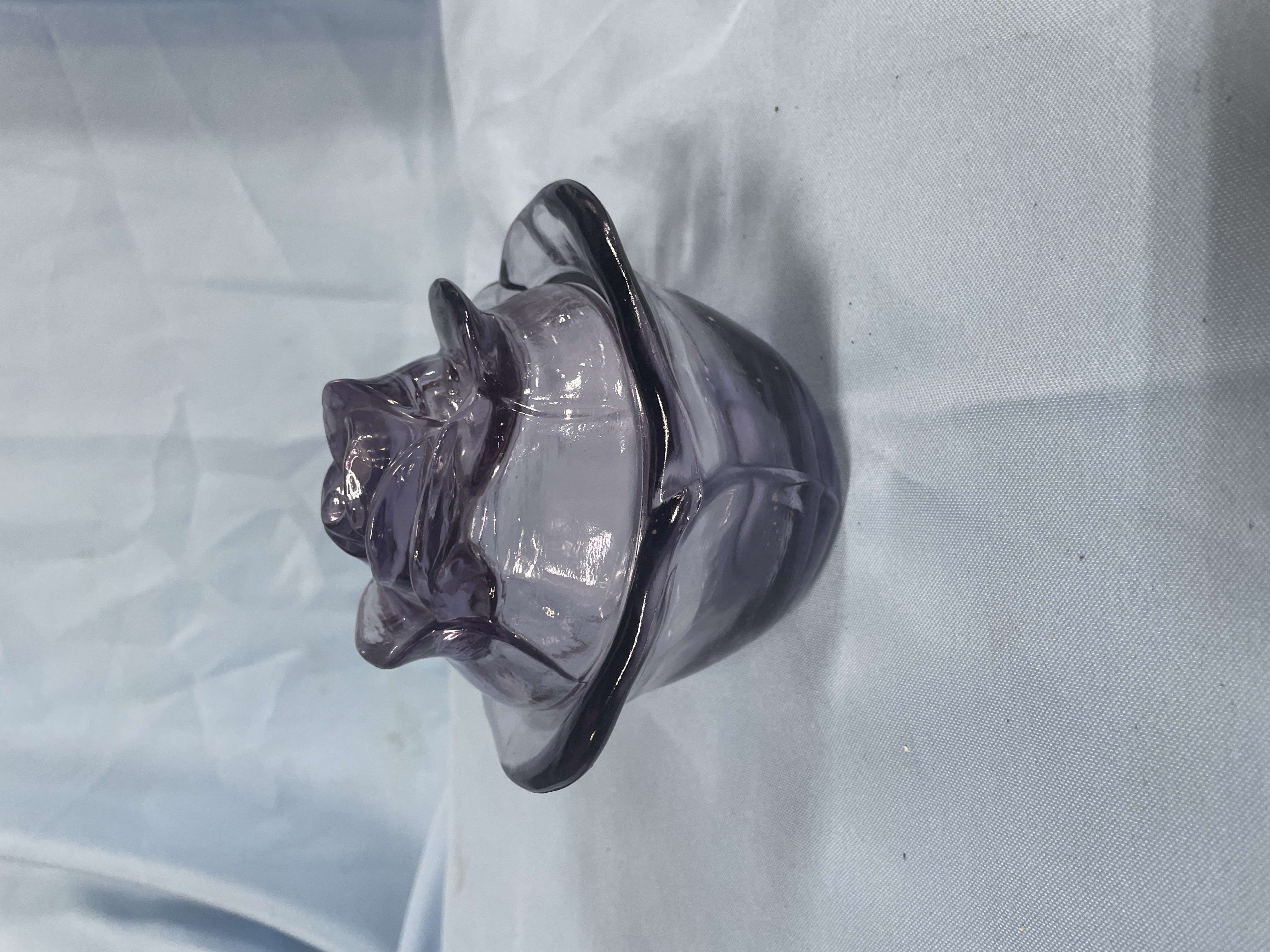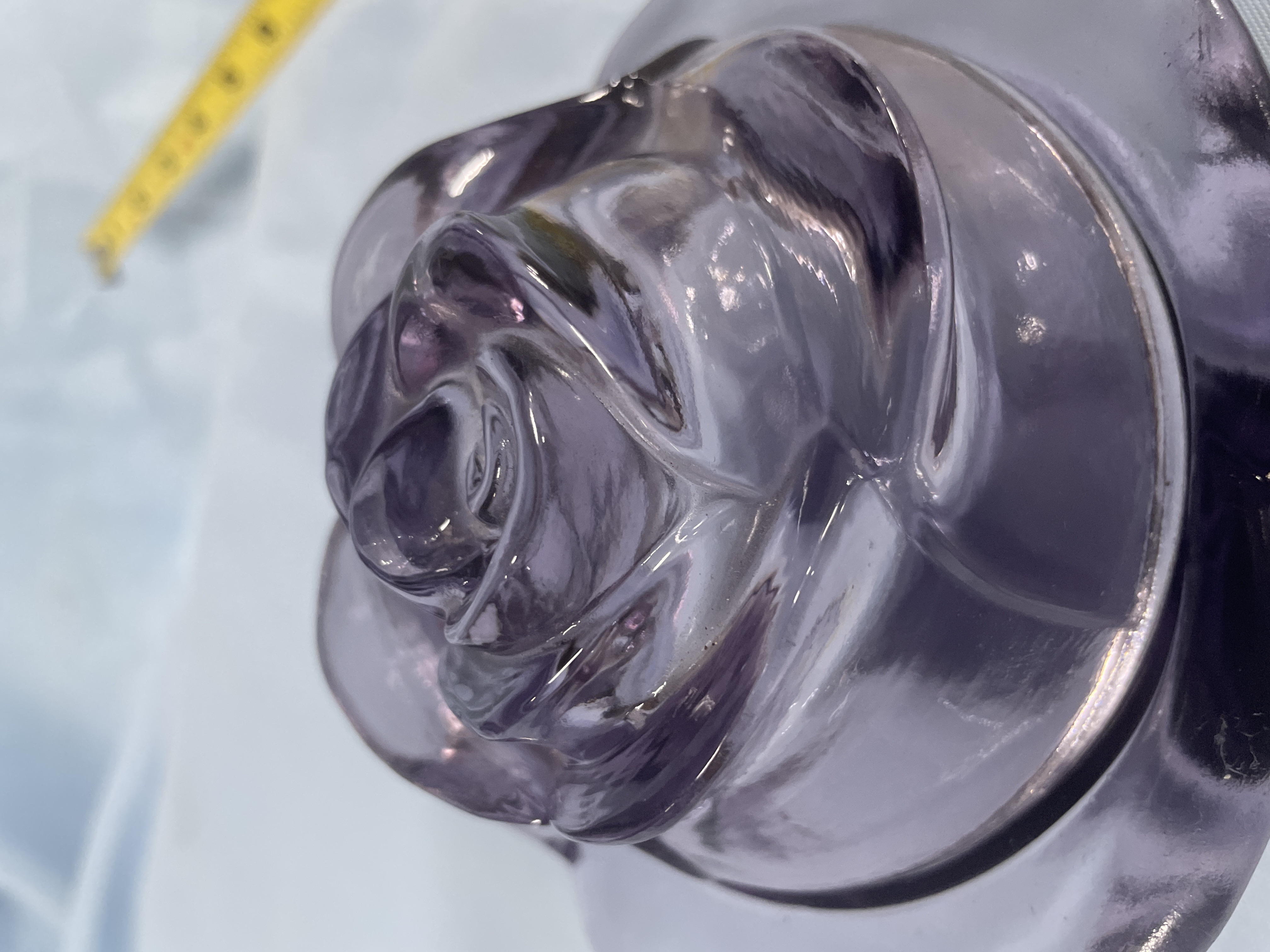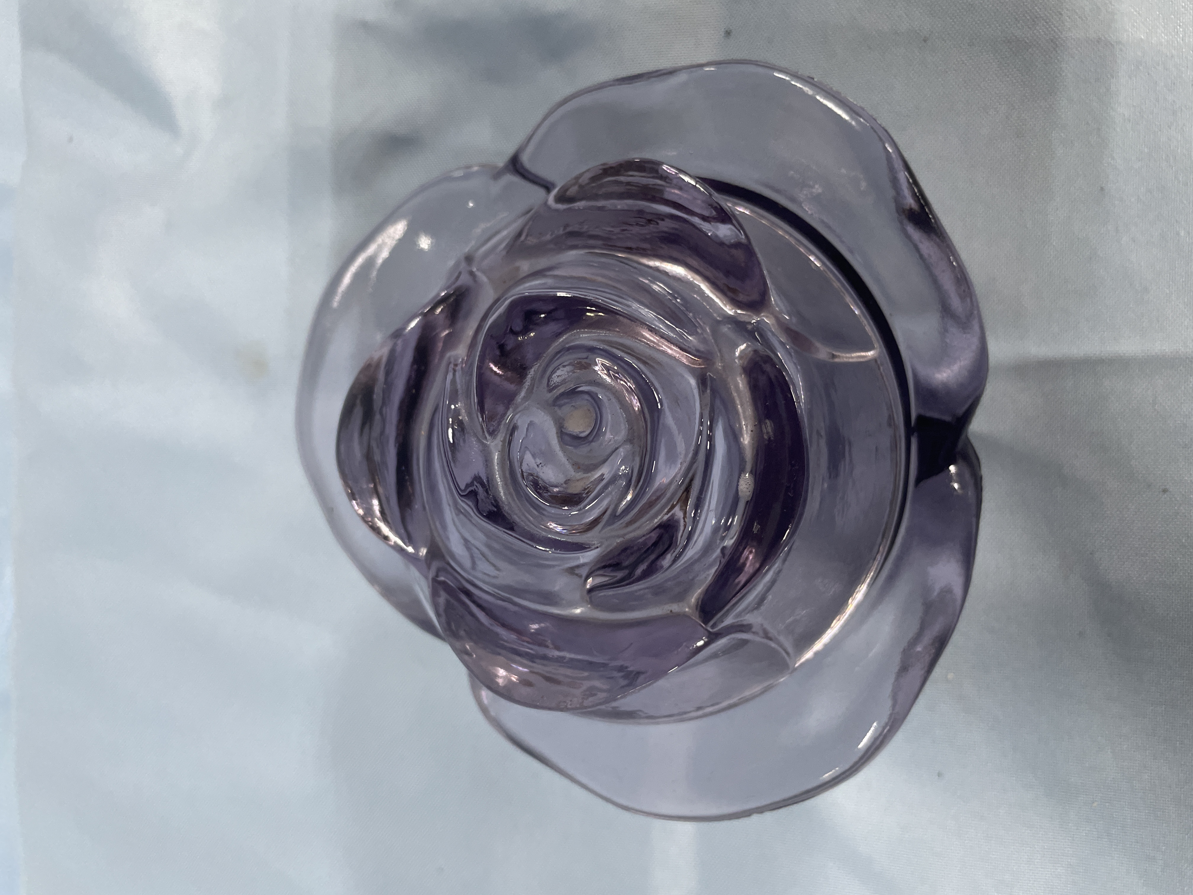 A translucent purple glass decorative object or lid intricately shaped like a blooming rose, measuring approximately 4.5 inches in diameter.