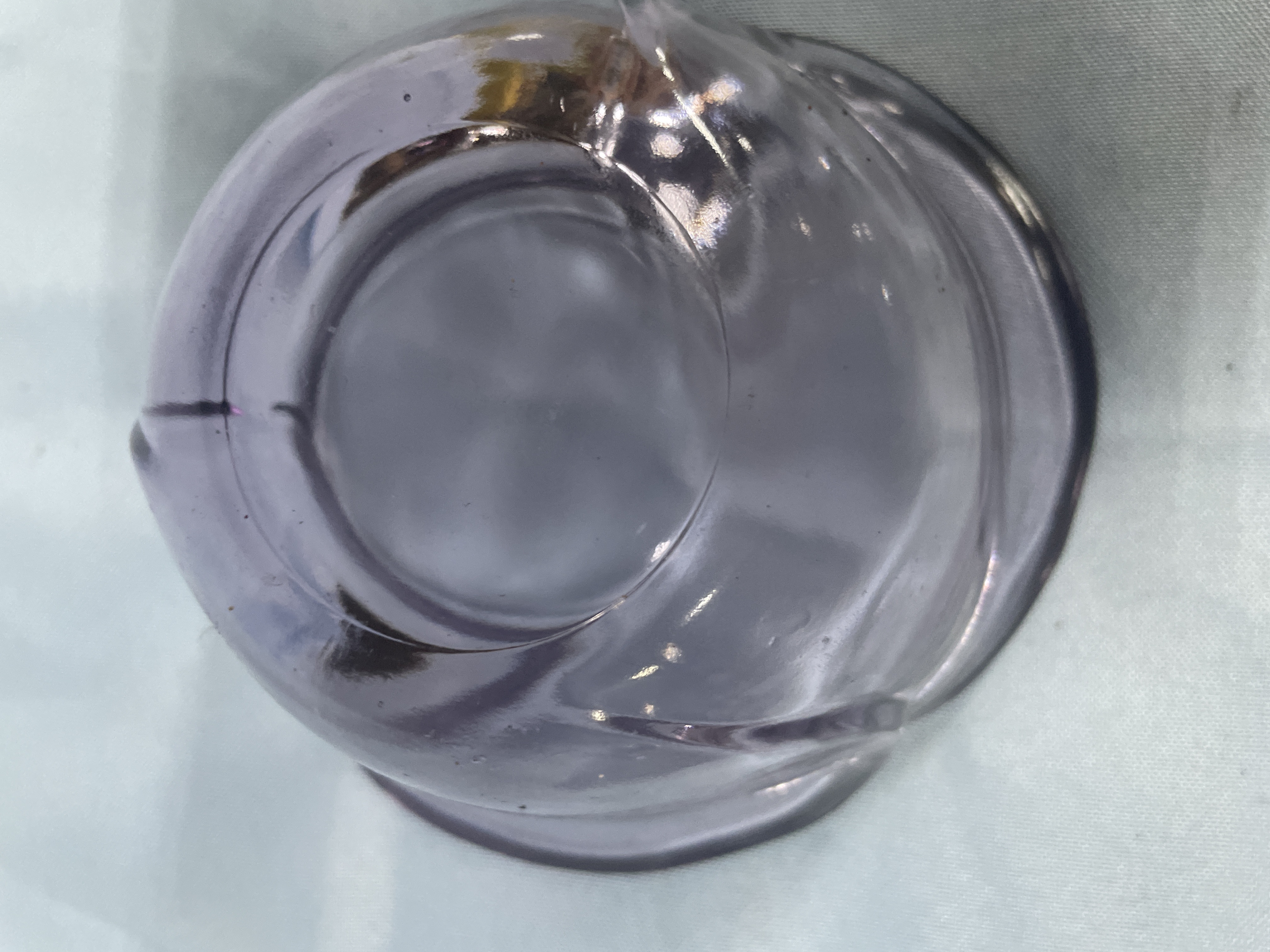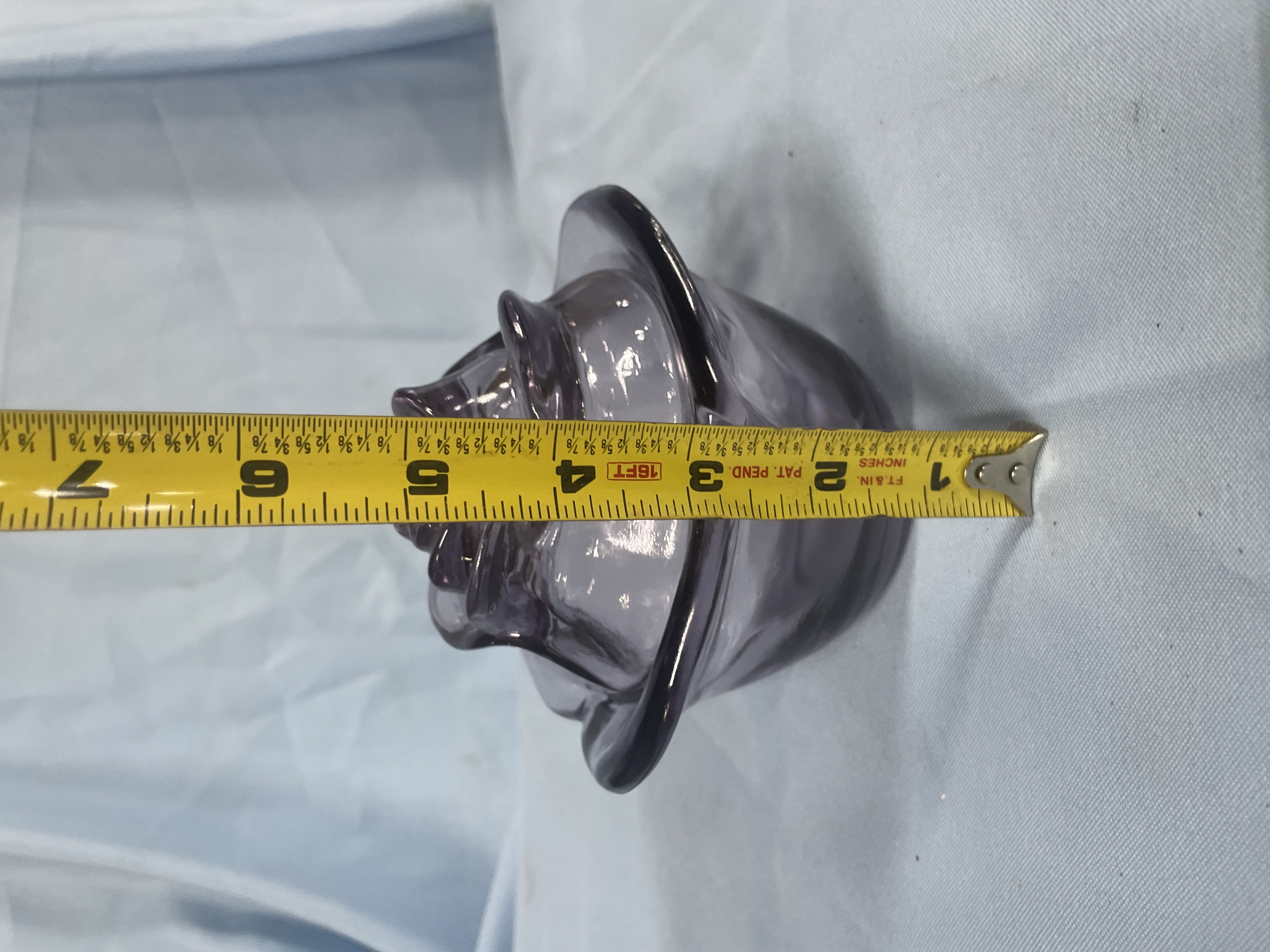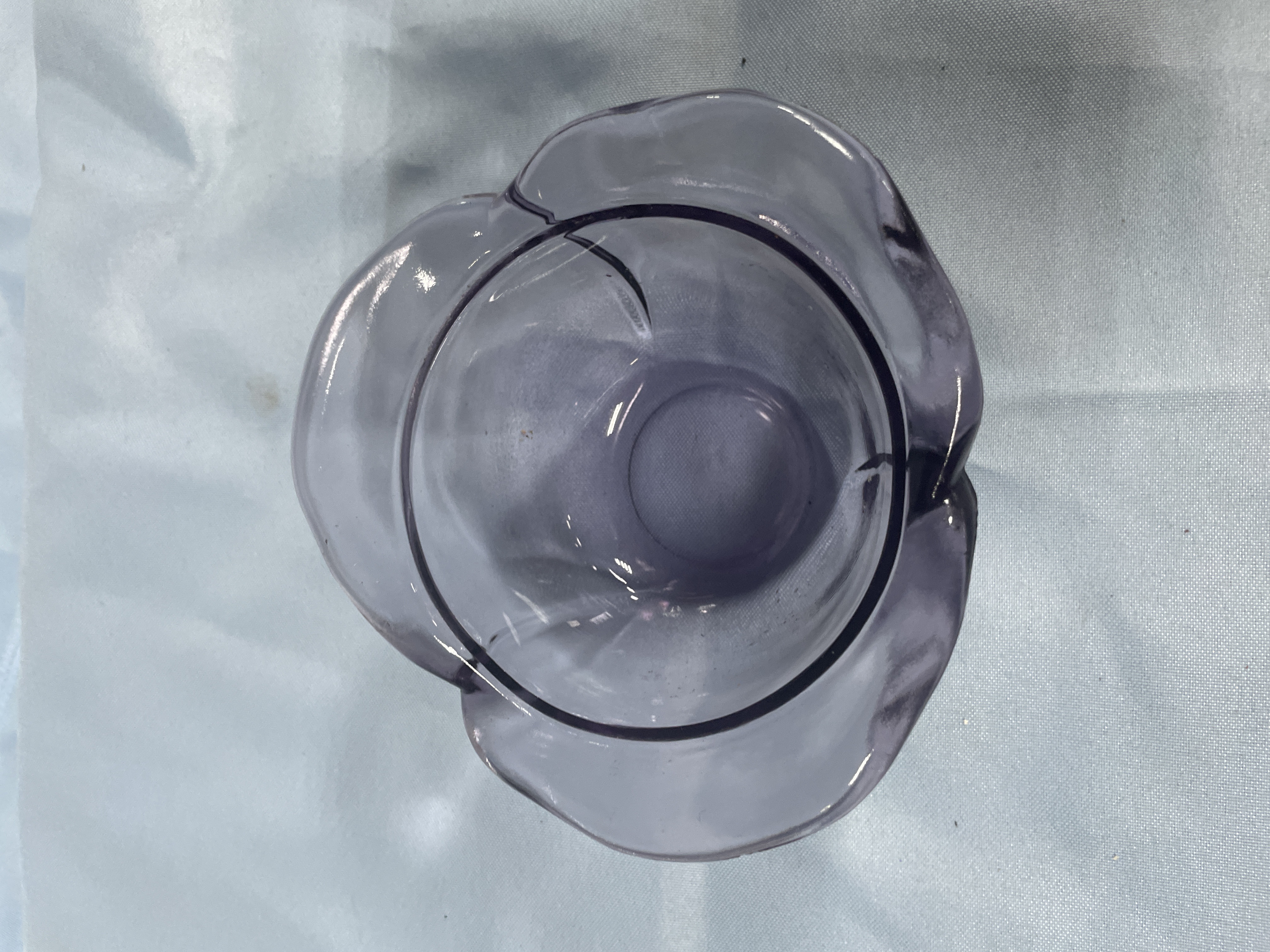 A translucent purple glass decorative object or lid intricately shaped like a blooming rose, measuring approximately 4.5 inches in diameter.