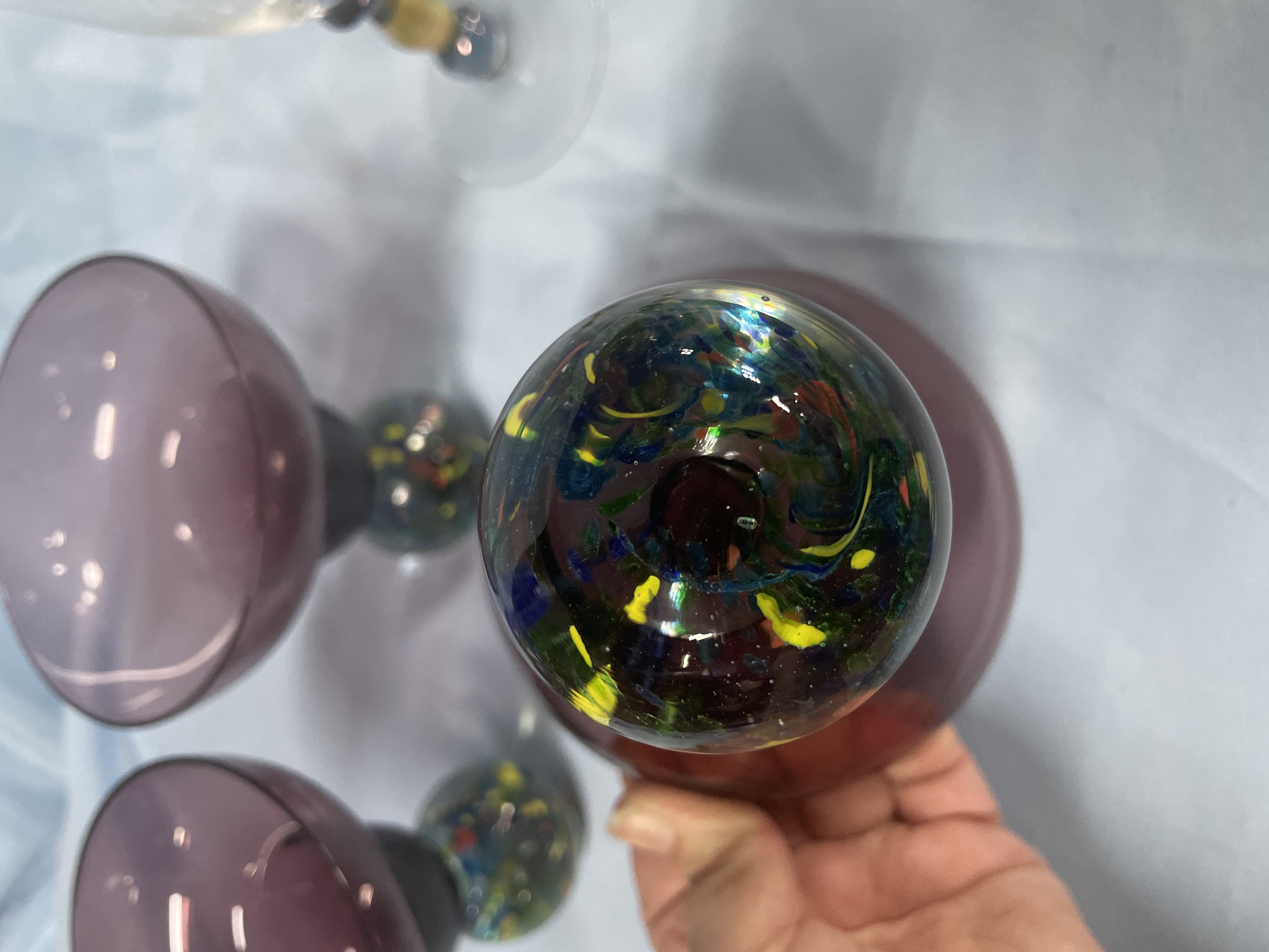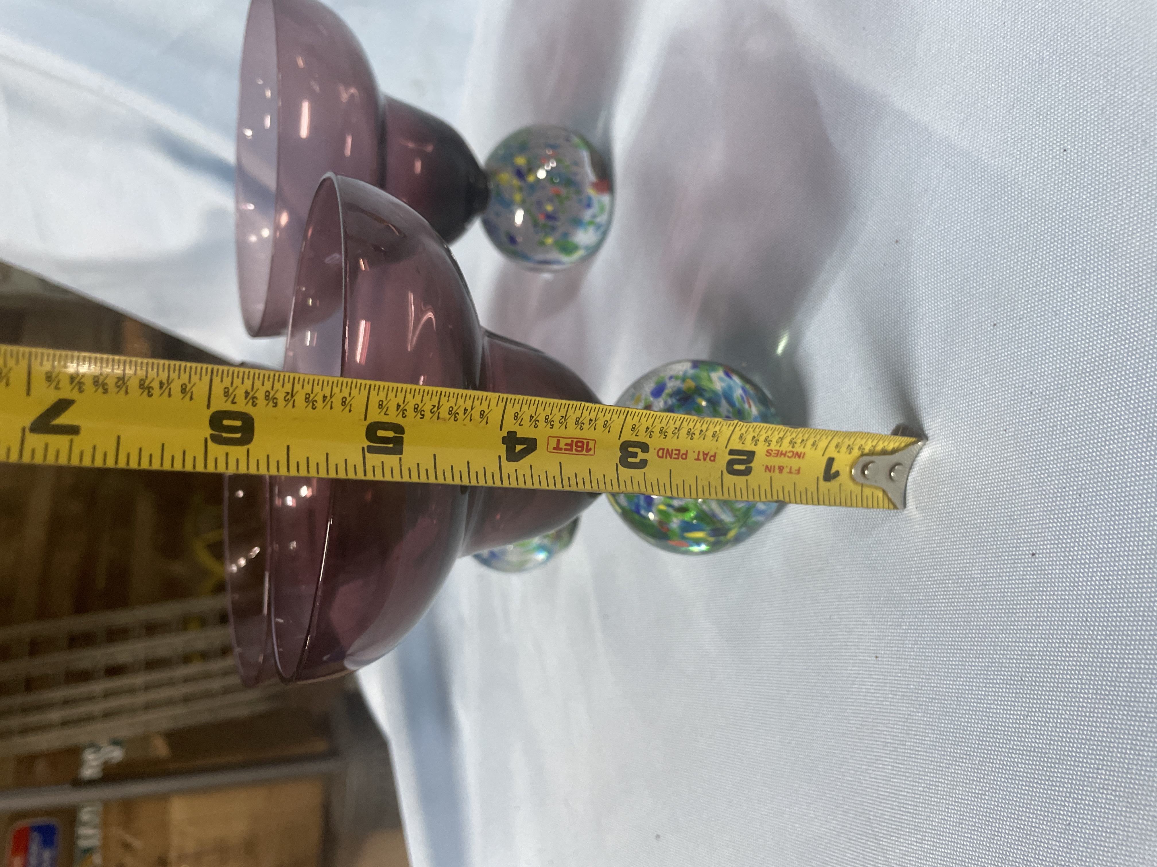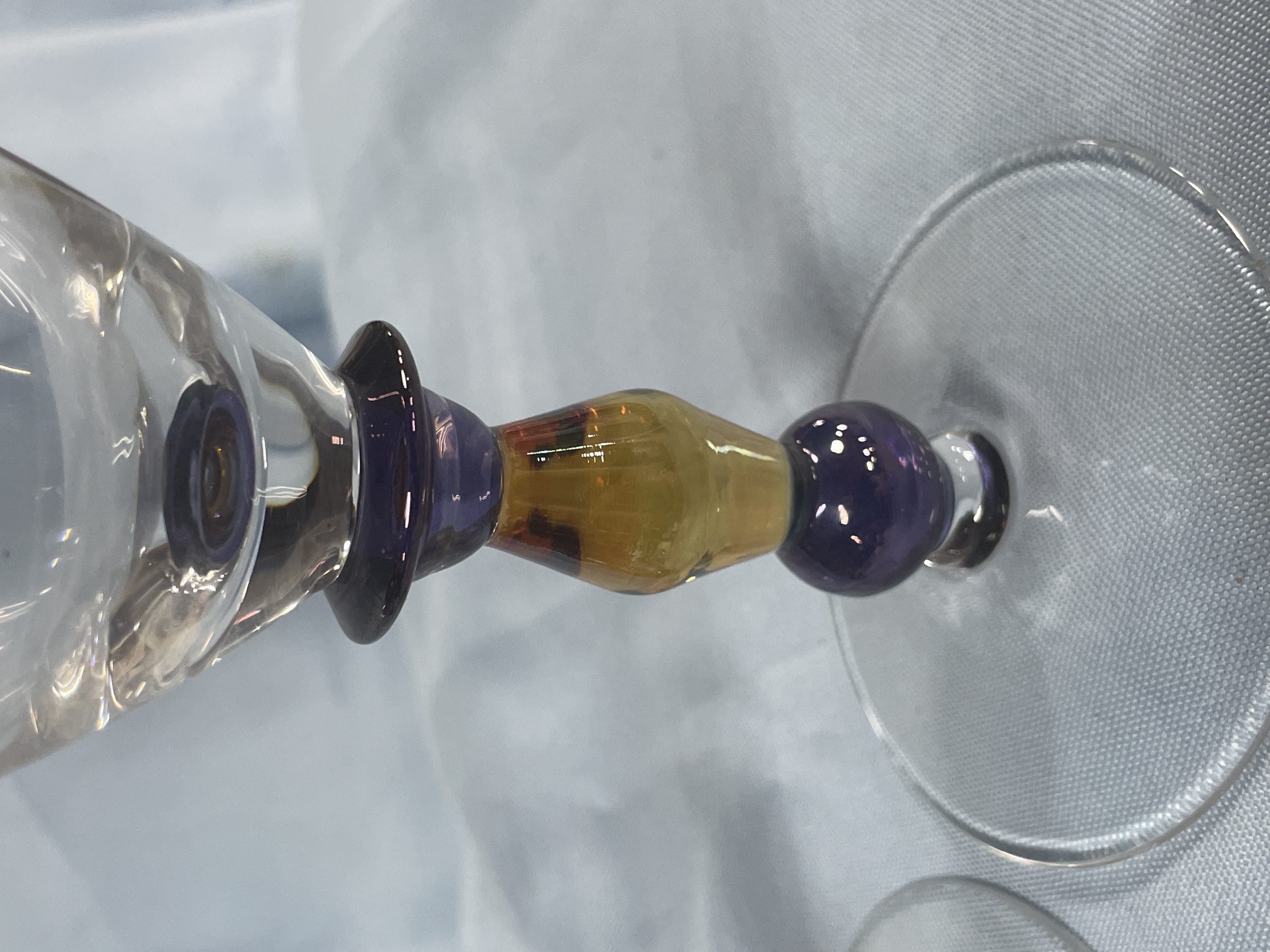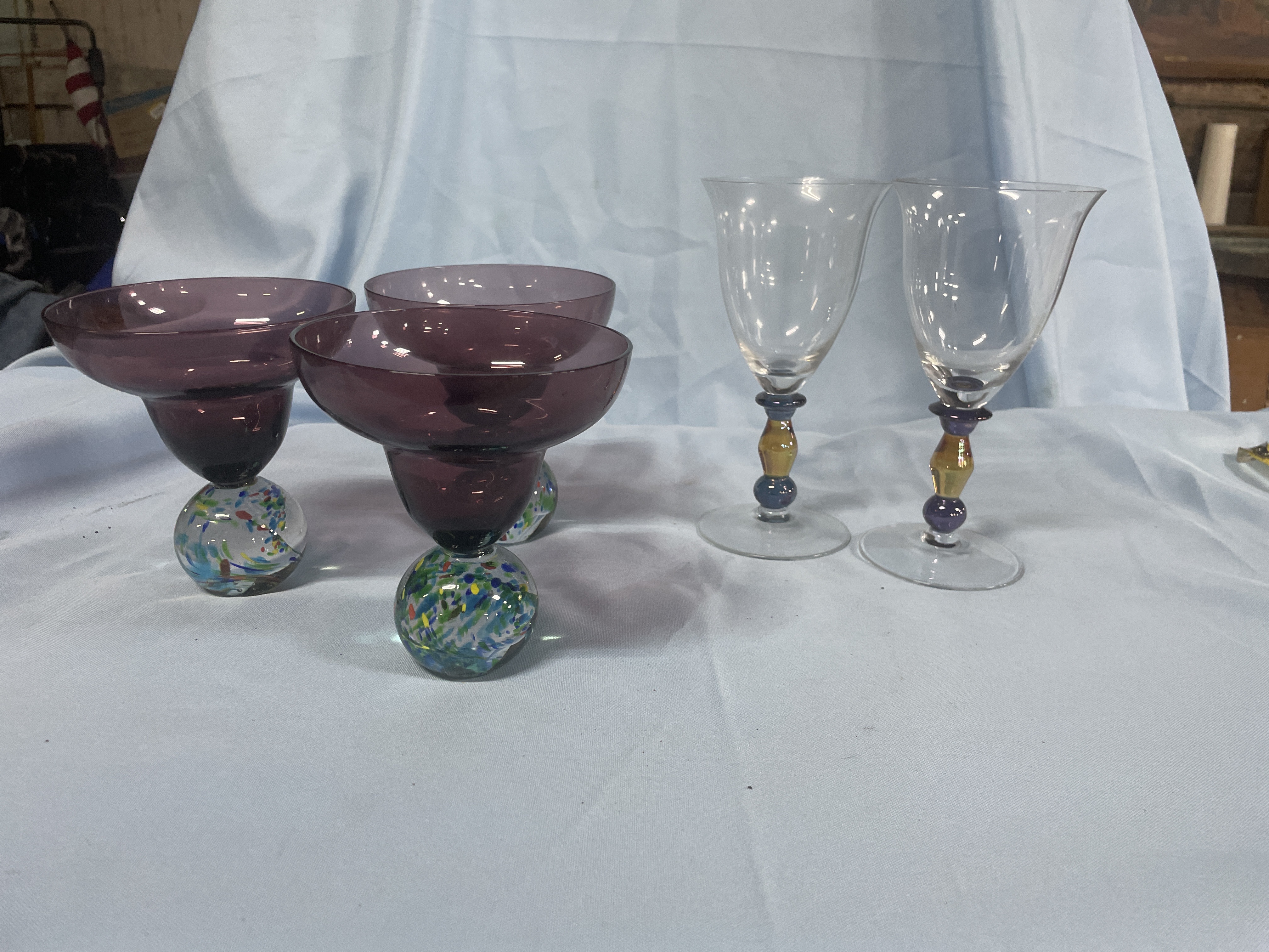 A collection of glassware including purple margarita glasses with multi-colored confetti ball bases measuring approximately 6 inches tall and clear wine glasses with amber and purple tiered stems measuring approximately 8.5 inches tall.