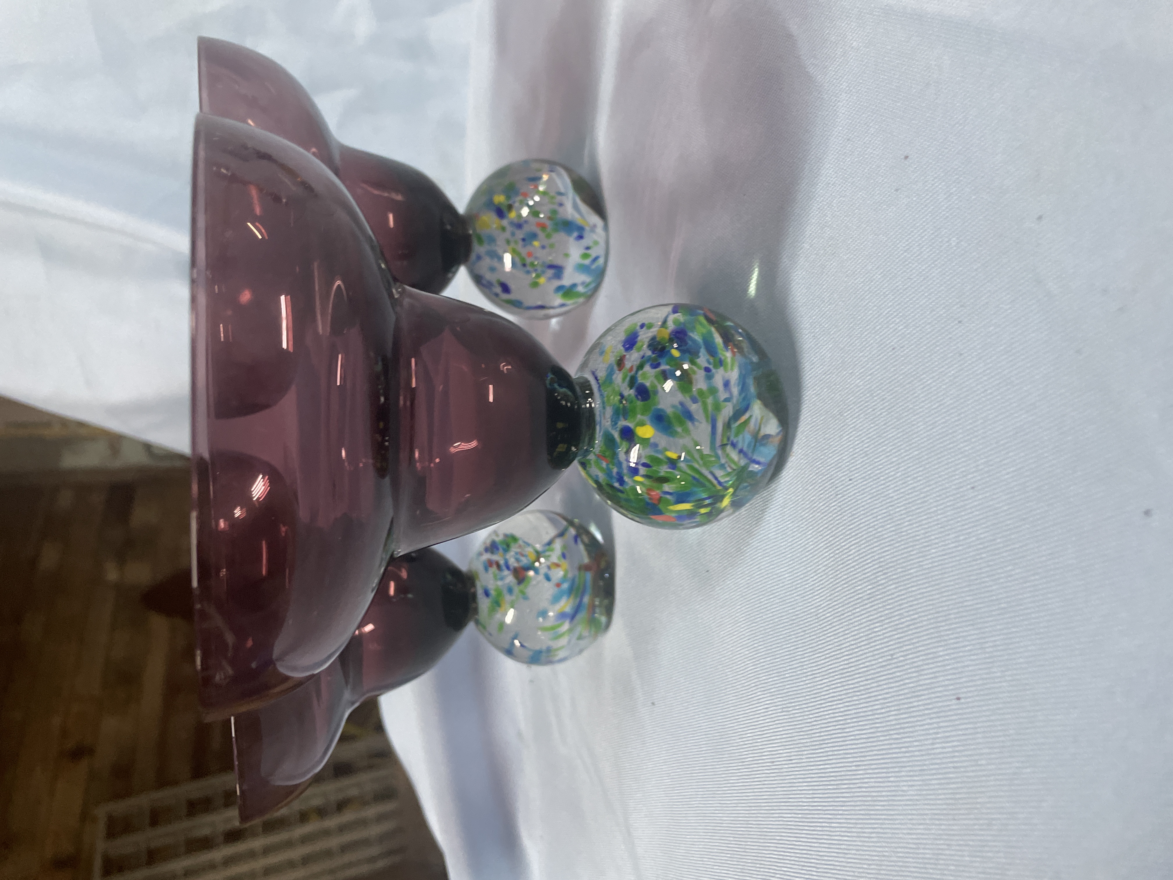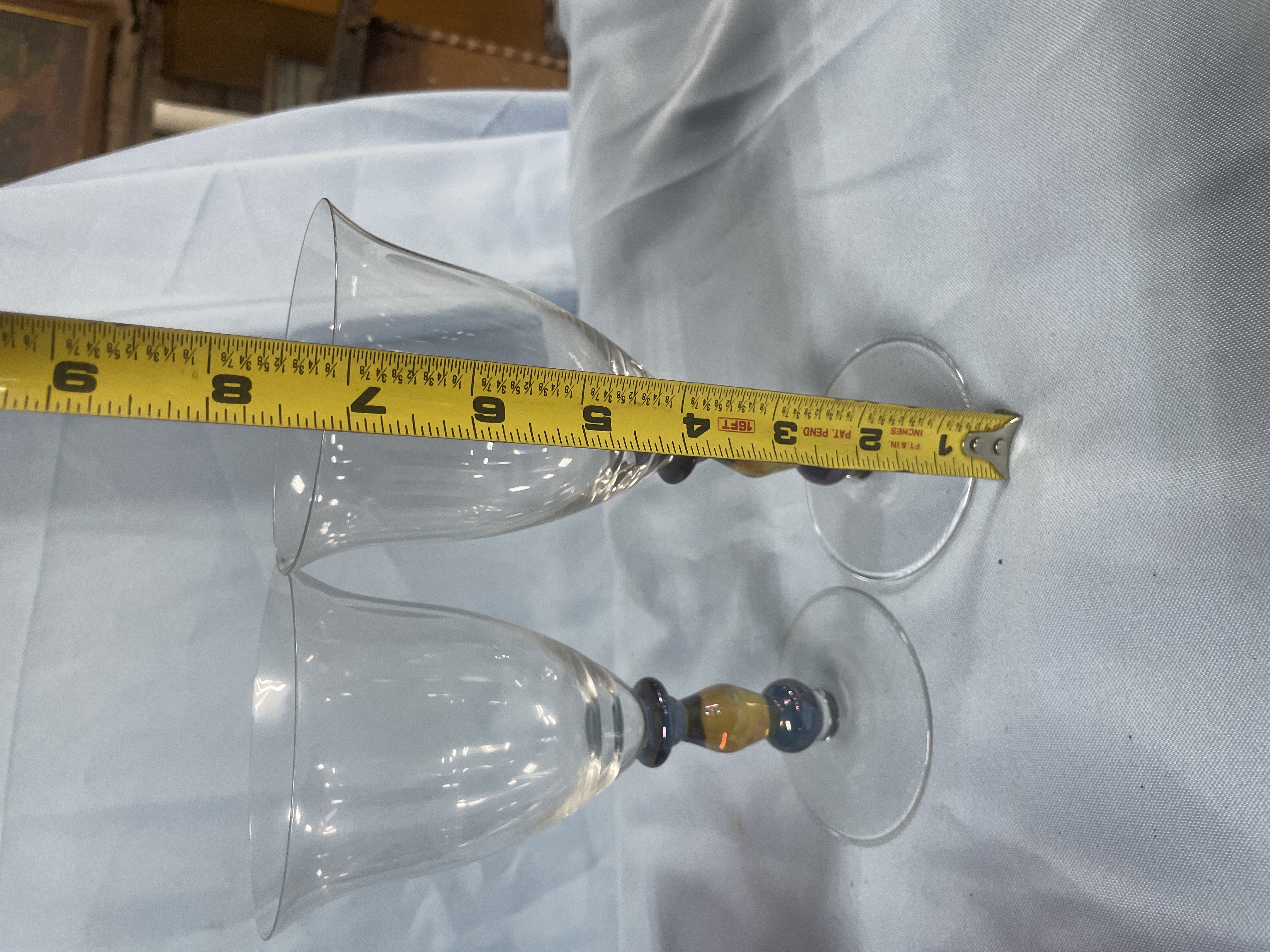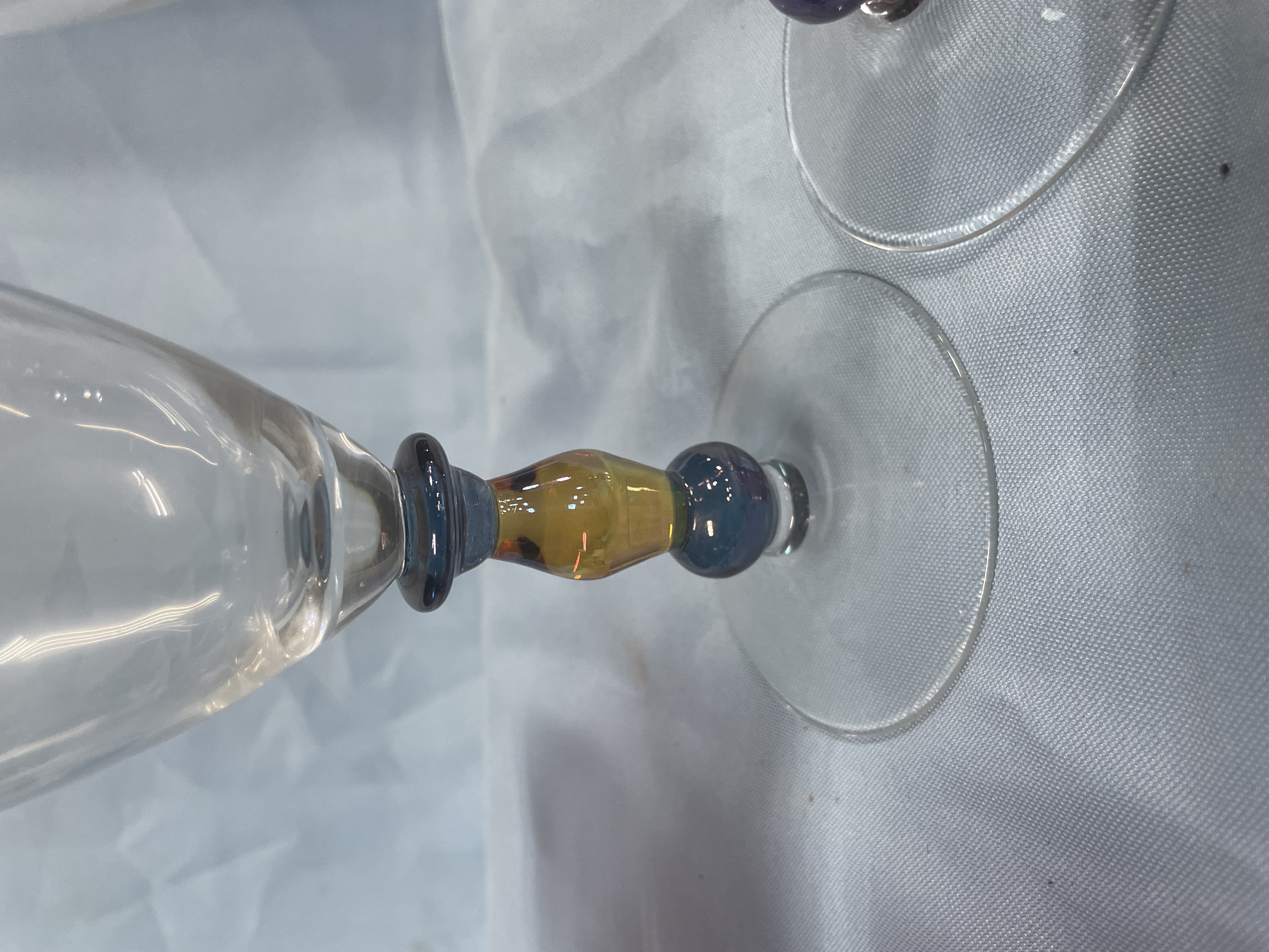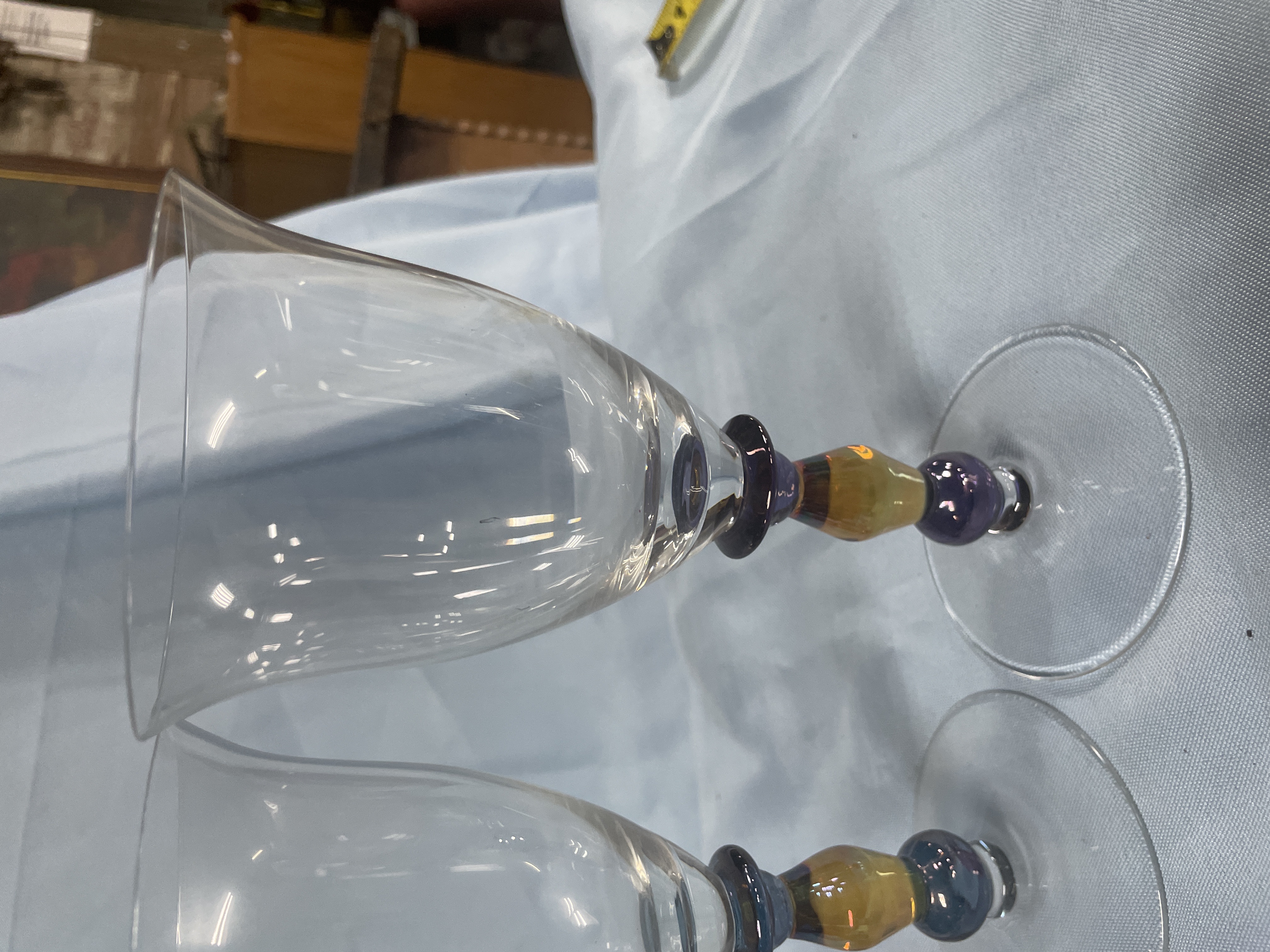 A collection of glassware including purple margarita glasses with multi-colored confetti ball bases measuring approximately 6 inches tall and clear wine glasses with amber and purple tiered stems measuring approximately 8.5 inches tall.