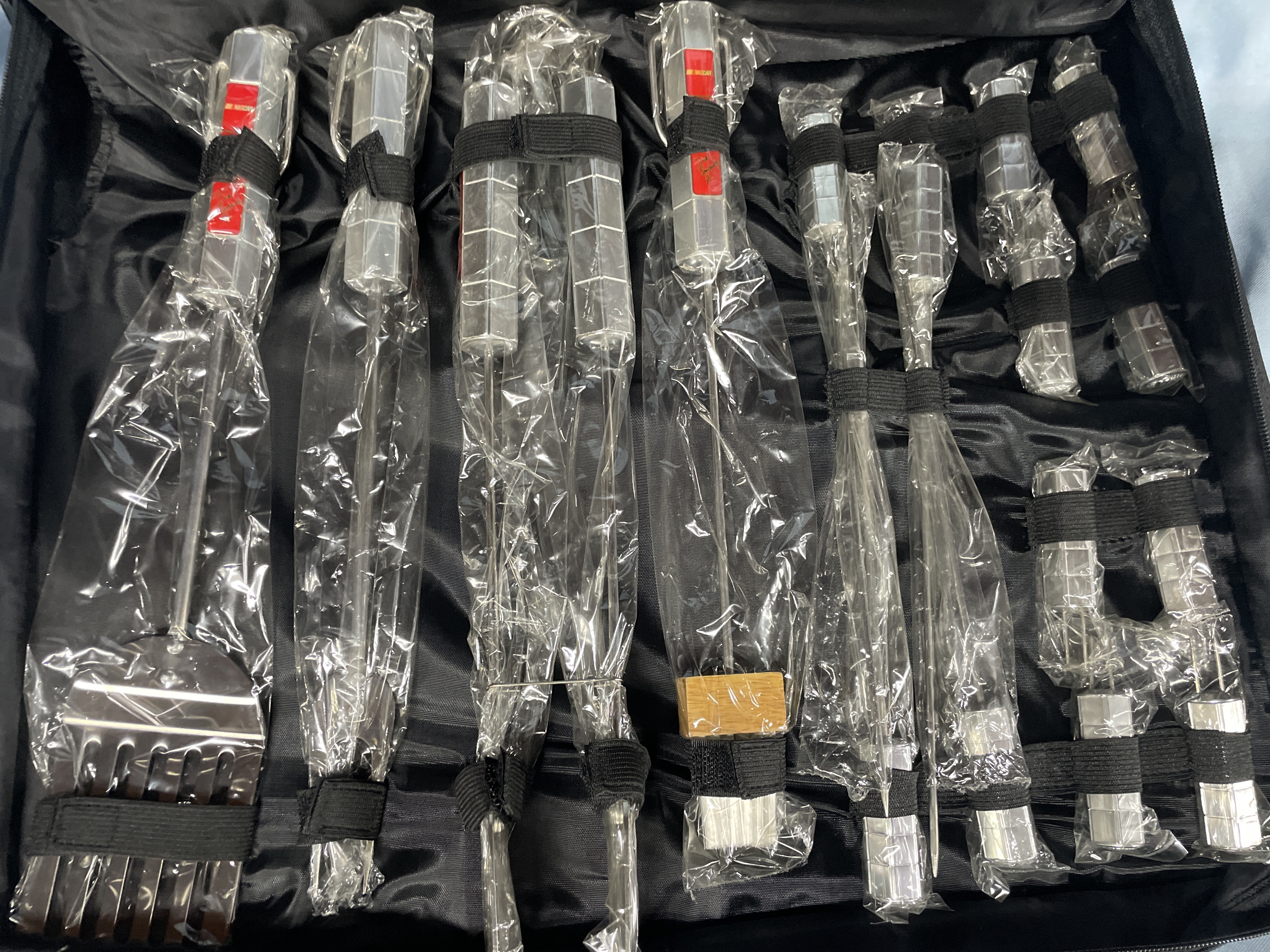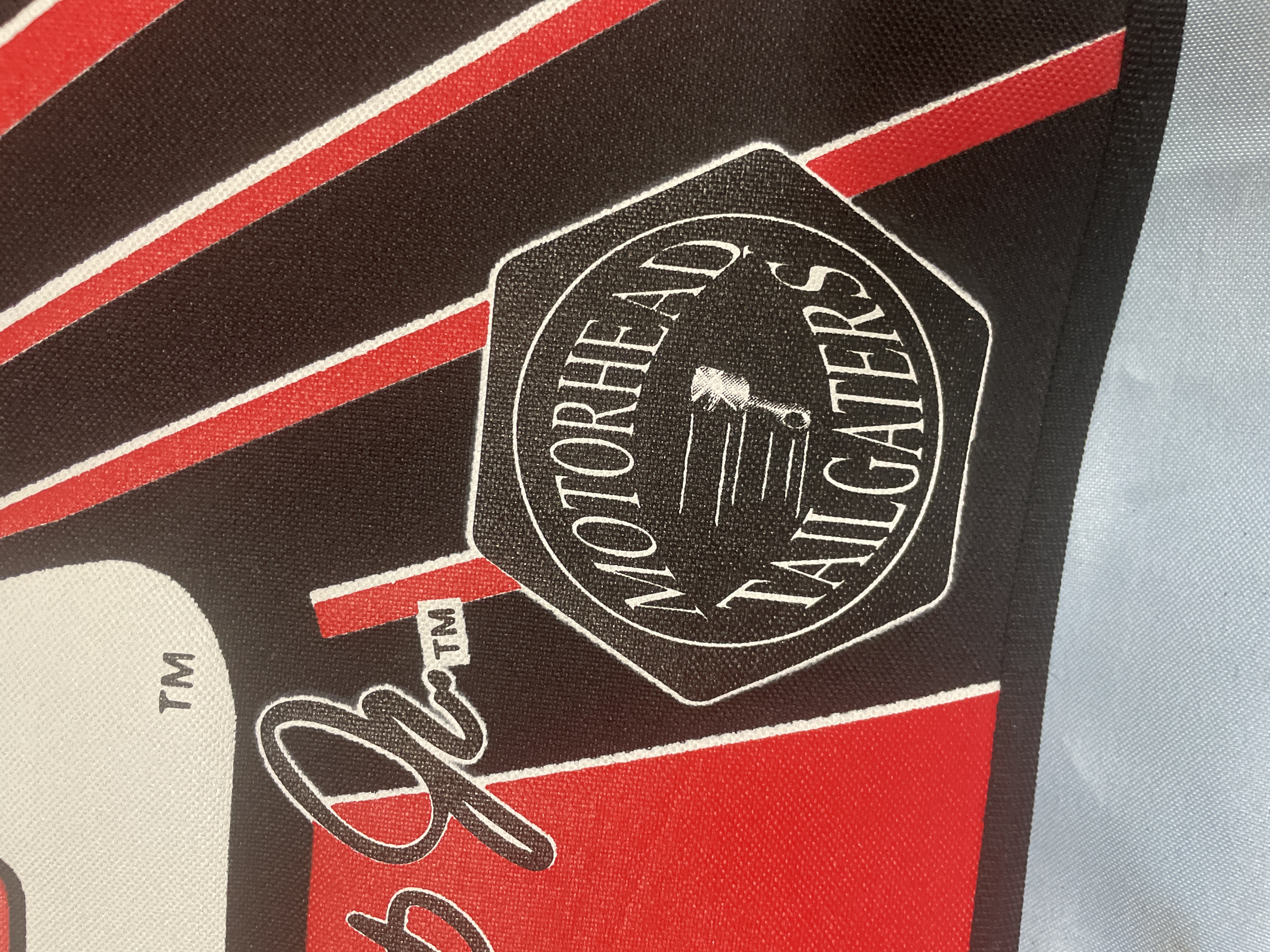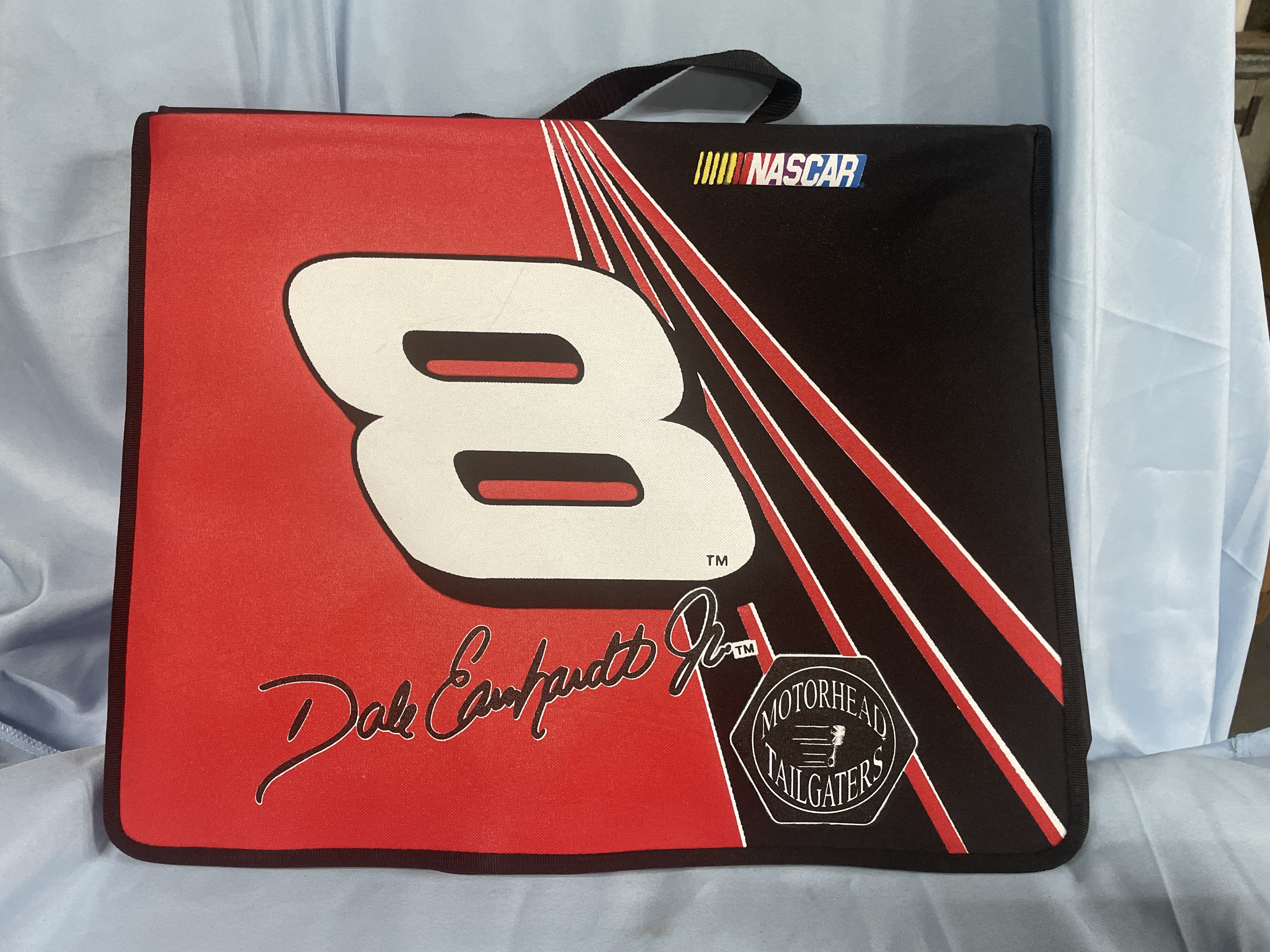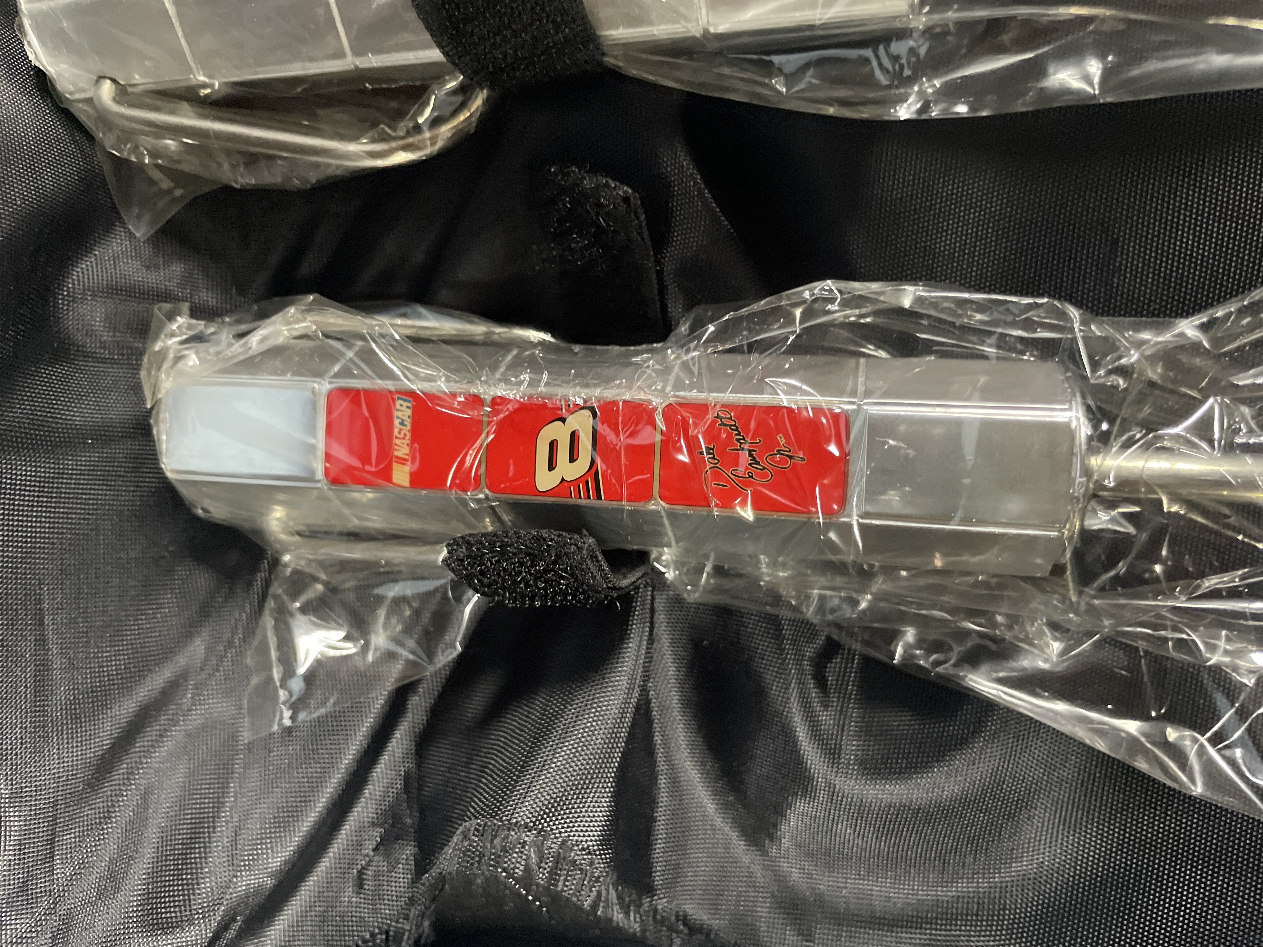 A collection of stainless steel grilling tools including a spatula, tongs, and skewers, housed in a branded Dale Earnhardt Jr. #8 Motorhead Tailgaters carrying case.