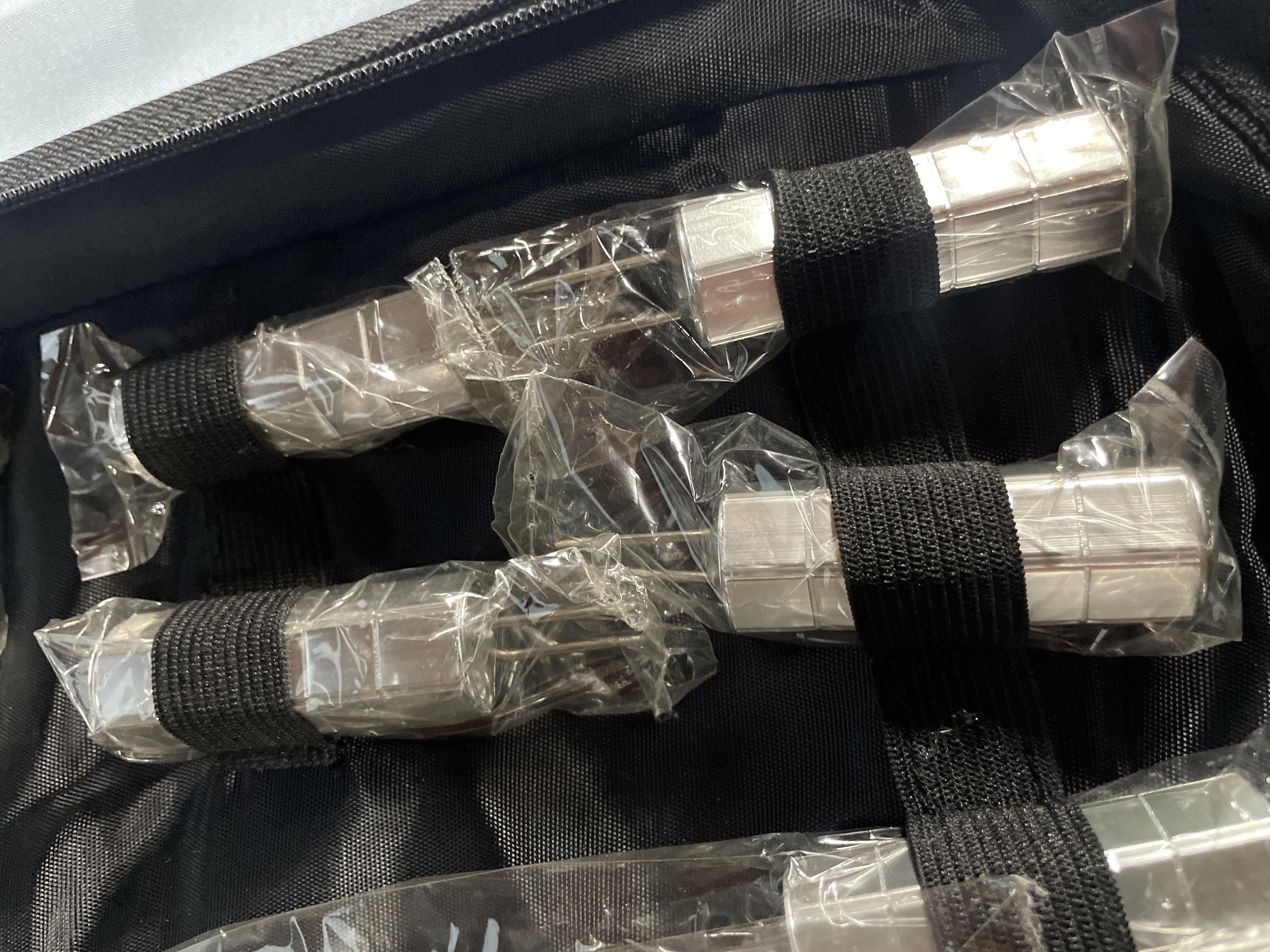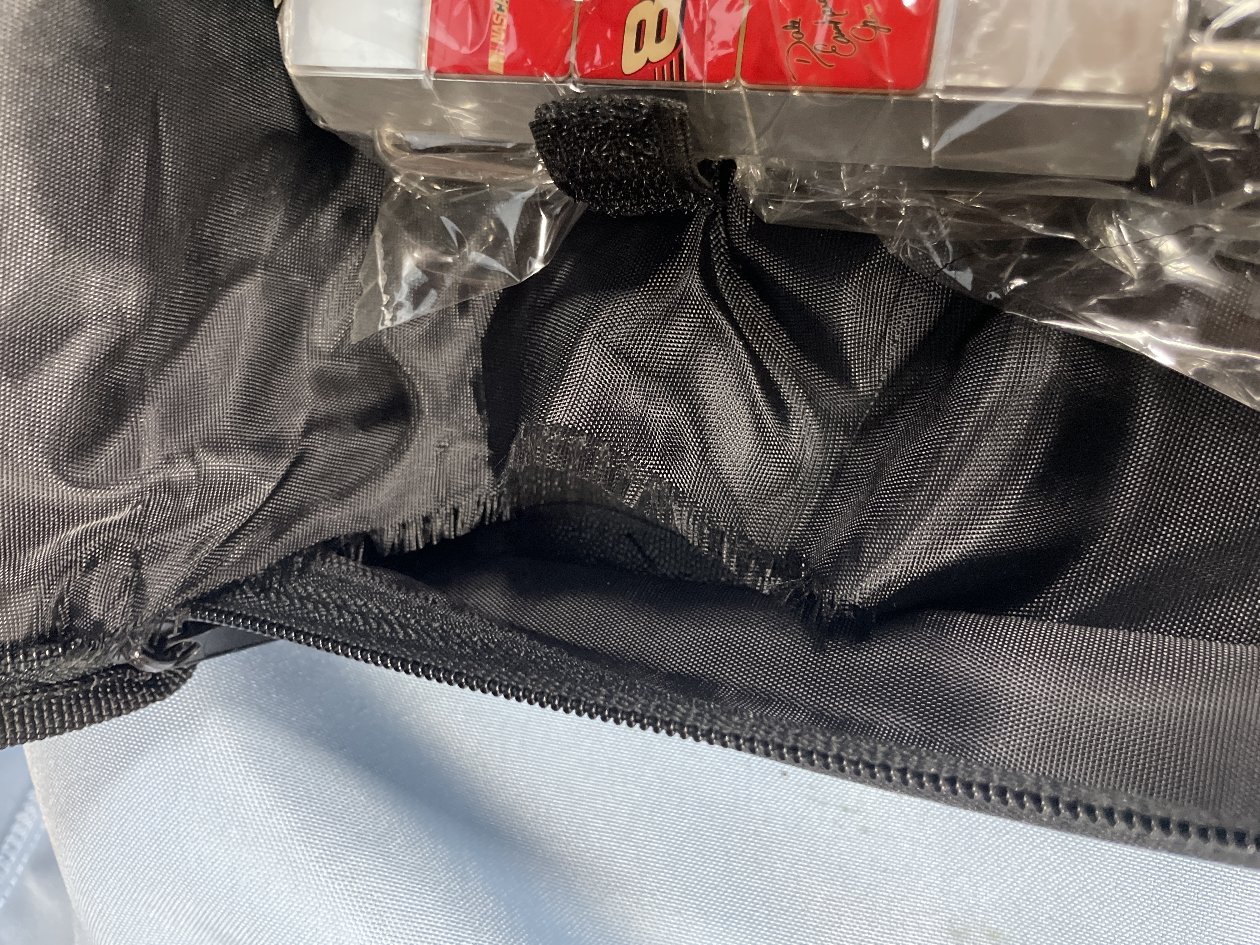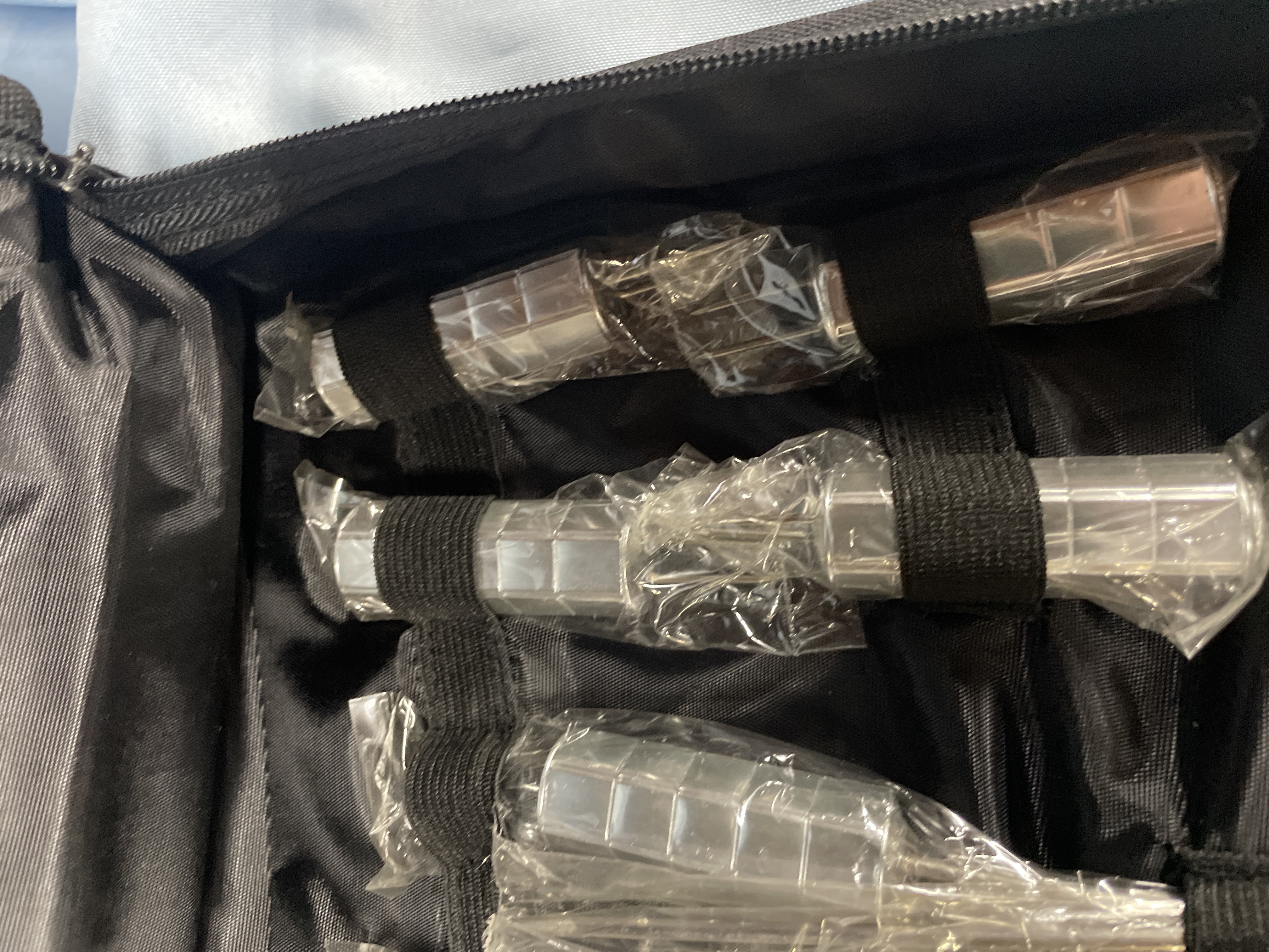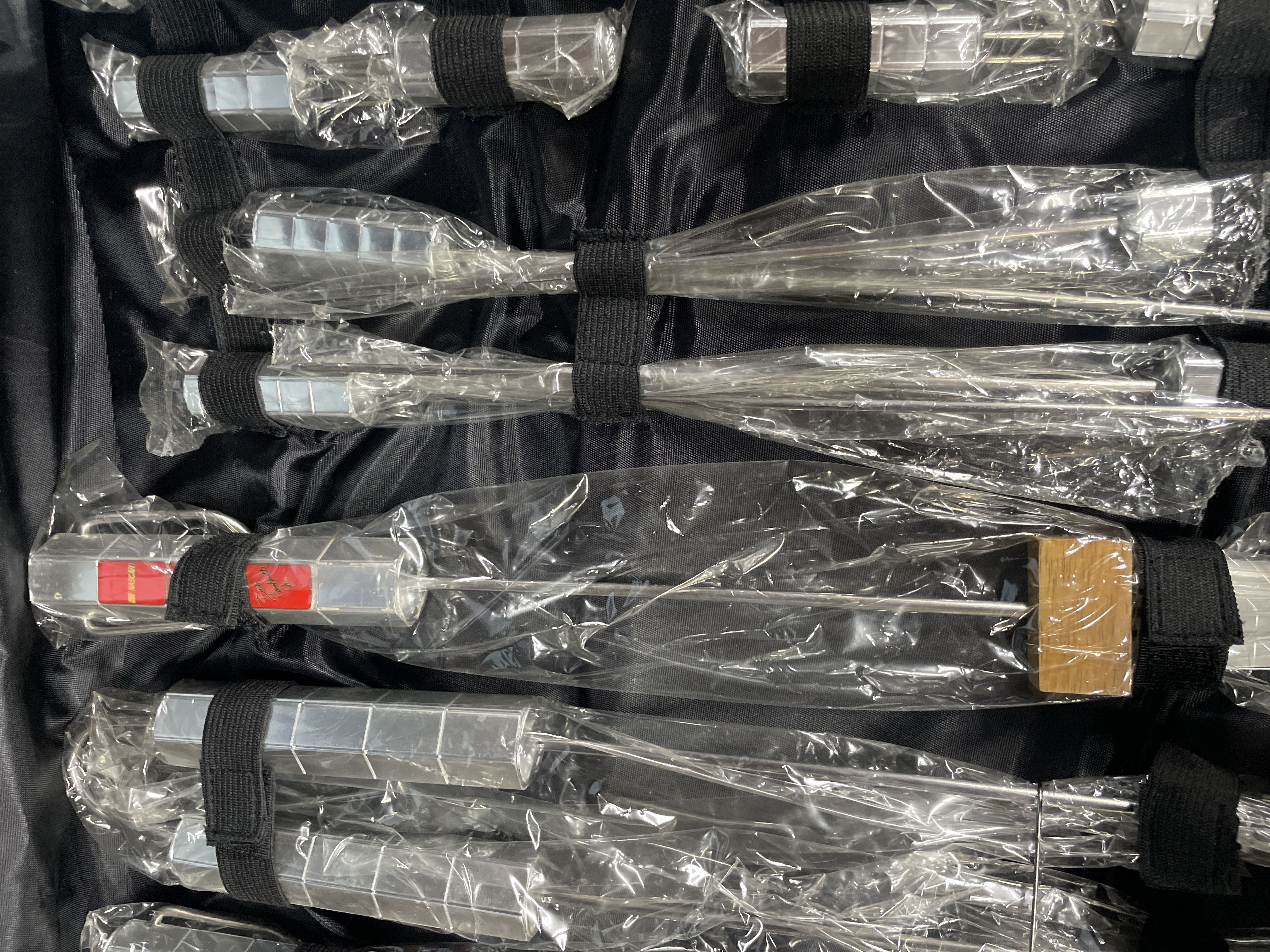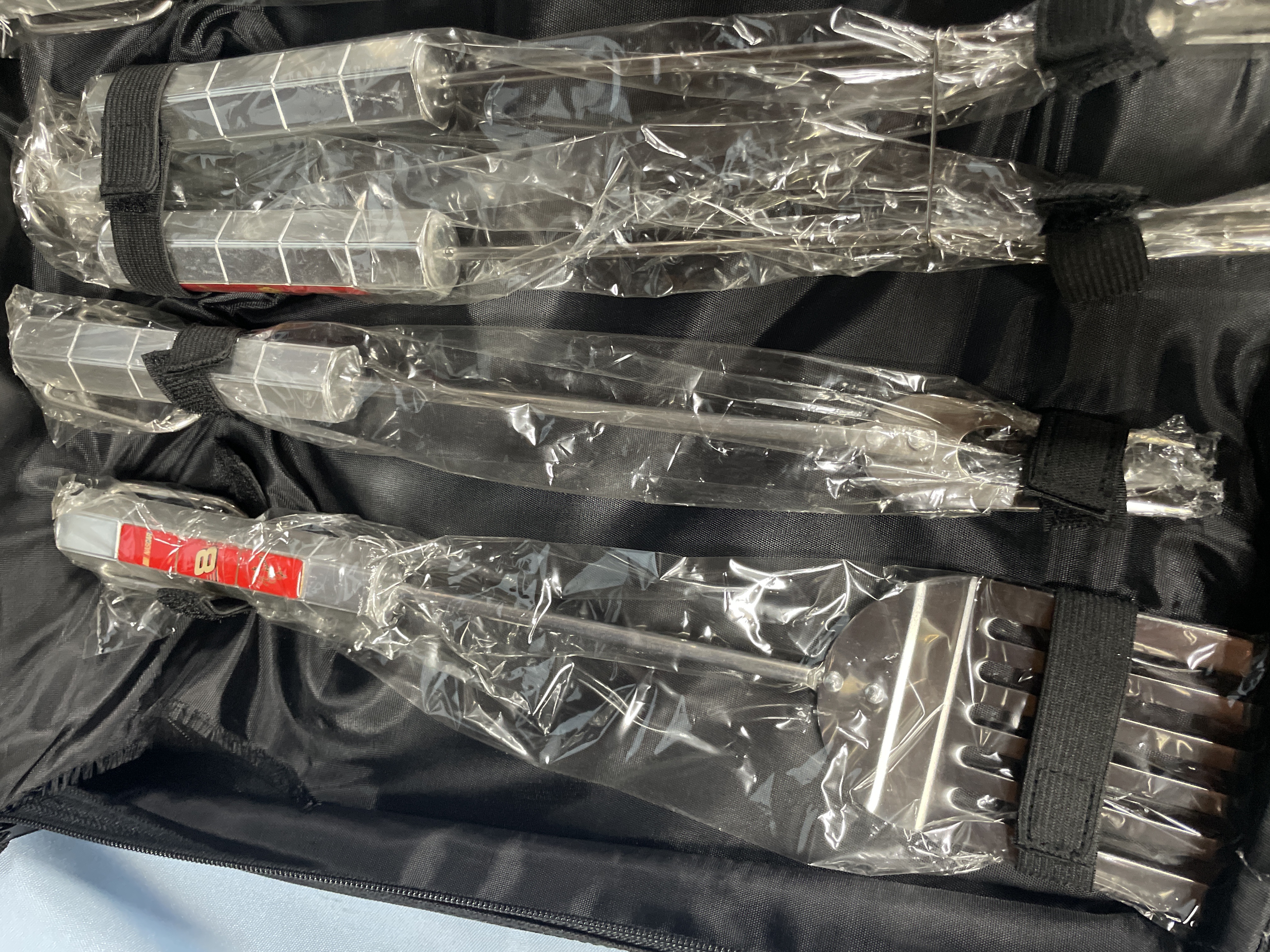 A collection of stainless steel grilling tools including a spatula, tongs, and skewers, housed in a branded Dale Earnhardt Jr. #8 Motorhead Tailgaters carrying case.
