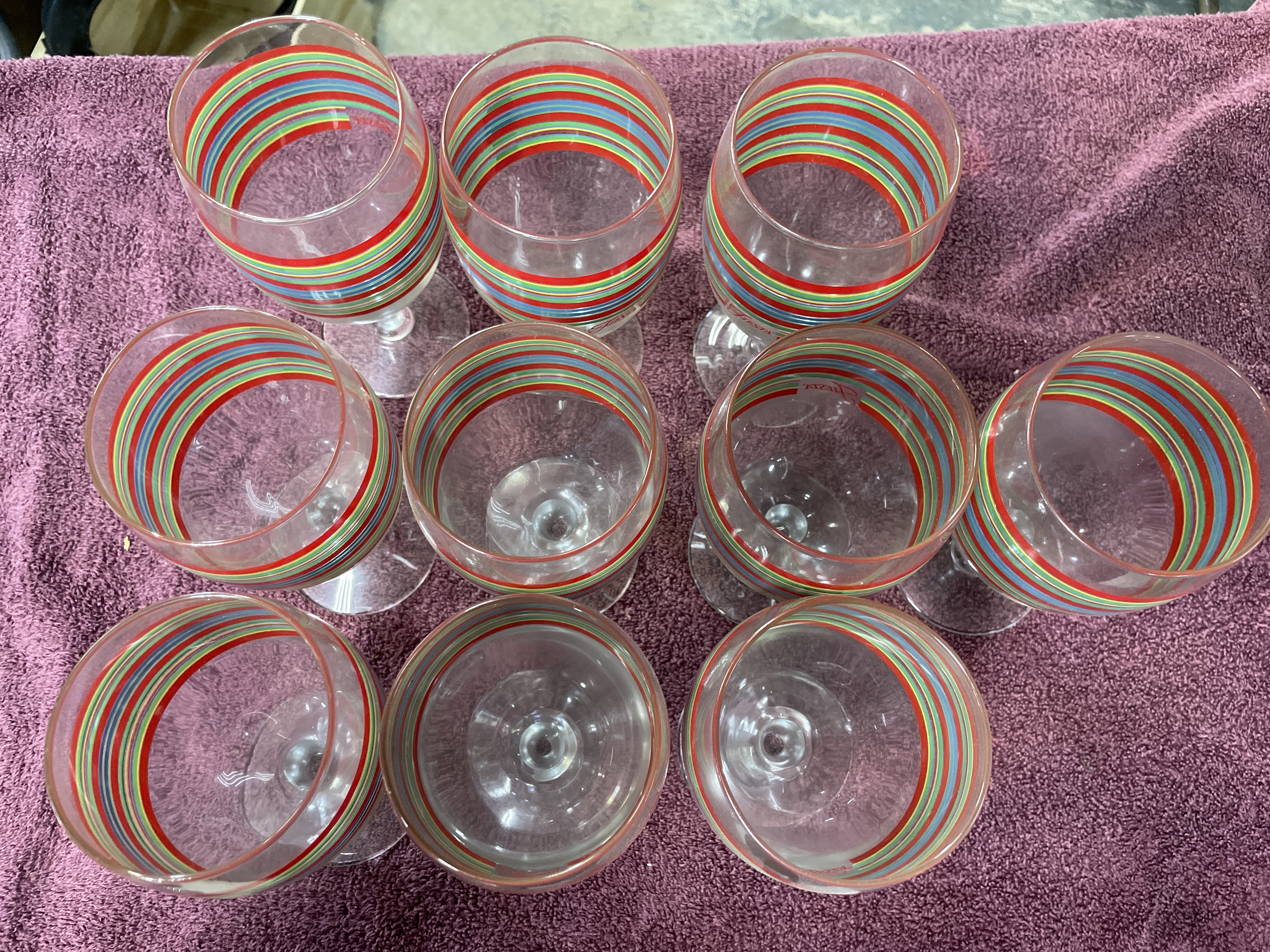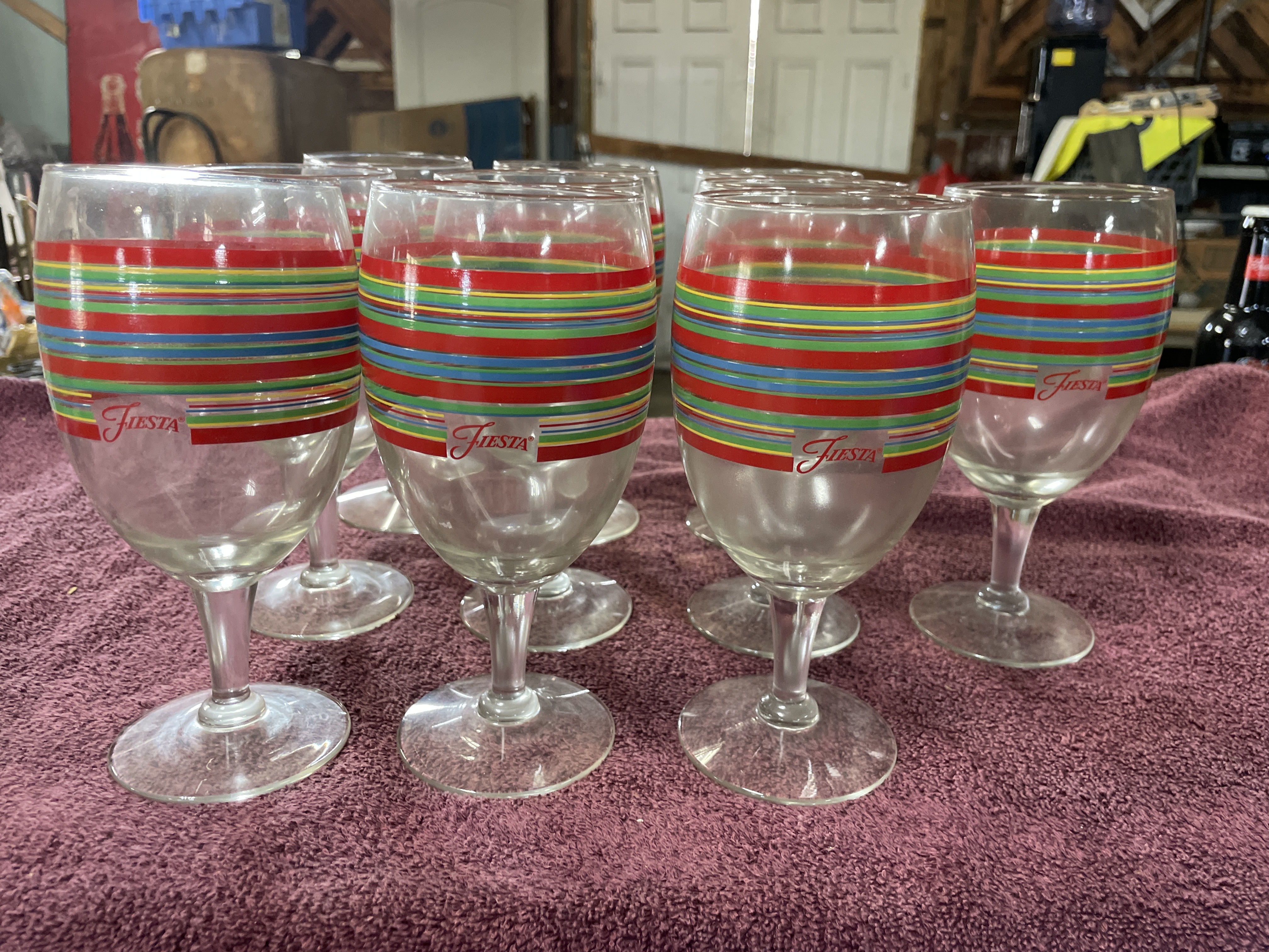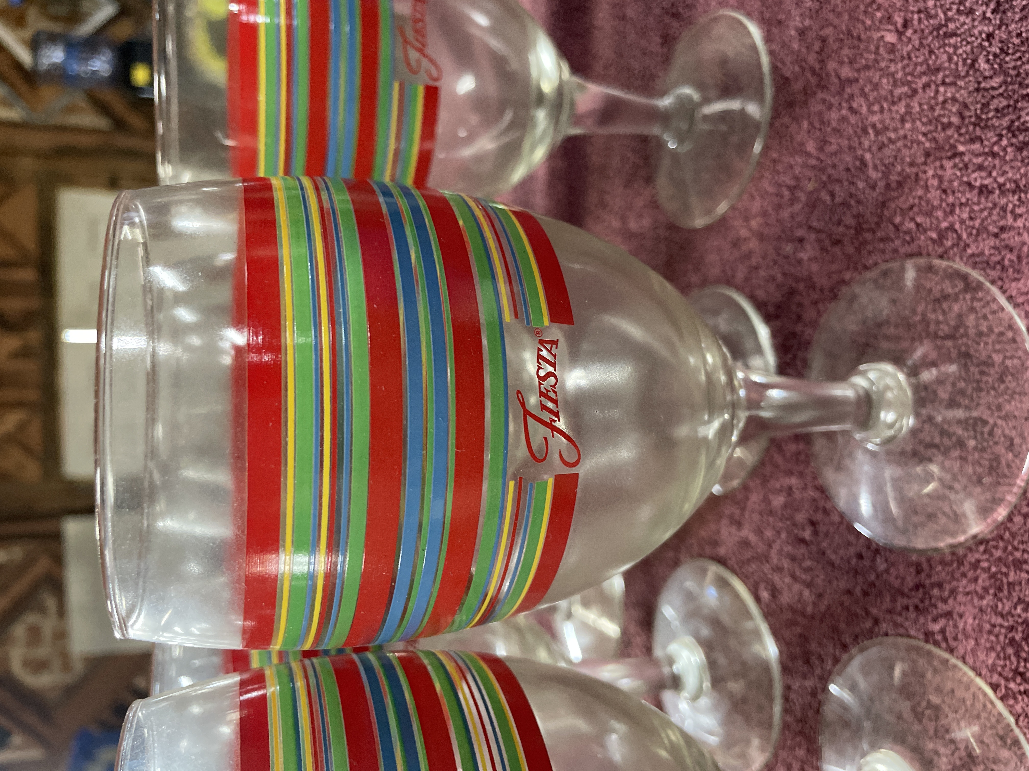 A collection of clear glass stemware featuring horizontal multicolored stripes and the Fiesta brand logo.