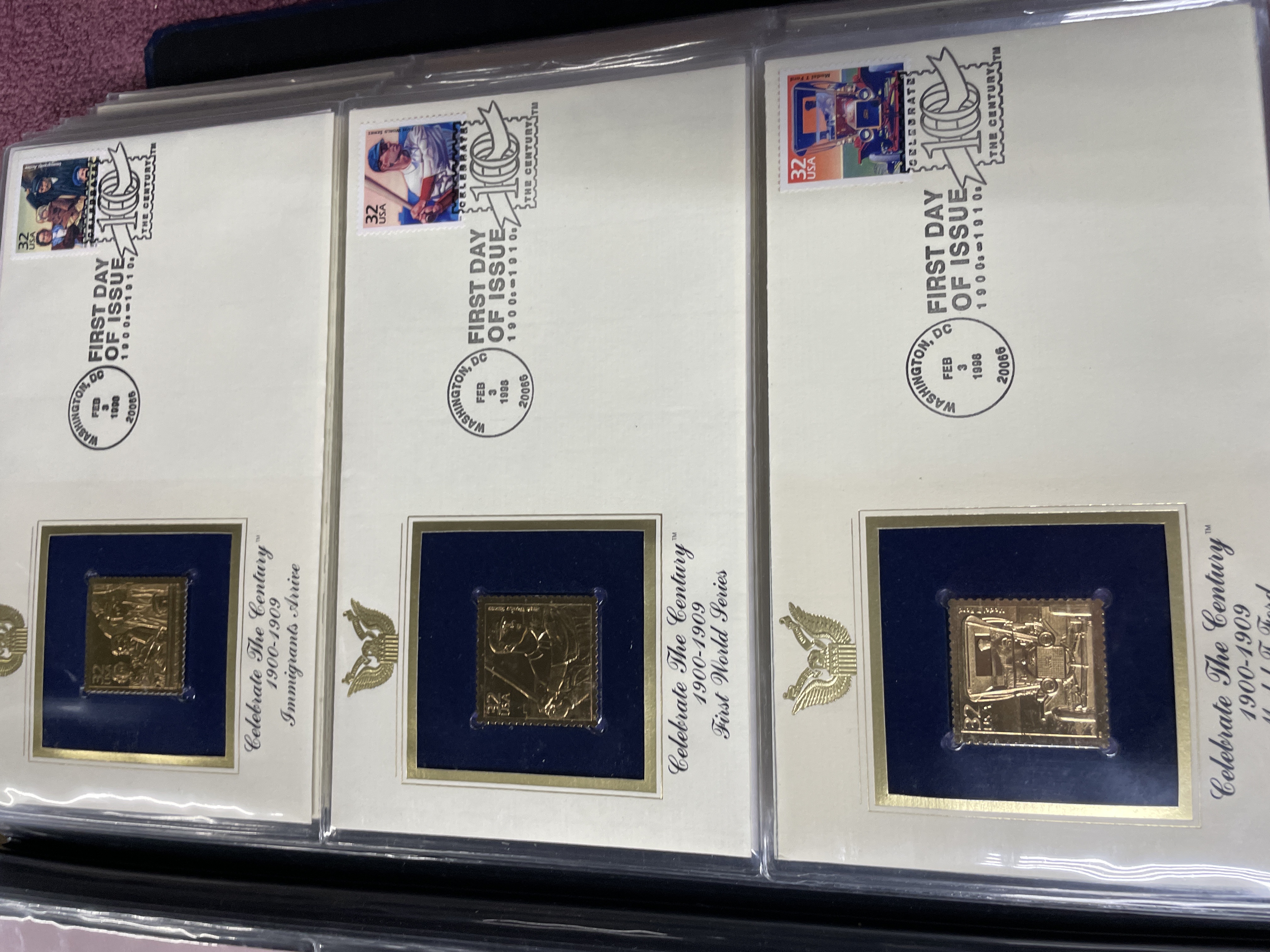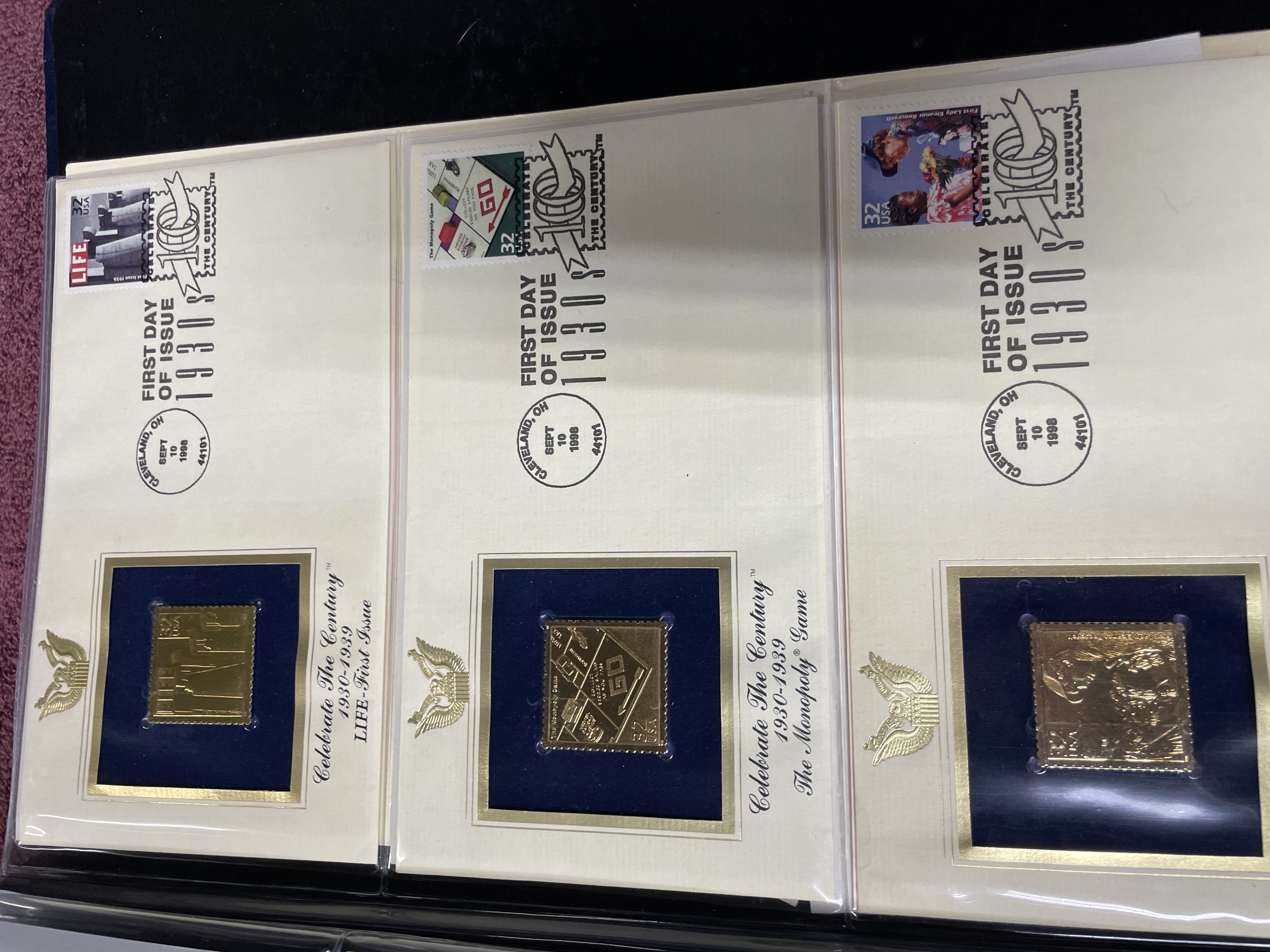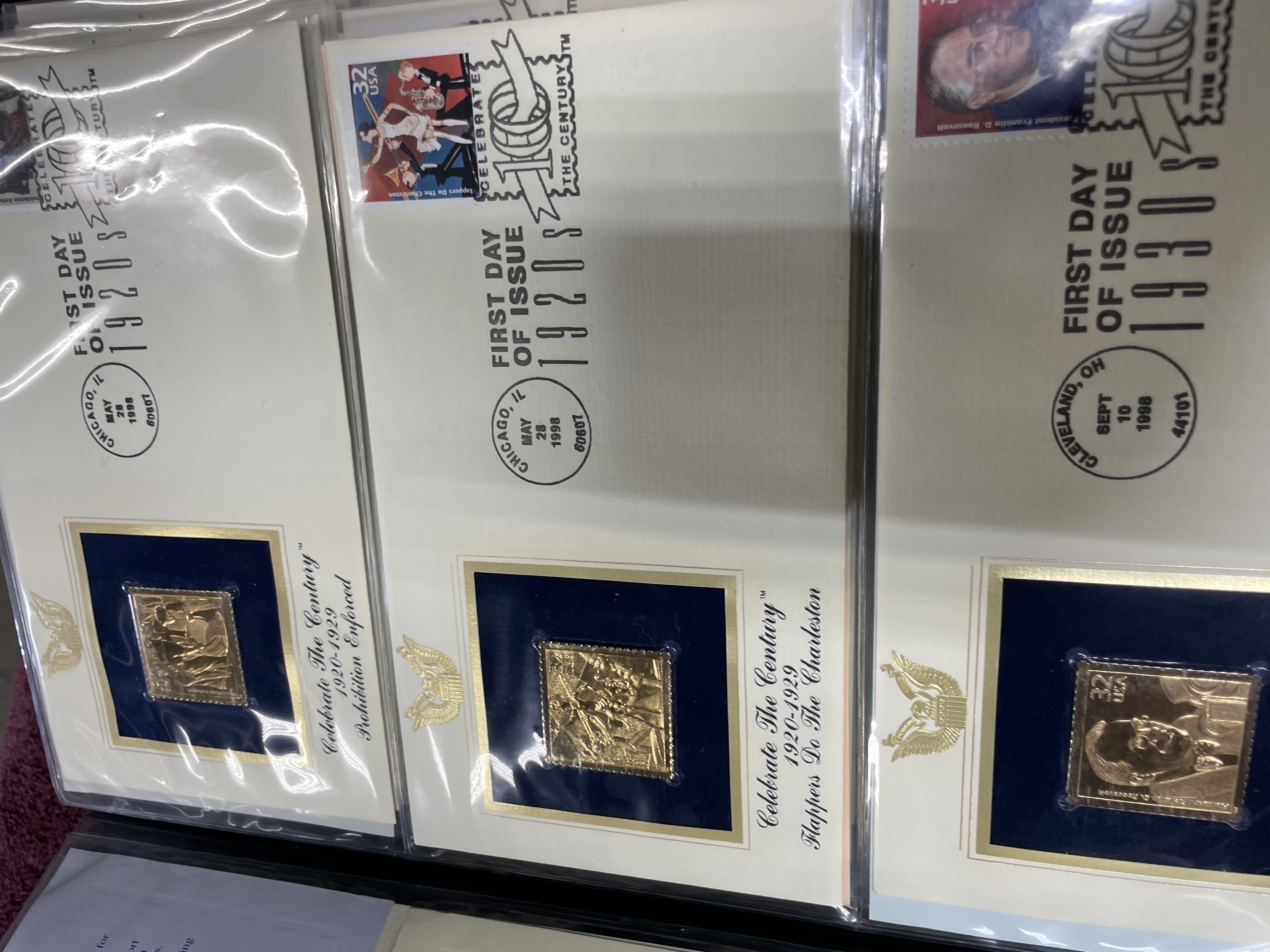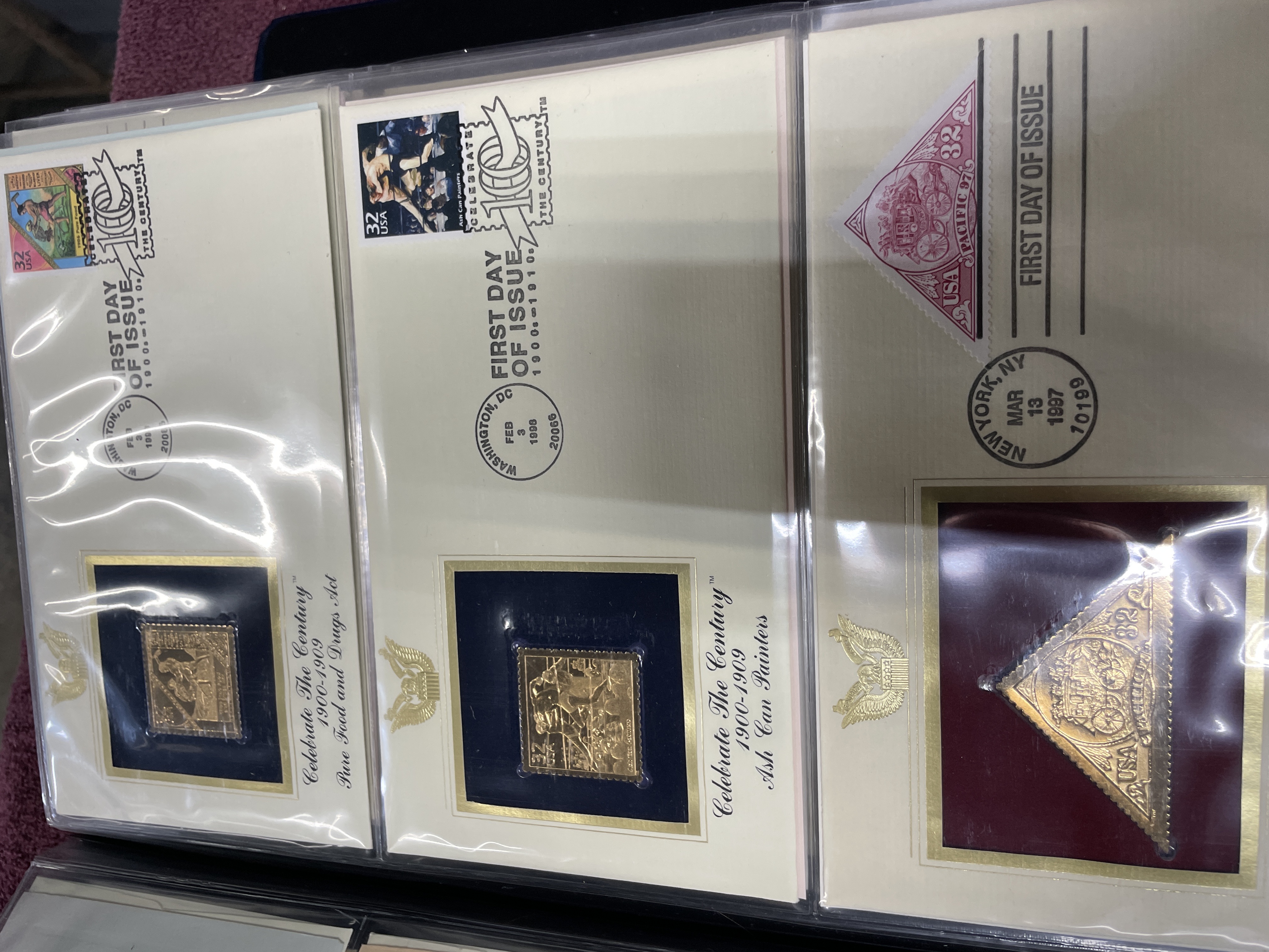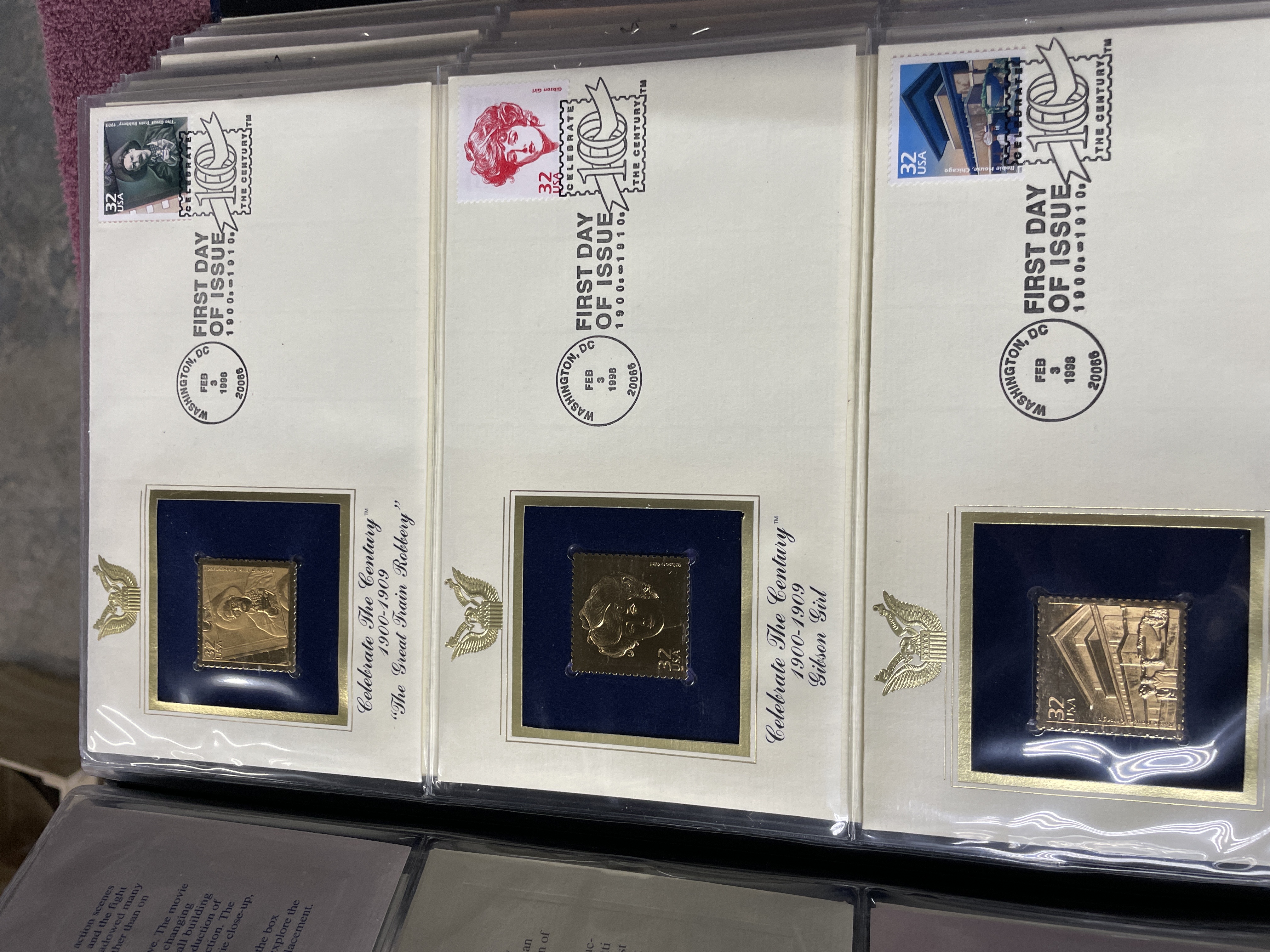 A collection of Postal Commemorative Society First Day Covers featuring 22kt gold foil proof replicas housed in a blue binder.