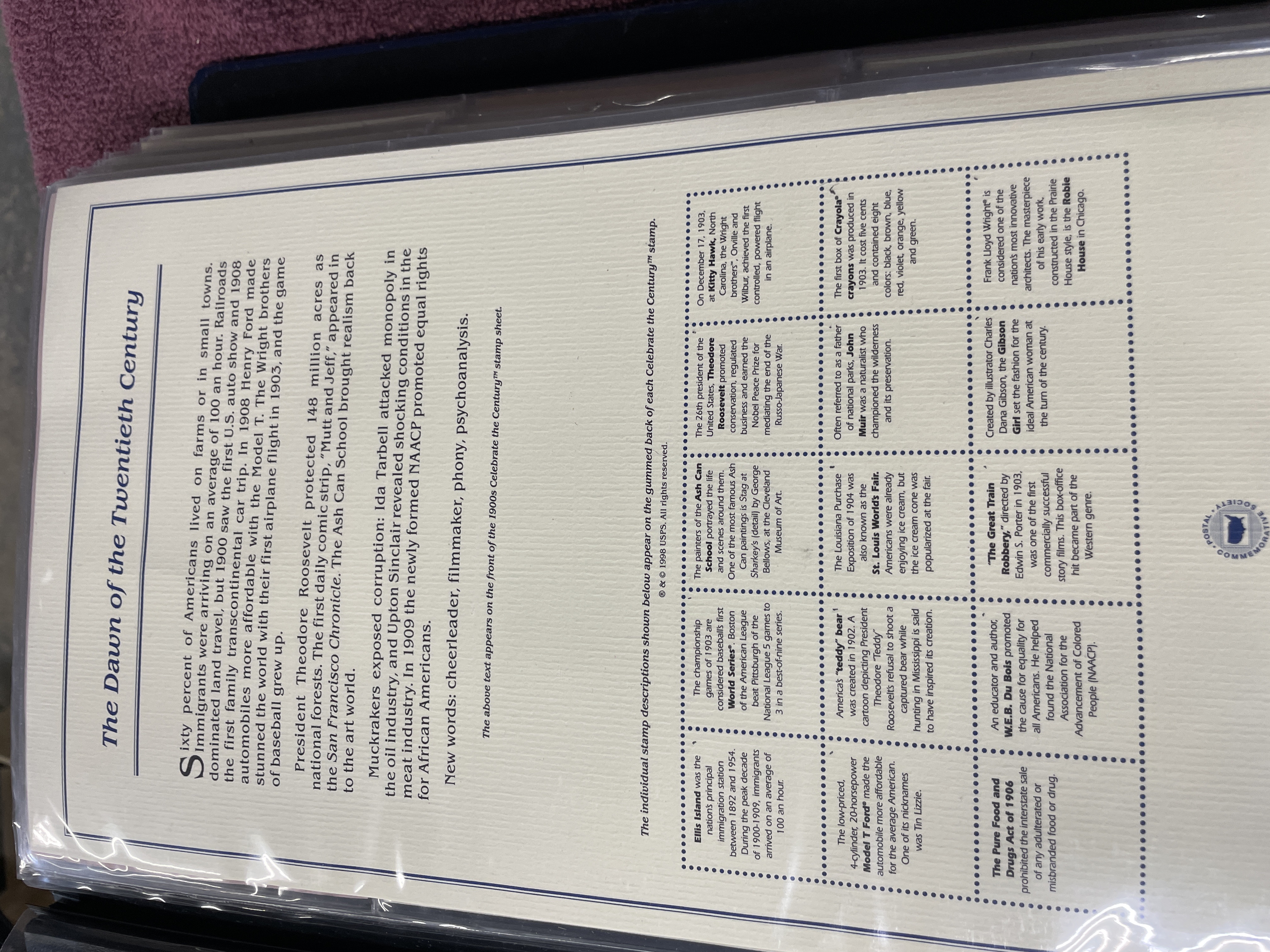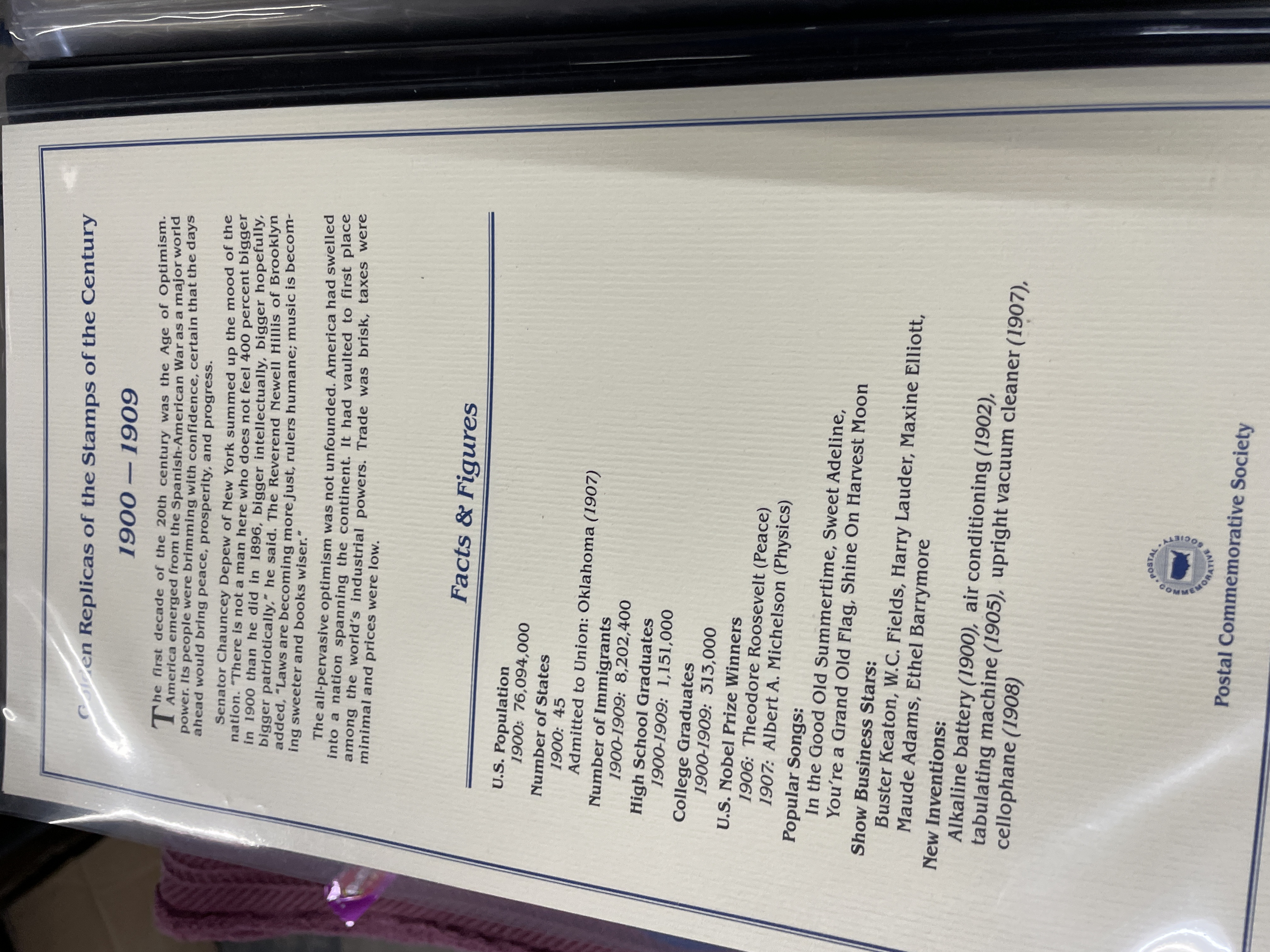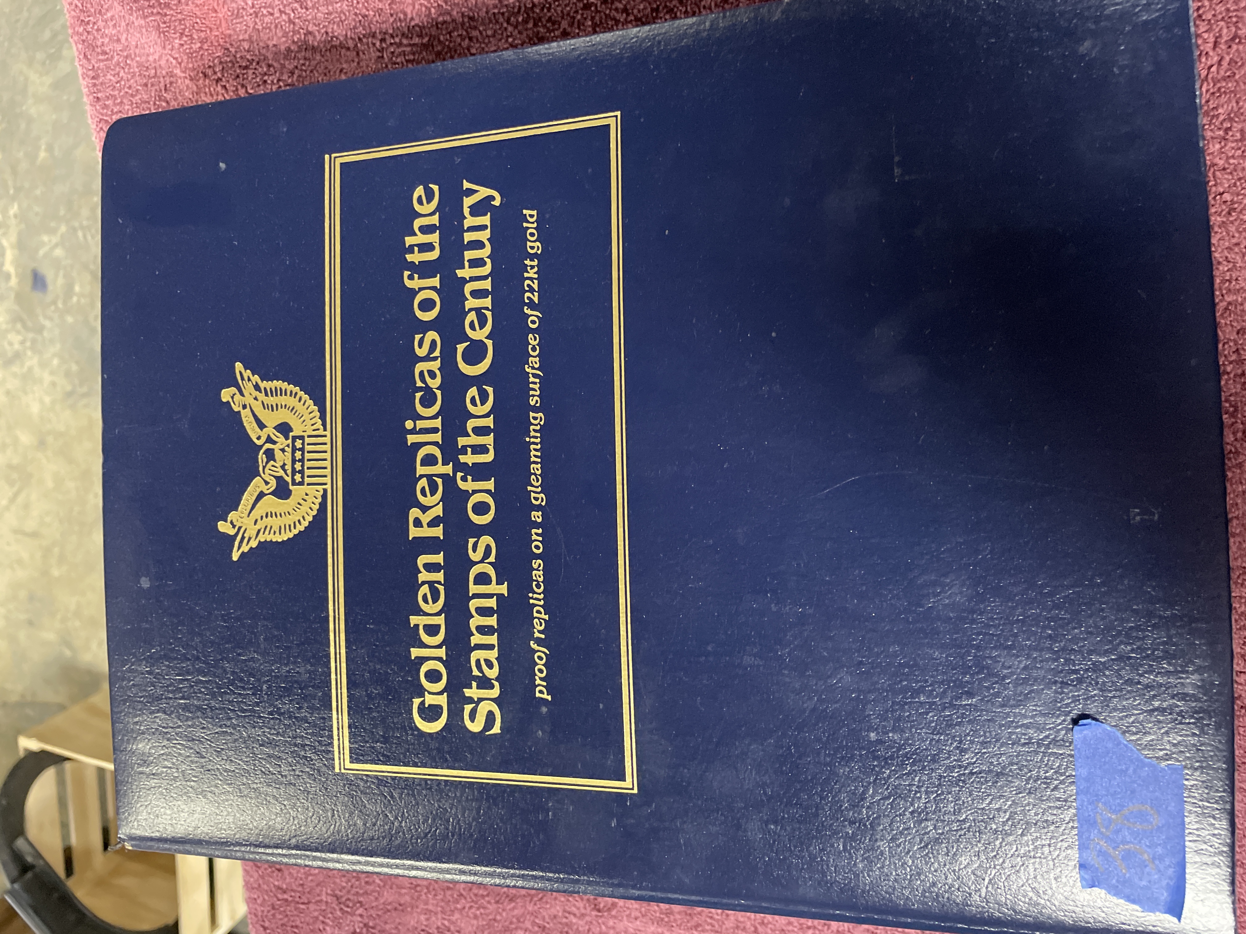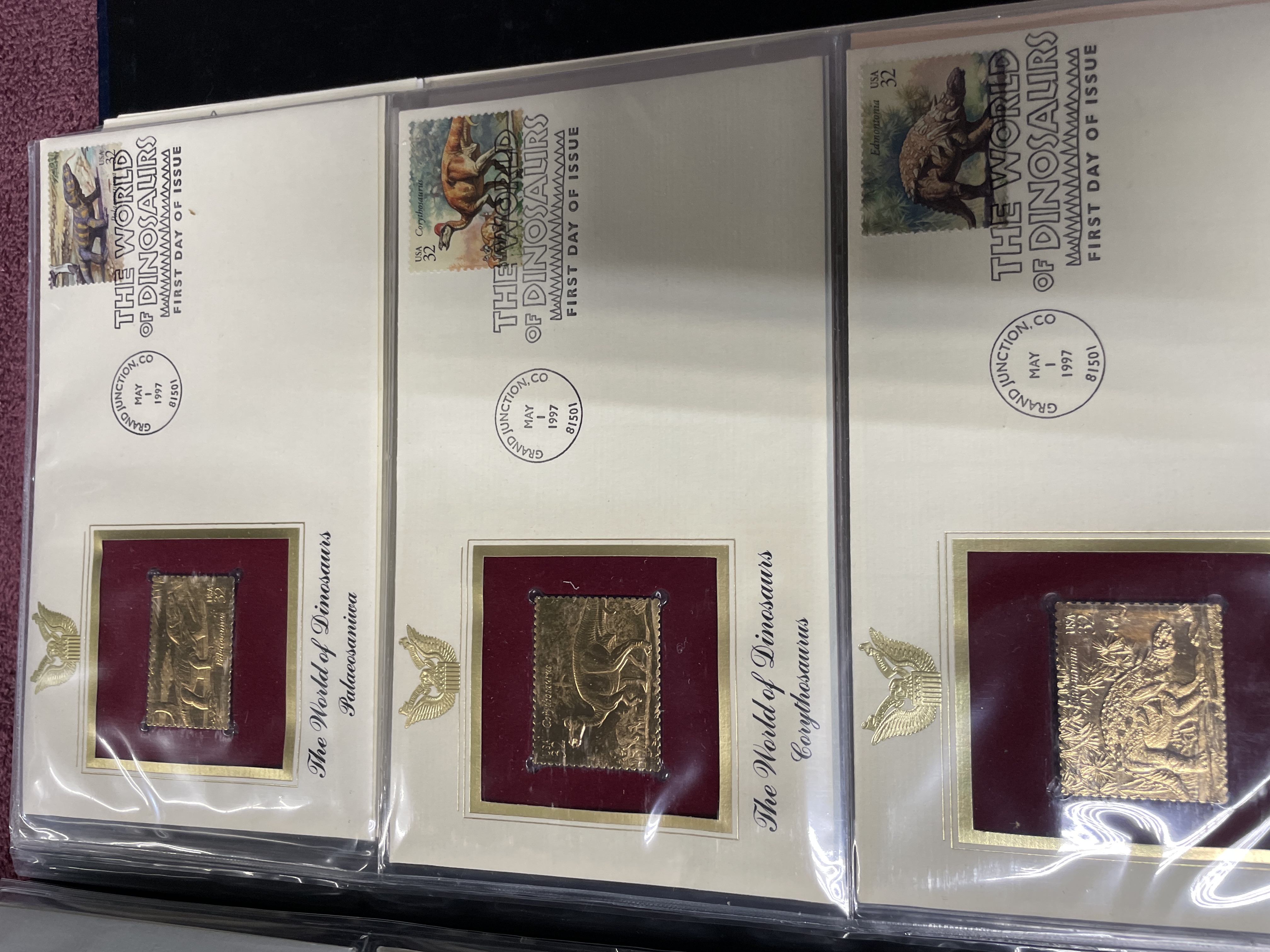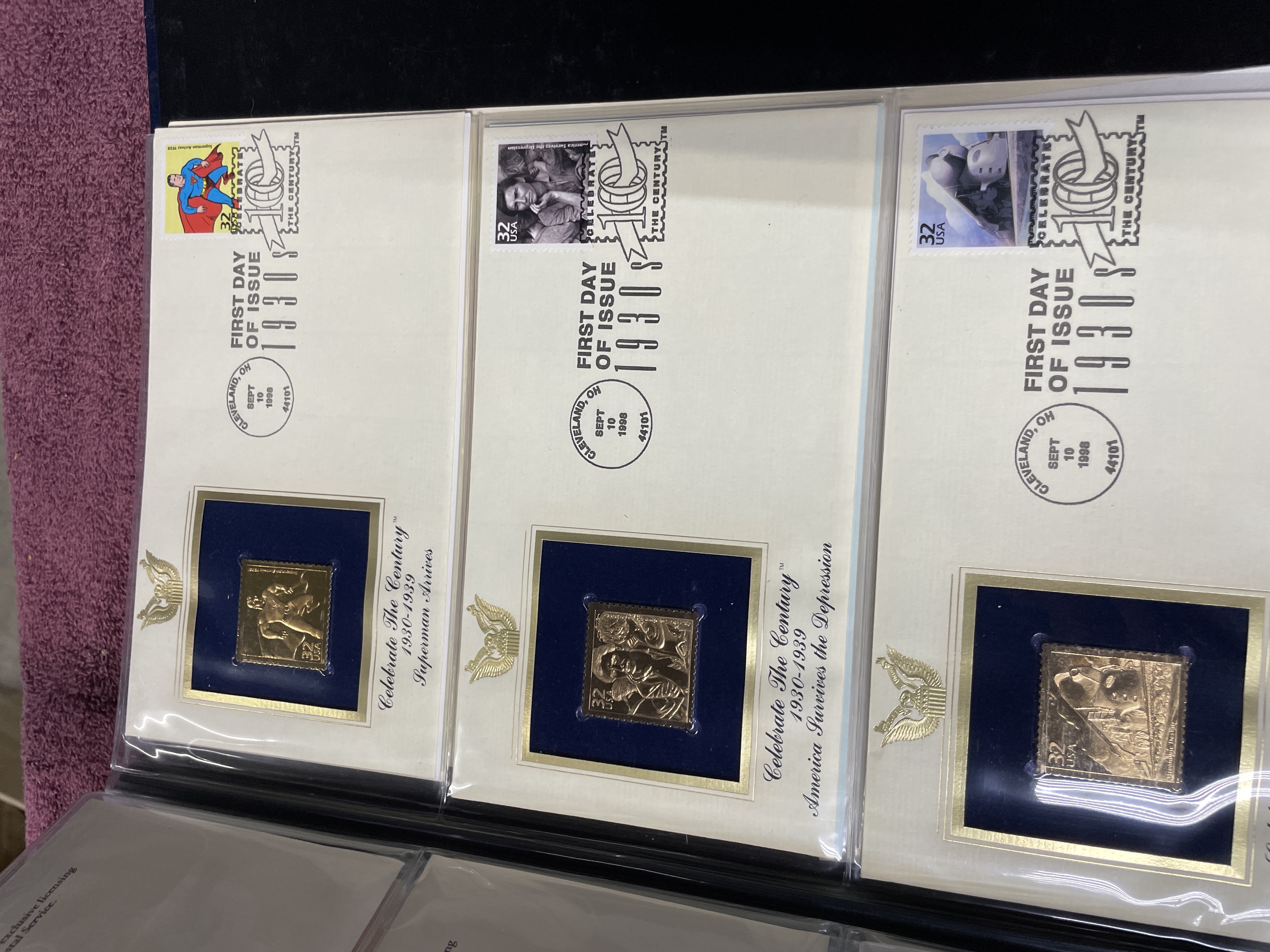 A collection of Postal Commemorative Society First Day Covers featuring 22kt gold foil proof replicas housed in a blue binder.