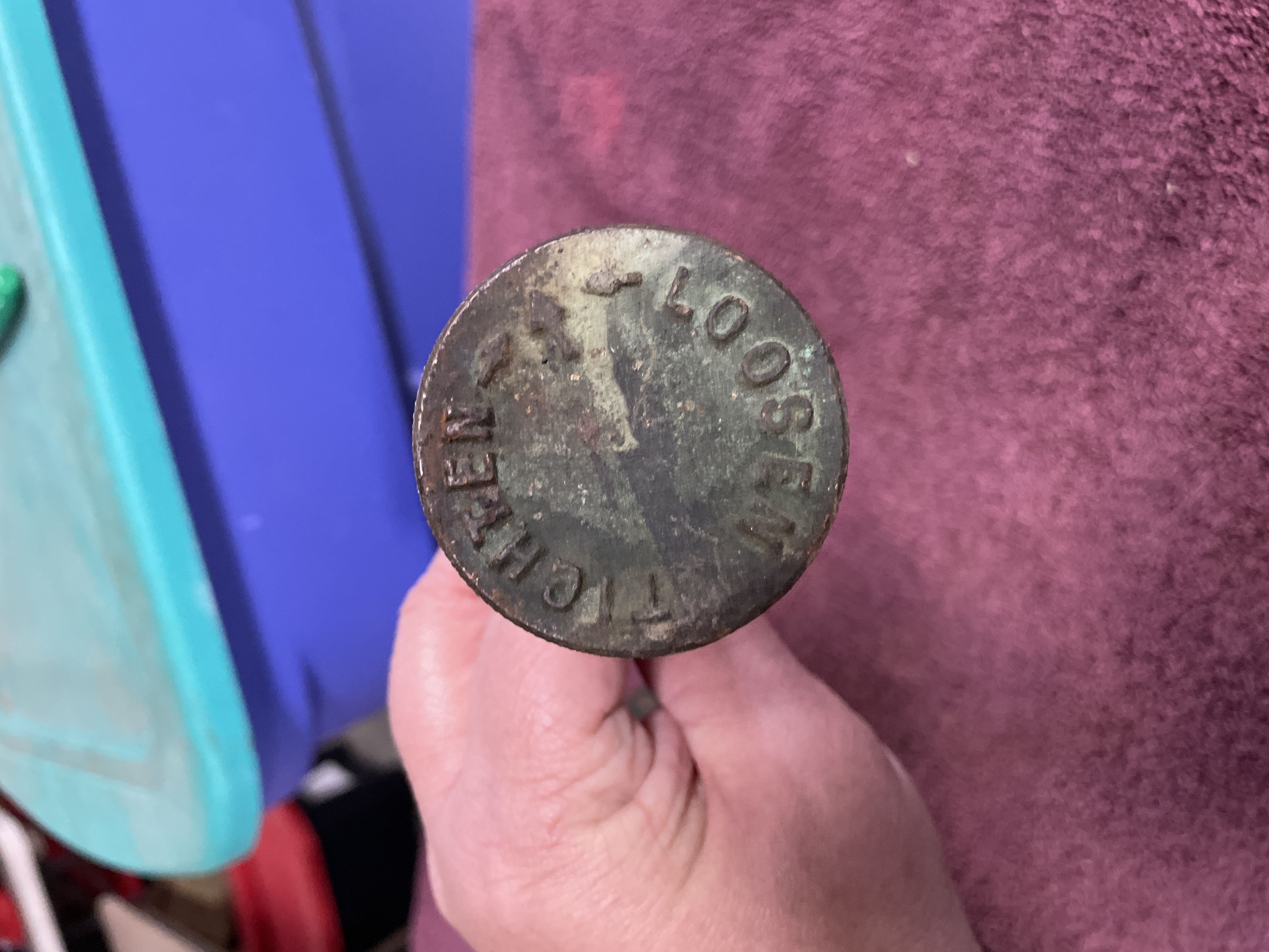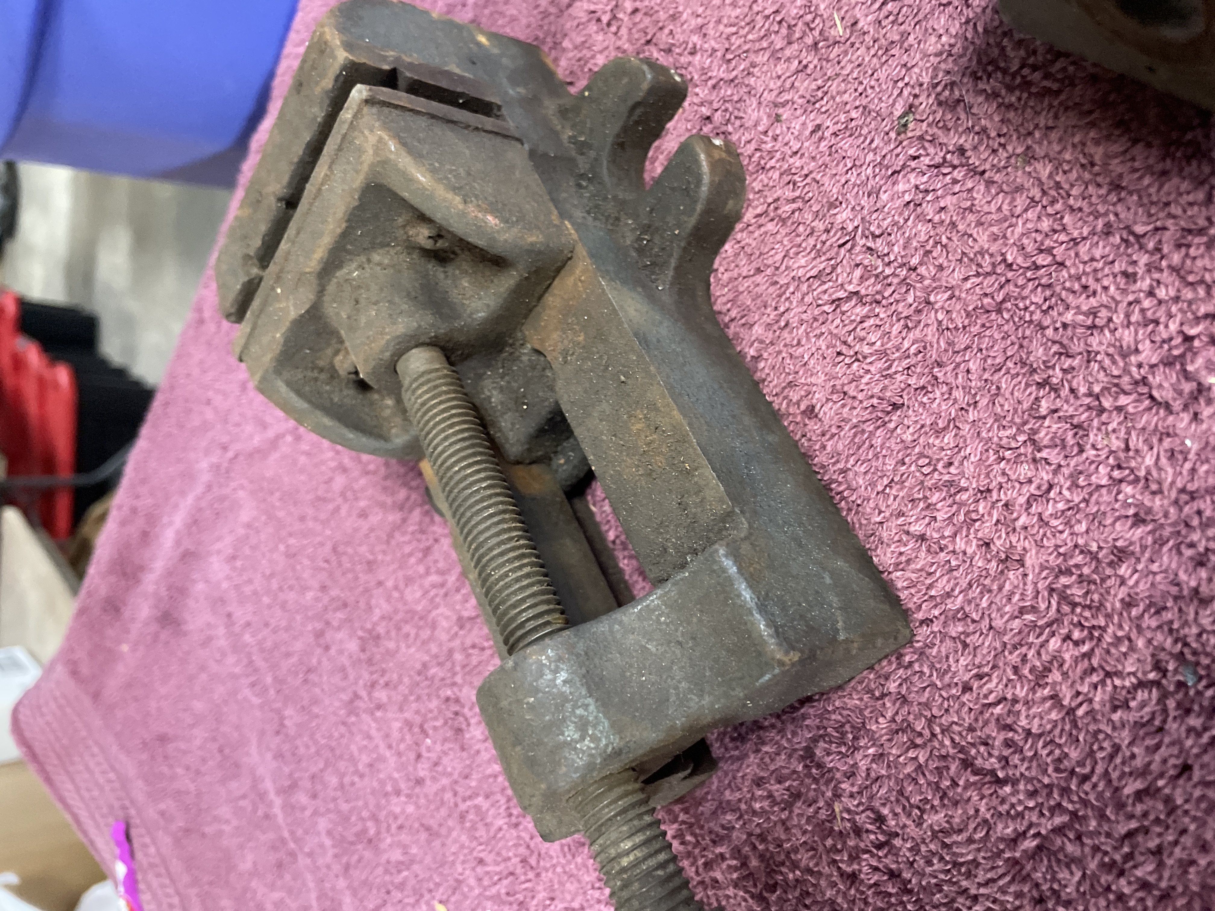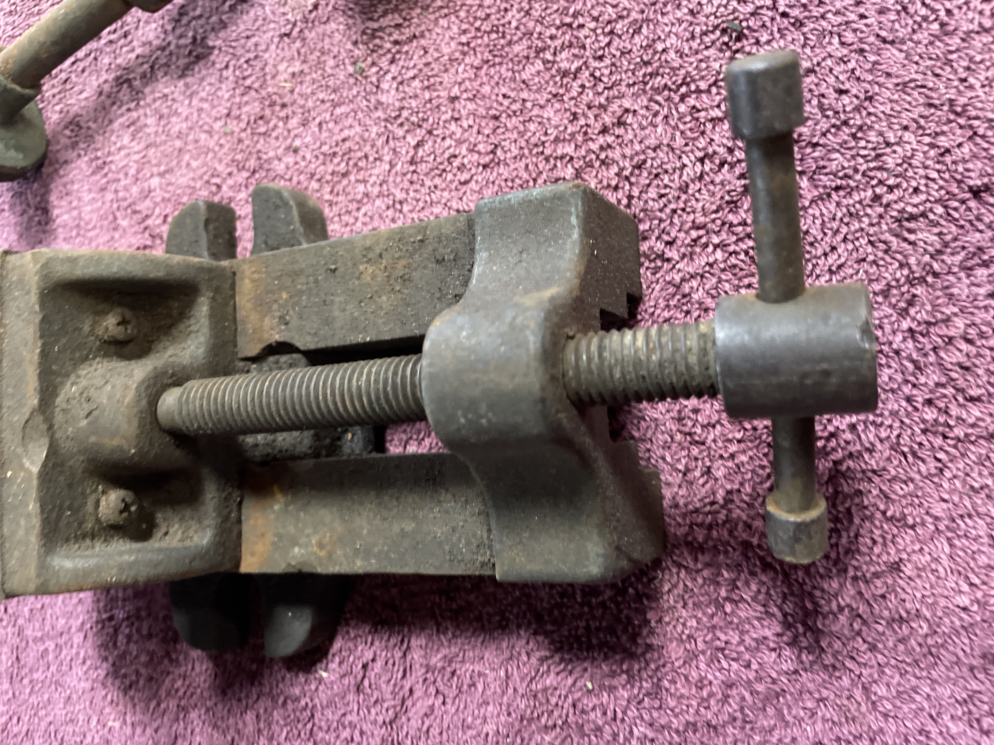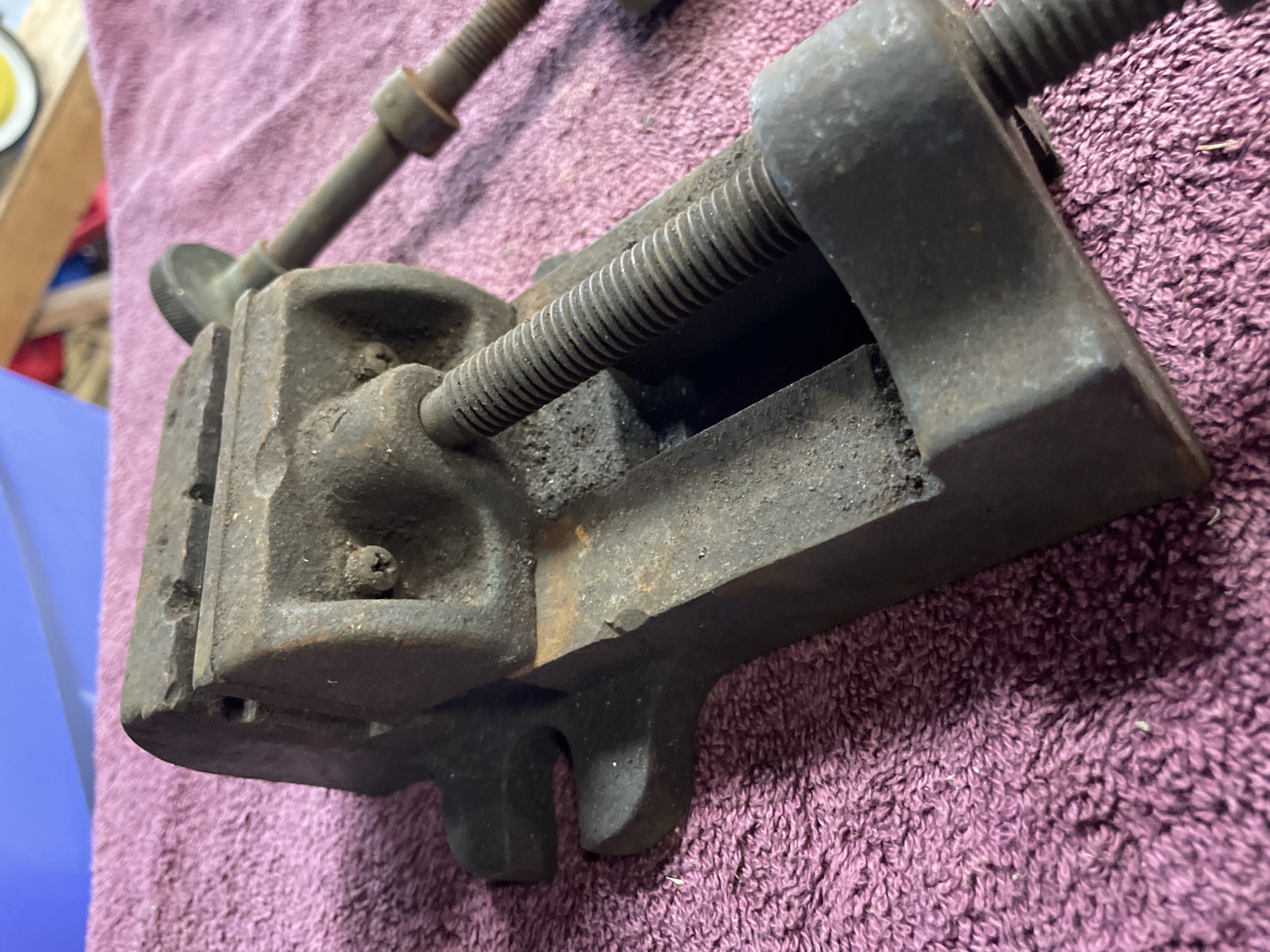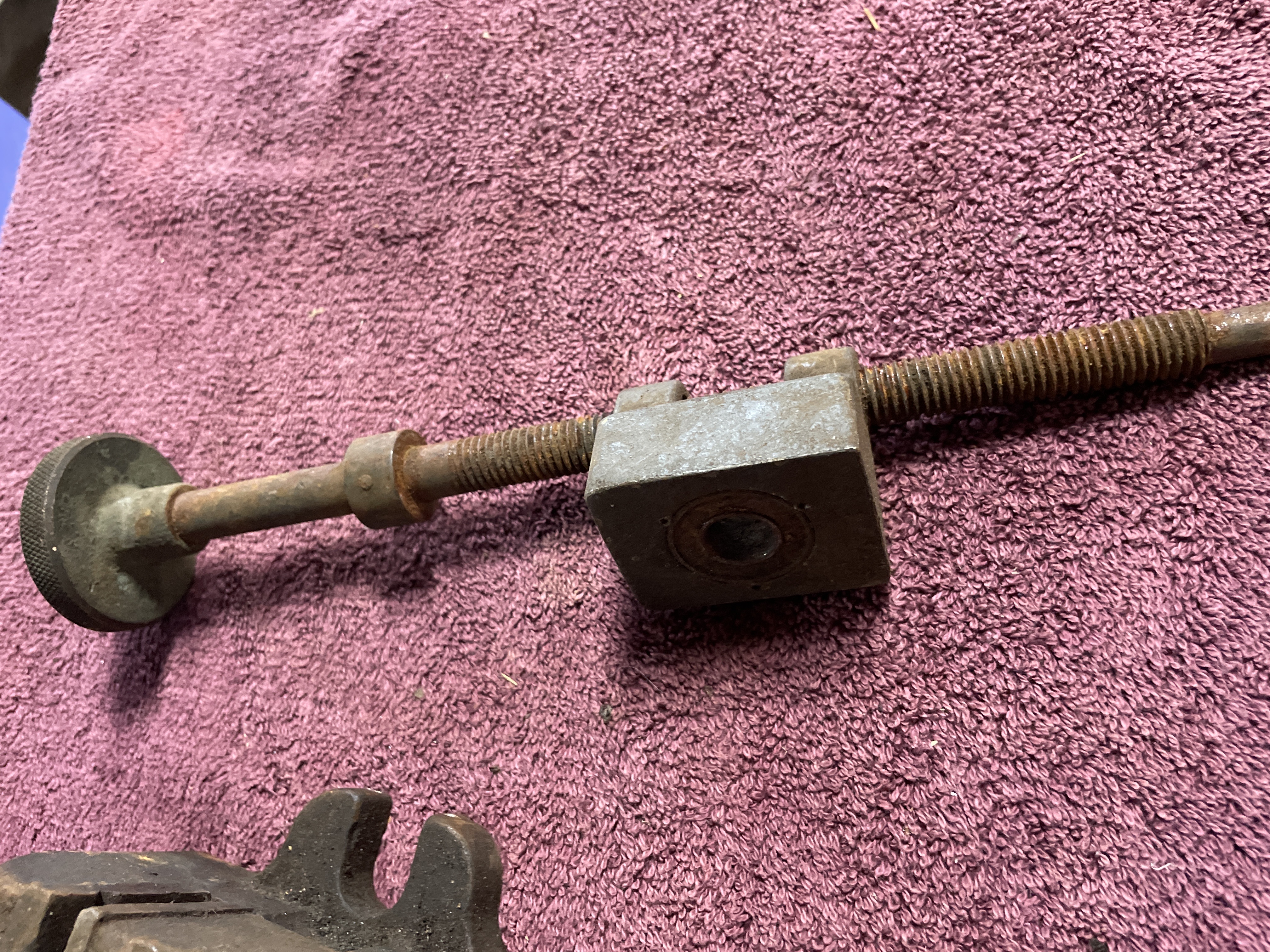 A collection of rusted dark grey industrial metal tools including a bench vise and a threaded rod assembly with a circular knob embossed with the words TIGHTEN and LOOSEN.