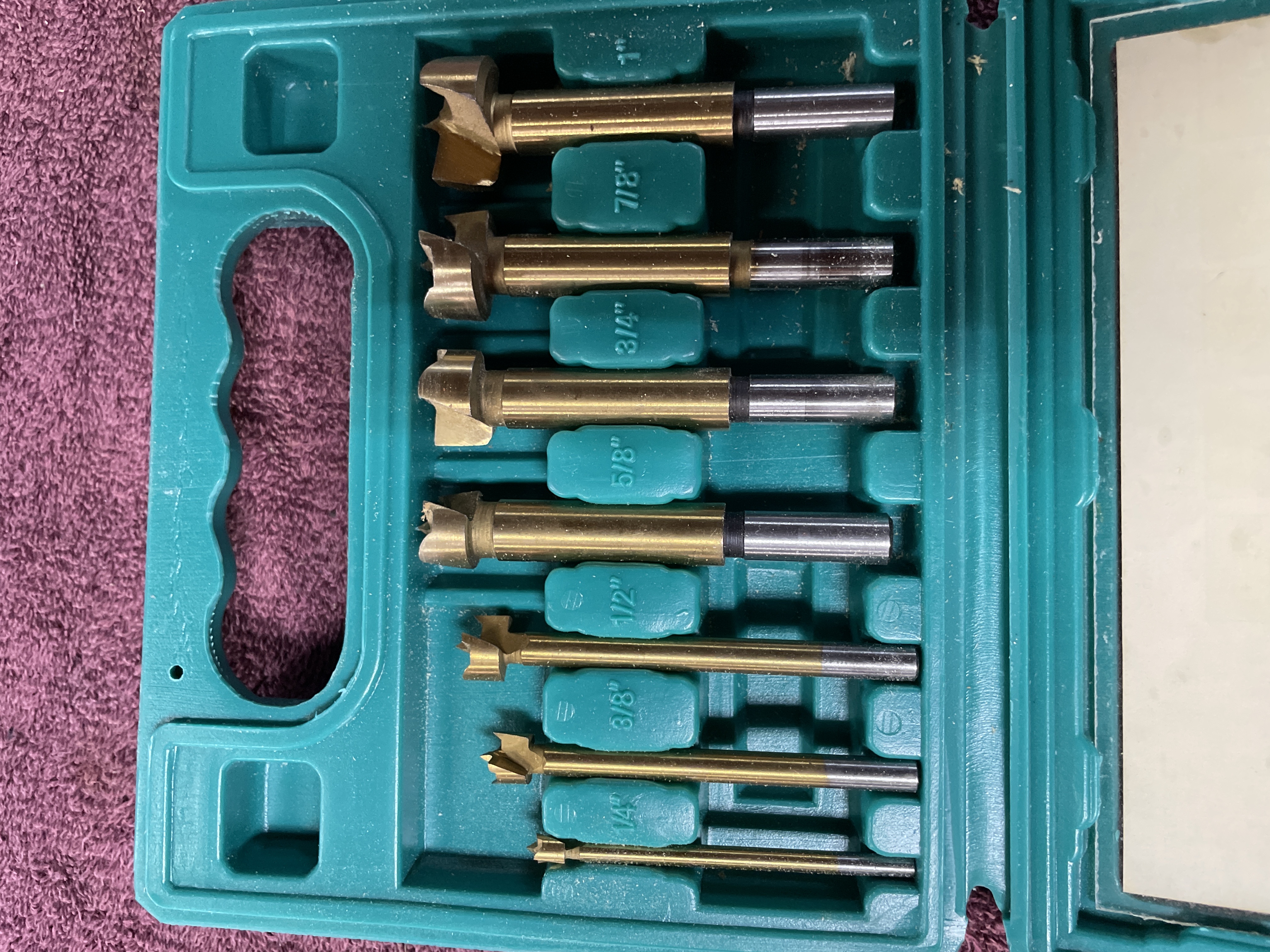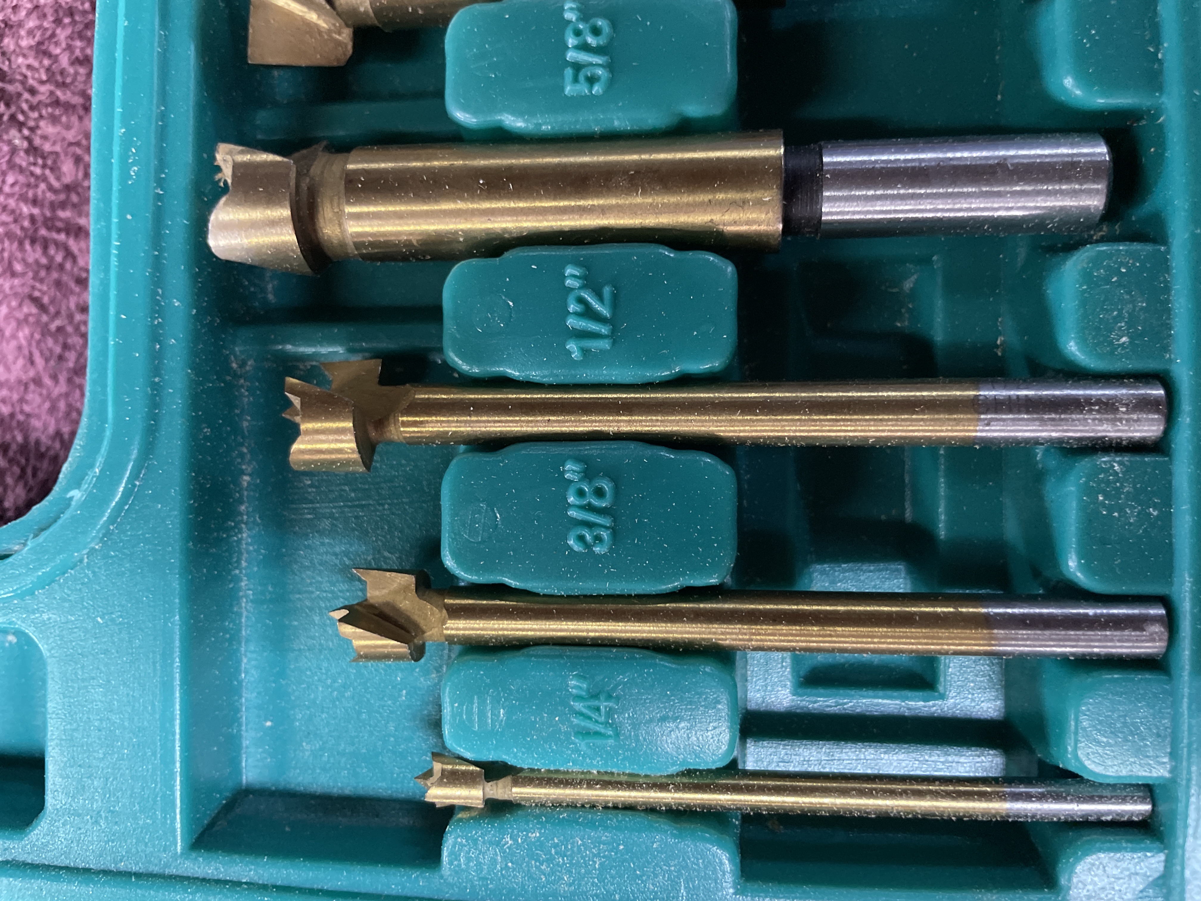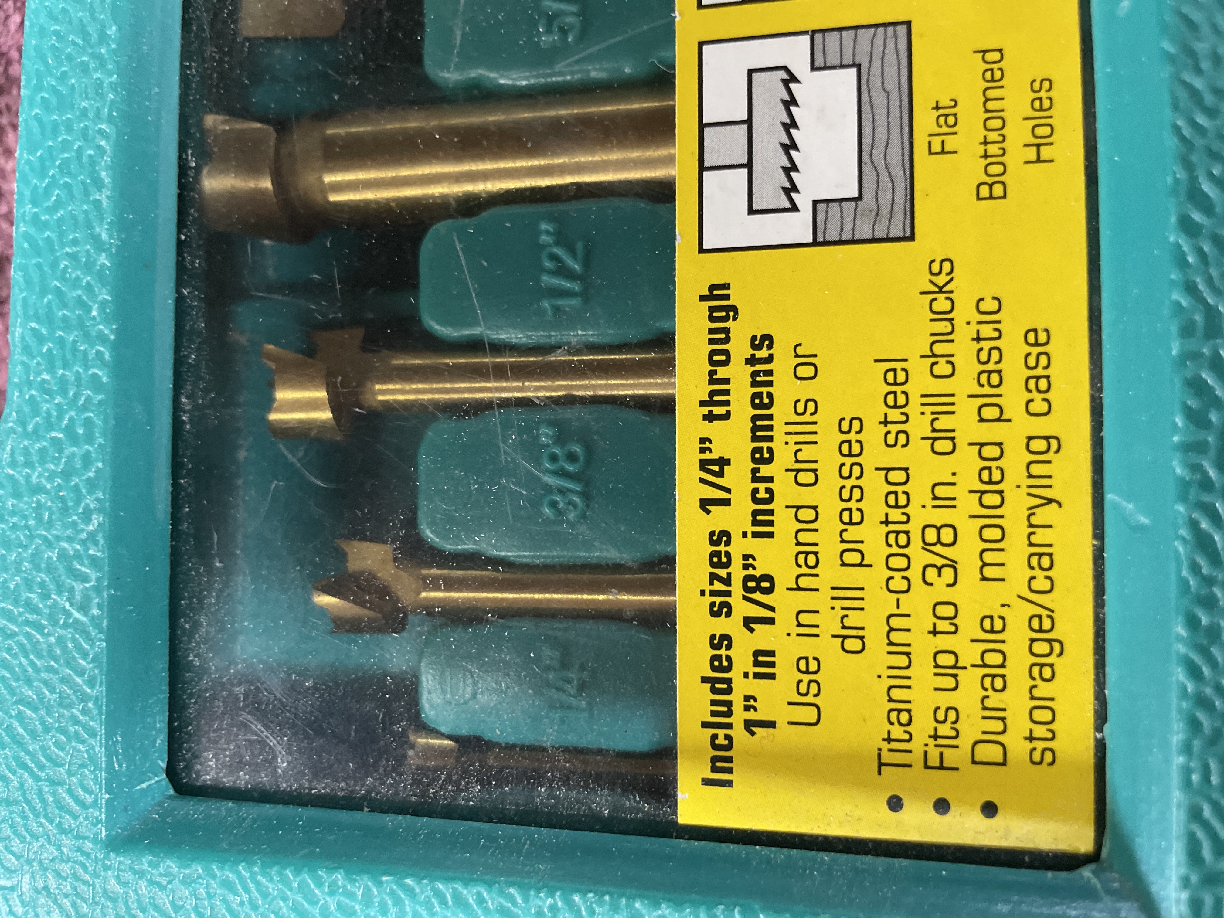 A collection of gold-toned titanium-coated steel Forstner bits in sizes ranging from 1/4 inch to 1 inch housed in a teal green molded plastic carrying case.