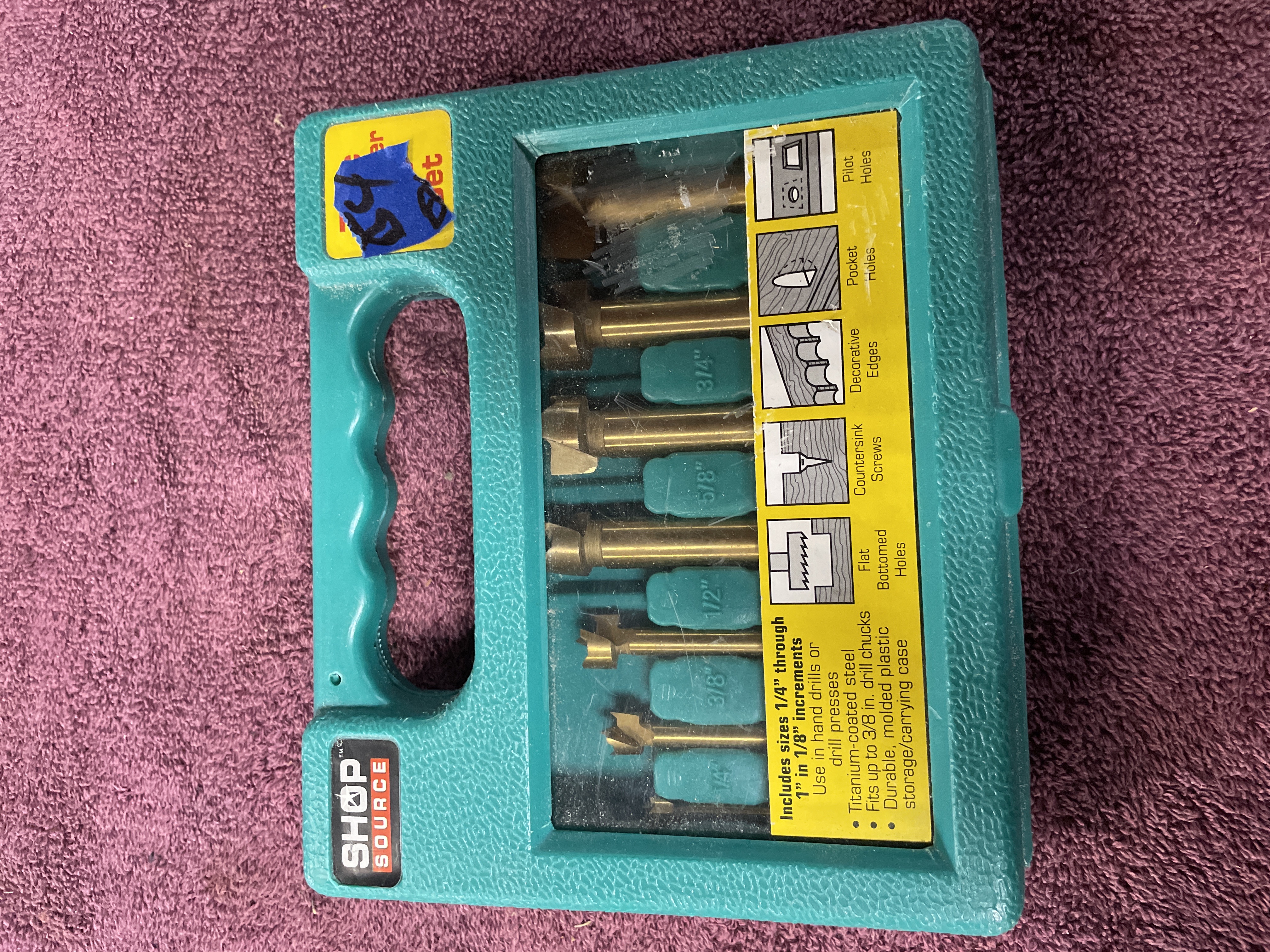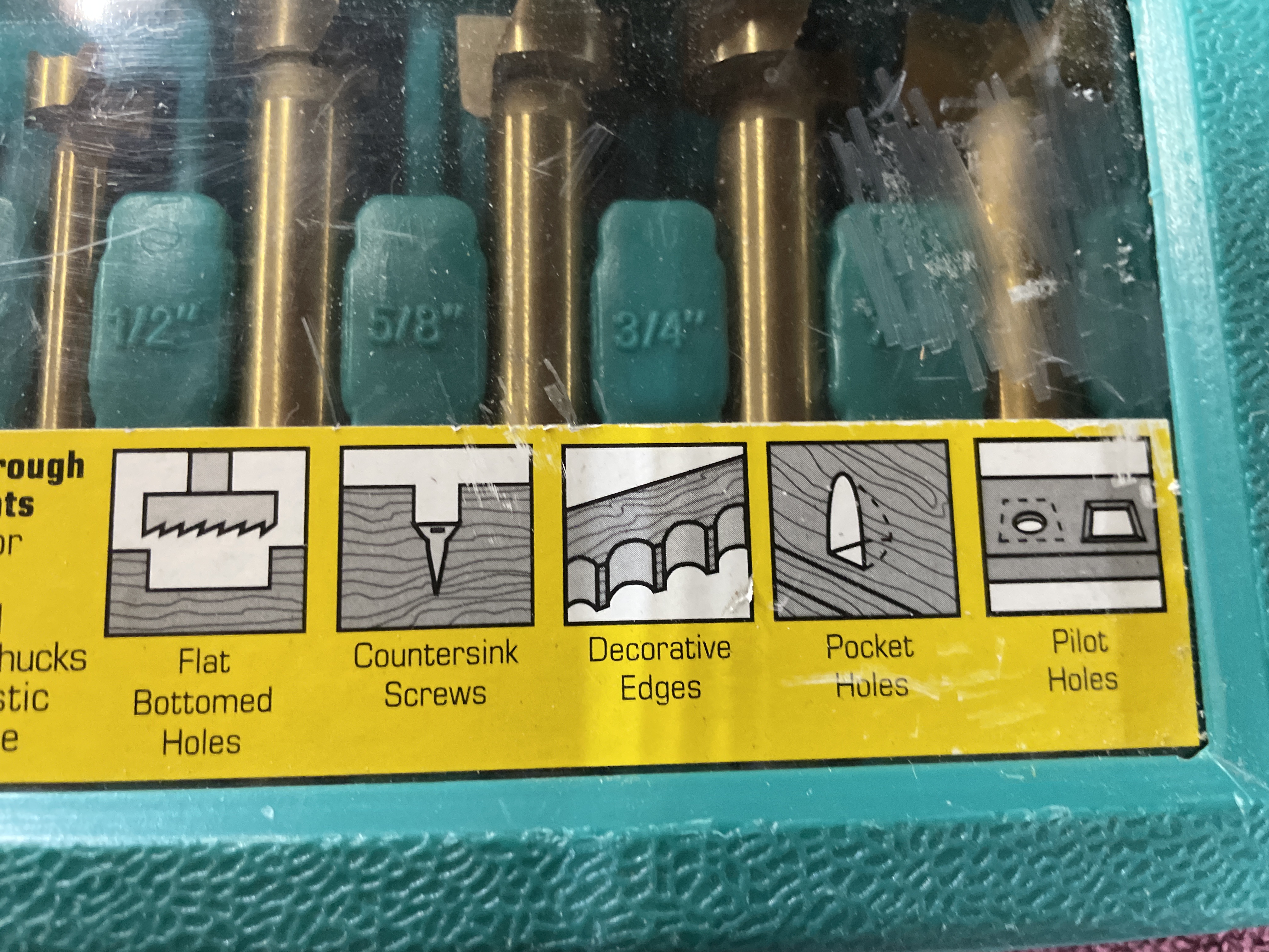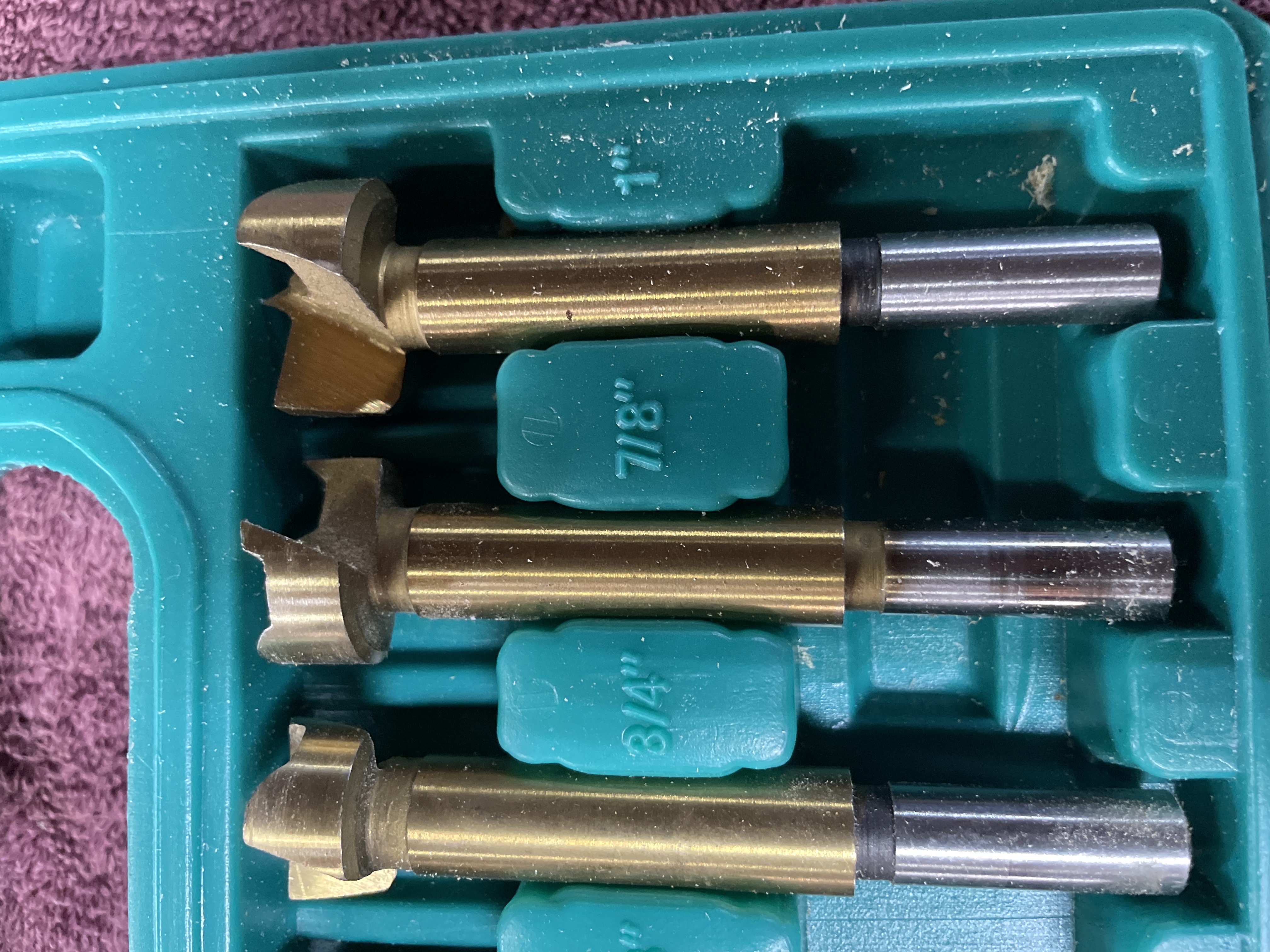 A collection of gold-toned titanium-coated steel Forstner bits in sizes ranging from 1/4 inch to 1 inch housed in a teal green molded plastic carrying case.