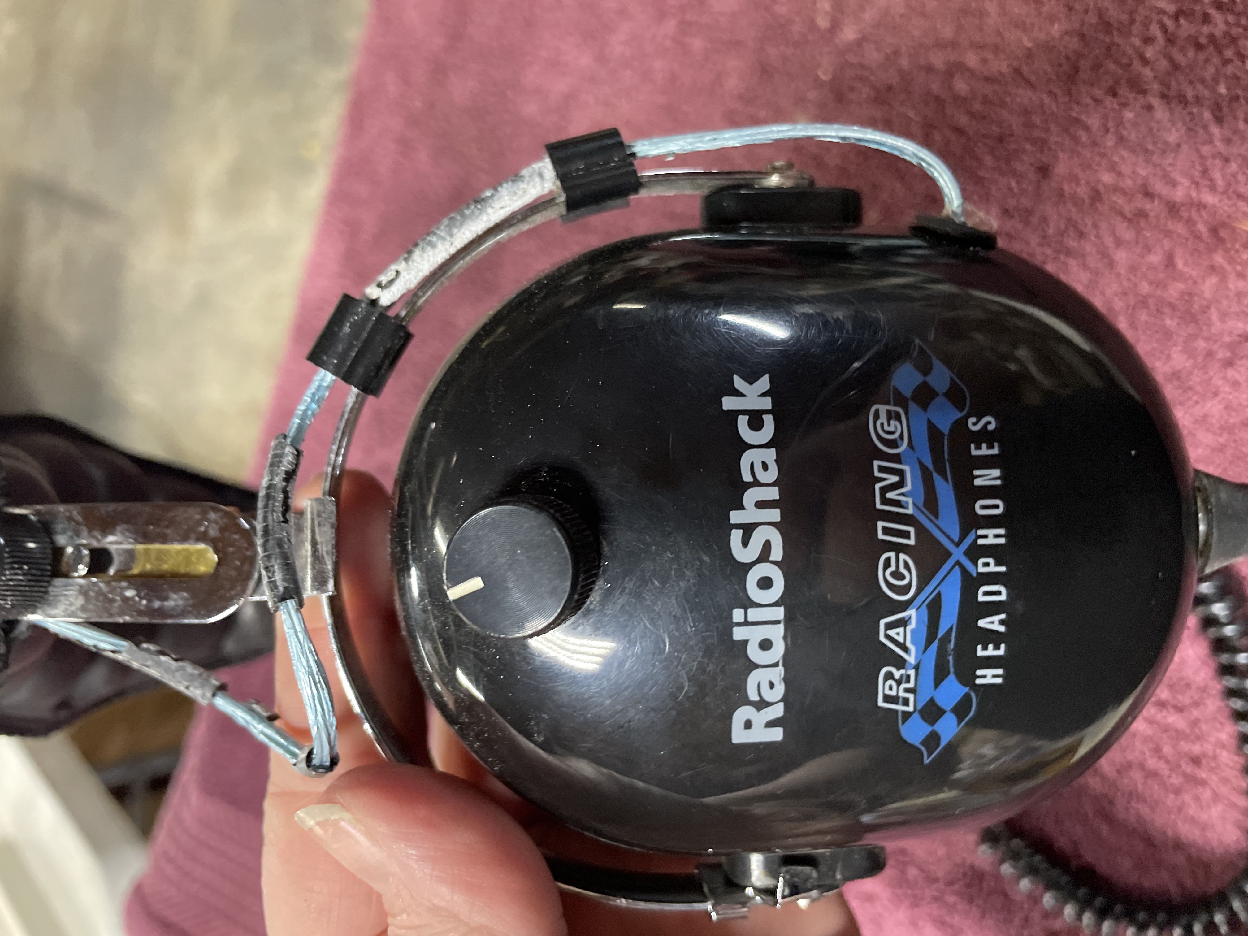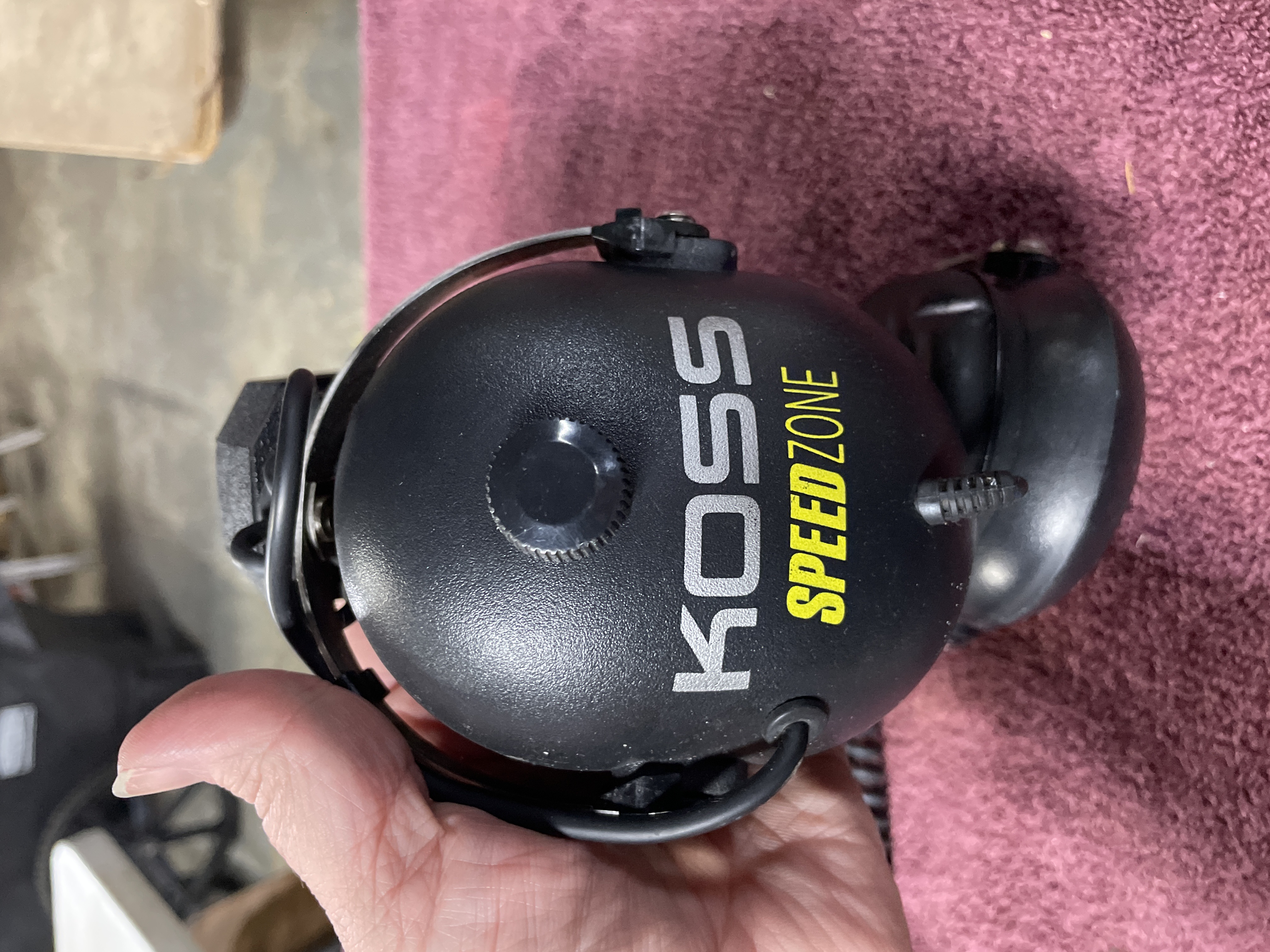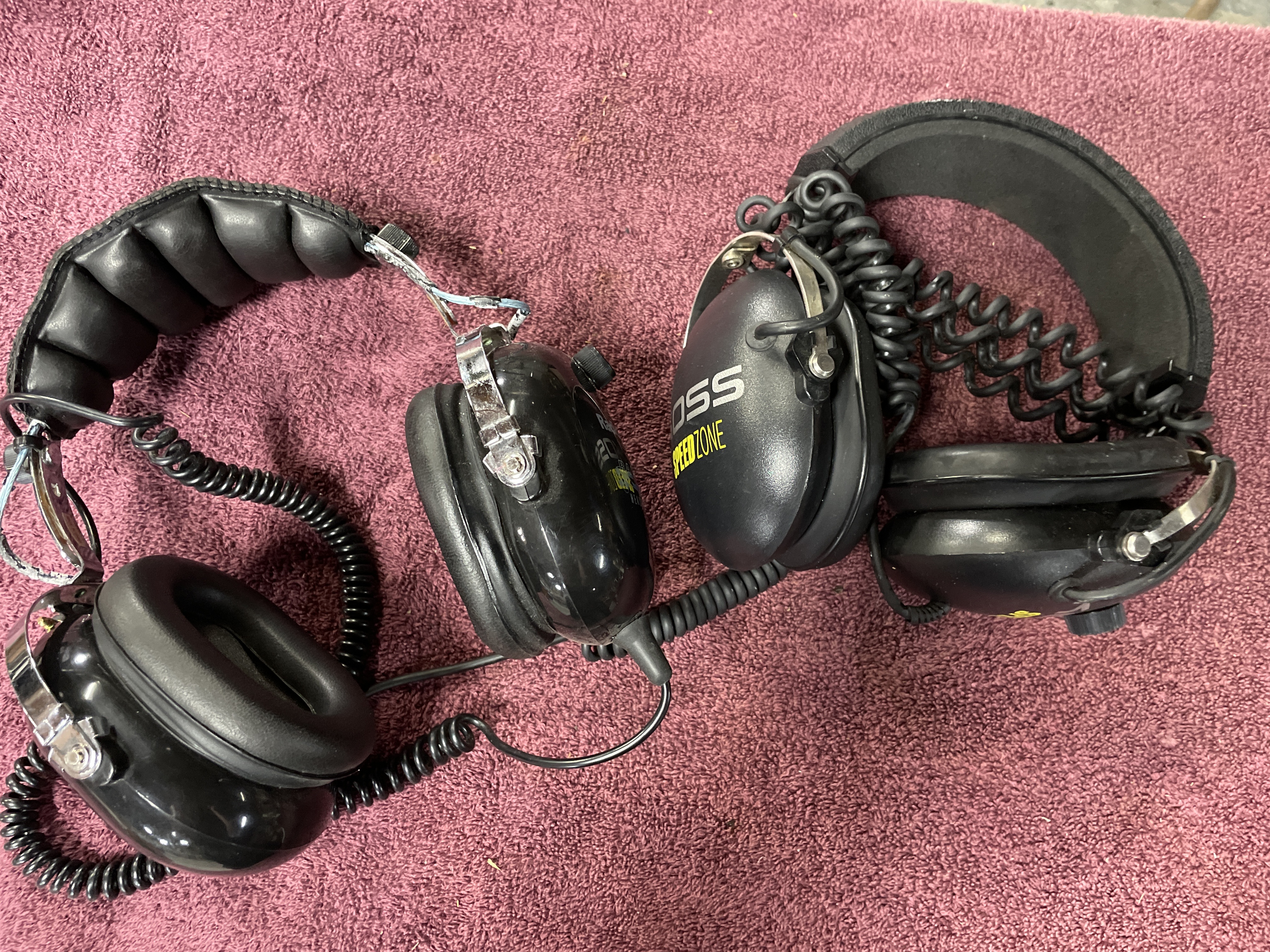 Two pairs of black noise reduction racing headphones featuring volume control knobs and coiled cords, including Koss Speedzone and RadioShack models.