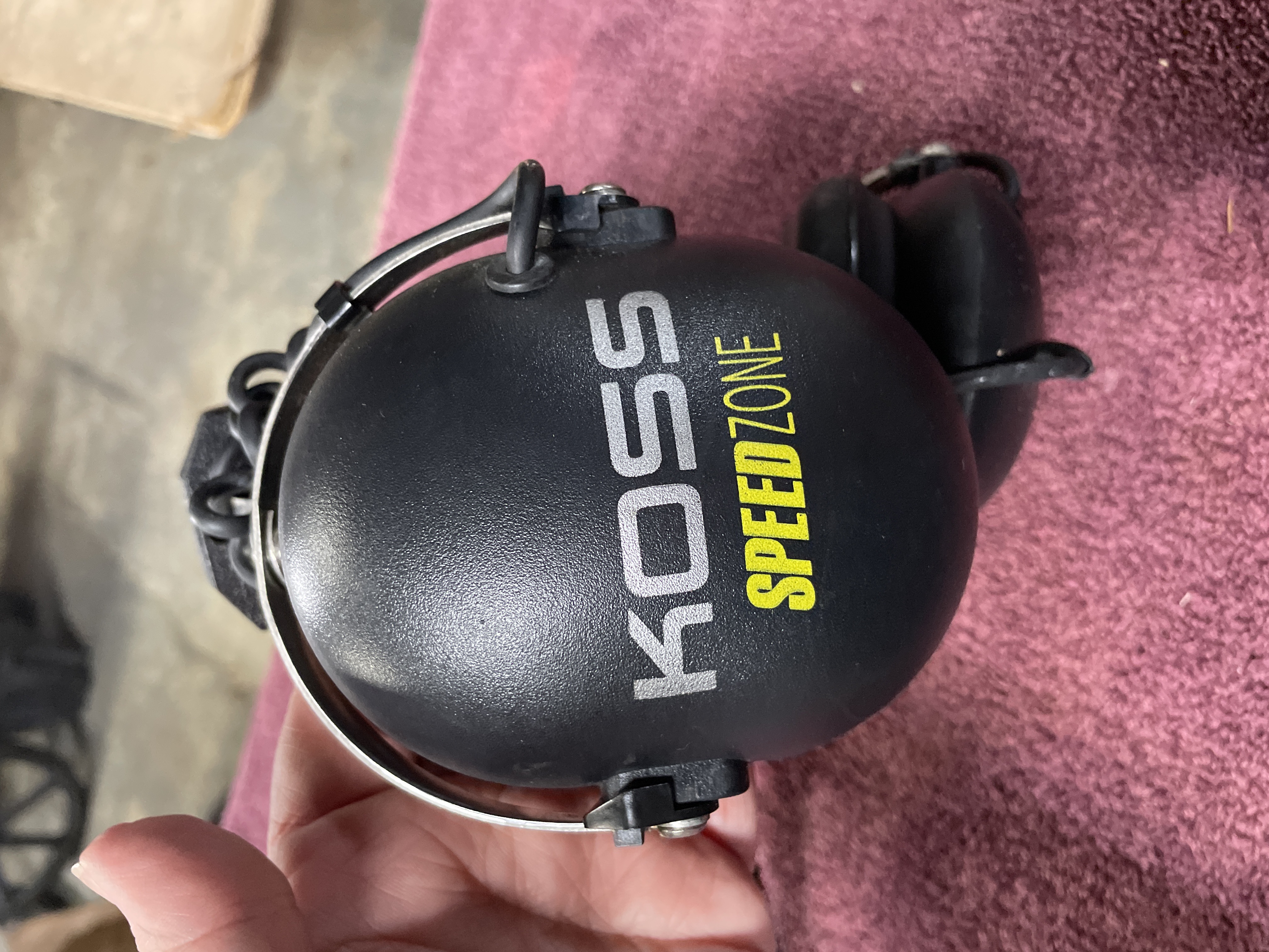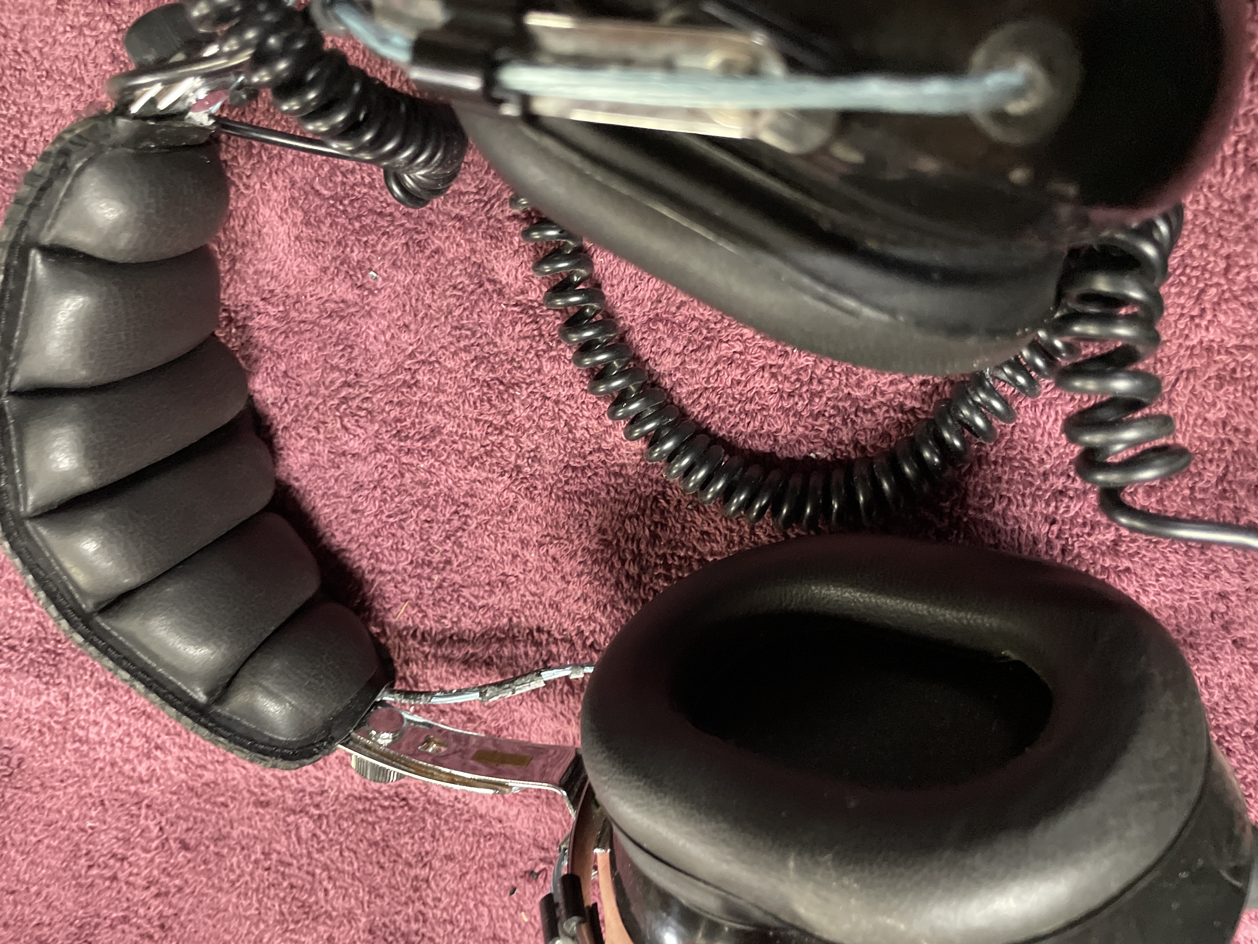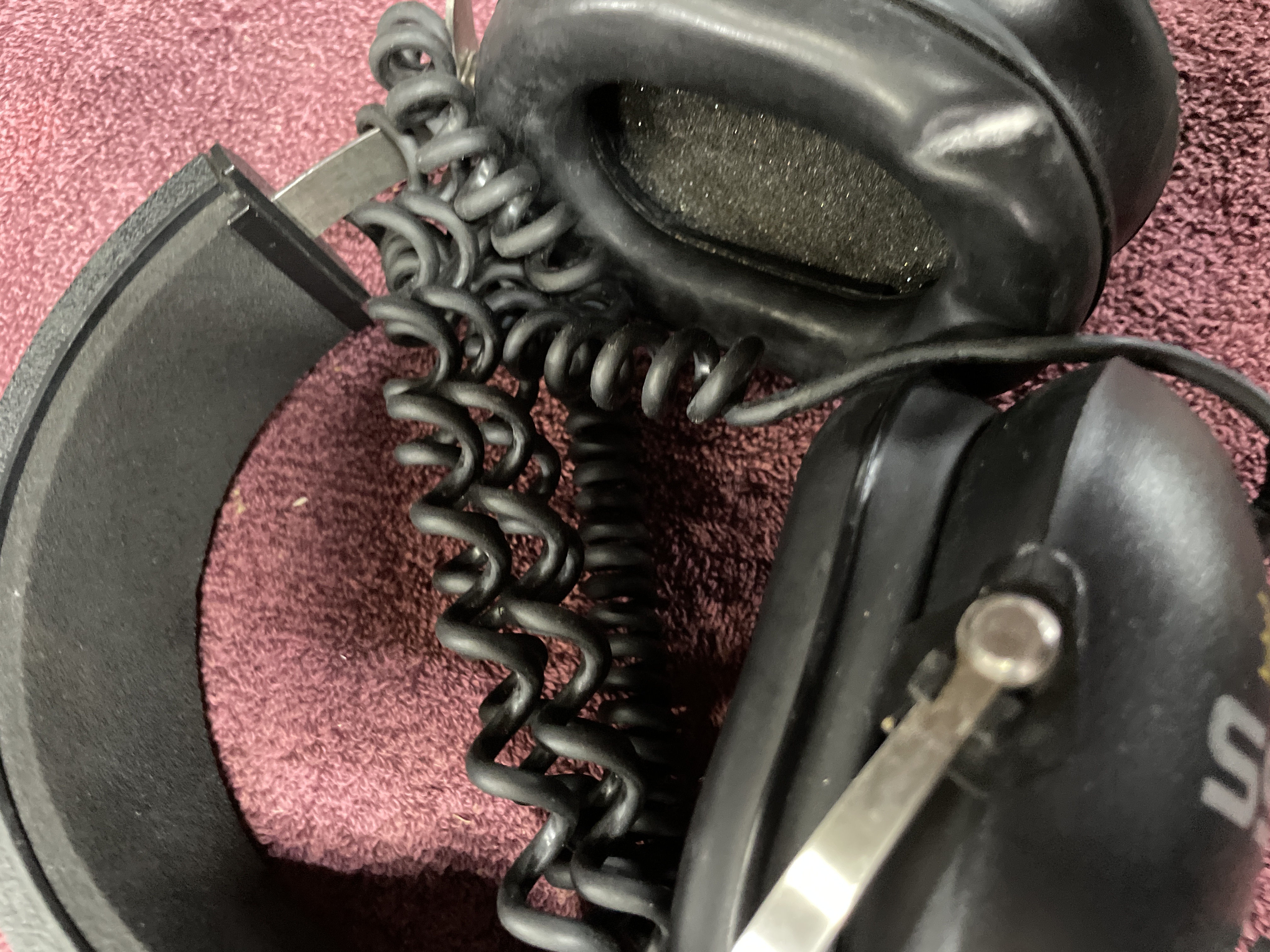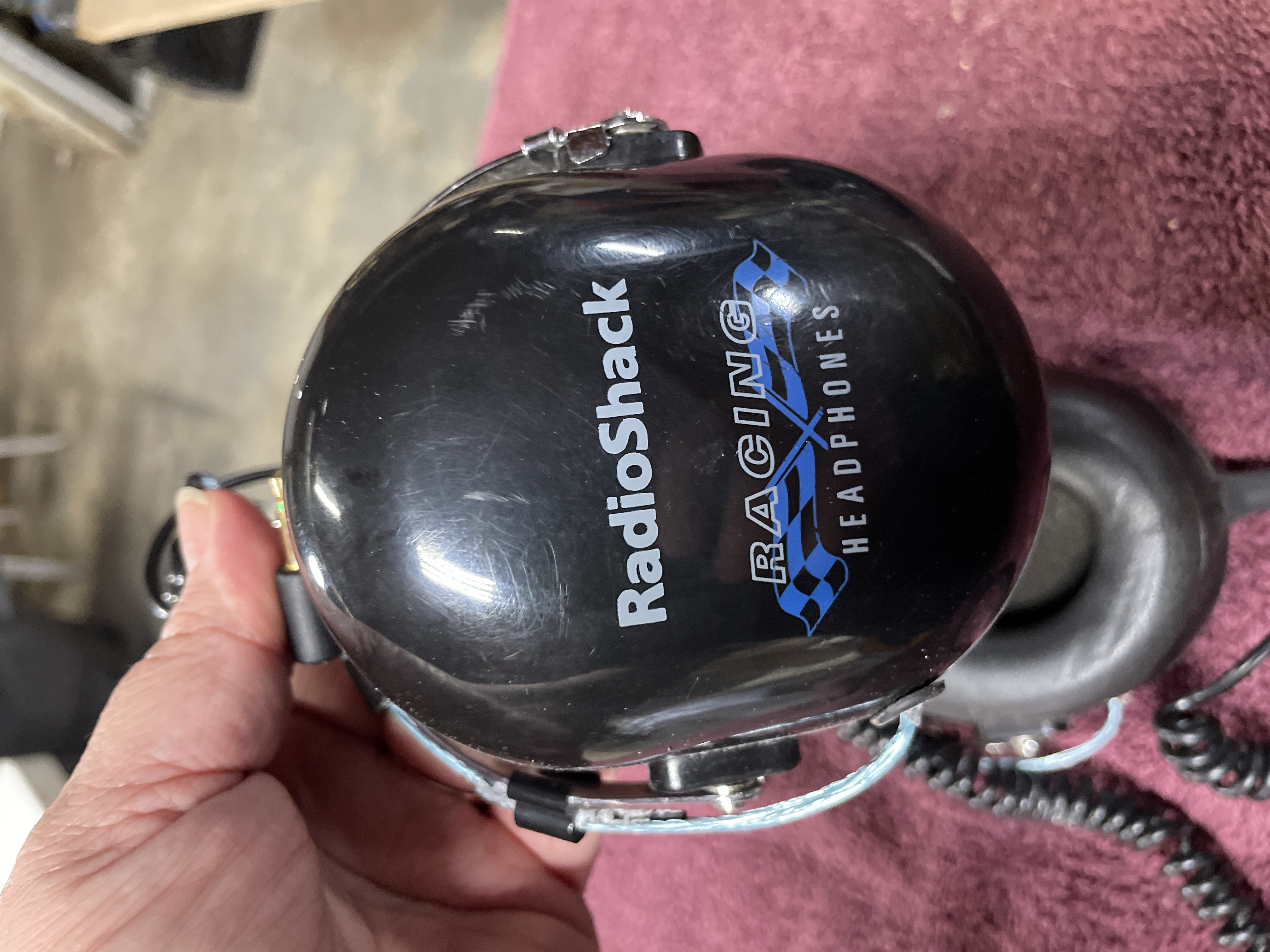 Two pairs of black noise reduction racing headphones featuring volume control knobs and coiled cords, including Koss Speedzone and RadioShack models.