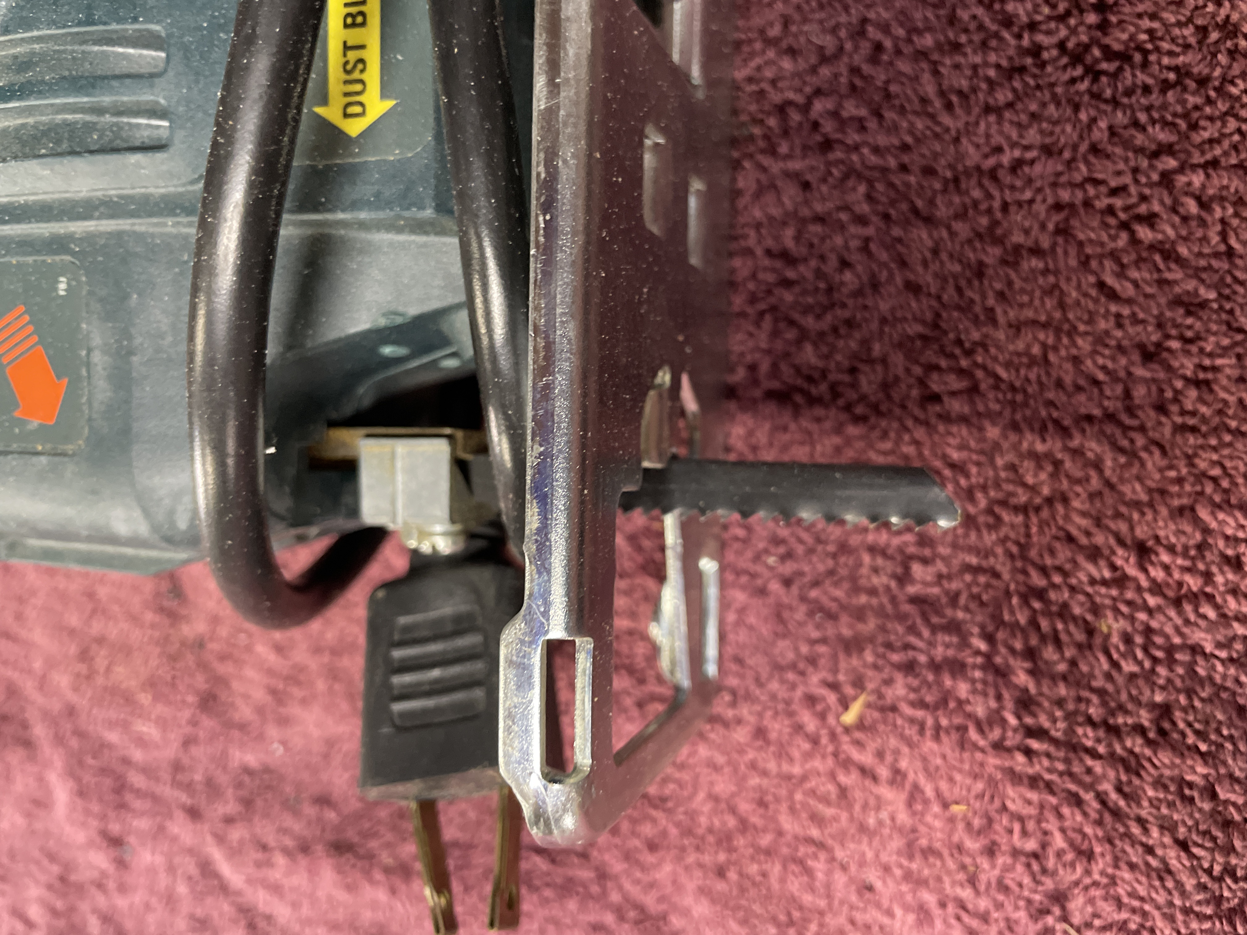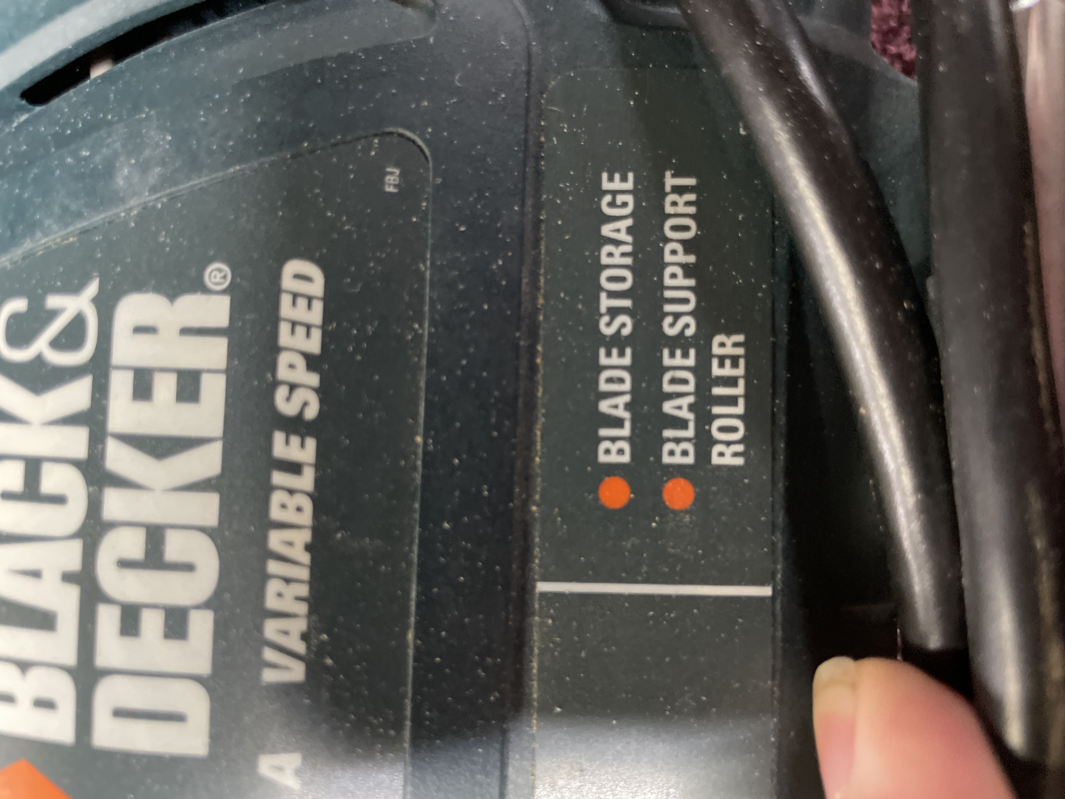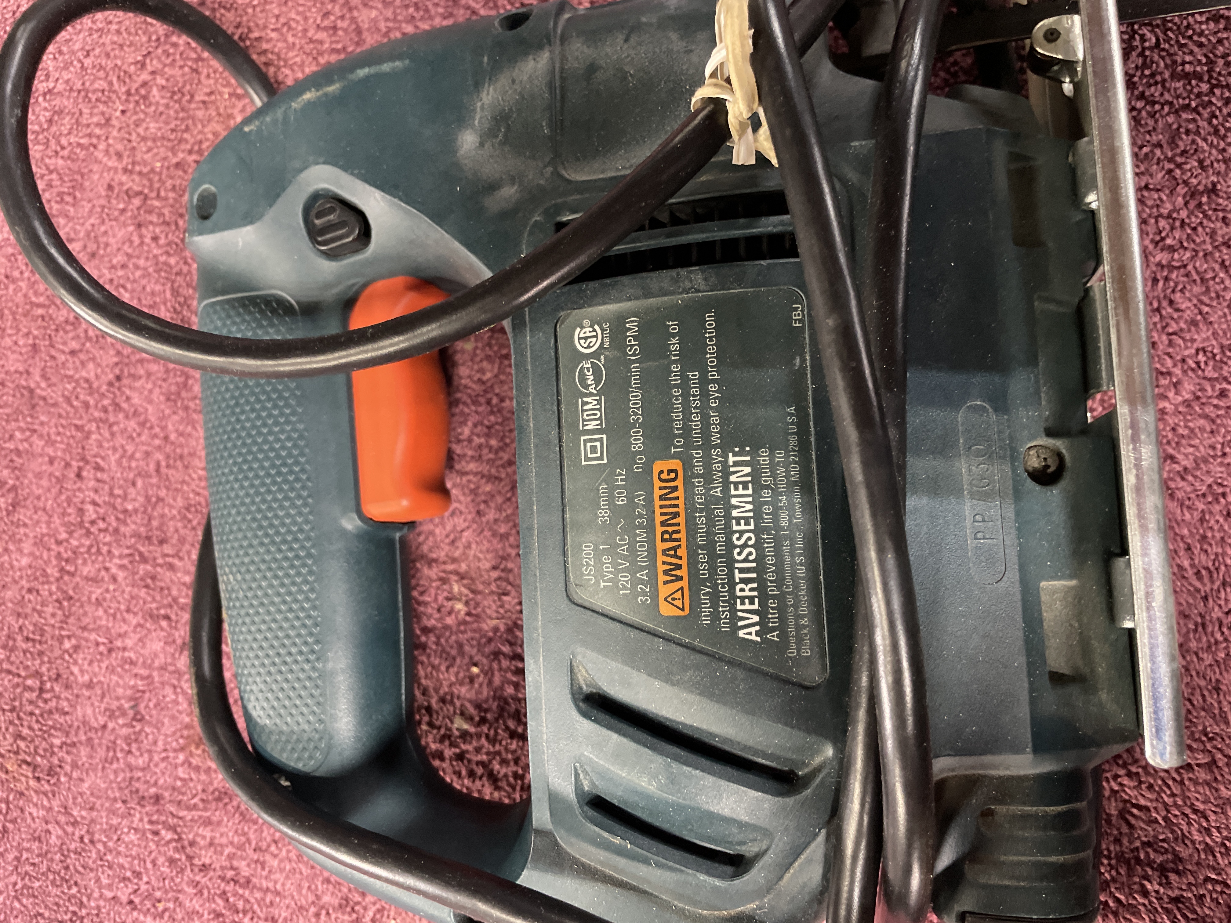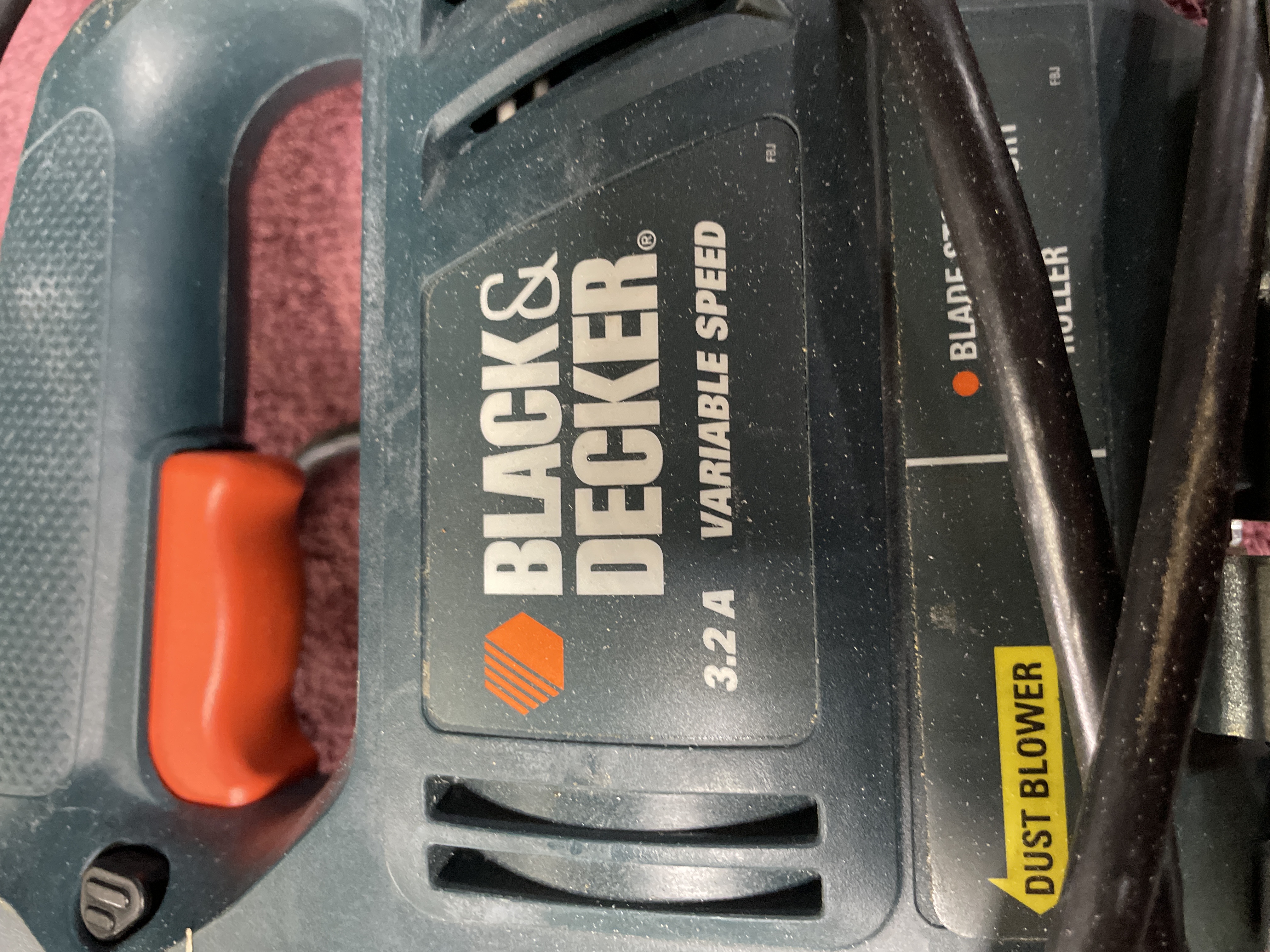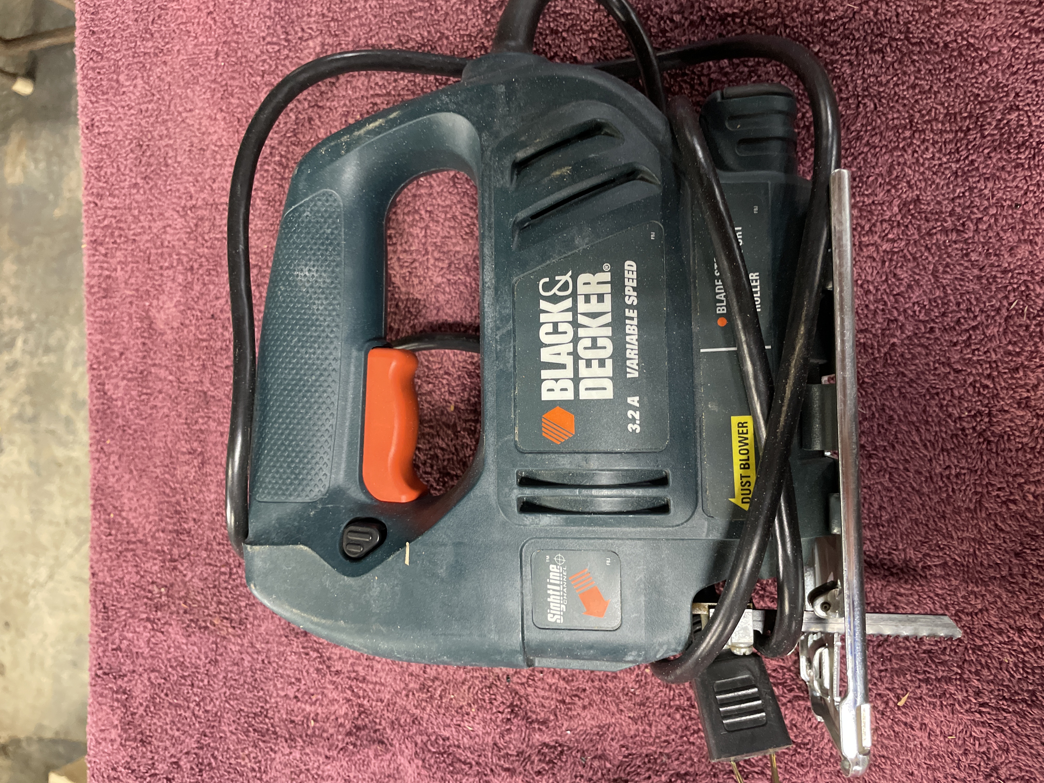 A dark teal and orange Black & Decker JS200 Type 1 variable speed jigsaw featuring a 3.2 A motor, Sightline Channel, and integrated dust blower.