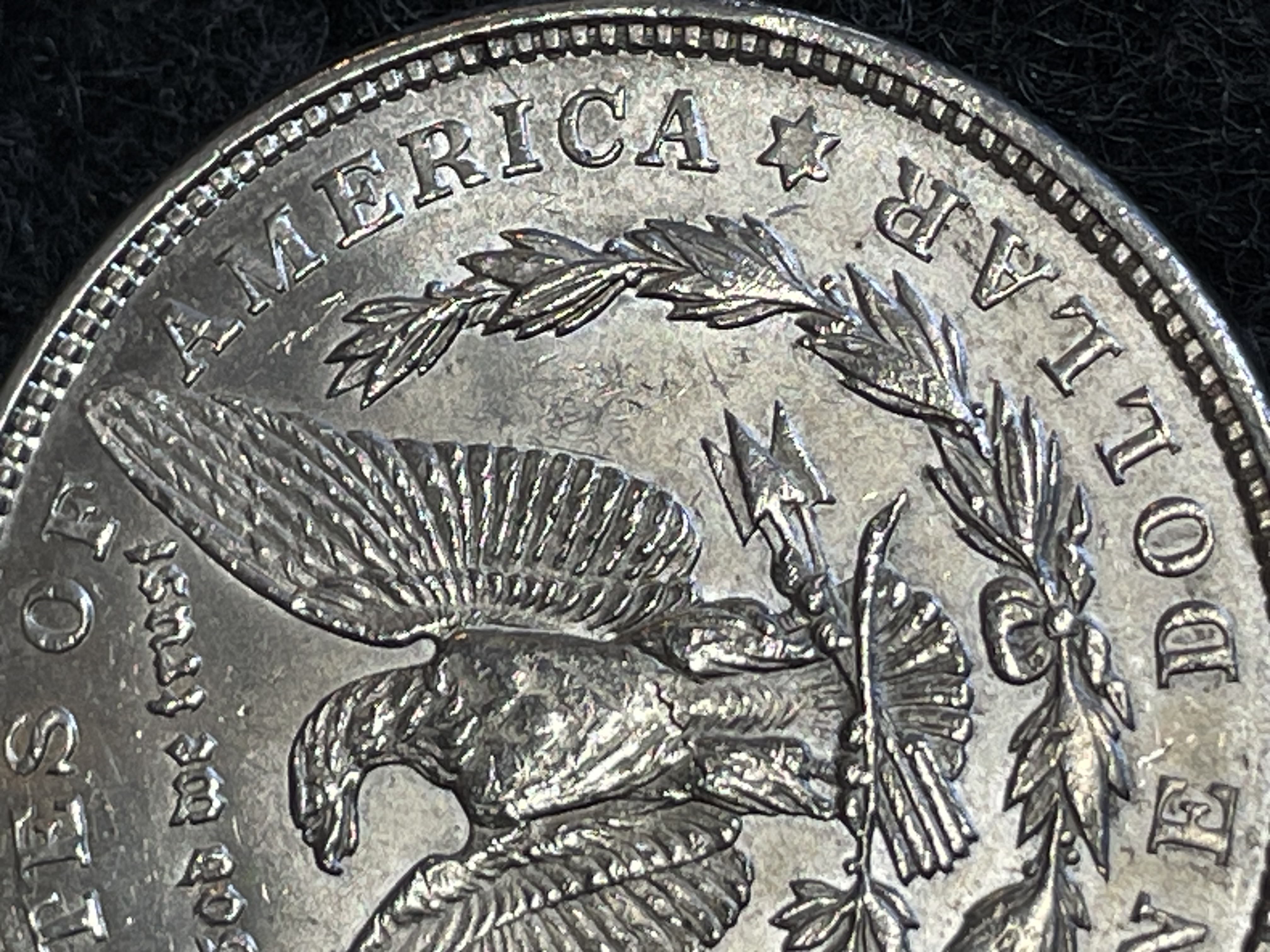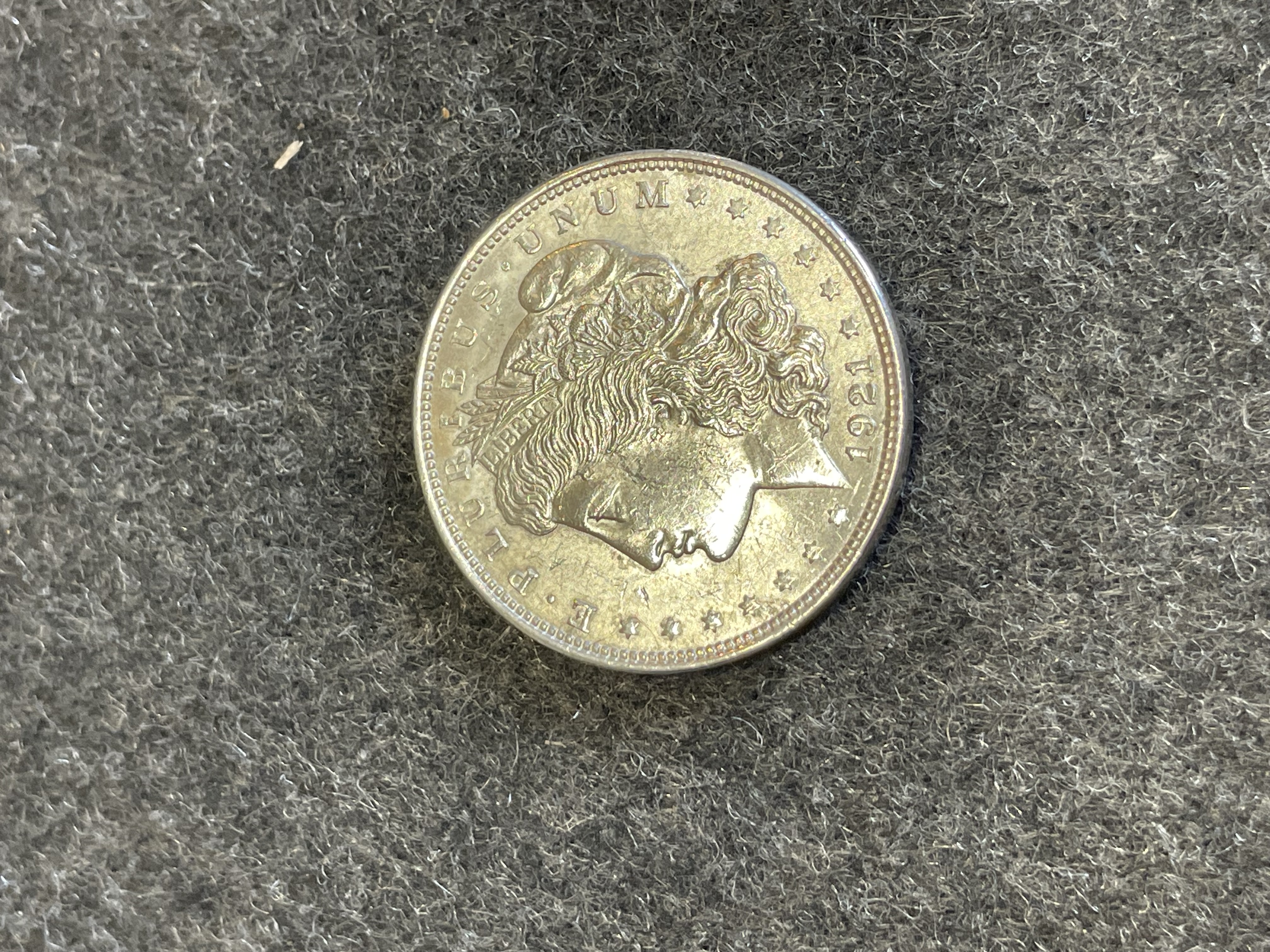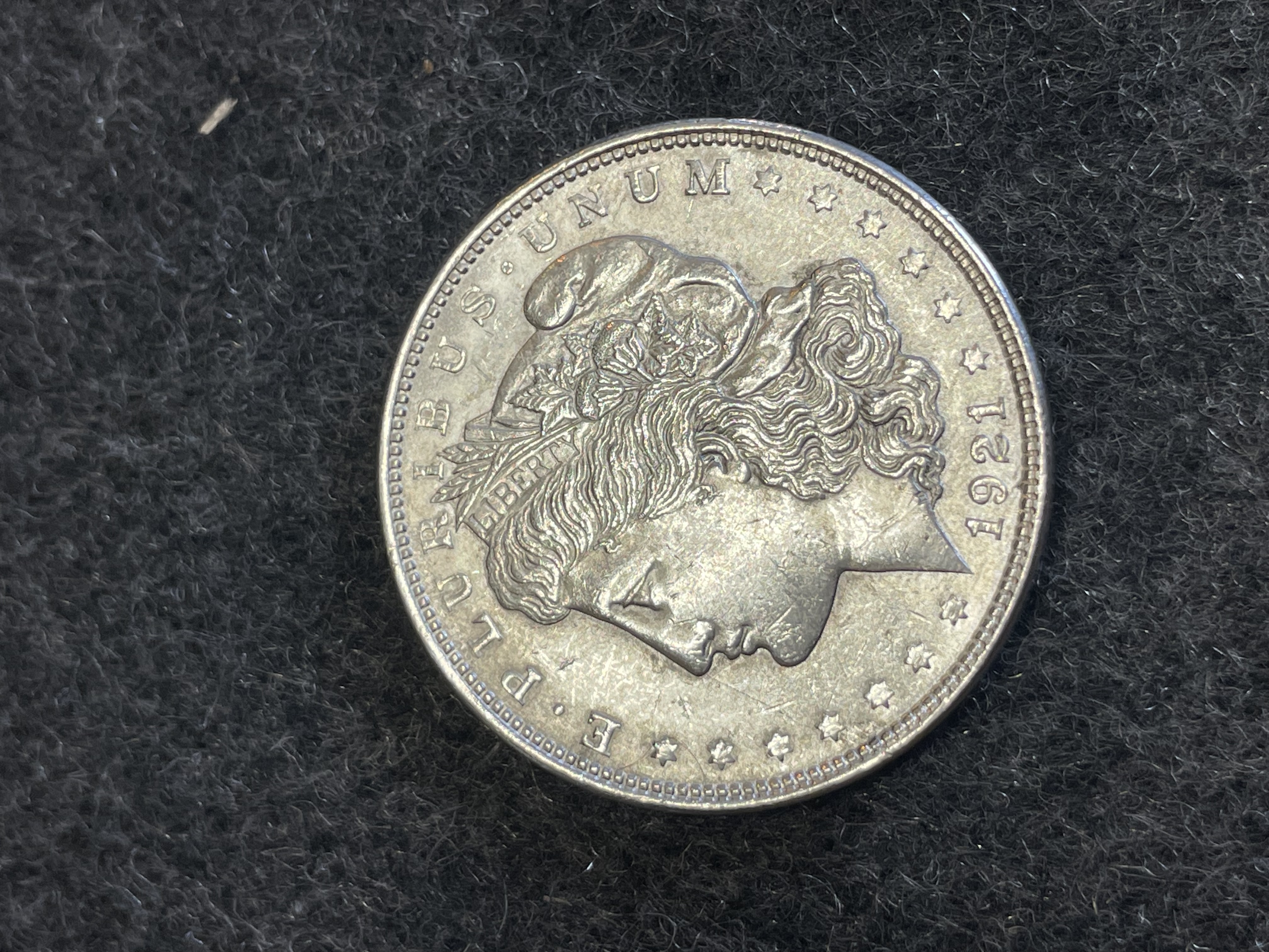 A 1921 US Morgan silver dollar coin featuring the profile of Liberty on the obverse and a heraldic eagle on the reverse.