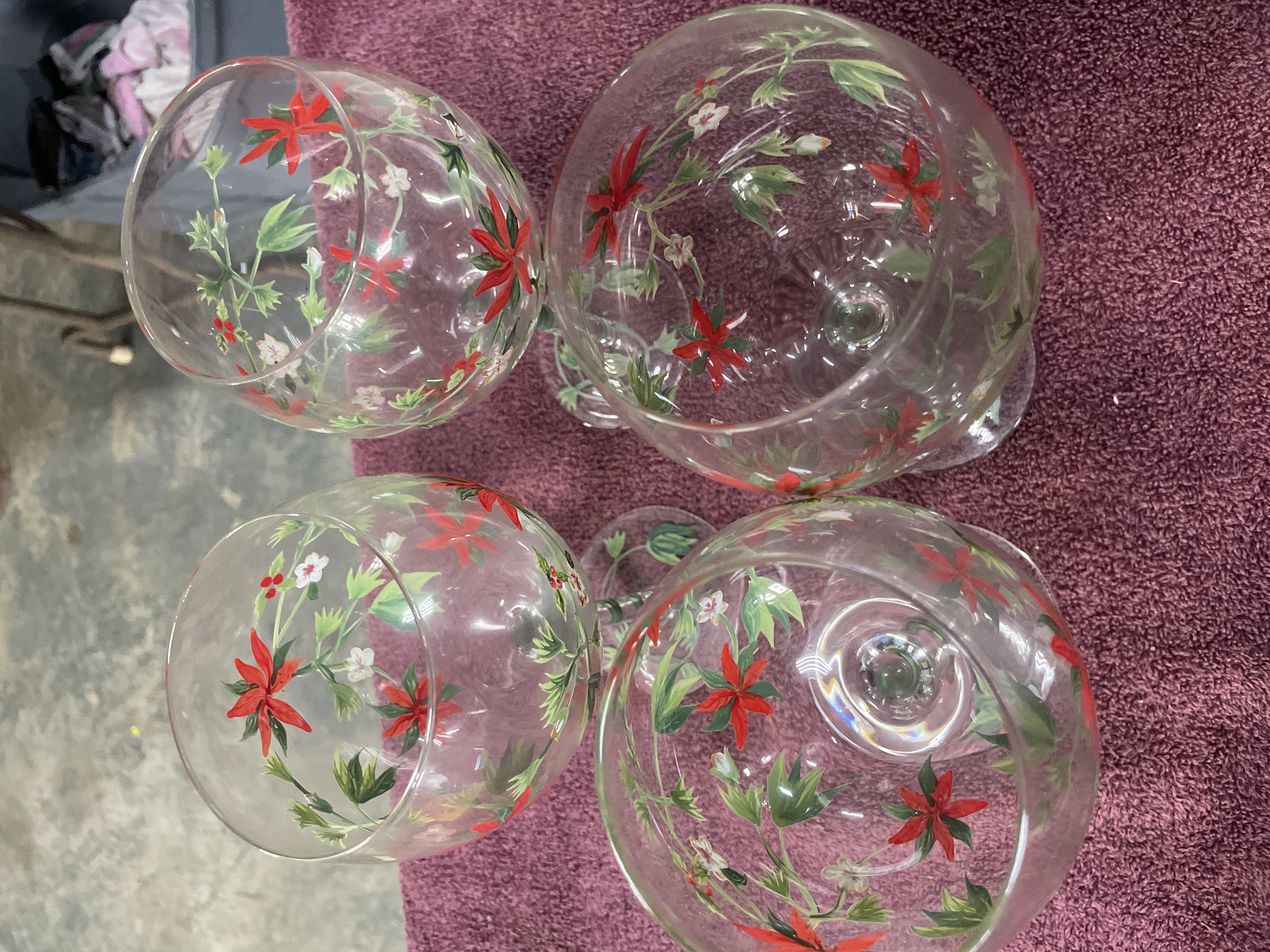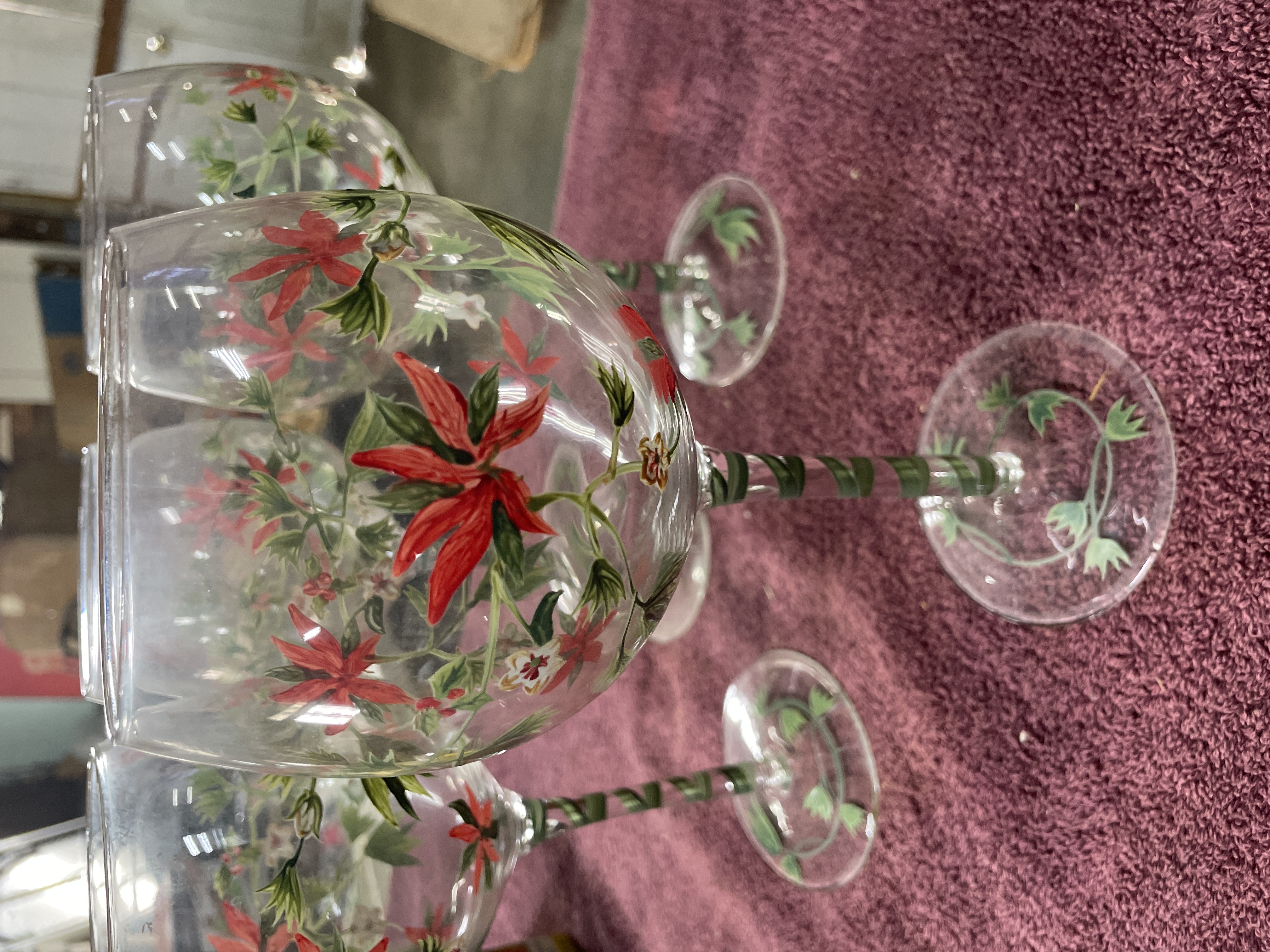 A collection of clear glass goblets featuring hand-painted red poinsettia and green leaf motifs with vine-wrapped stems.