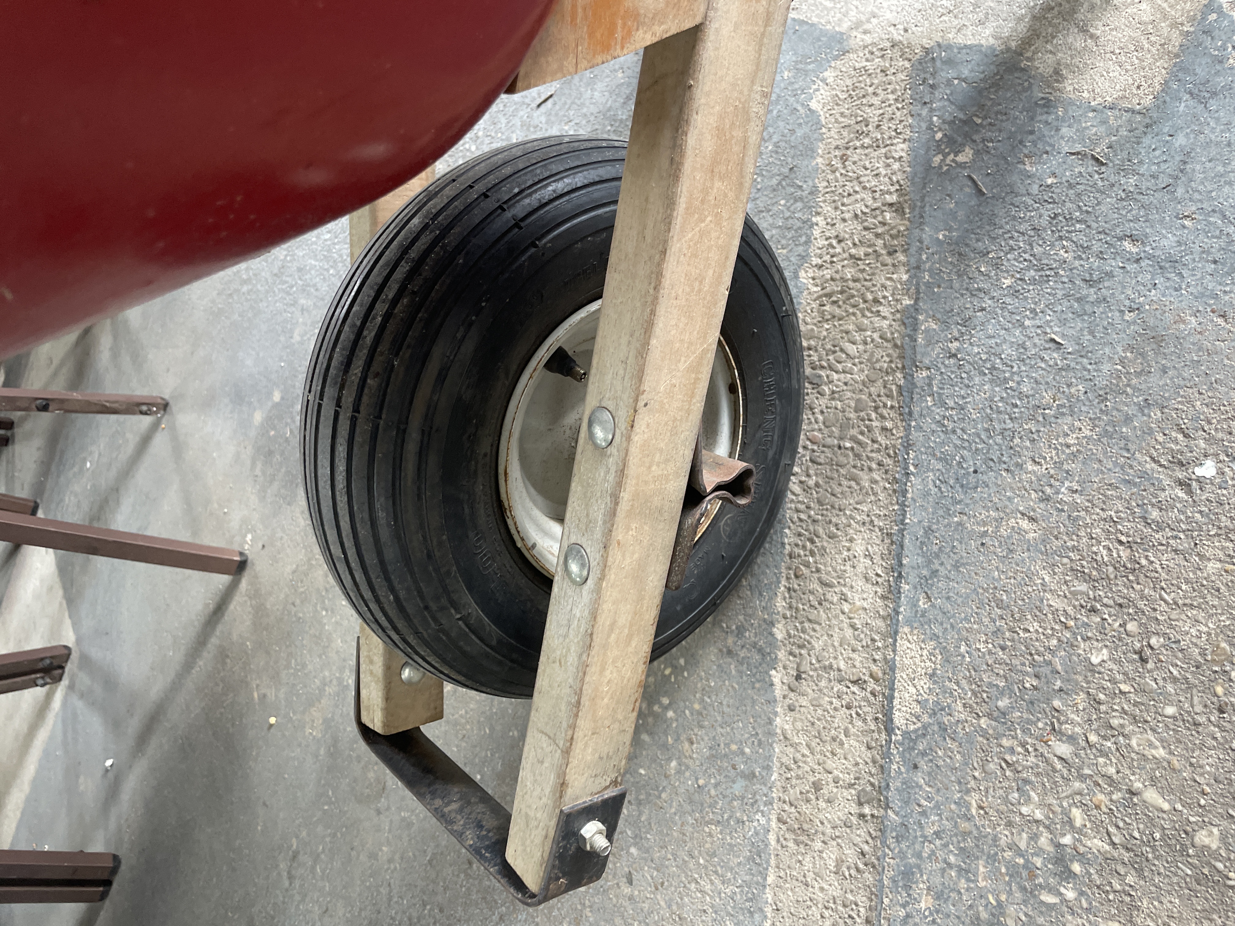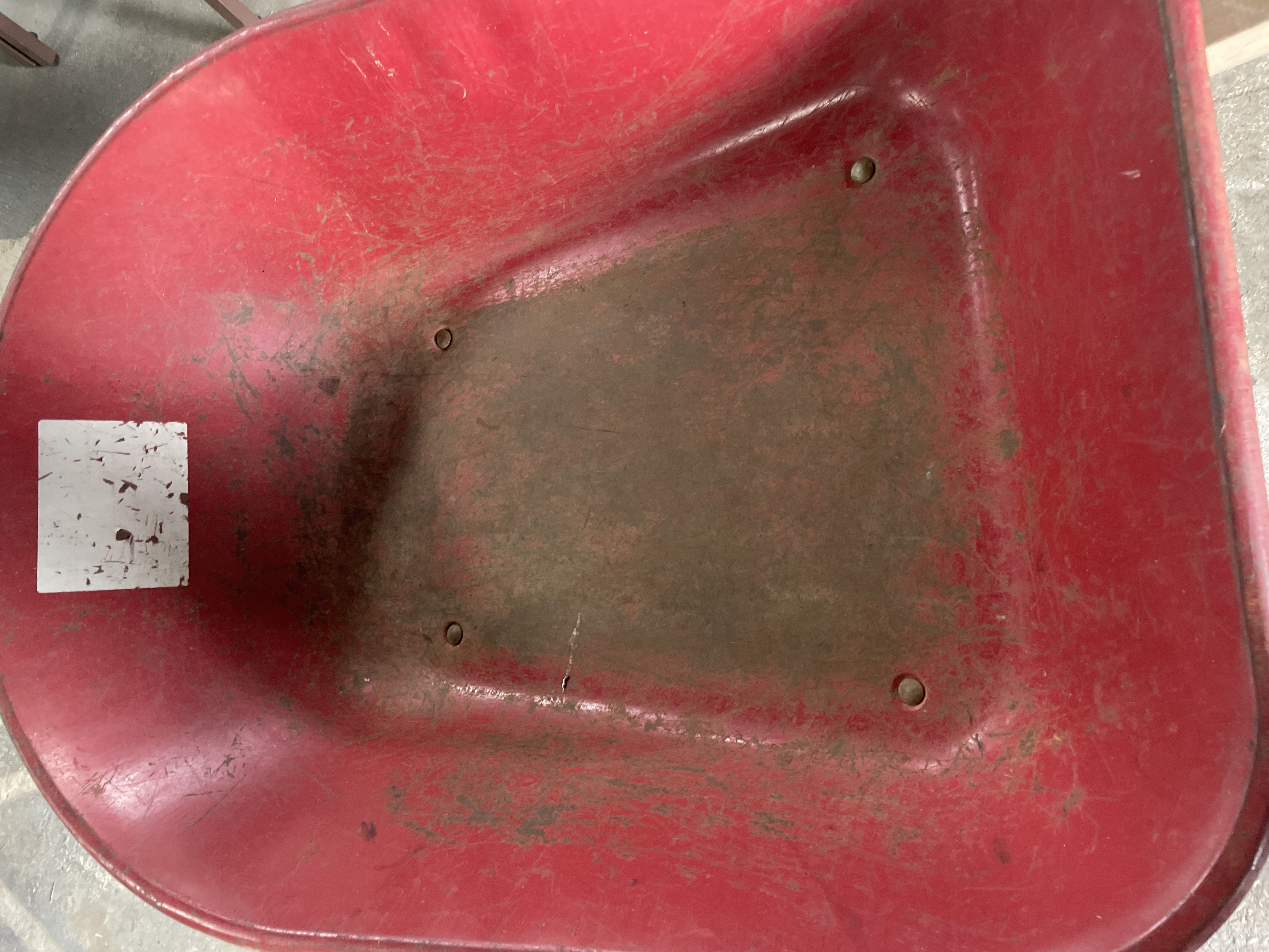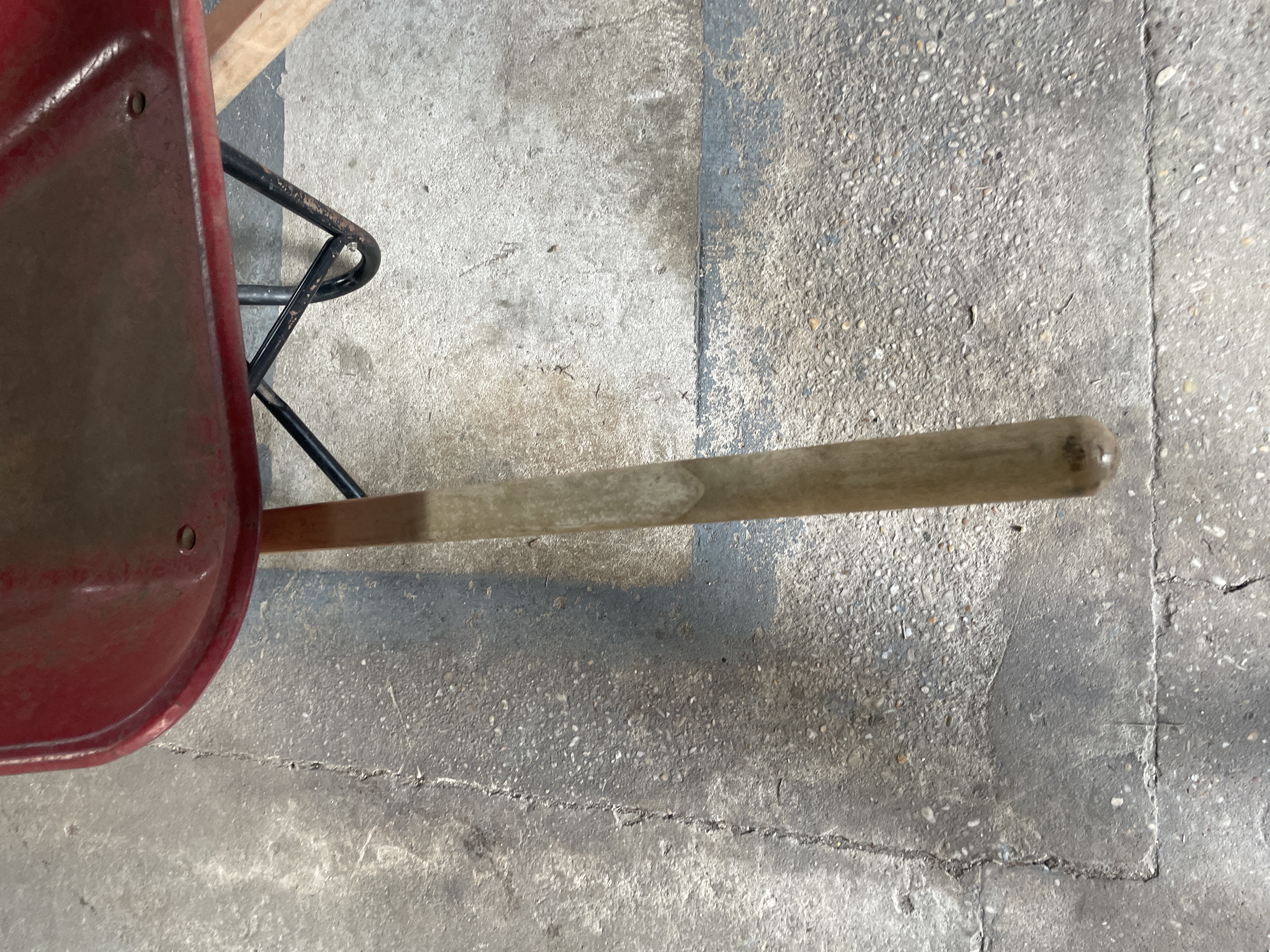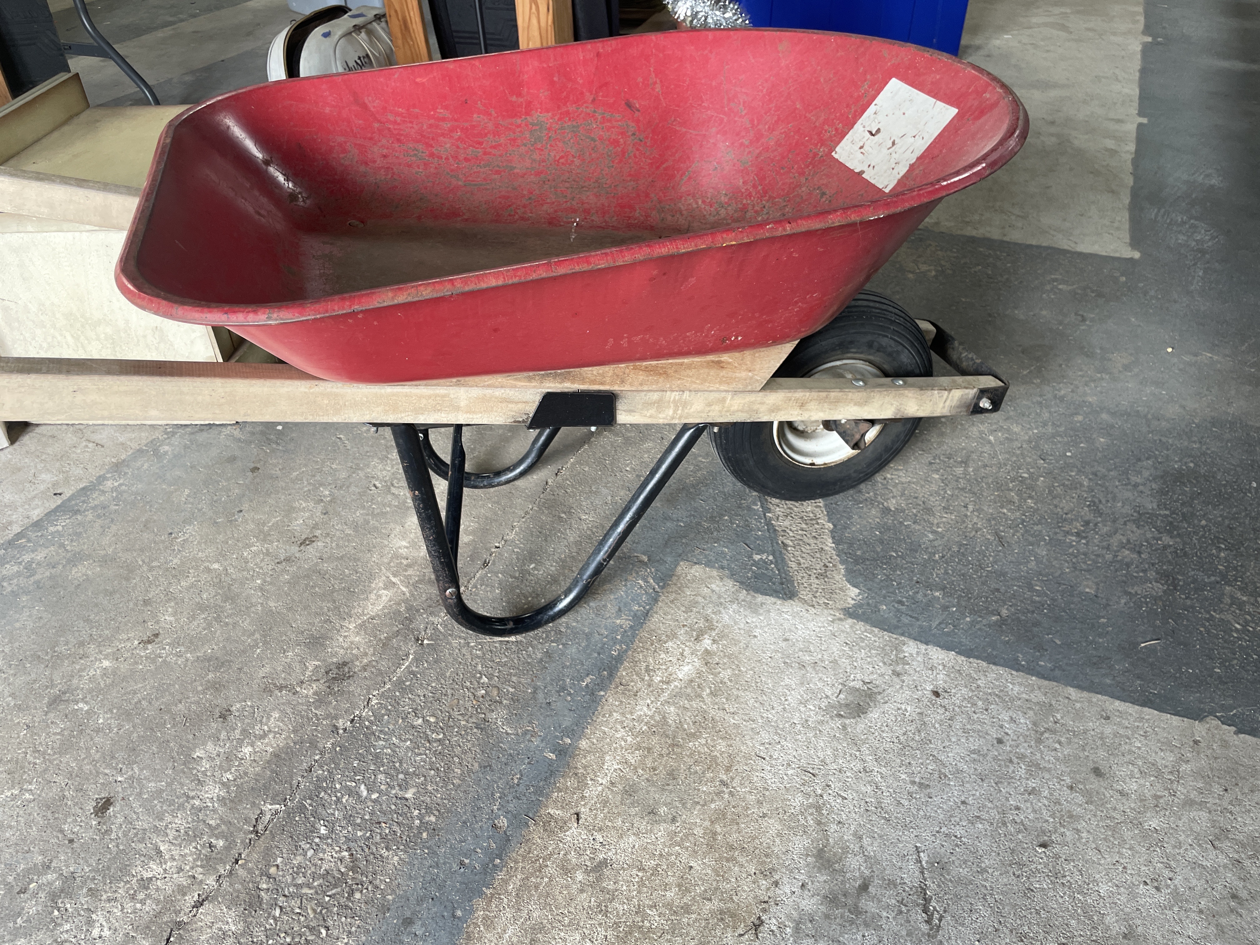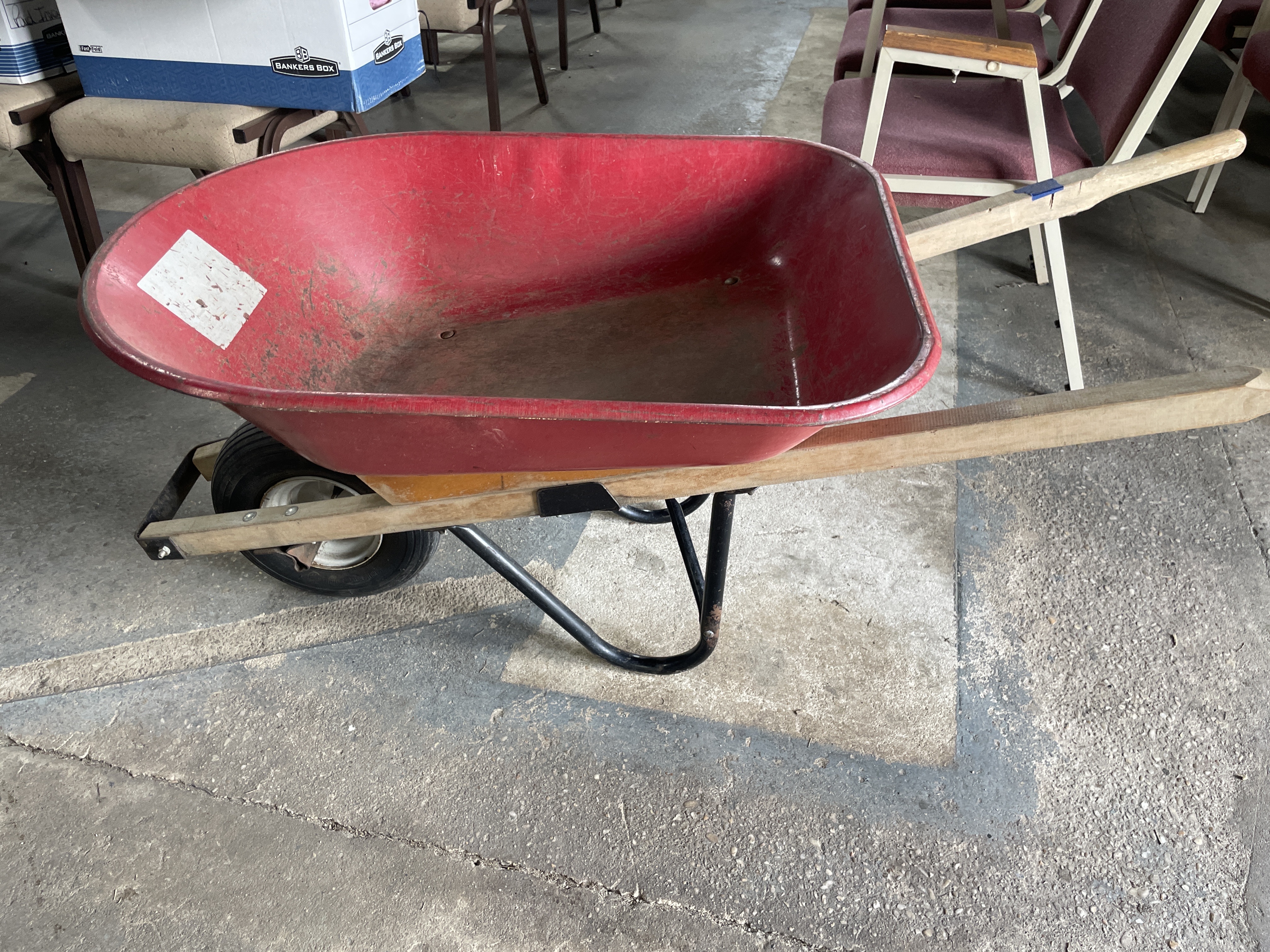 A red wheelbarrow featuring wooden handles and a black metal frame, with a worn white label affixed to the interior of the tub.