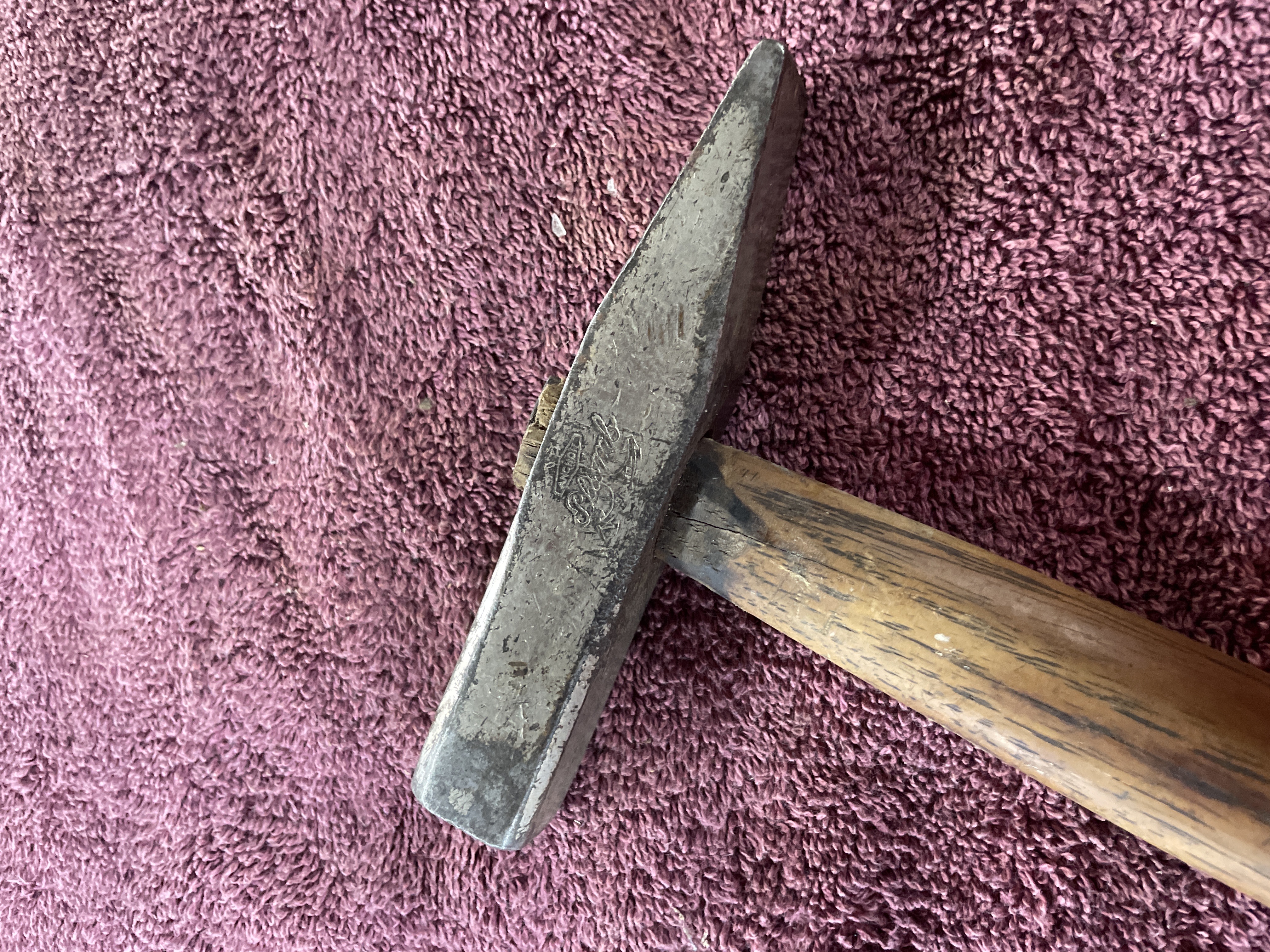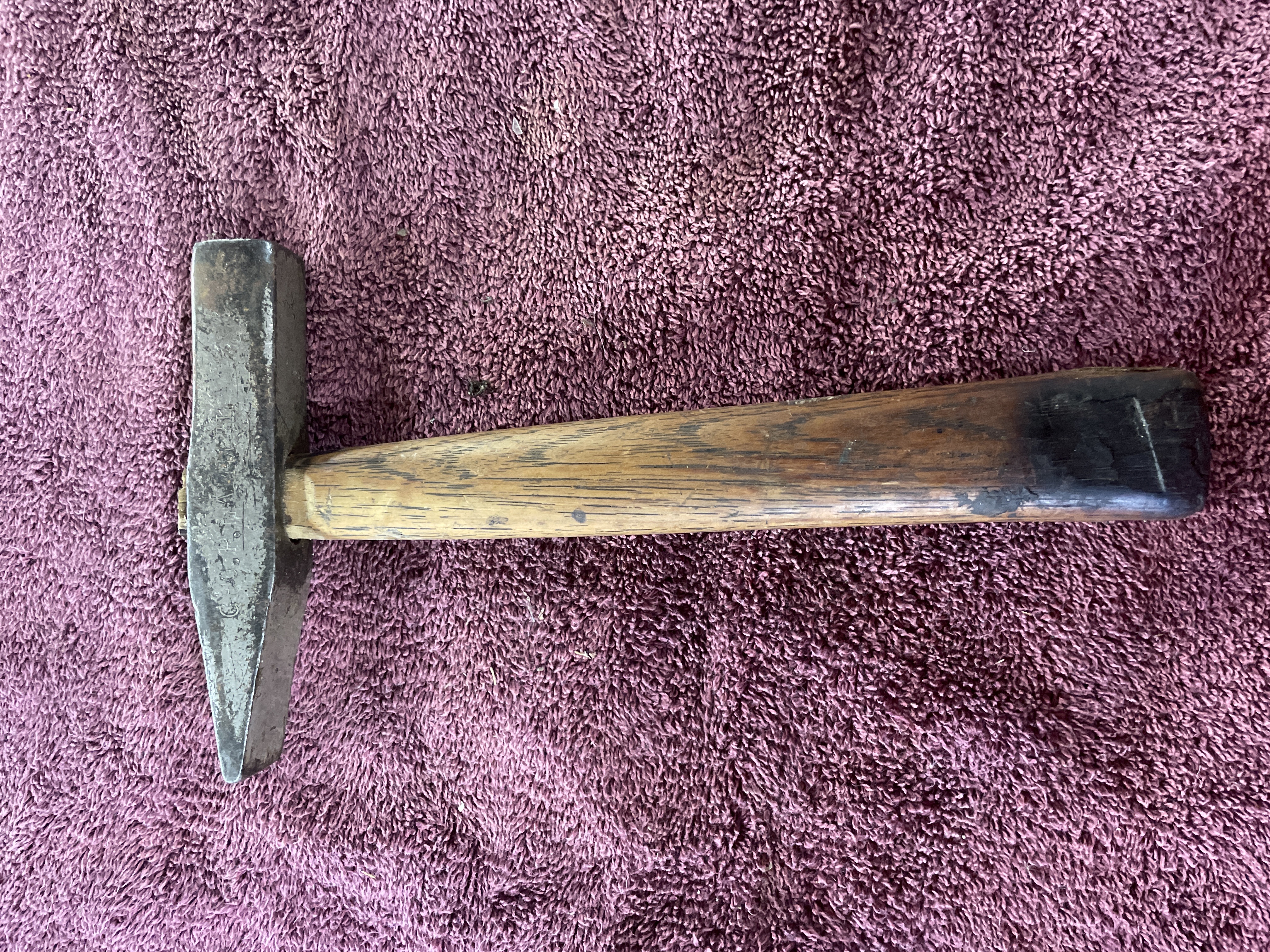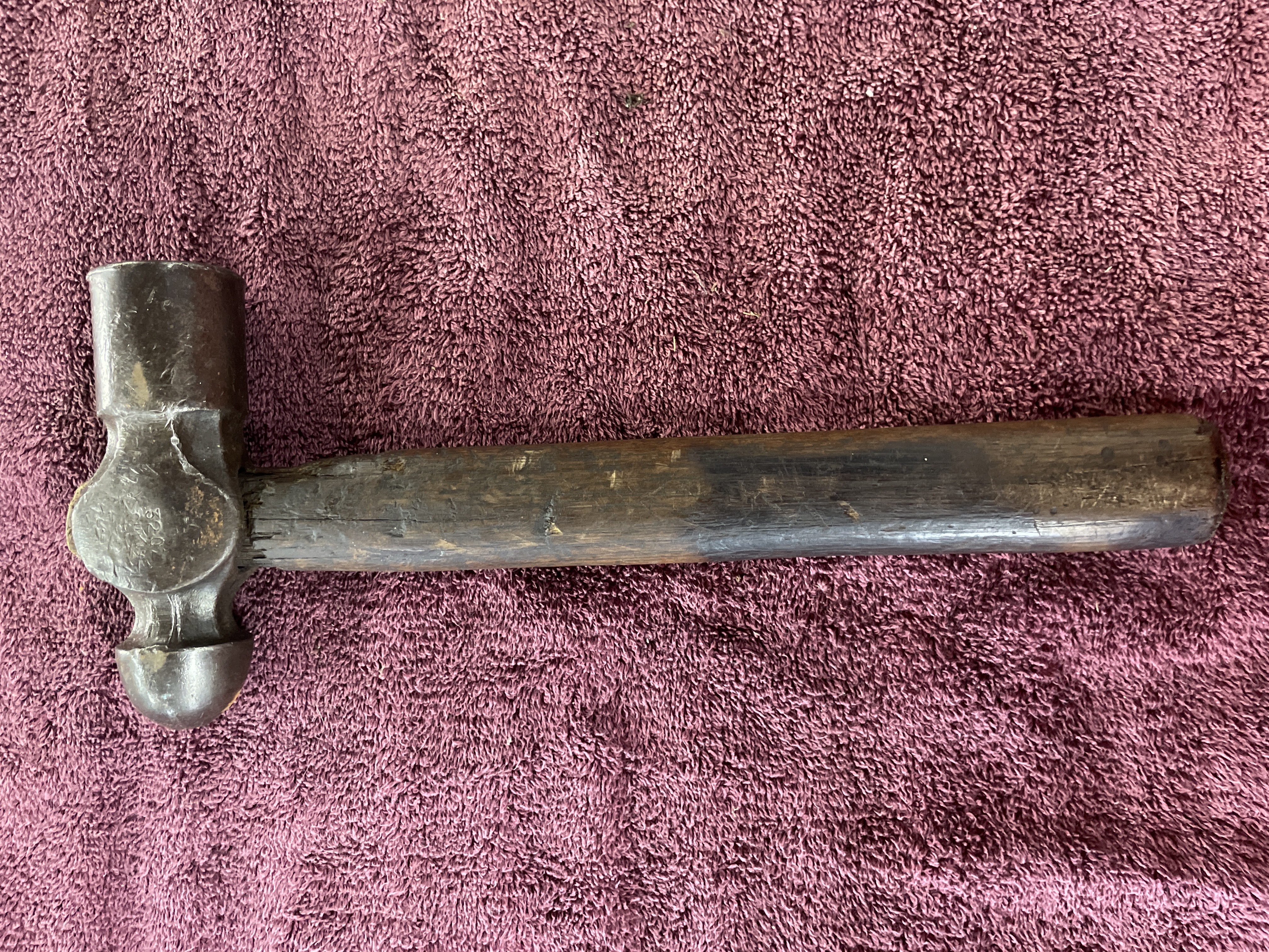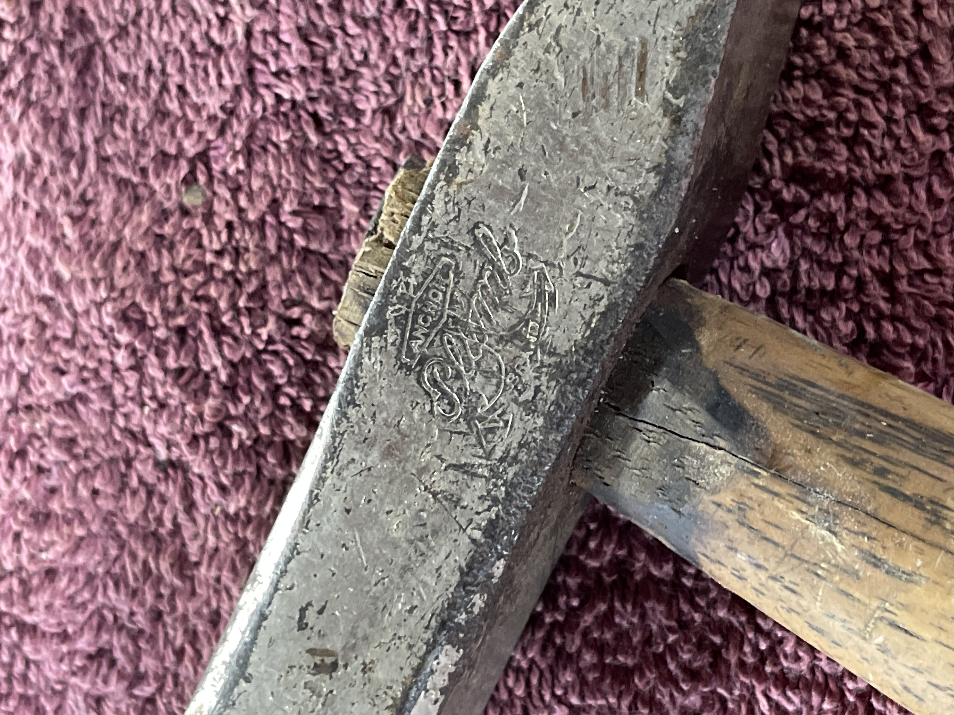 Three metal hammers with wooden handles including a Stanley BP-40, a Plumb 329, and a C. Hammond Anchor Brand cross-peen.