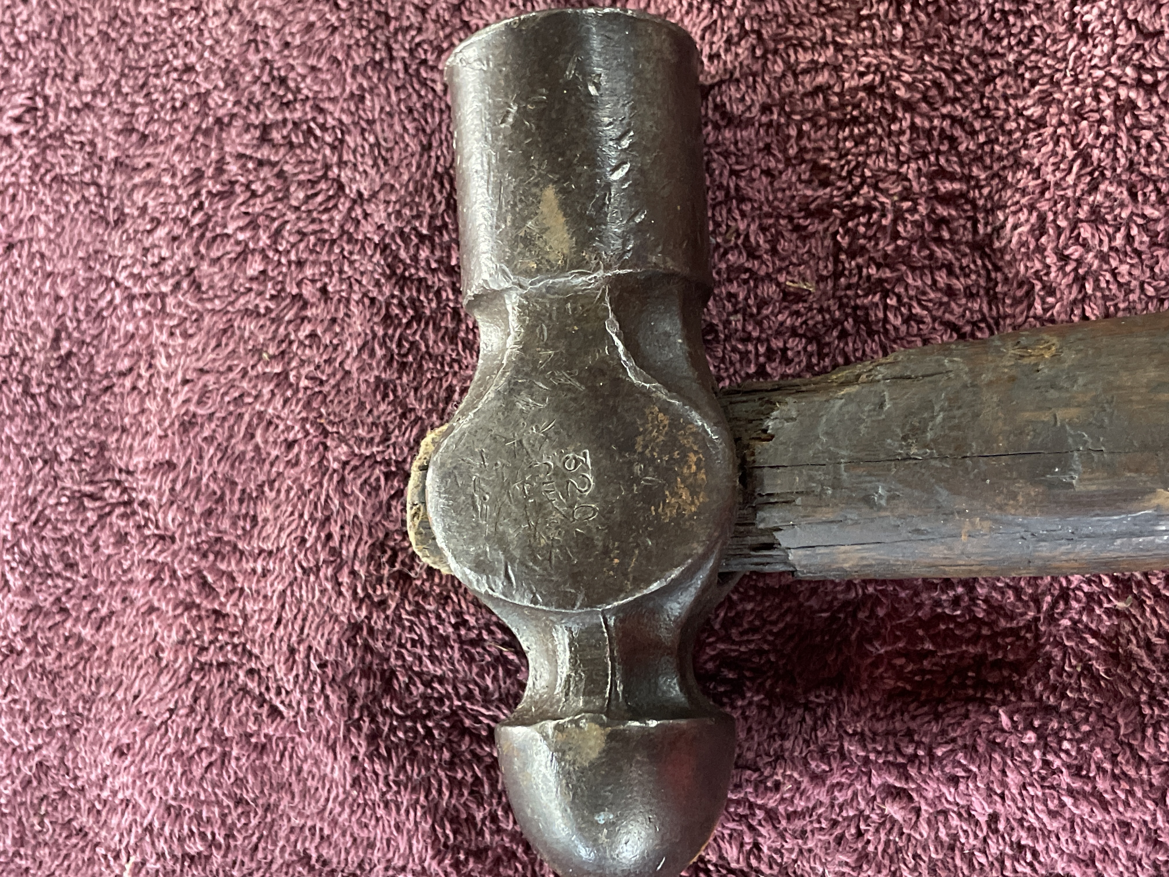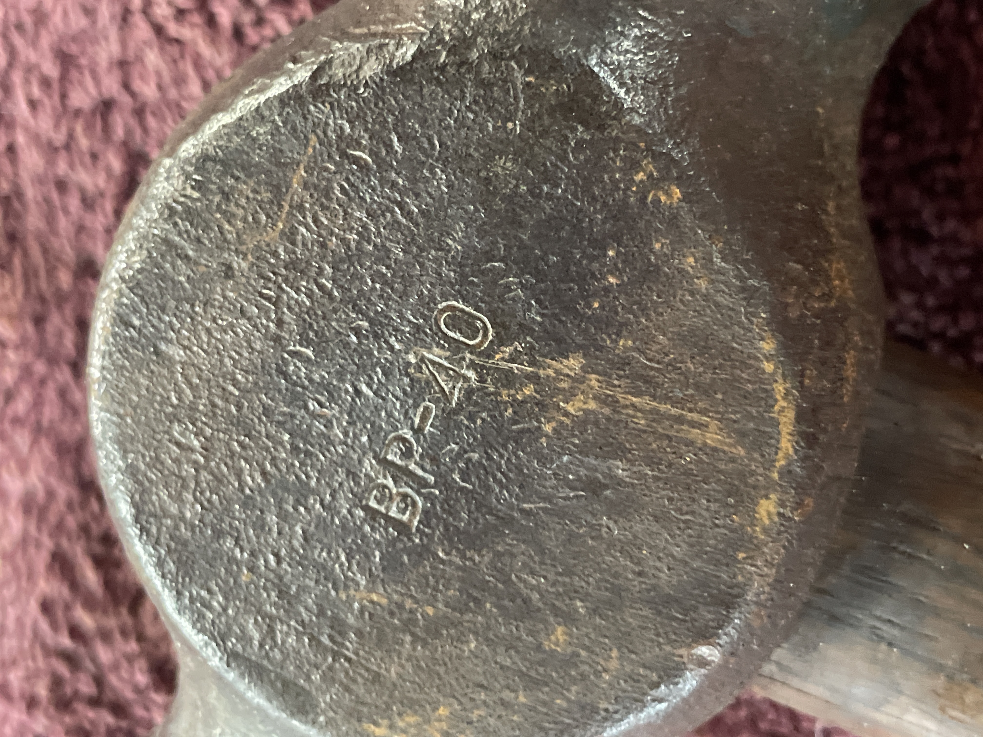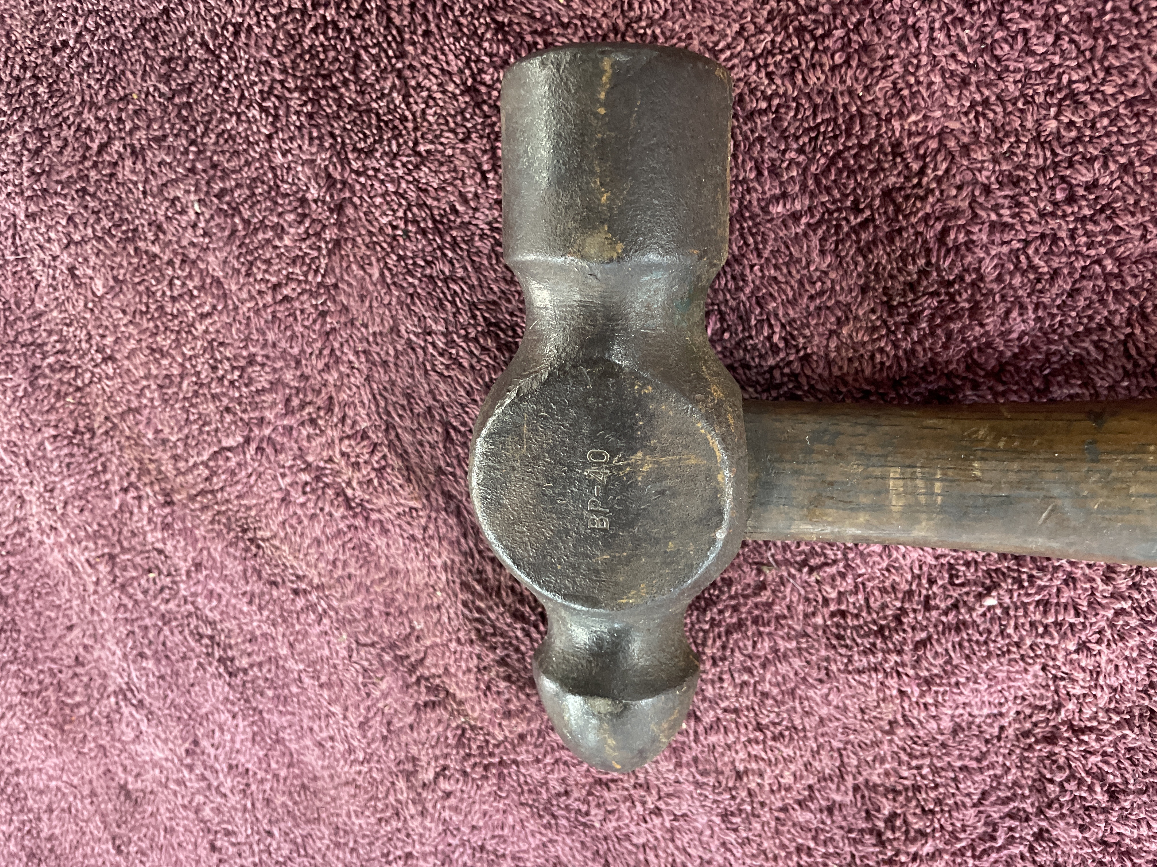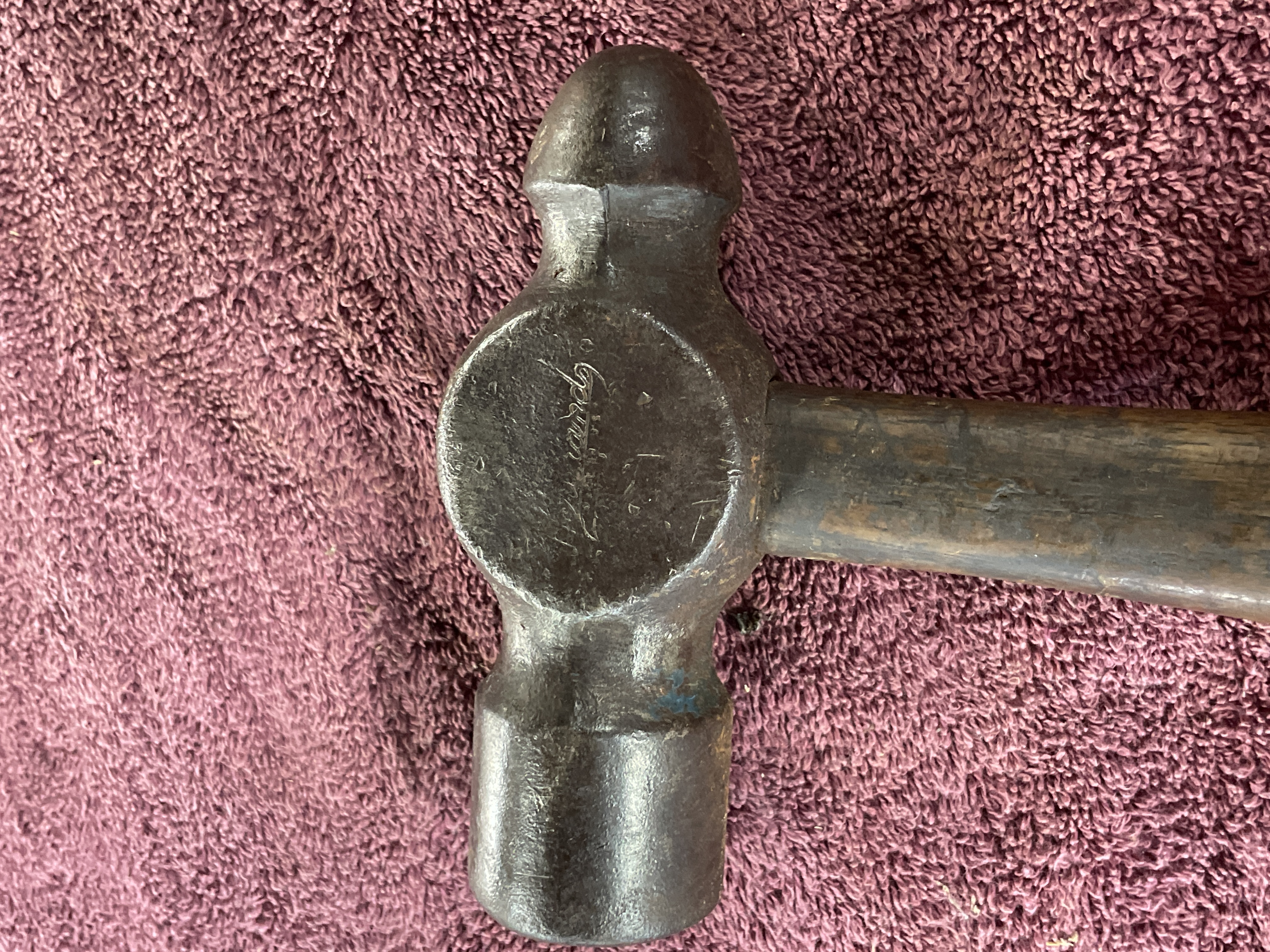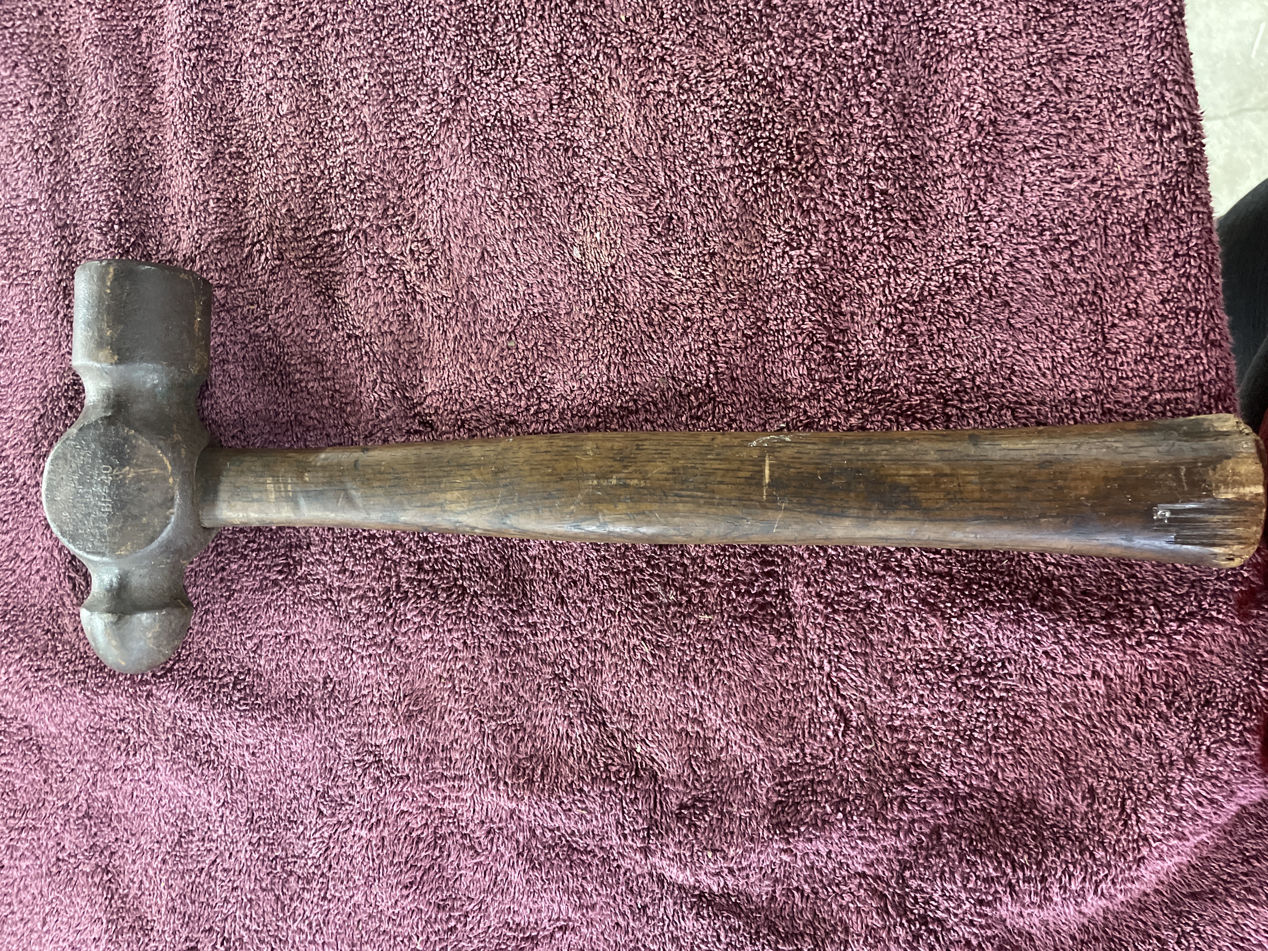 Three metal hammers with wooden handles including a Stanley BP-40, a Plumb 329, and a C. Hammond Anchor Brand cross-peen.