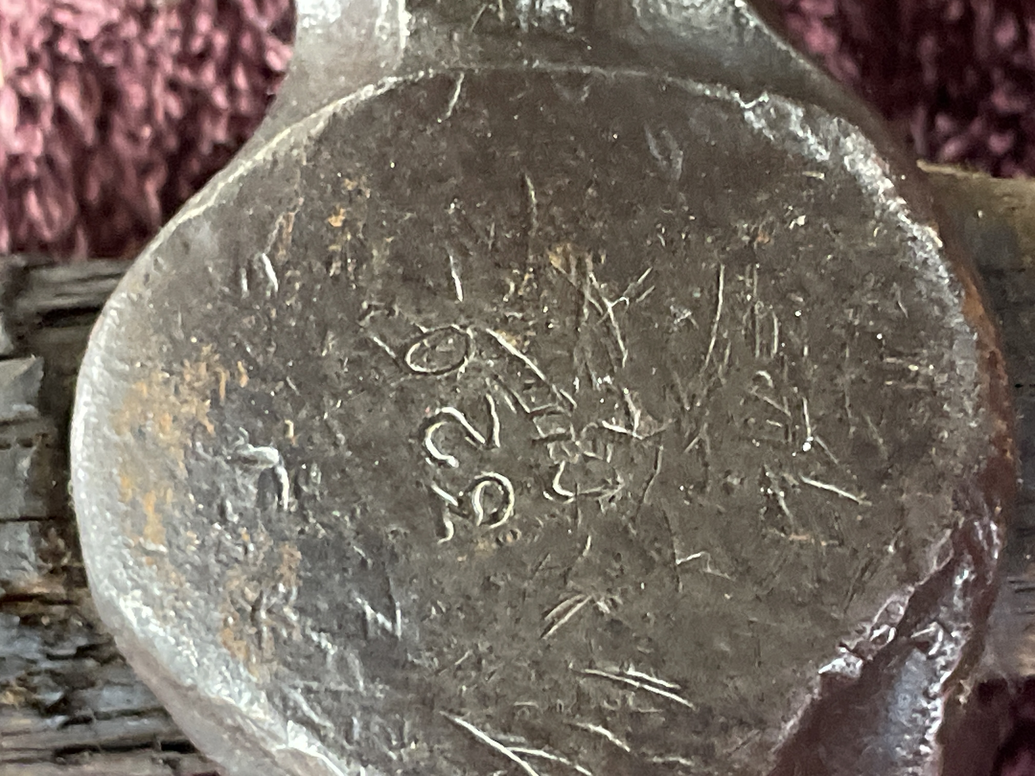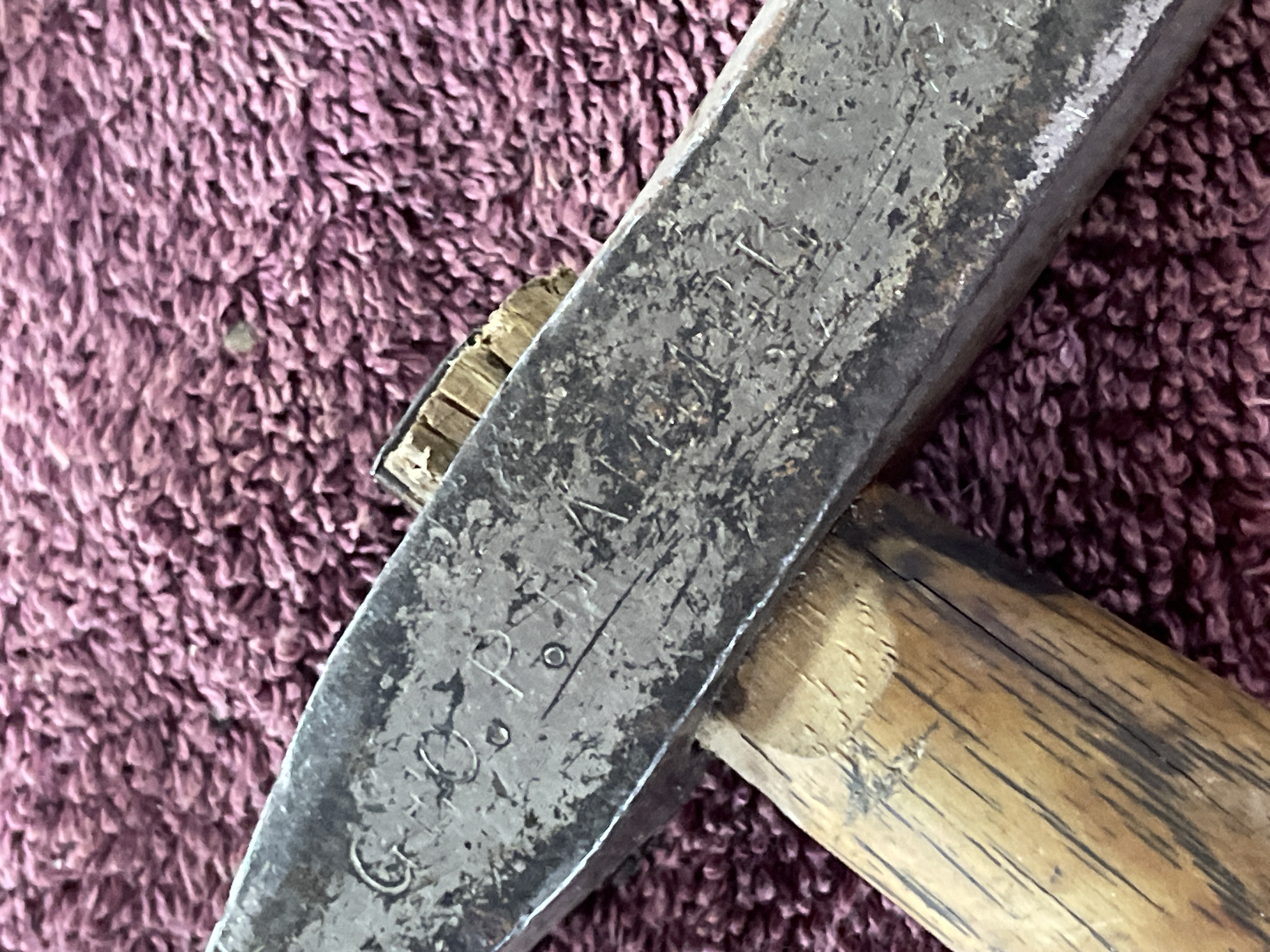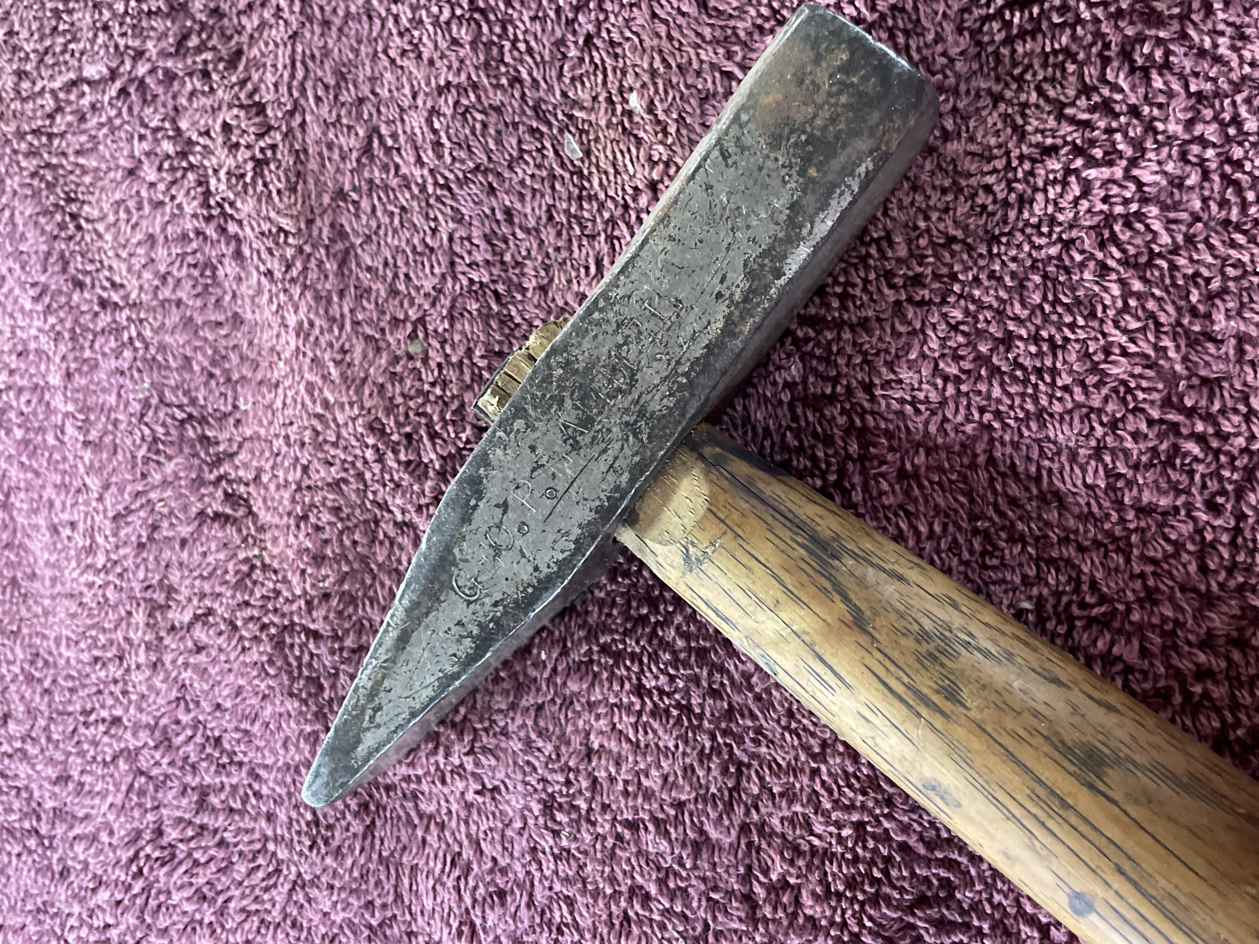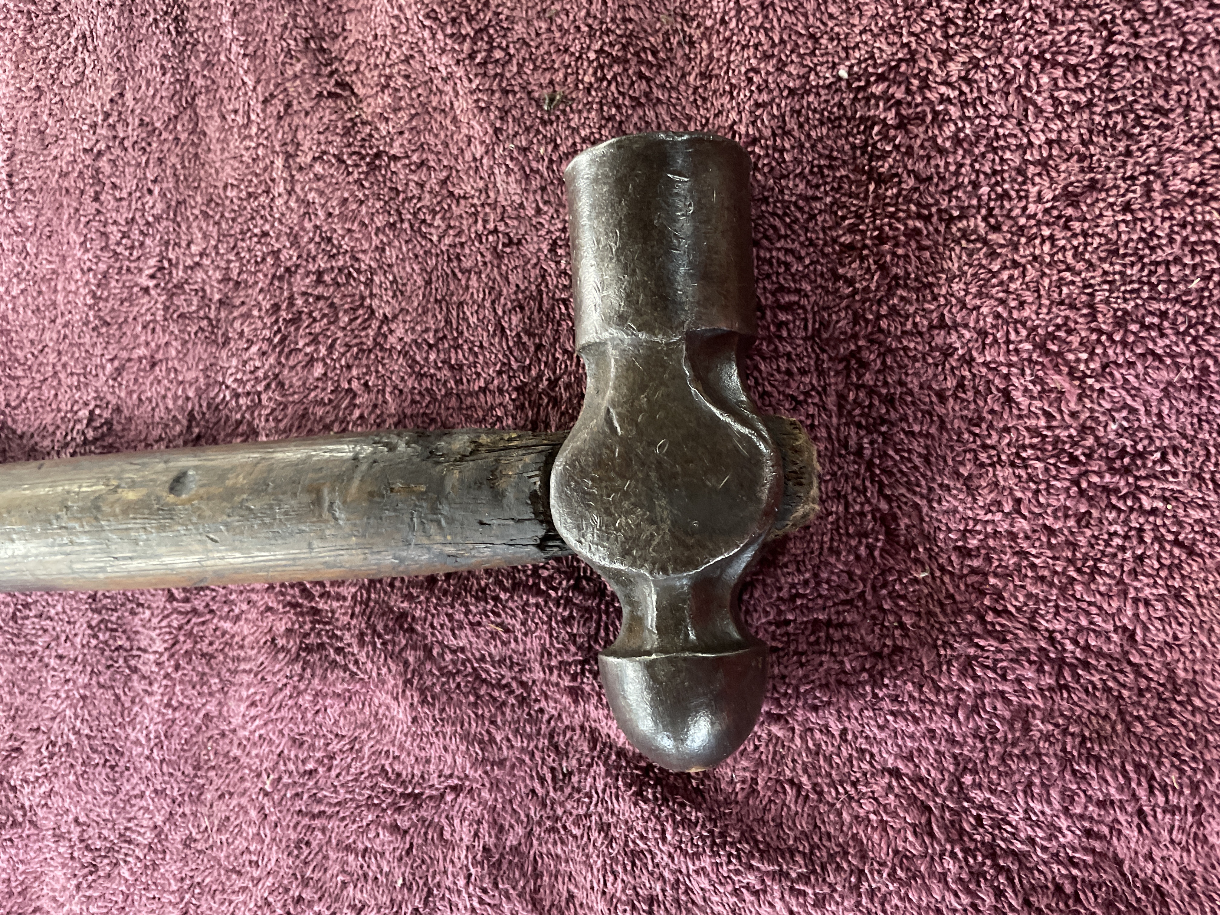 Three metal hammers with wooden handles including a Stanley BP-40, a Plumb 329, and a C. Hammond Anchor Brand cross-peen.