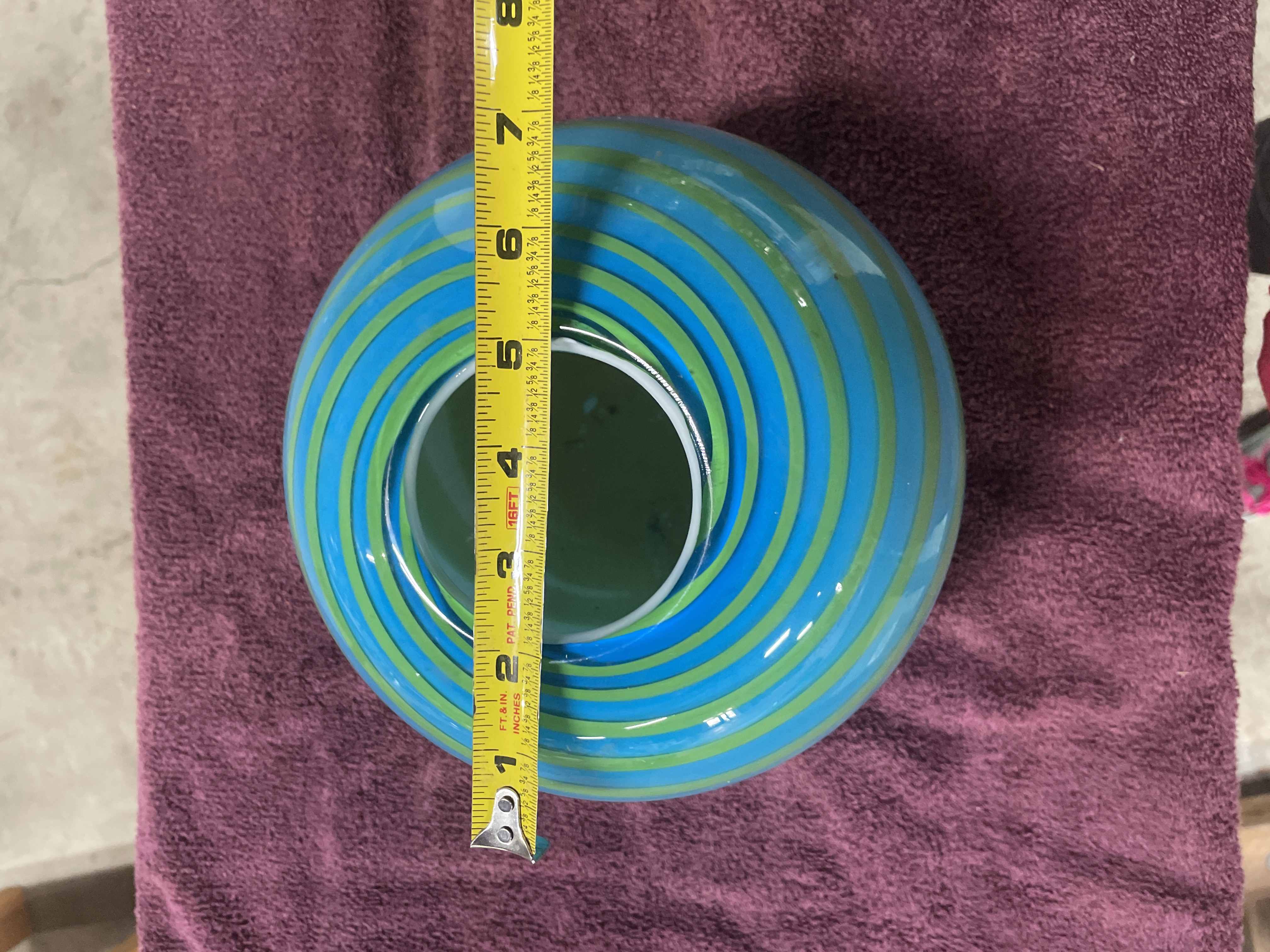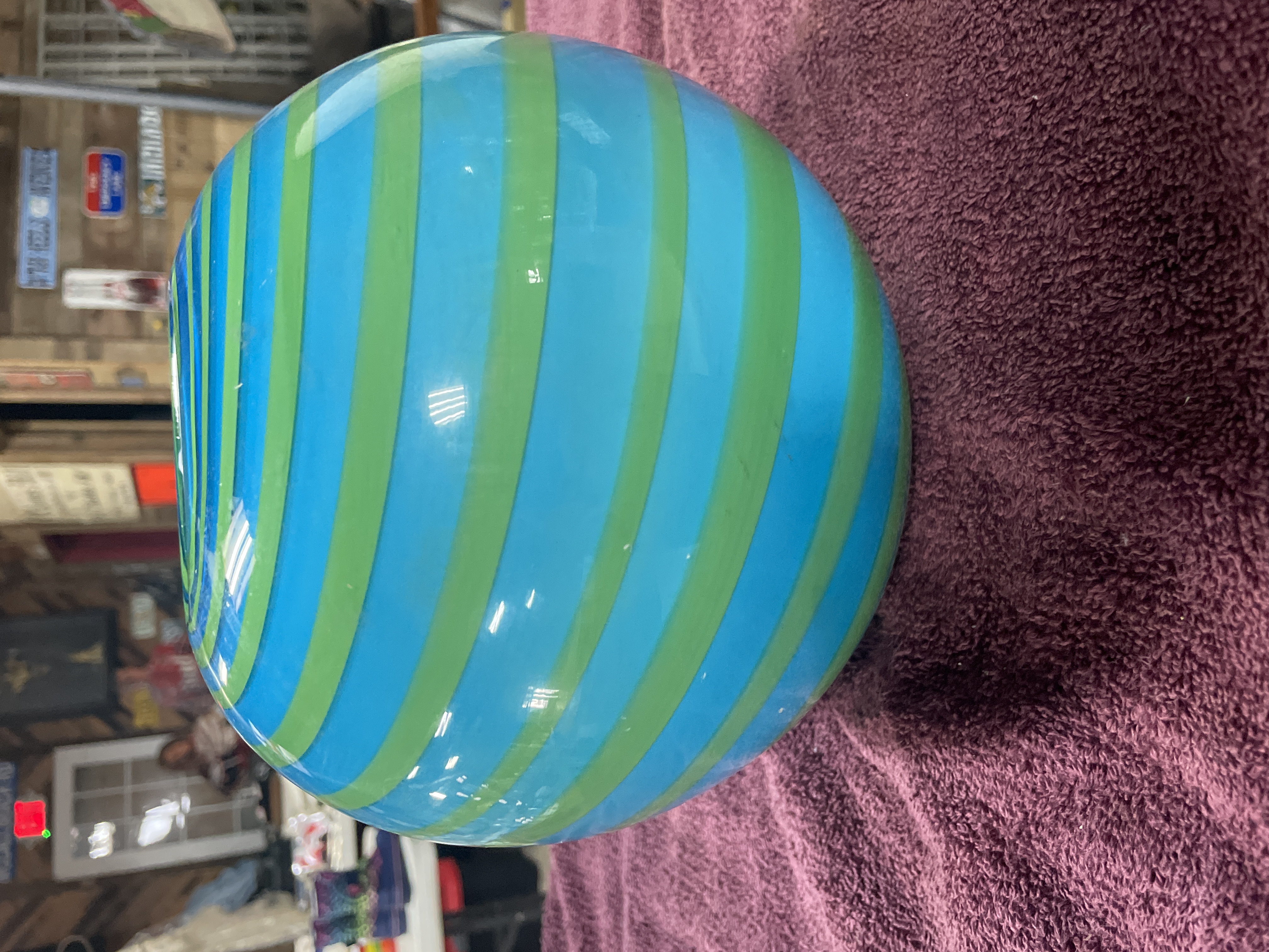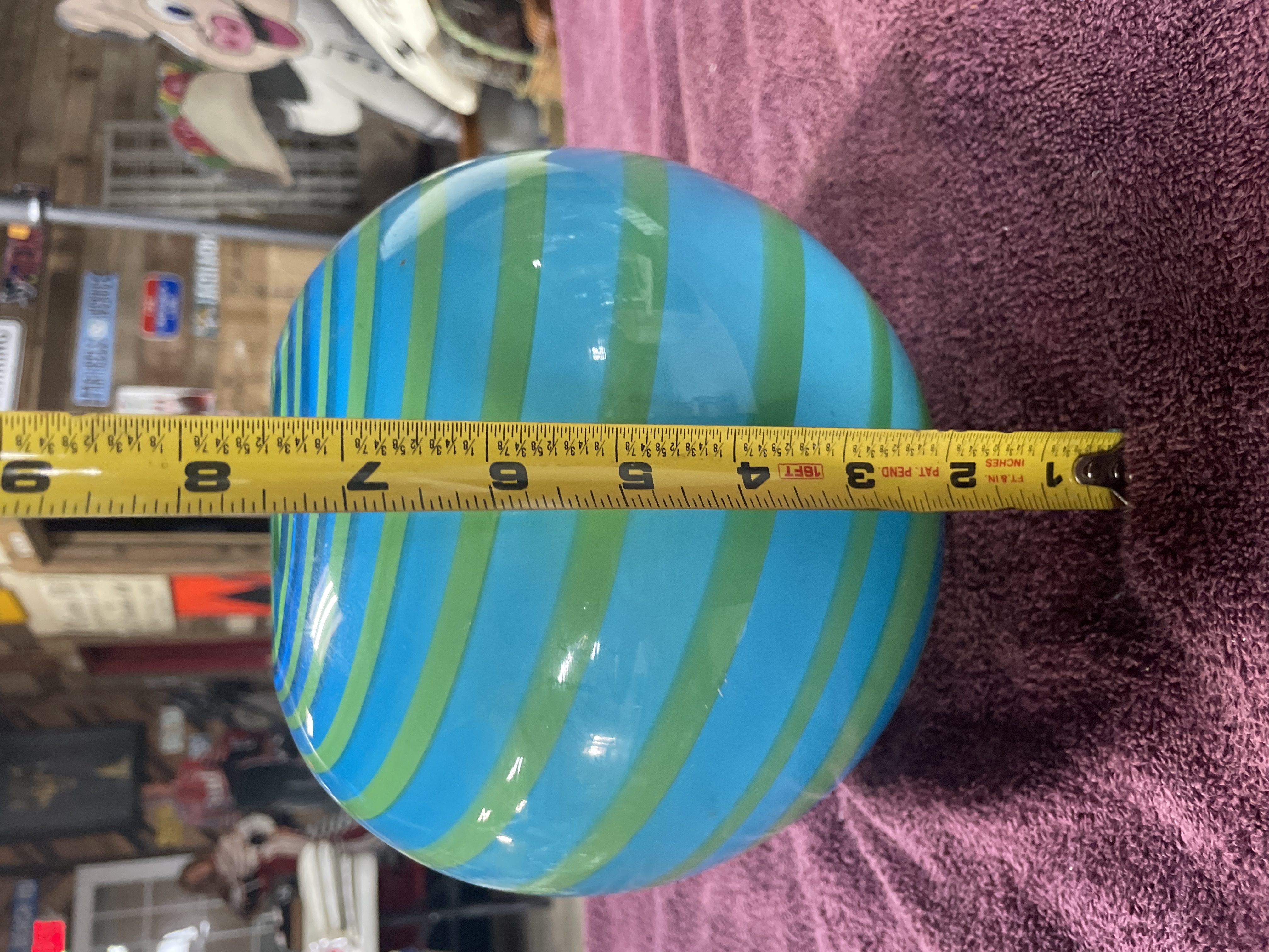 A spherical handblown glass vase featuring alternating light blue and green horizontal stripes, measuring approximately 7.5 inches in diameter.